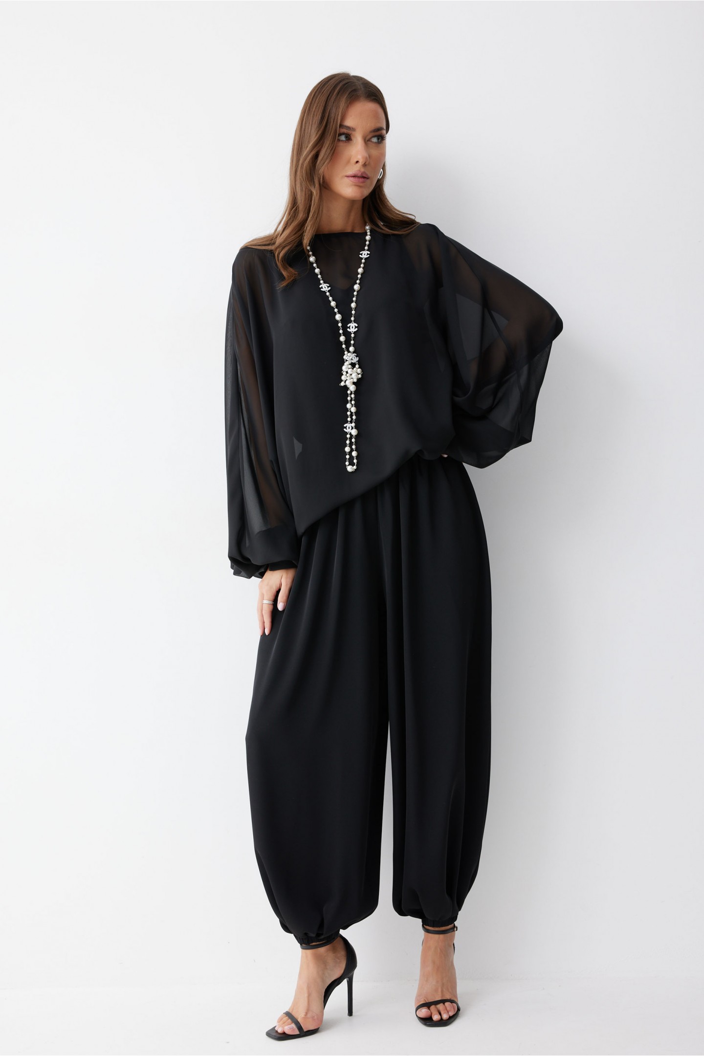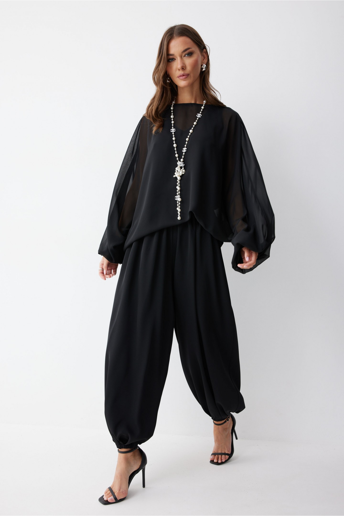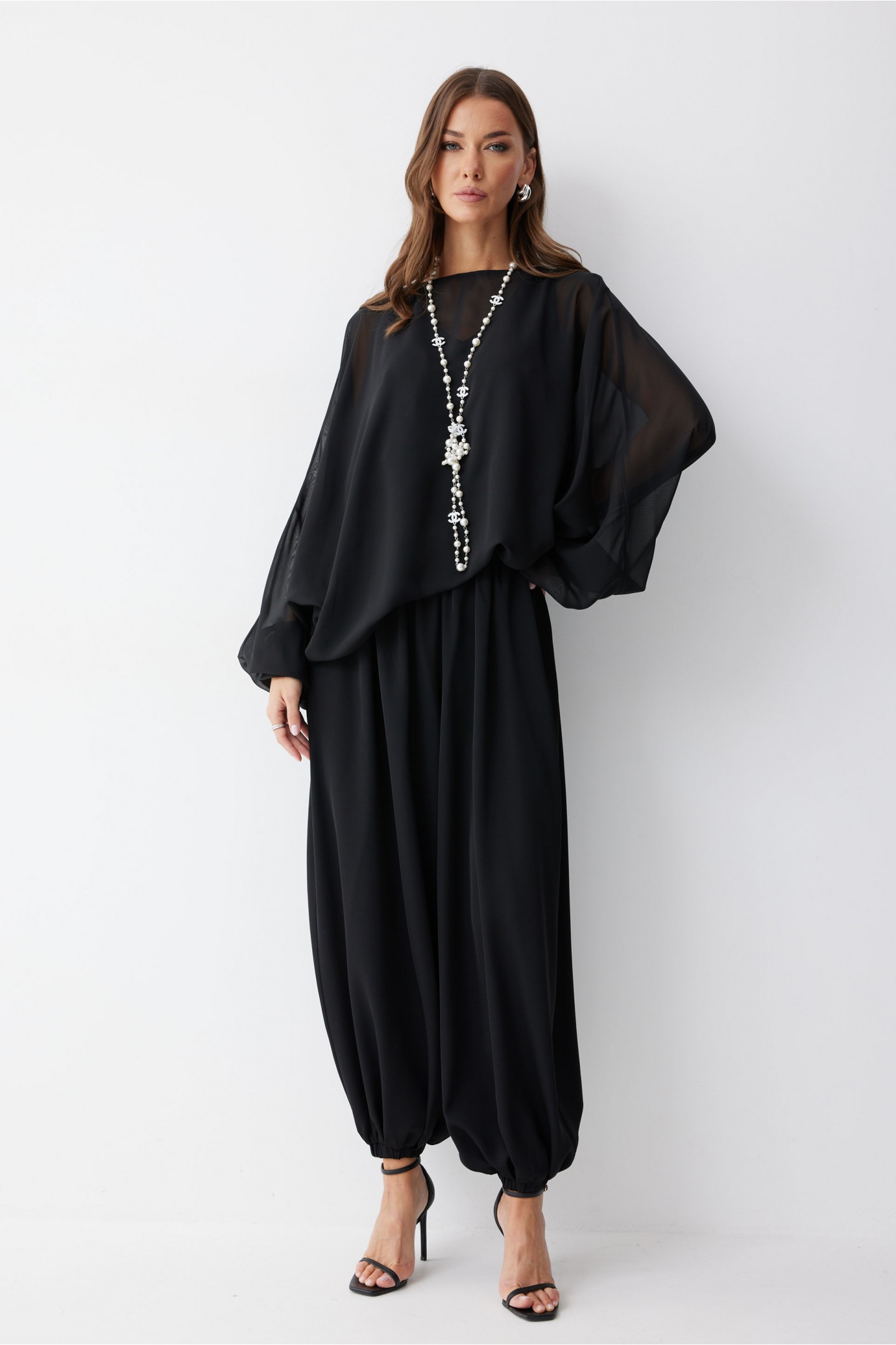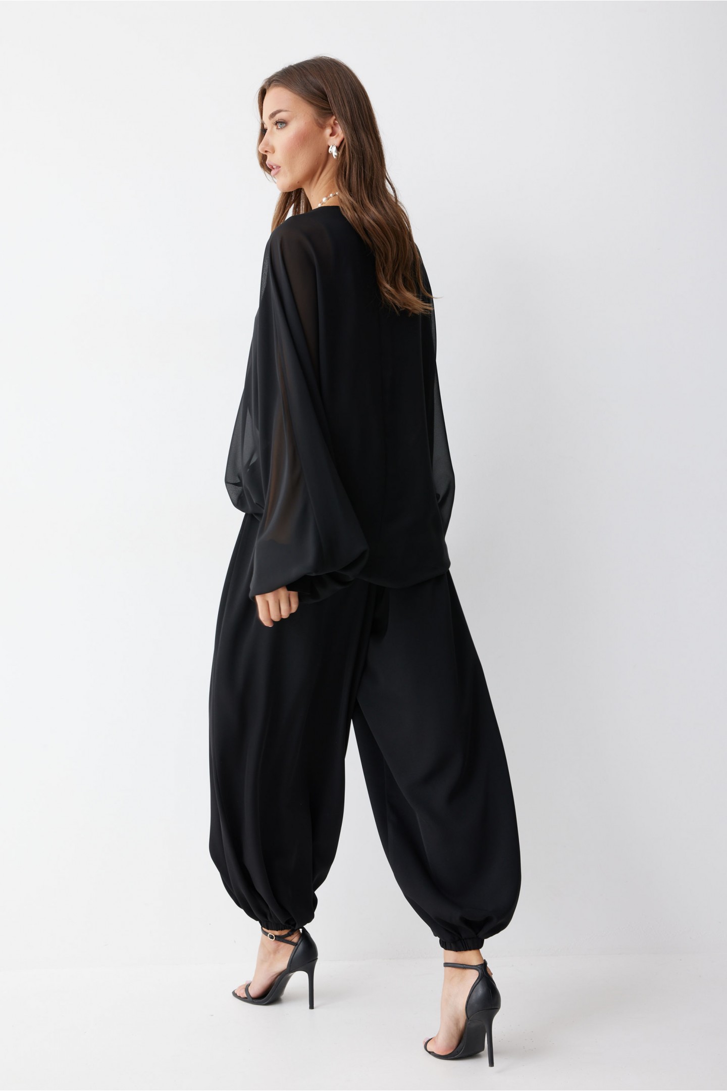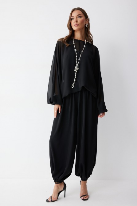 | Описание | Брюки шаровары свободного, расширенного силуэта, по низу со сборкой. Из струящейся ткани. Пояс с резинкой. По низу манжеты с резинкой. |