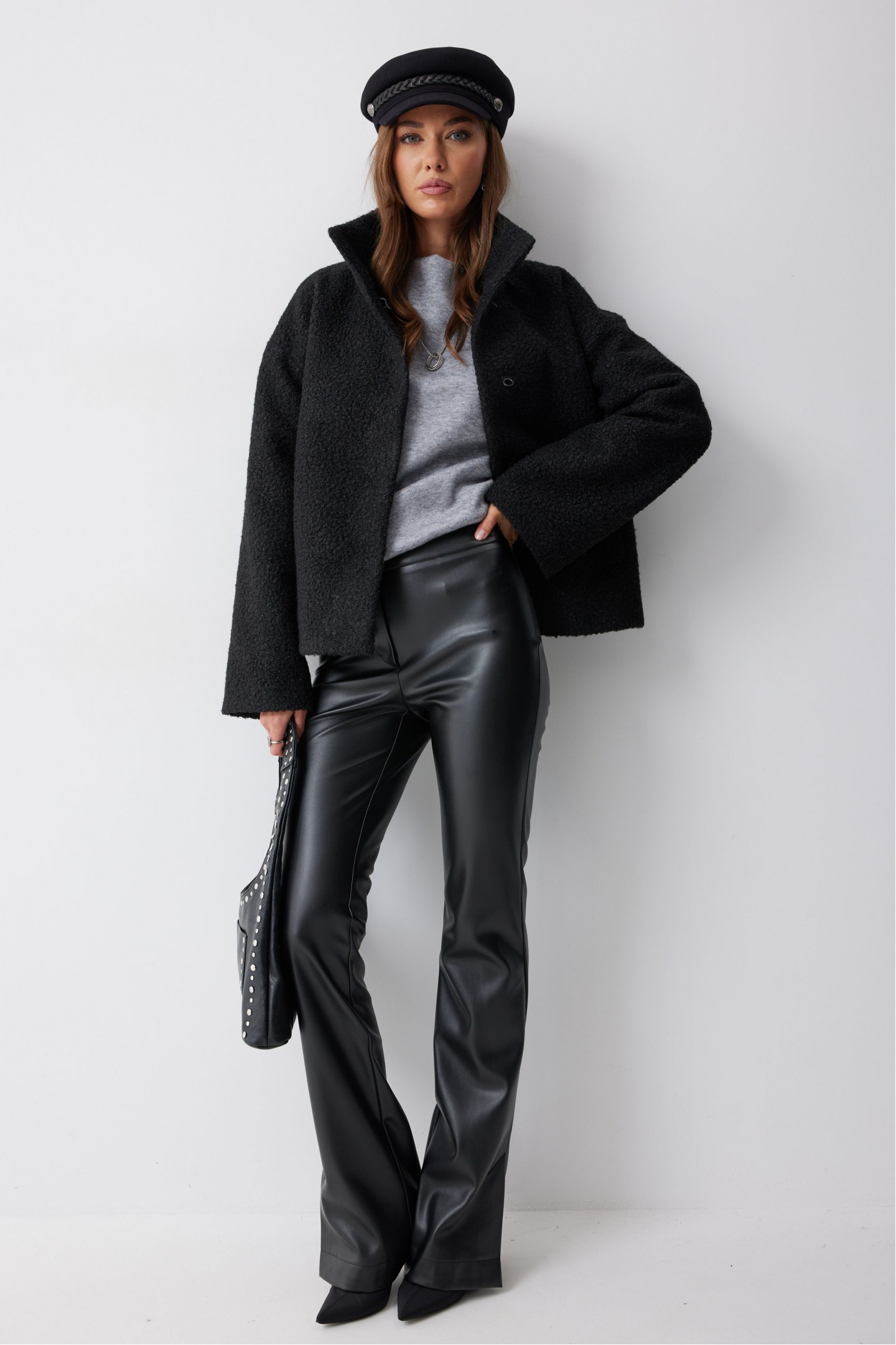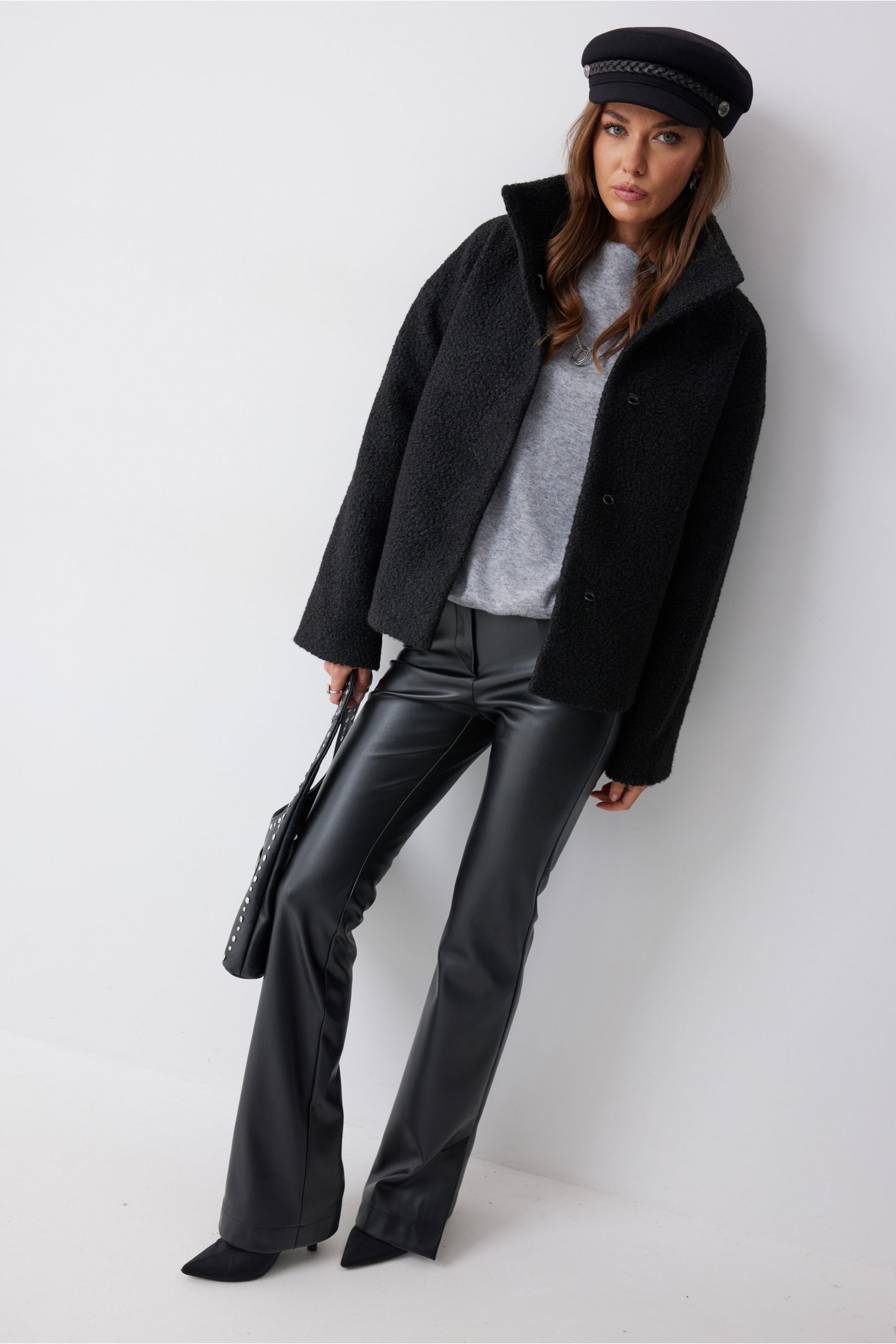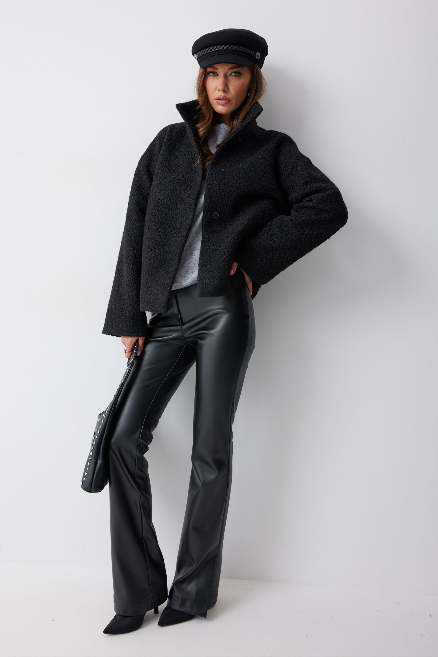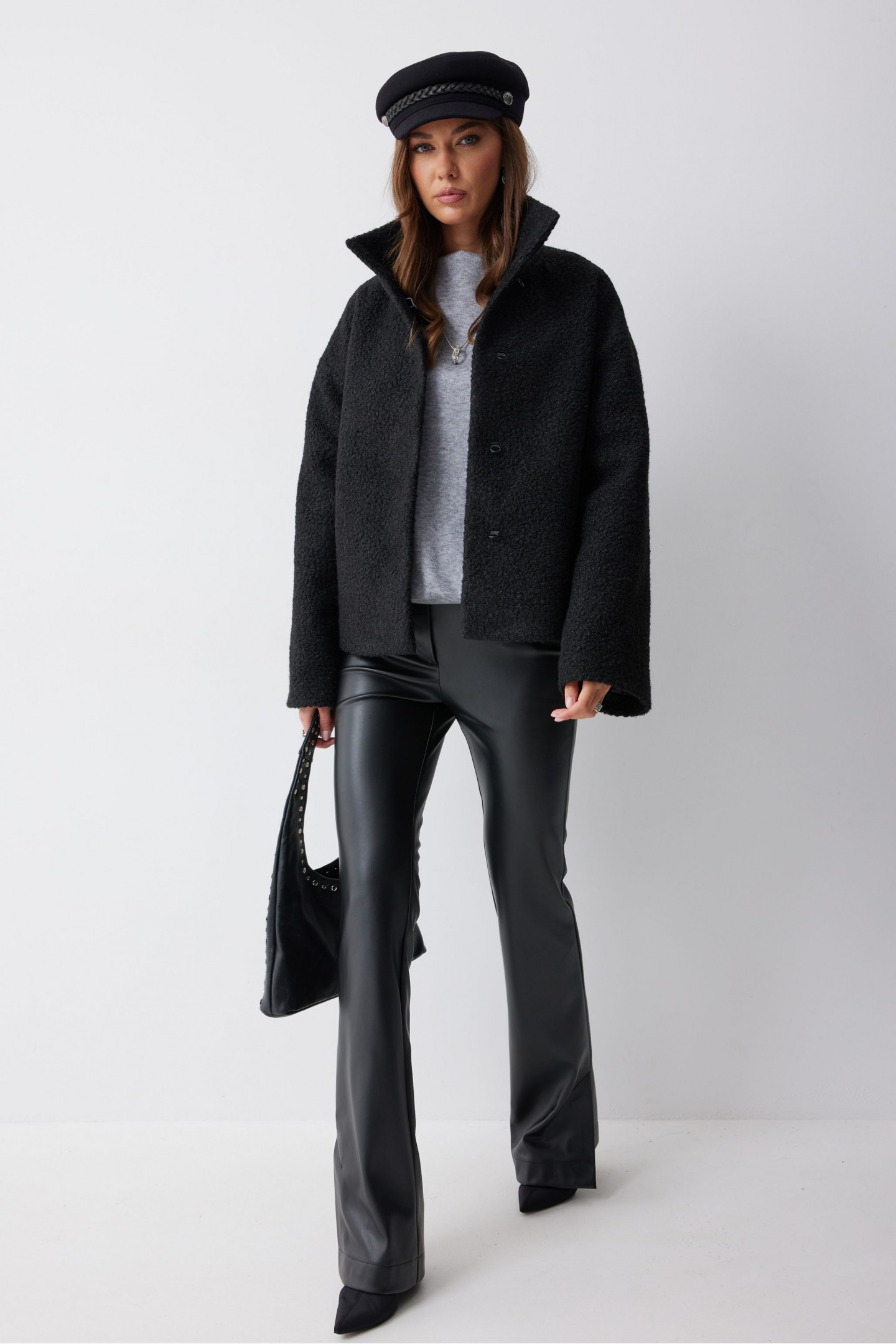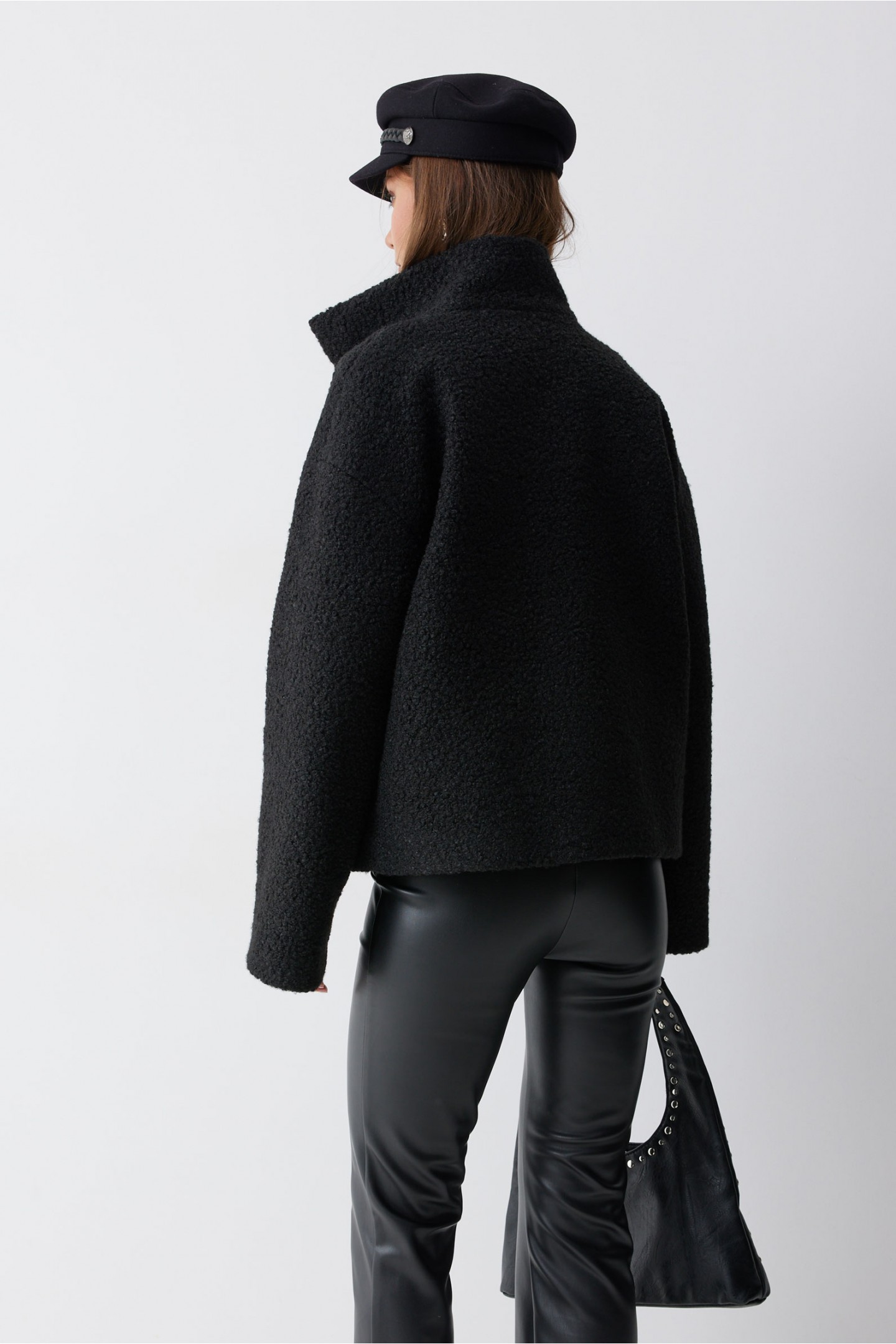 Описание Жакет прямого силуэта из букле на трикотажной основе. Воротник-стойка. Центральная застежка на крючки. Рукав со спущенной линией плеча. По переду прорезные карманы. Жакет на подкладке. Обращаем ваше внимание, что фурнитура может отличаться от фото.