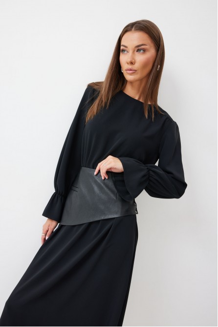 Описание Платье полуприлегающего силуэта из струящейся ткани. В области талии расположен подрез, с эластичной тесьмой. Рукав втачной, со сборкой по плечу, по низу волан, собранный на резинку. Юбка А-силуэта. Платье дополняет съёмная деталь в виде баски из эко кожи, с шнуровкой в боковом шве.
