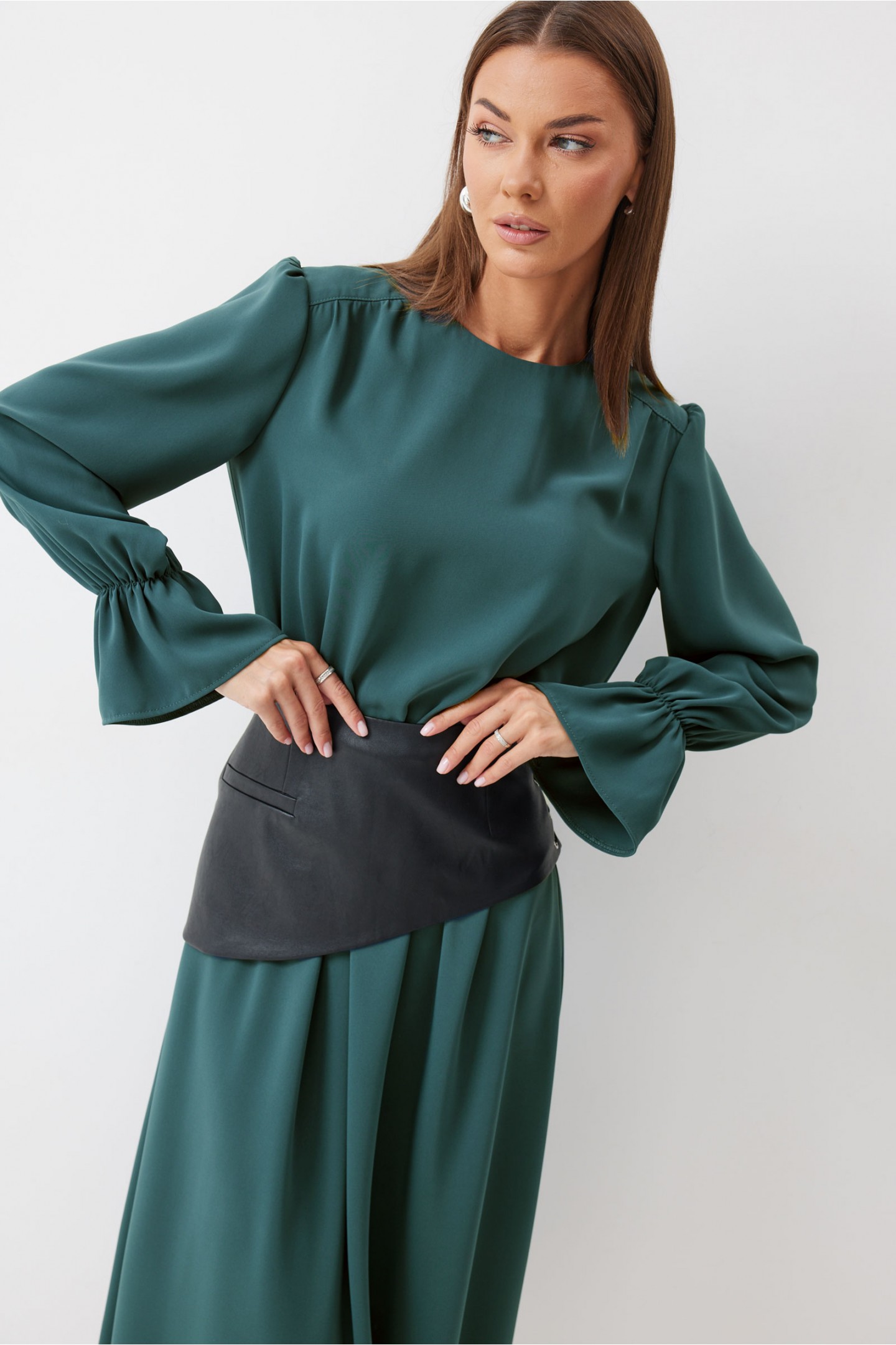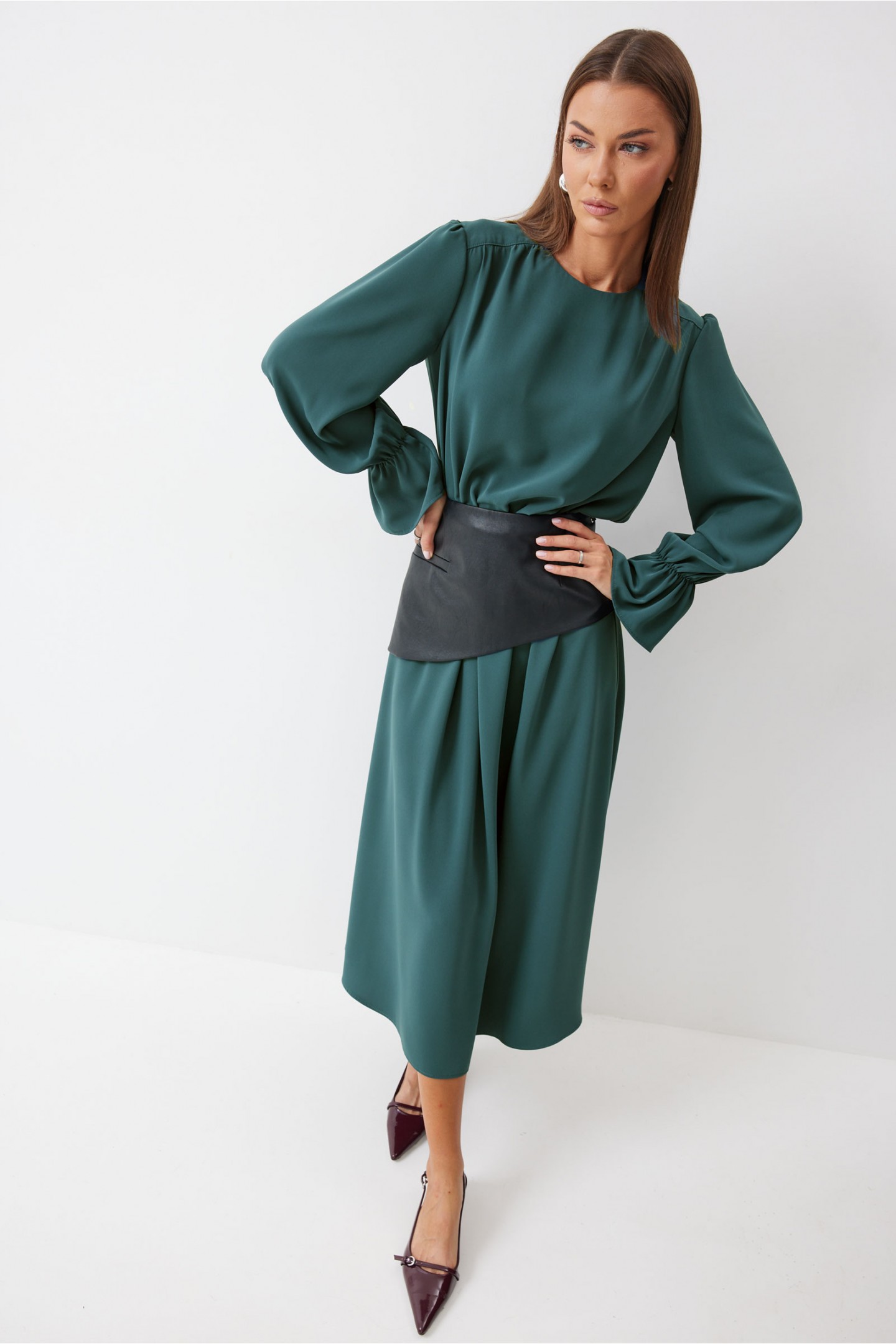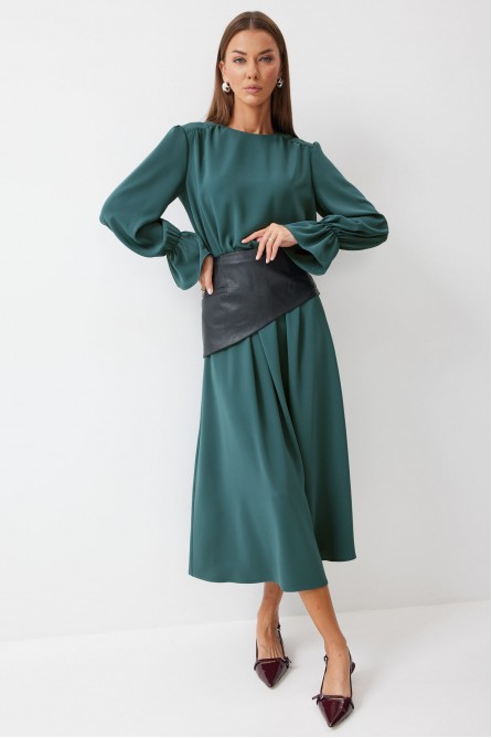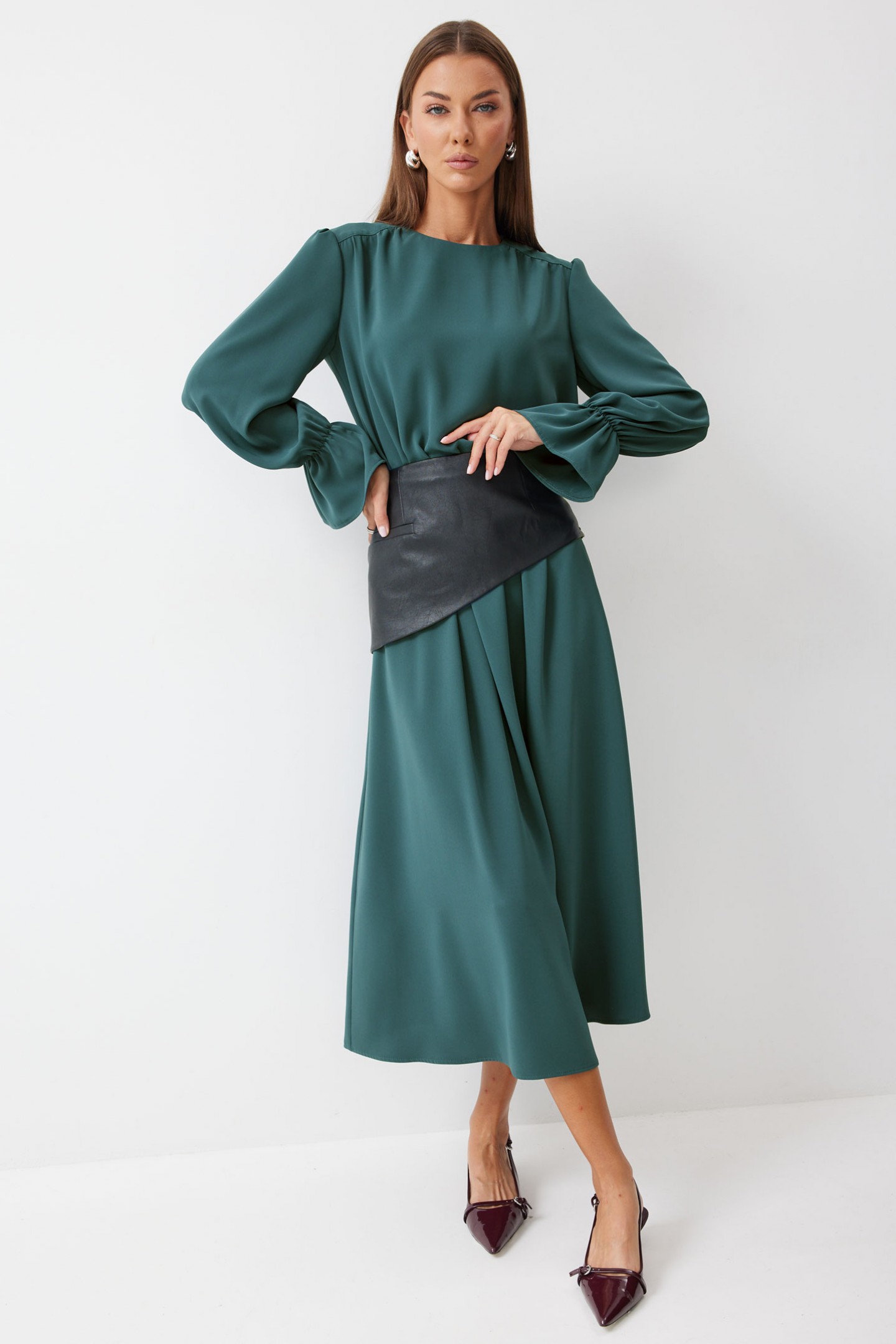 Описание Платье полуприлегающего силуэта из струящейся ткани. В области талии расположен подрез, с эластичной тесьмой. Рукав втачной, со сборкой по плечу, по низу волан, собранный на резинку. Юбка А-силуэта. Платье дополняет съёмная деталь в виде баски из эко кожи, с шнуровкой в боковом шве.