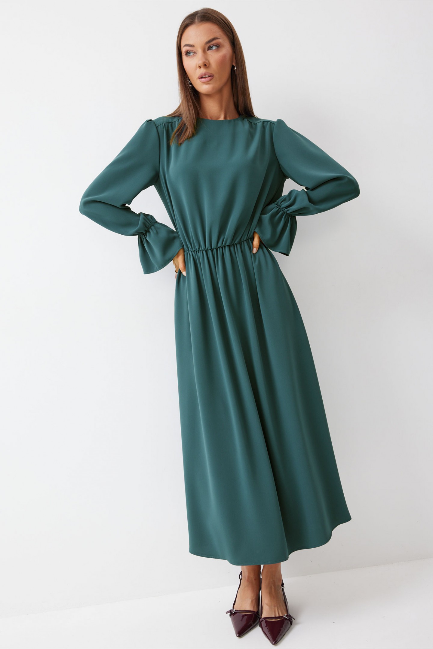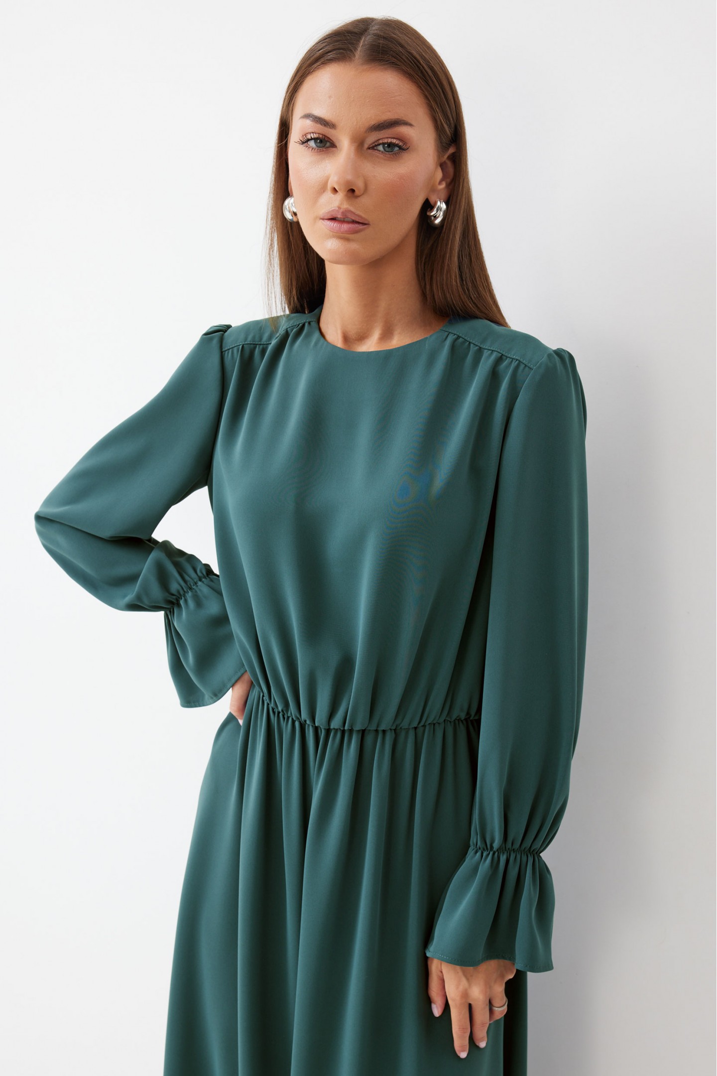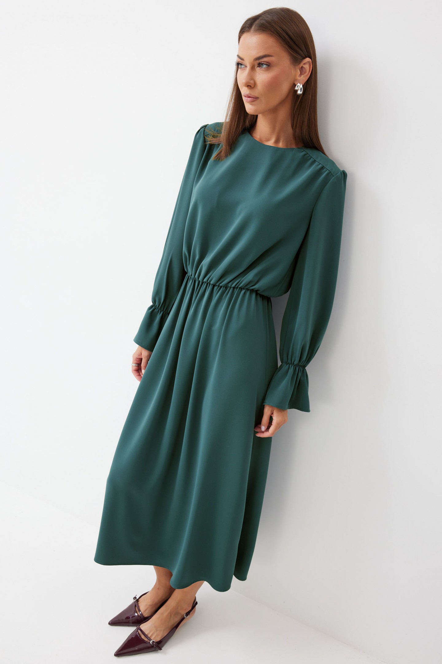 Описание Платье полуприлегающего силуэта из струящейся ткани. В области талии расположен подрез, с эластичной тесьмой. Рукав втачной, со сборкой по плечу, по низу волан, собранный на резинку. Юбка А-силуэта. Платье дополняет съёмная деталь в виде баски из эко кожи, с шнуровкой в боковом шве.