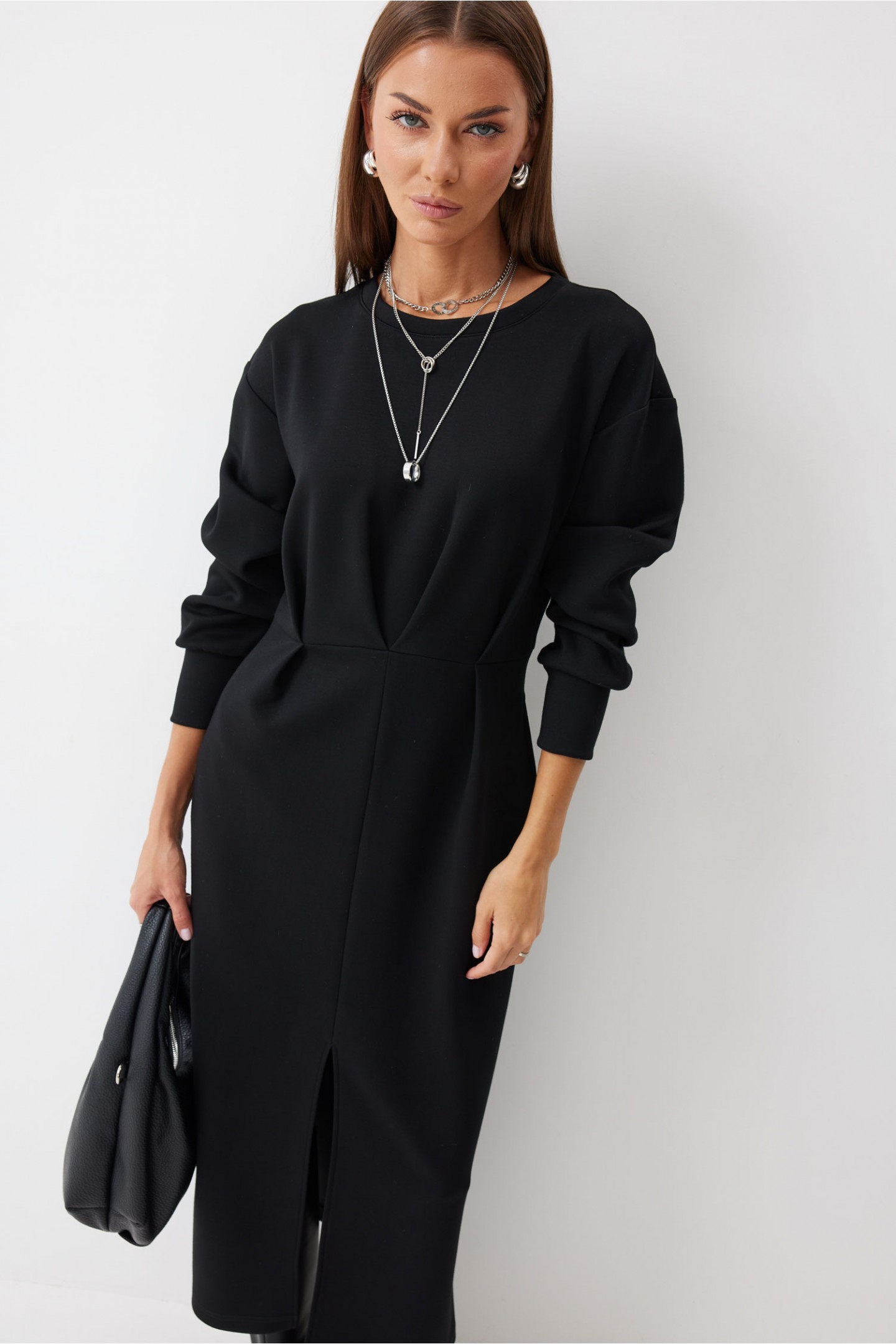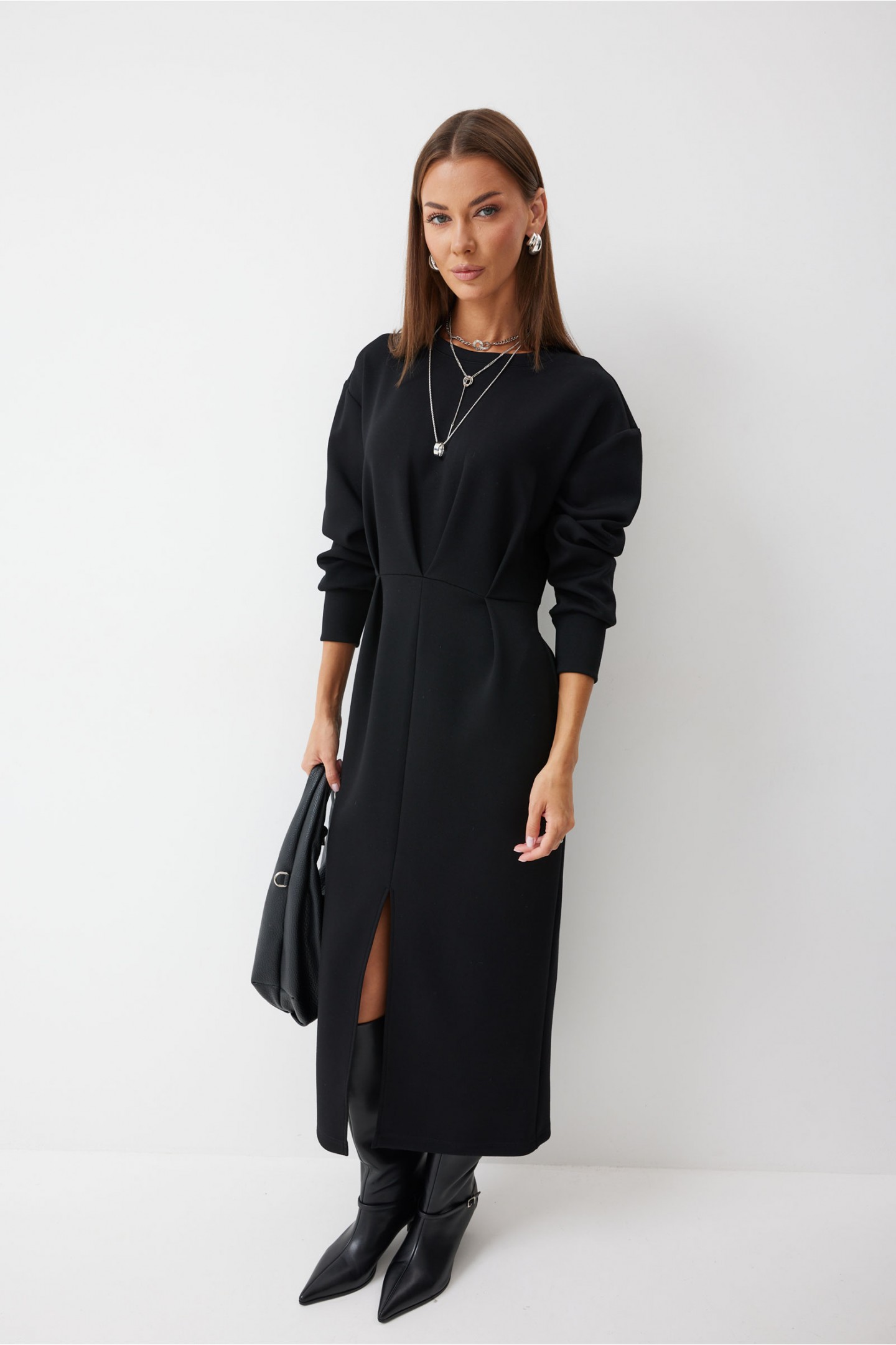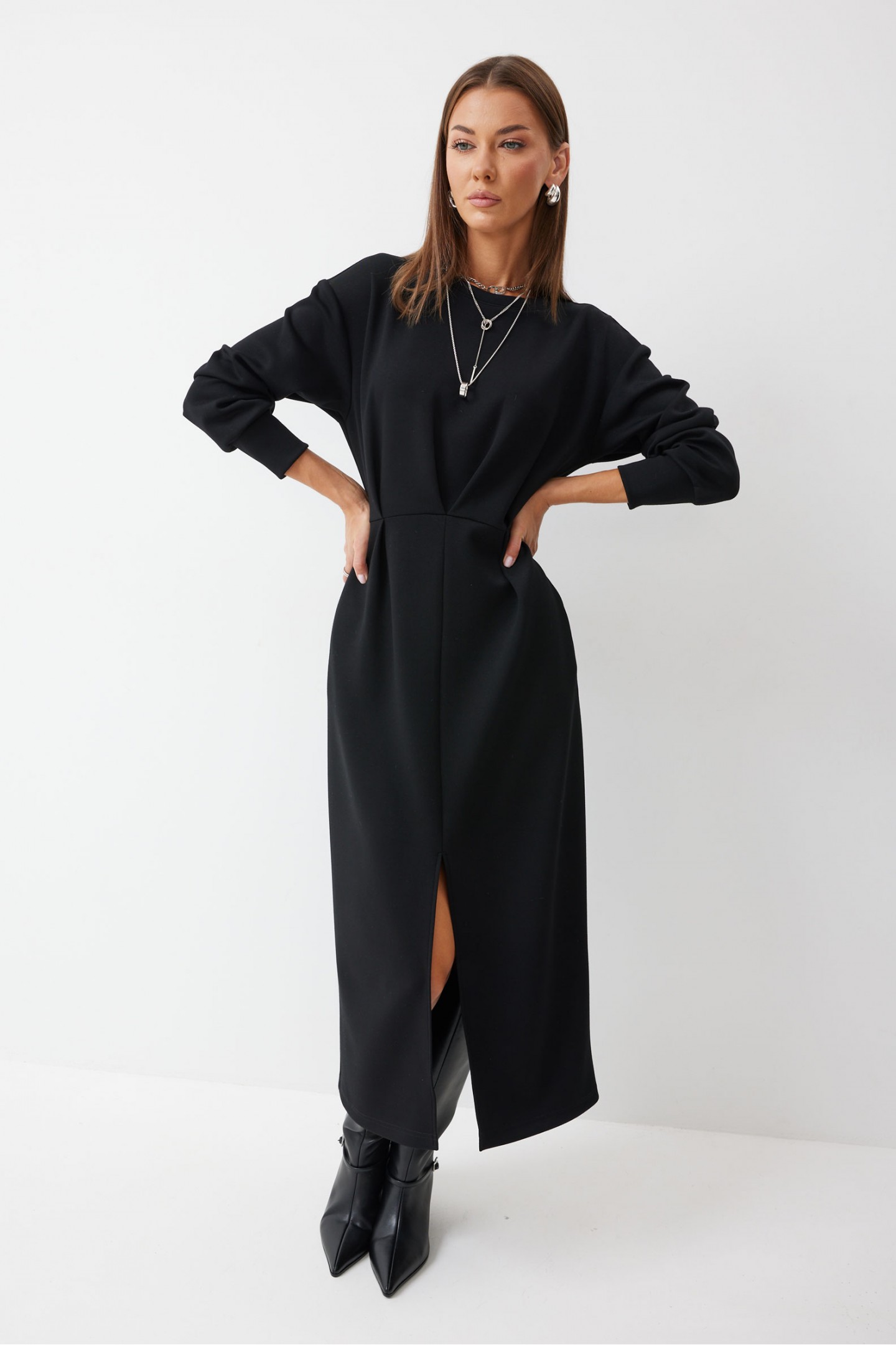 Описание | Платье полуприлегающего силуэта из трикотажного полотна. Горловина округлая. Рукав со спущенной линией плеча по низу манжета. Платье отрезное по линии талии. По переду на талии складки. В боковом шве функциональные карманы. В центральном шве юбки разрез. |