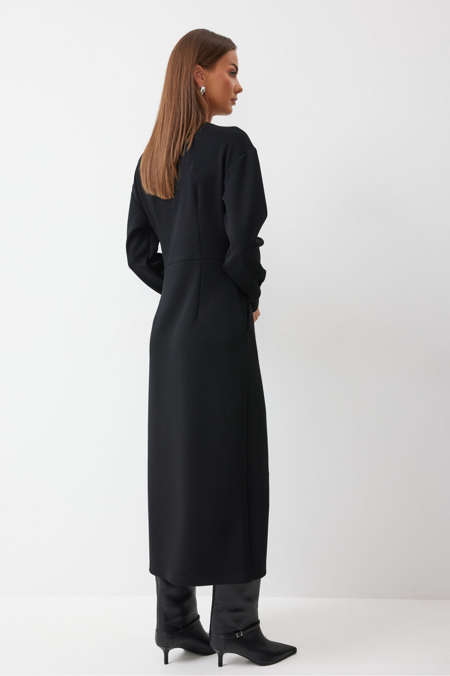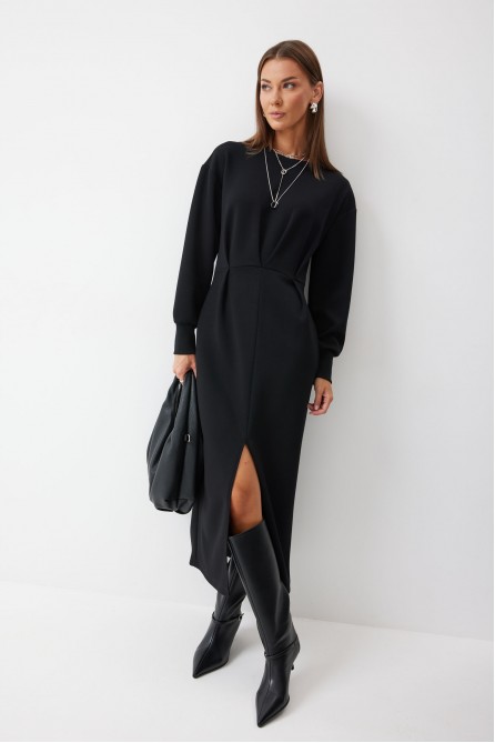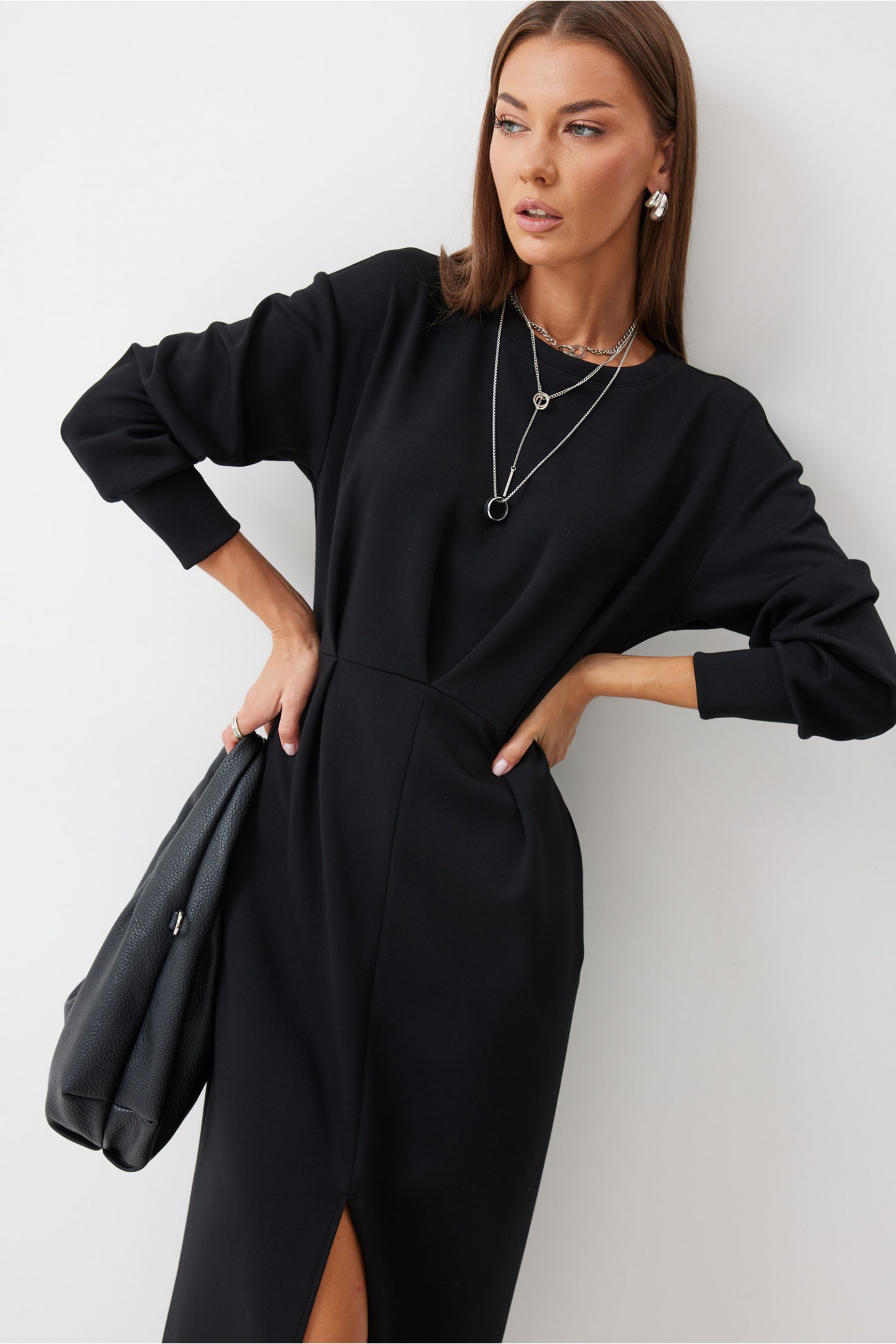 Описание | Платье полуприлегающего силуэта из трикотажного полотна. Горловина округлая. Рукав со спущенной линией плеча по низу манжета. Платье отрезное по линии талии. По переду на талии складки. В боковом шве функциональные карманы. В центральном шве юбки разрез. |