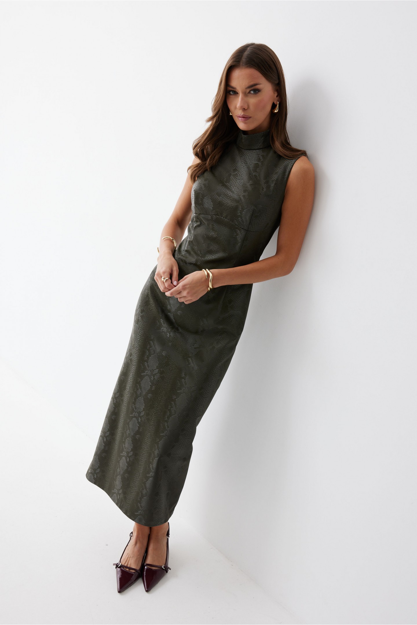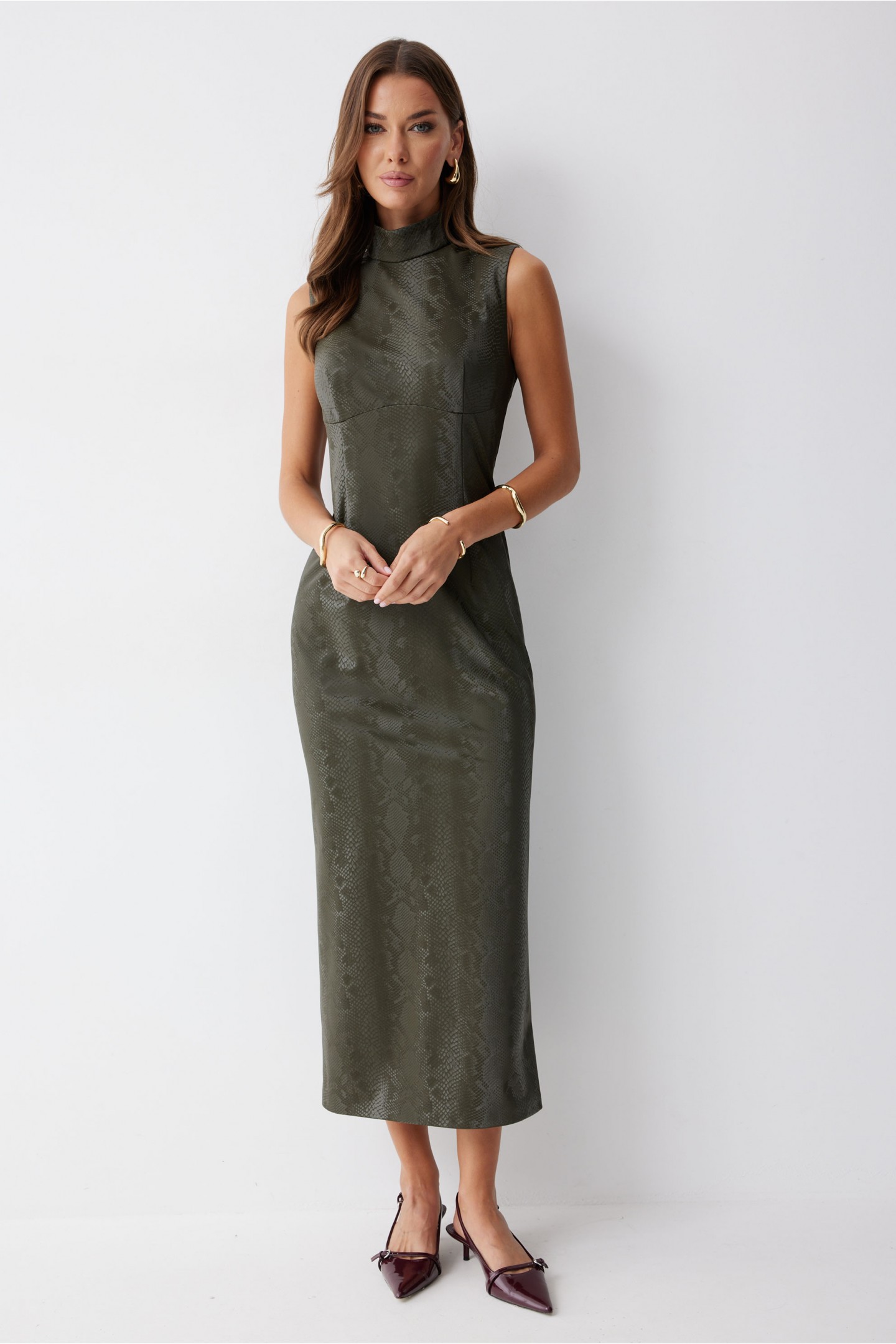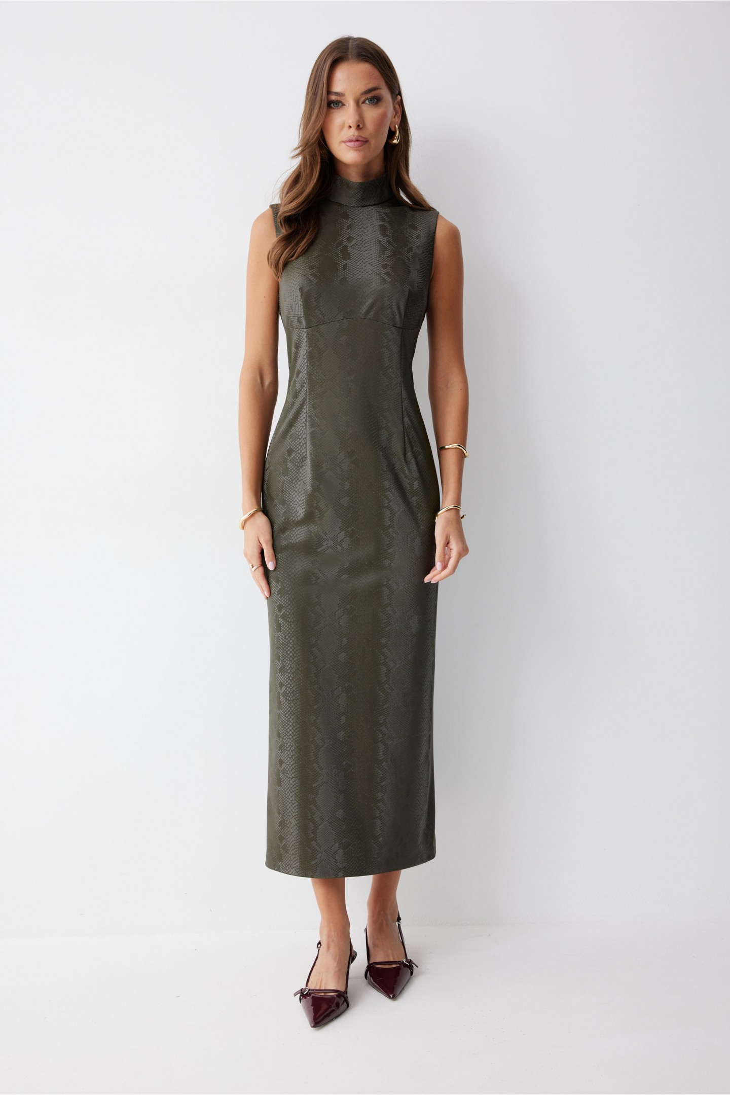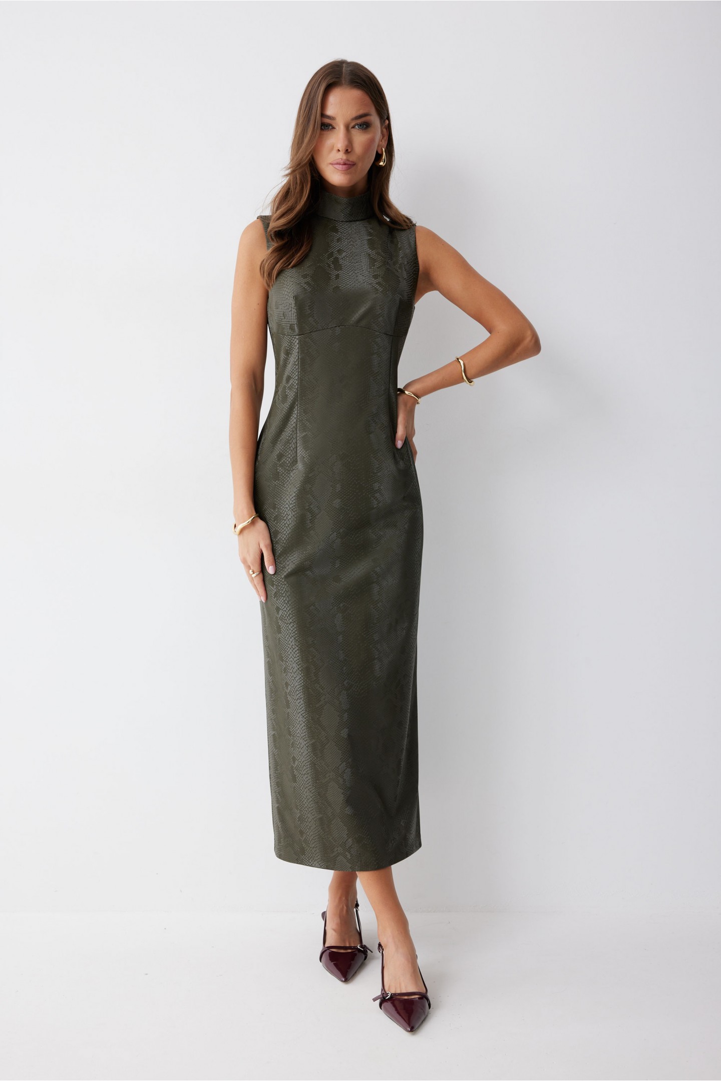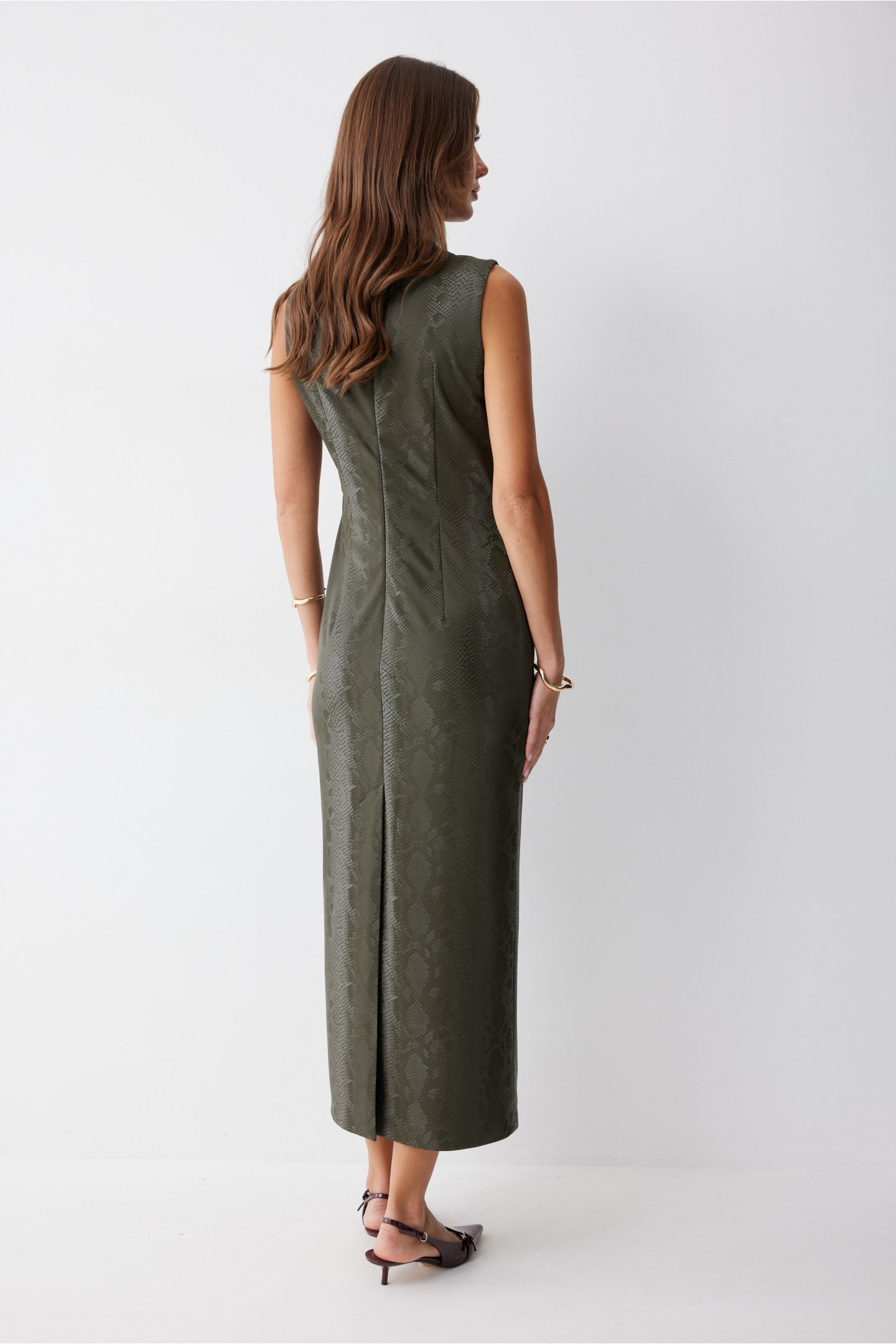 Описание Платье прилегающего силуэта из экокожи длиной миди. Горловина-стойка. Спереди под грудью подрез, нагрудные и талиевые вытачки. На спинке в центральном шве потайная молния, по низу шлица. На спинке платья талиевые вытачки.