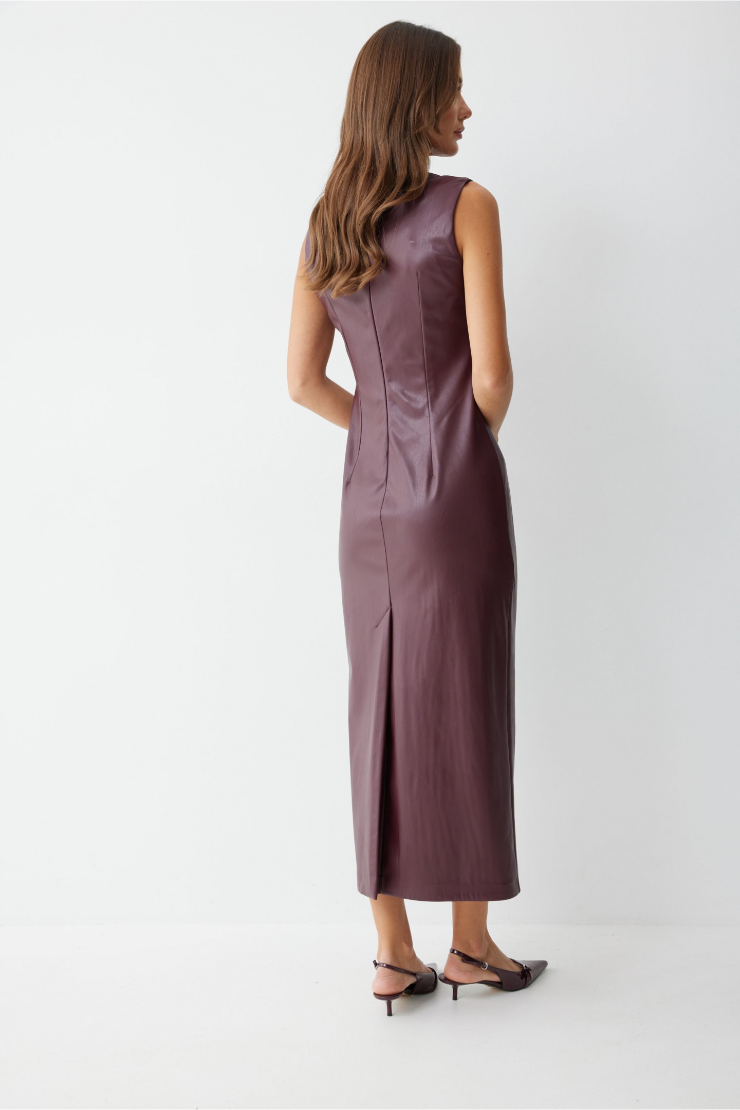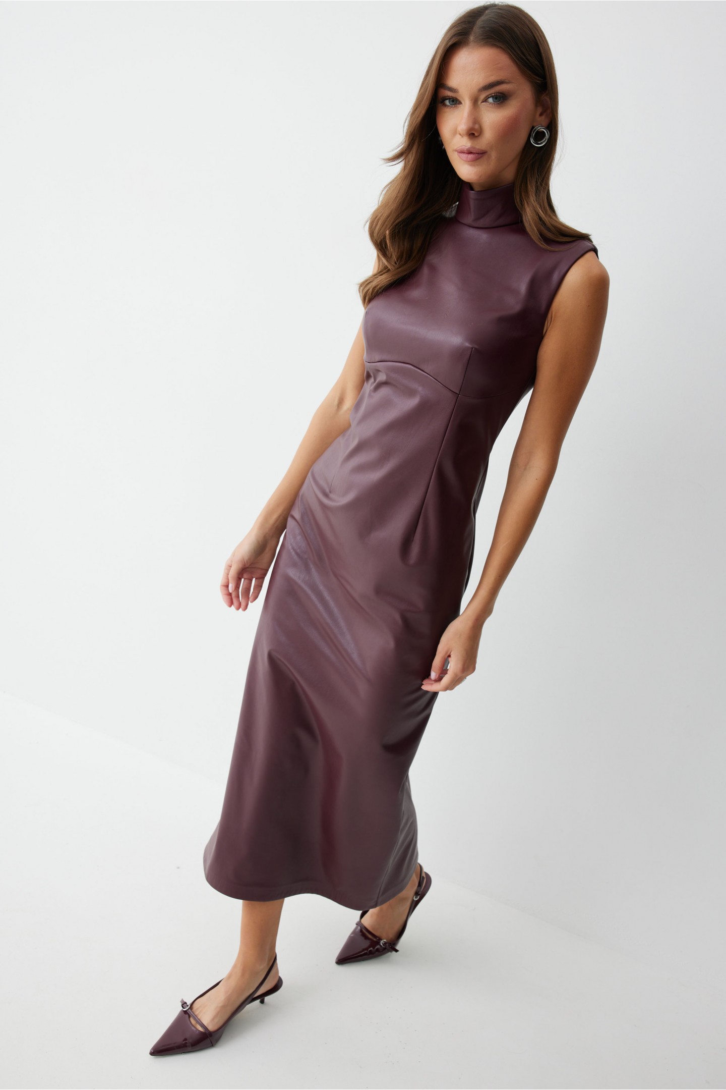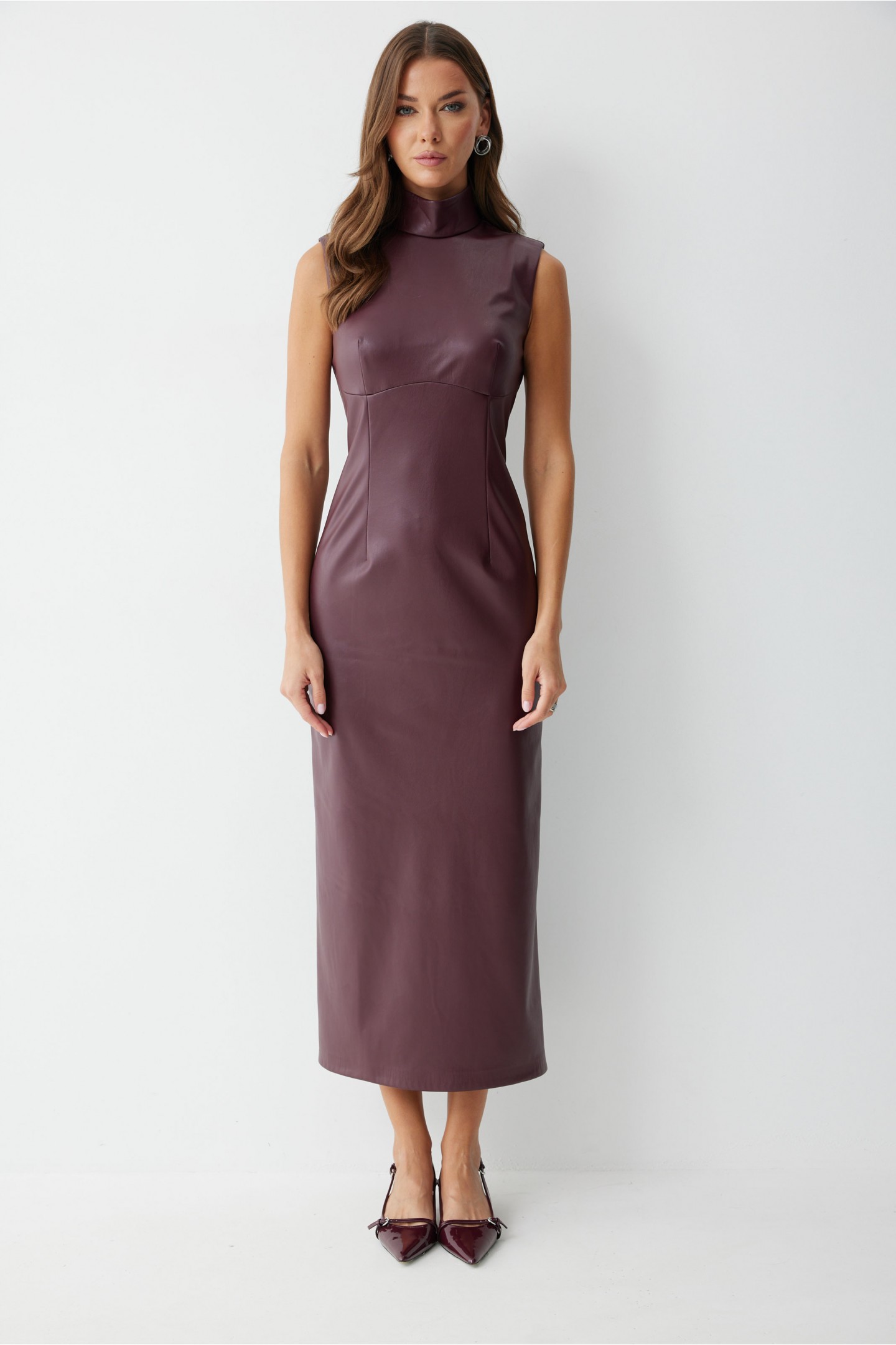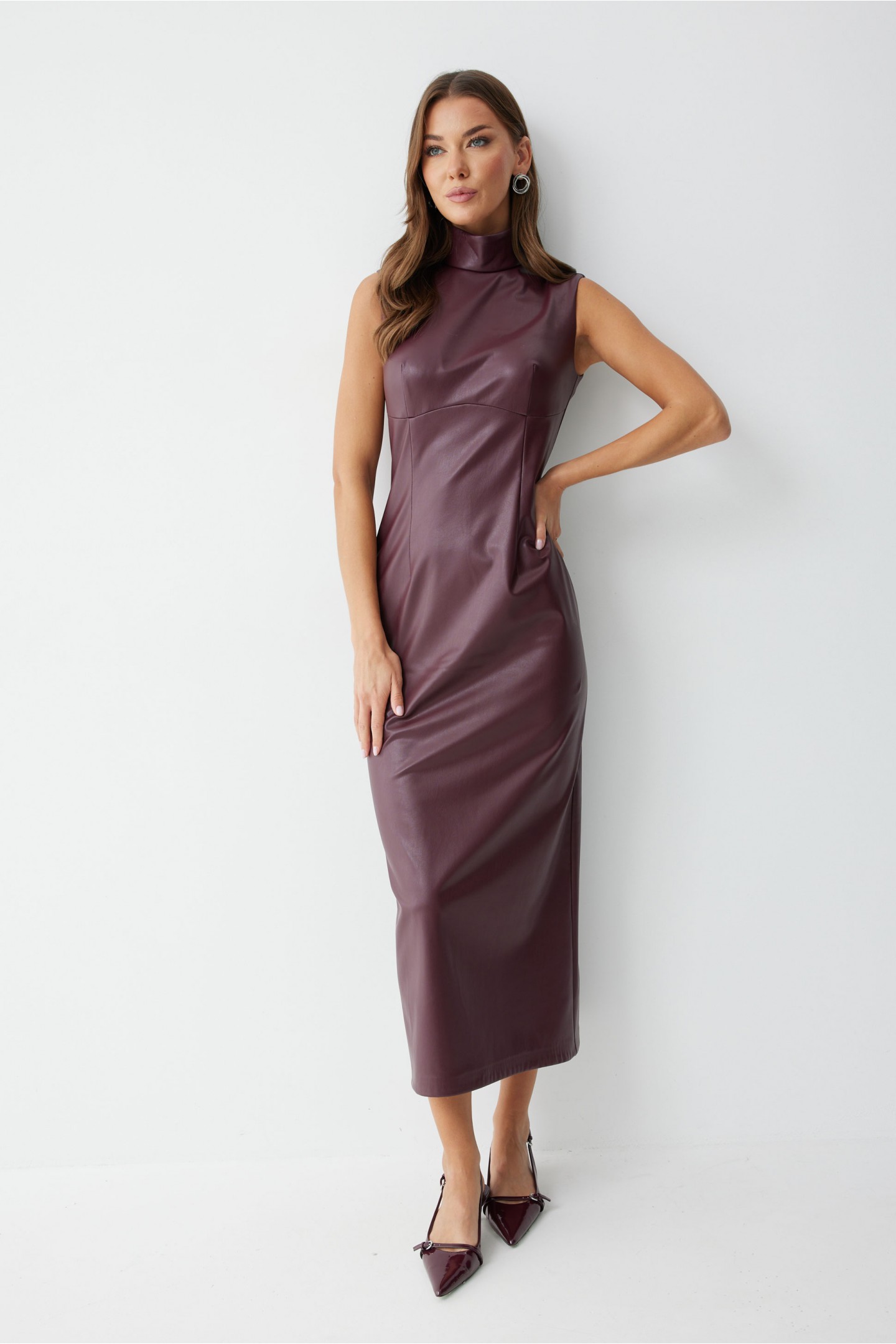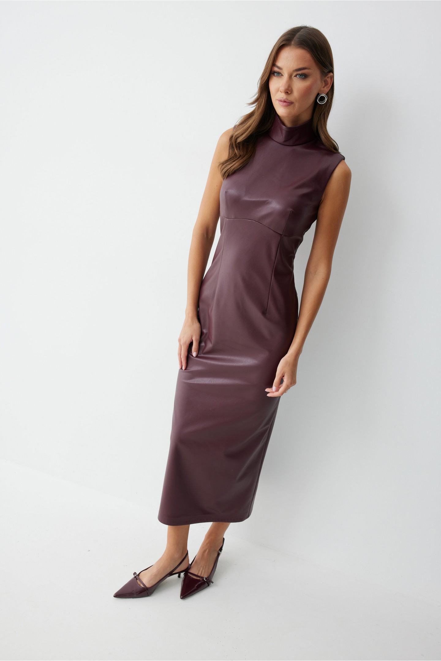 | Описание | Платье прилегающего силуэта из экокожи длиной миди. Горловина-стойка. Спереди под грудью подрез, нагрудные и талиевые вытачки. На спинке в центральном шве потайная молния, по низу шлица. На спинке платья талиевые вытачки. |