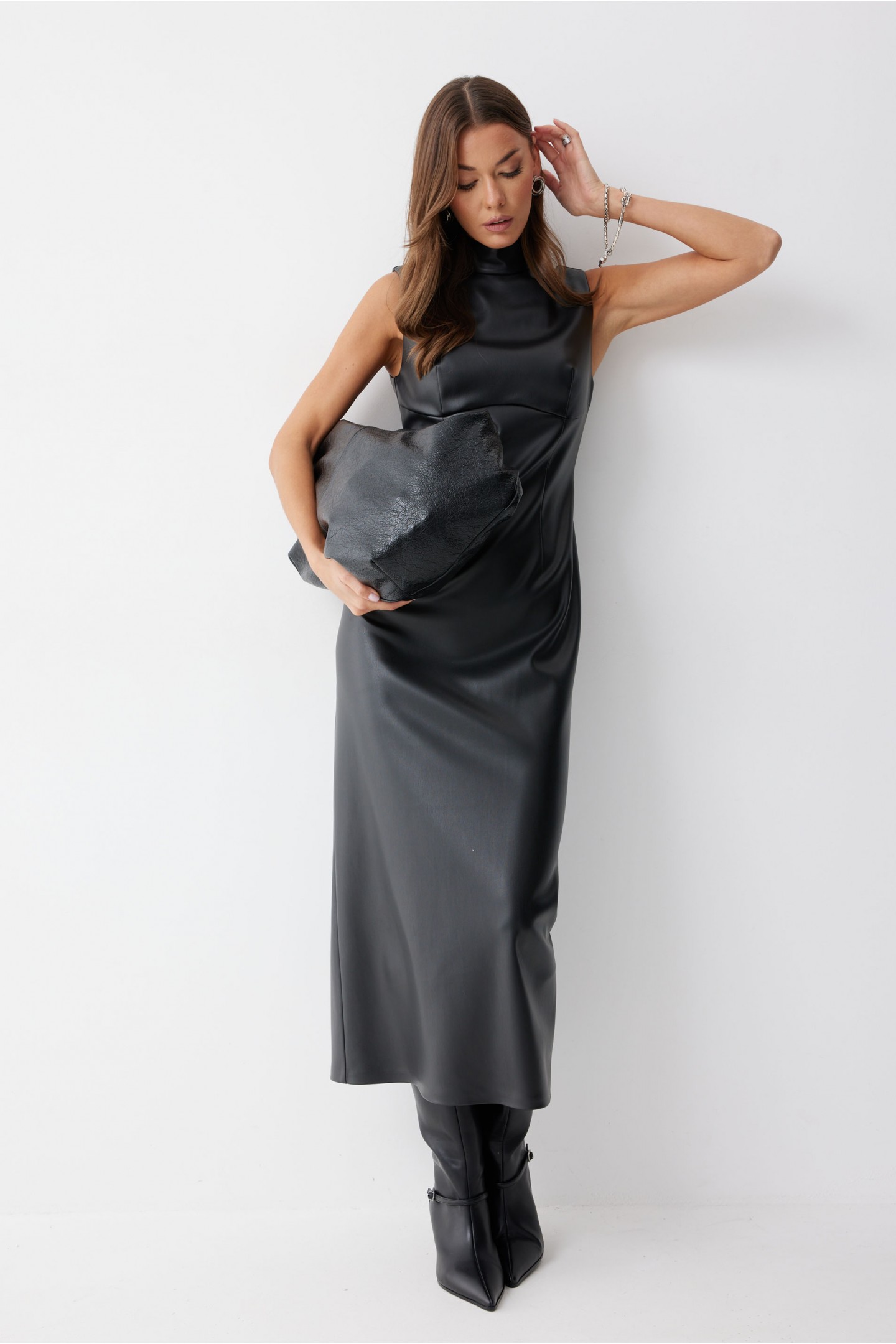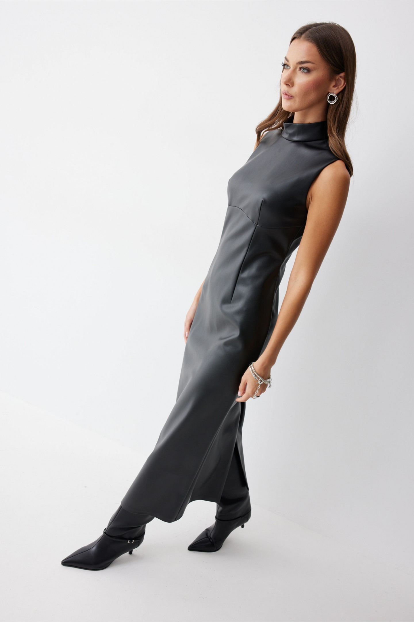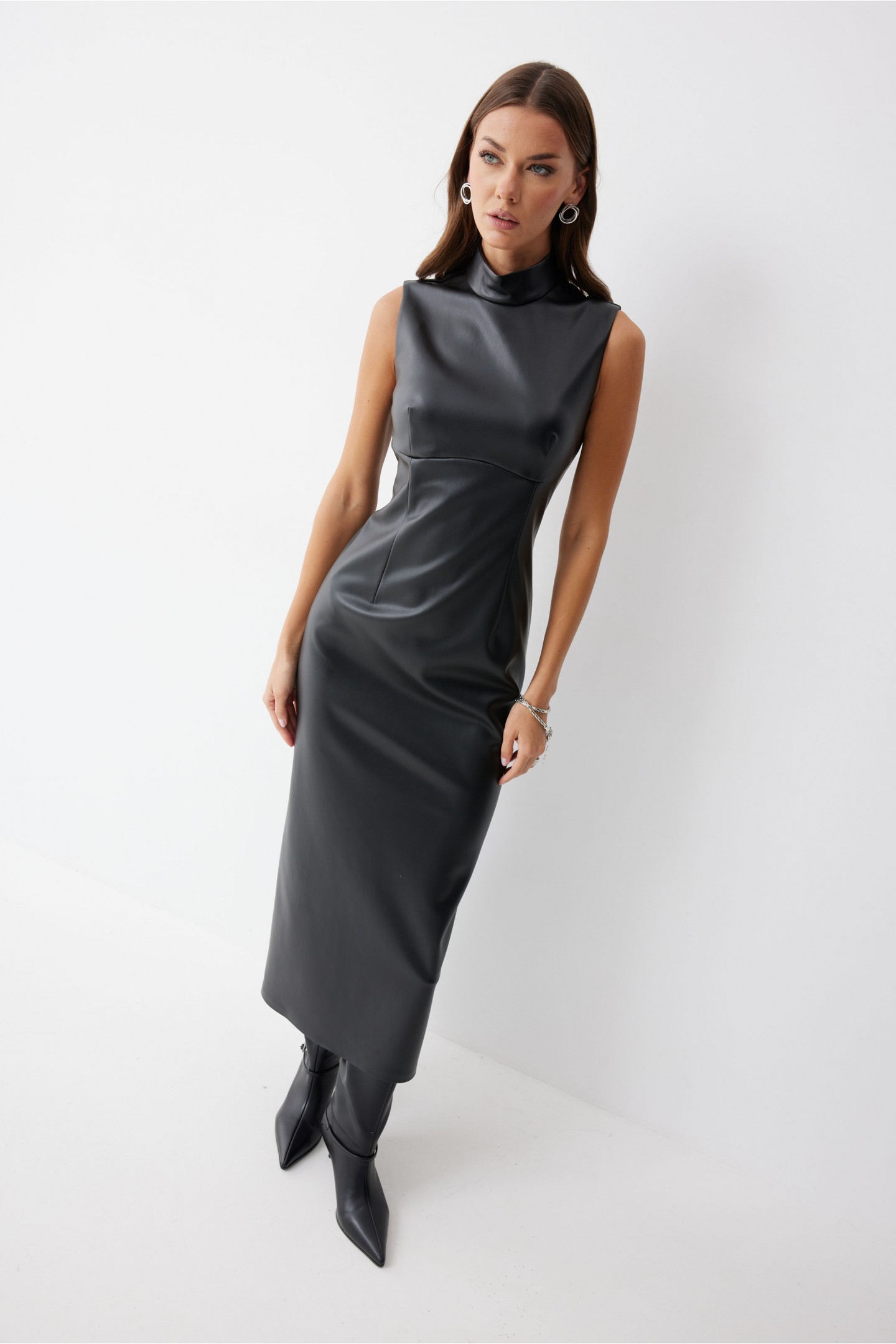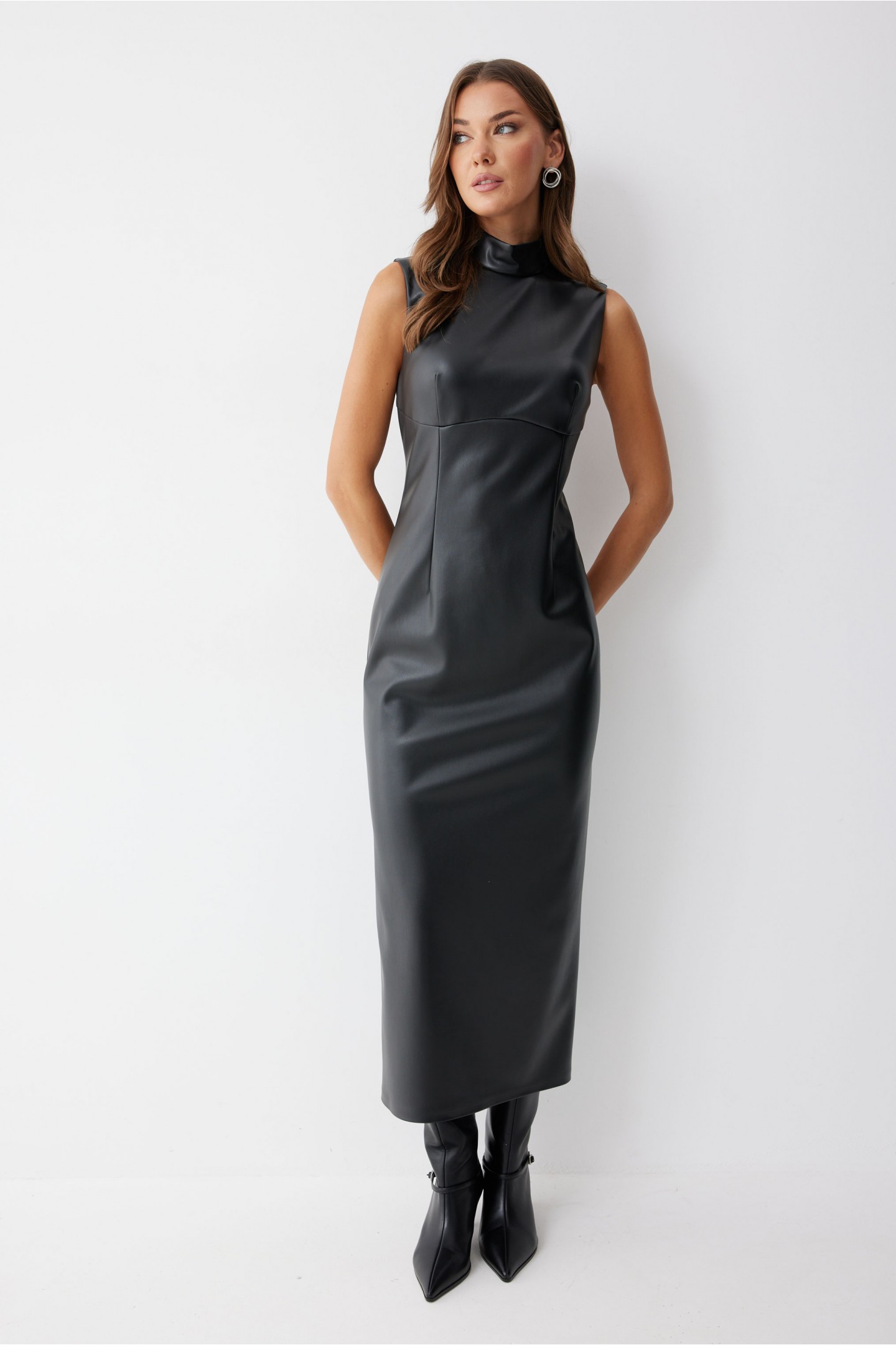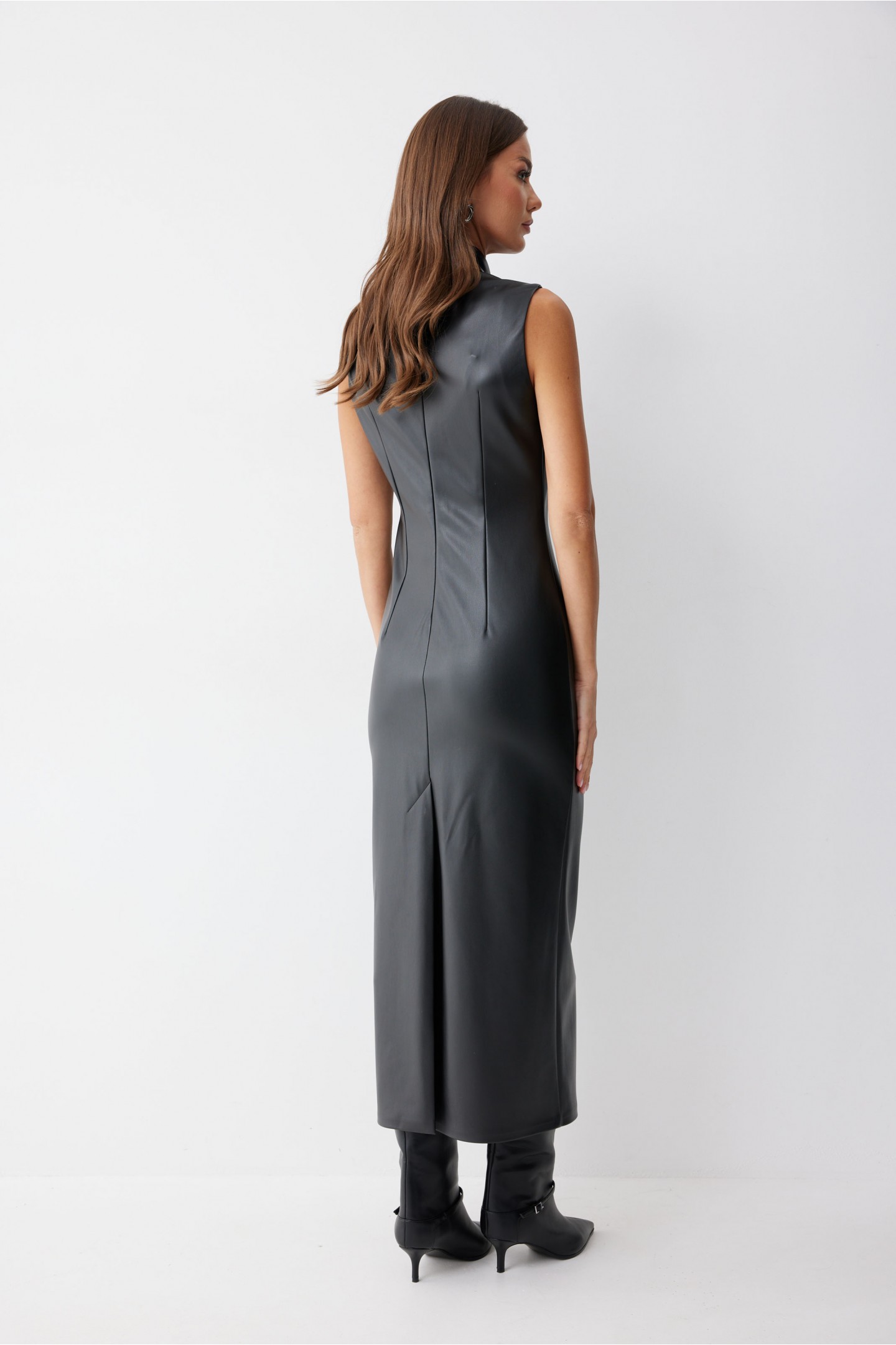 Описание Платье прилегающего силуэта из экокожи длиной миди. Горловина-стойка. Спереди под грудью подрез, нагрудные и талиевые вытачки. На спинке в центральном шве потайная молния, по низу шлица. На спинке платья талиевые вытачки.