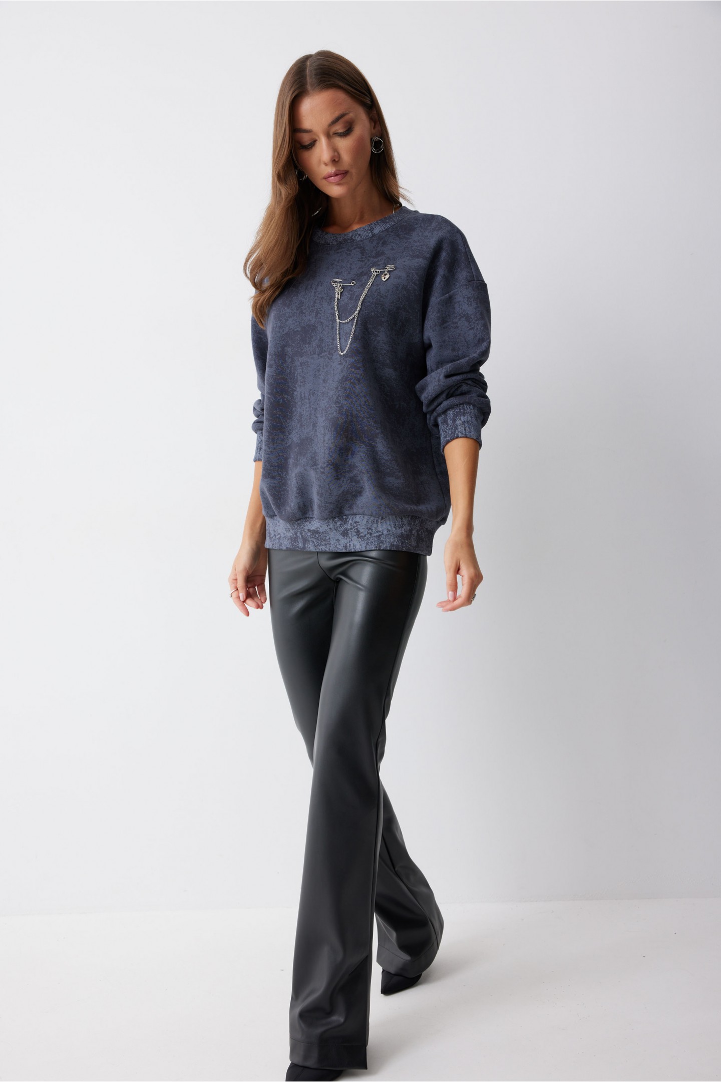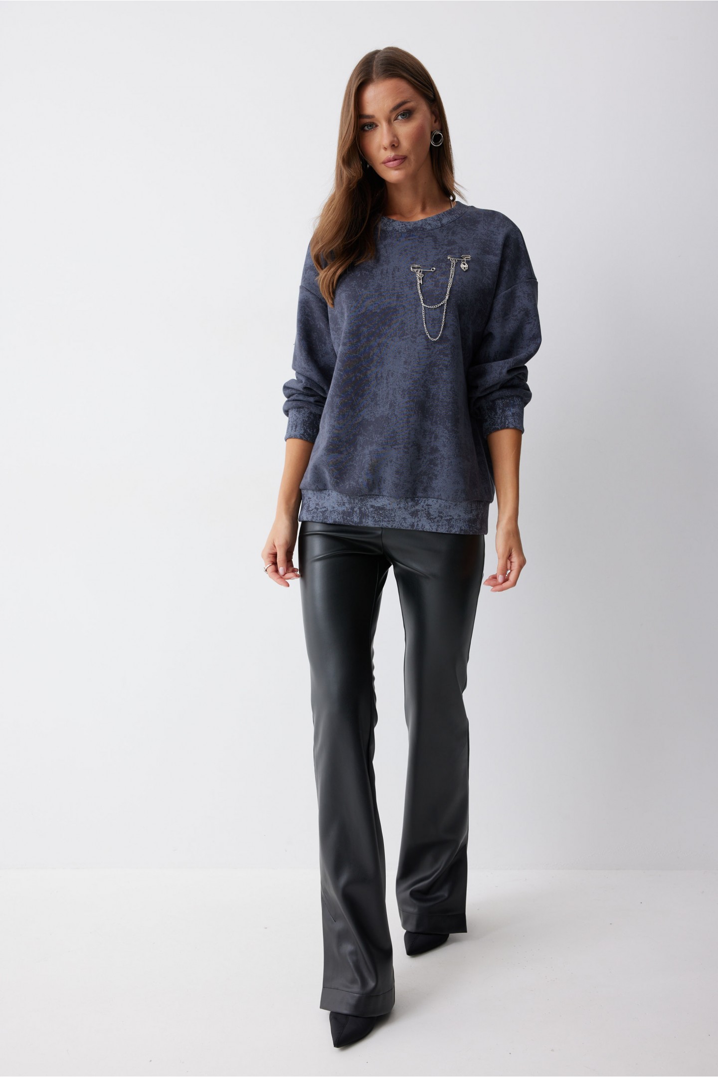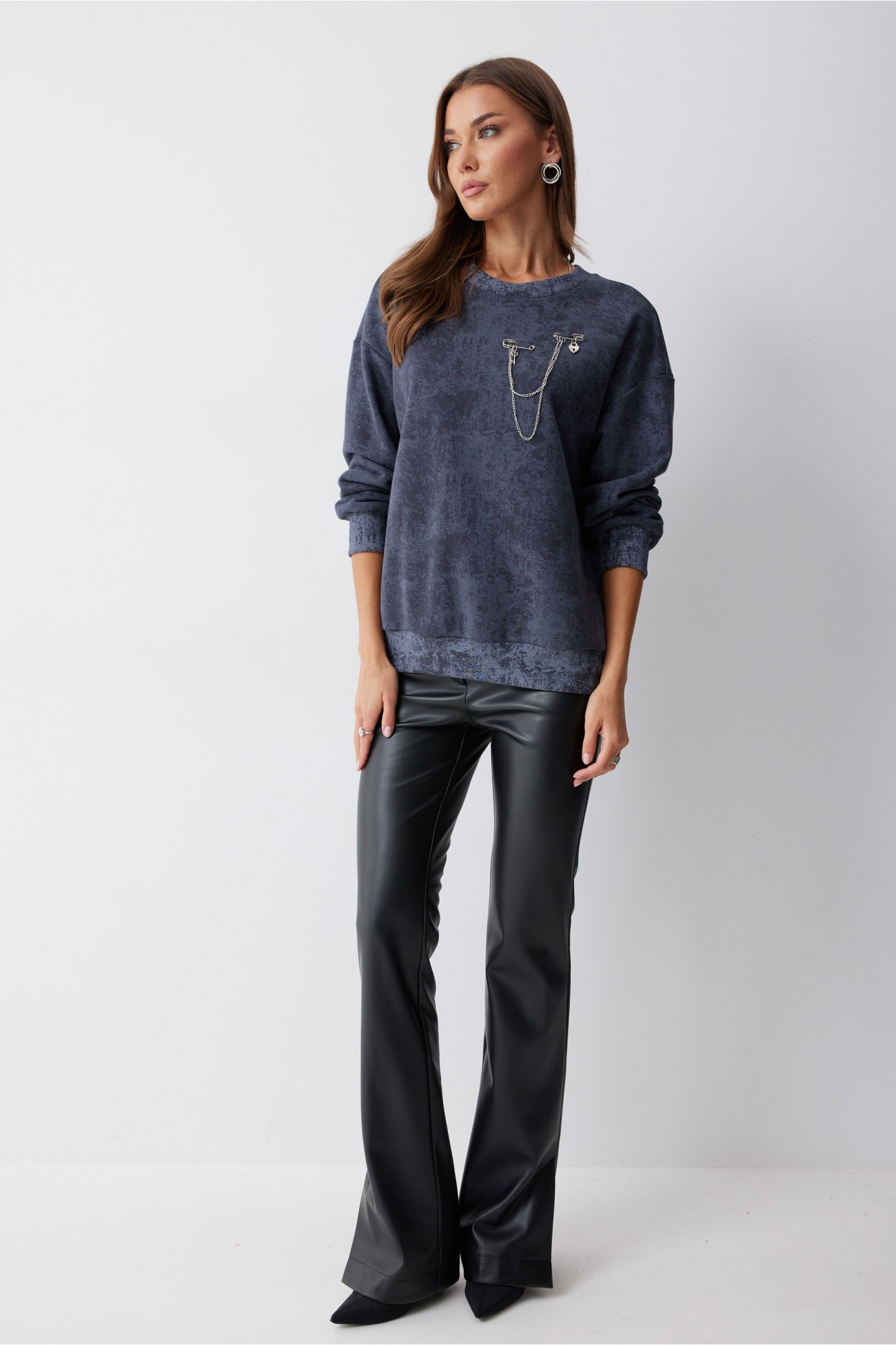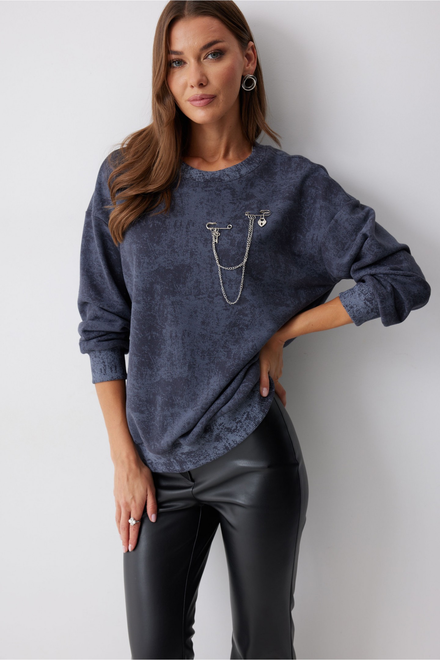 Описание Джемпер прямого силуэта с притачным поясом по низу из трикотажного полотна. Горловина округлая с притачной планкой. Джемпер со спущенным плечом, рукав втачной с притачным манжетом по низу. На спинке расположена дизайнерская вышивка. В комплект входит съёмное украшение. Обращаем ваше внимание, что фурнитура может незначительно отличаться от фото.