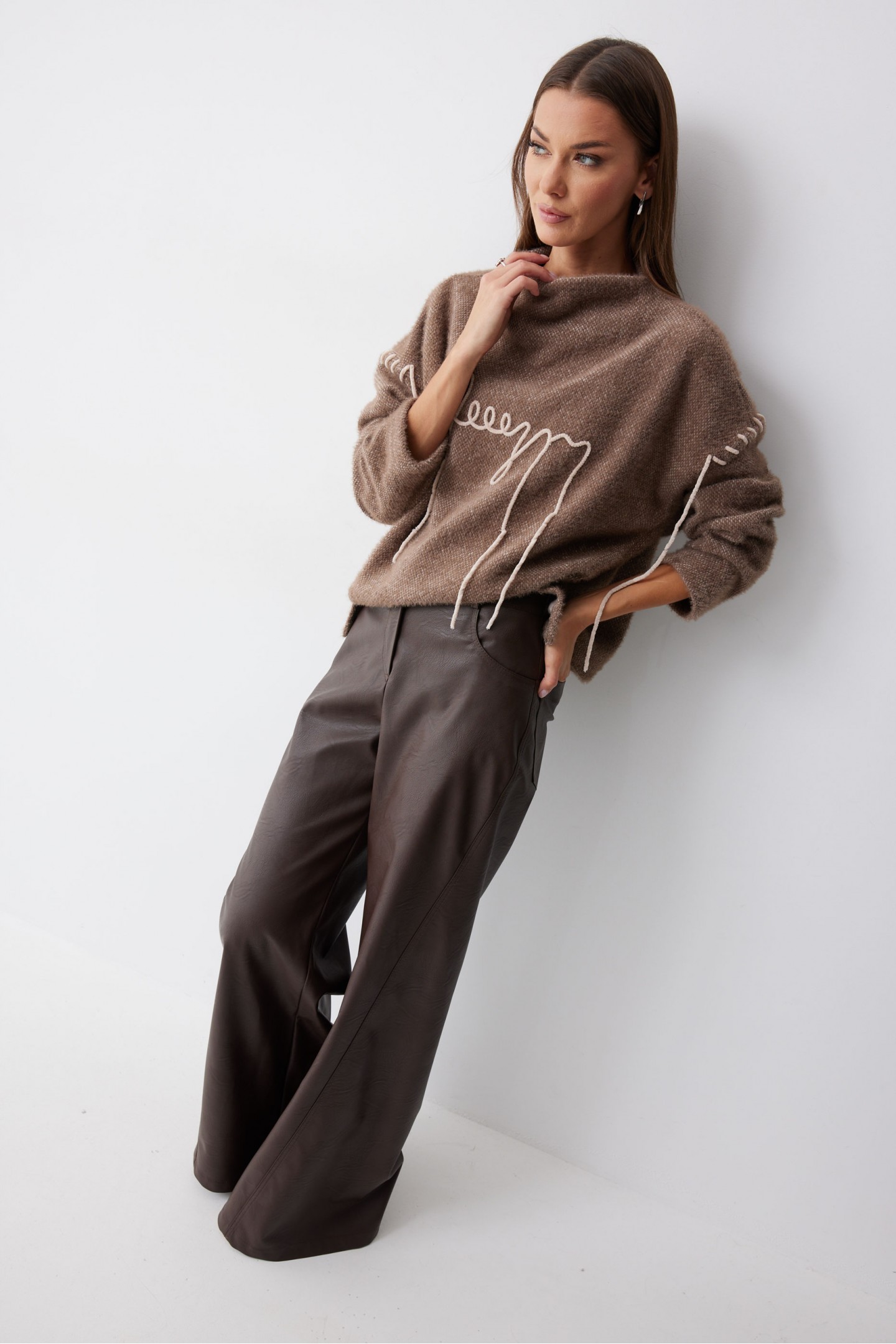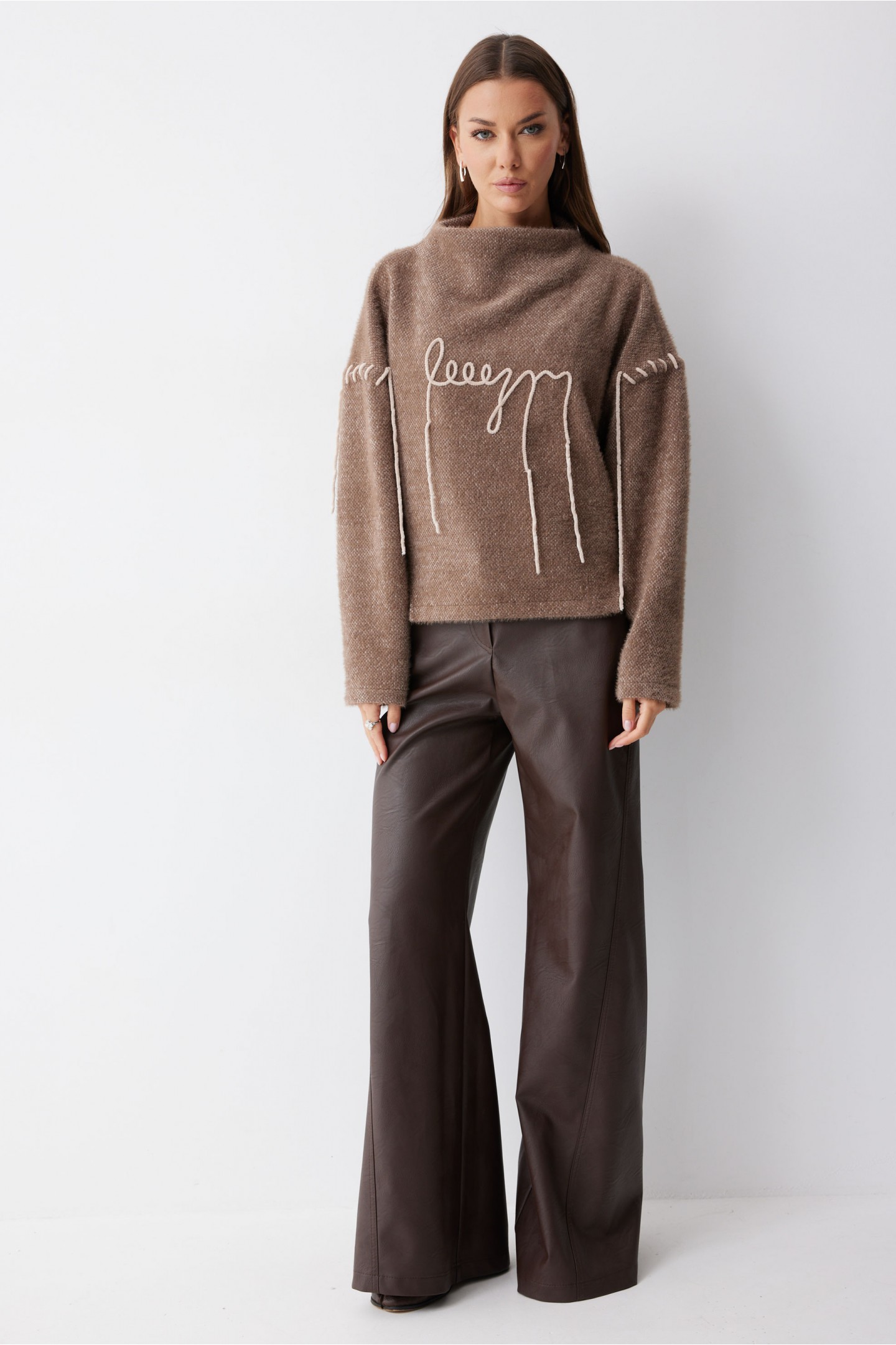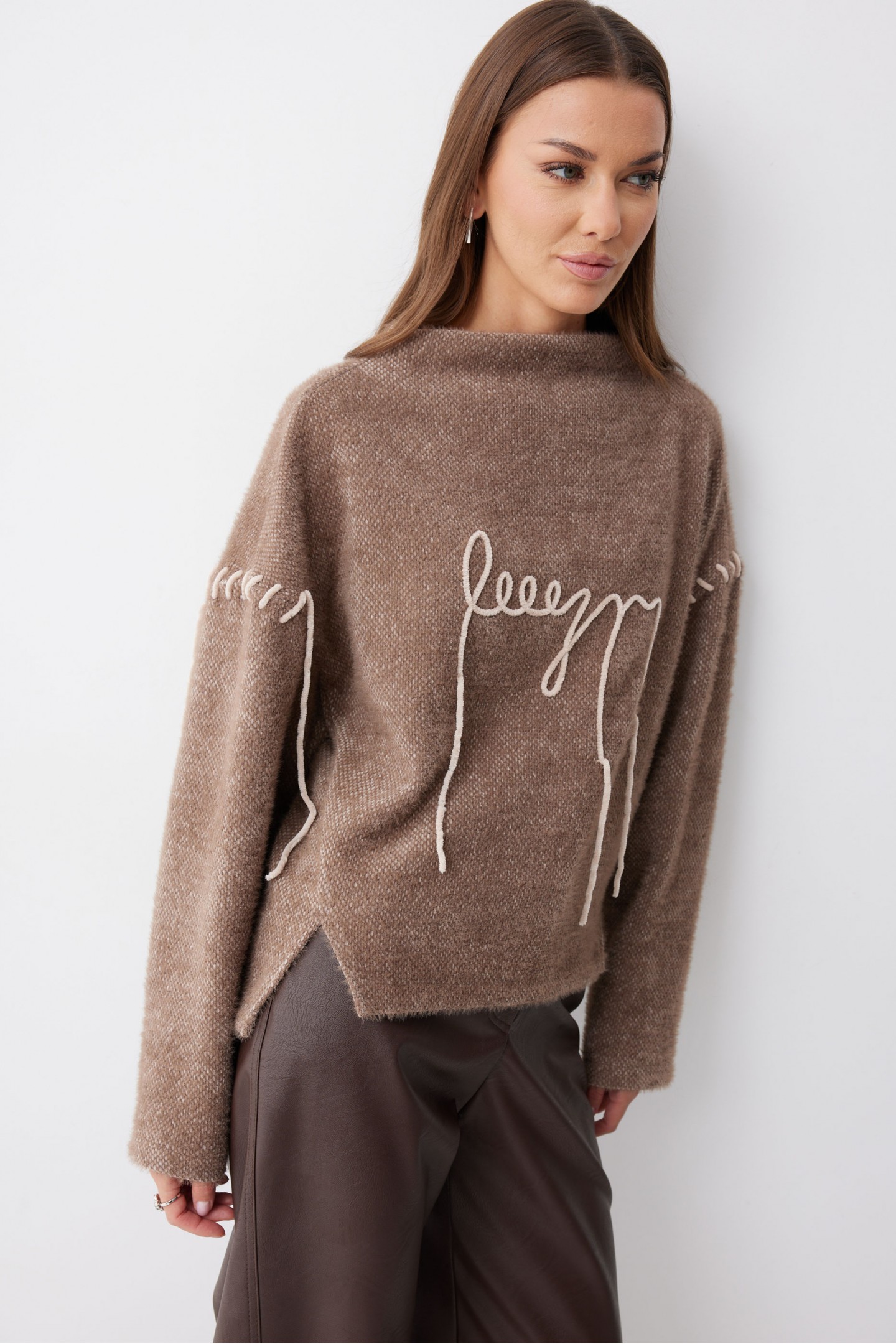Описание Джемпер прямого силуэта из трикотажного полотна с фигурным низом. Горловина цельнокроеная стойка. Рукав со спущенной линией плеча, удлиненный. Джемпер со смещенным боковым швом. По переду джемпера дизайнерская вышивка