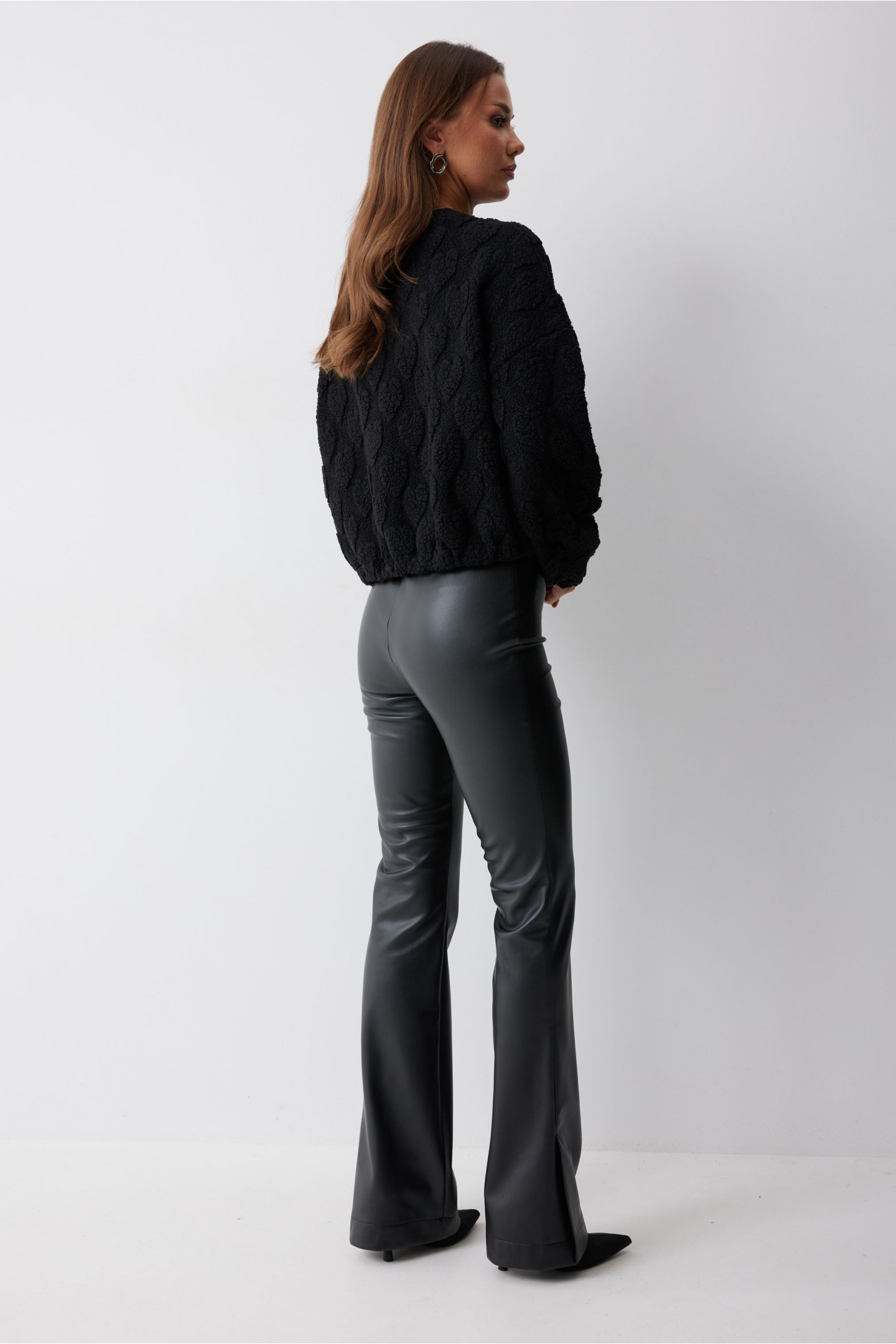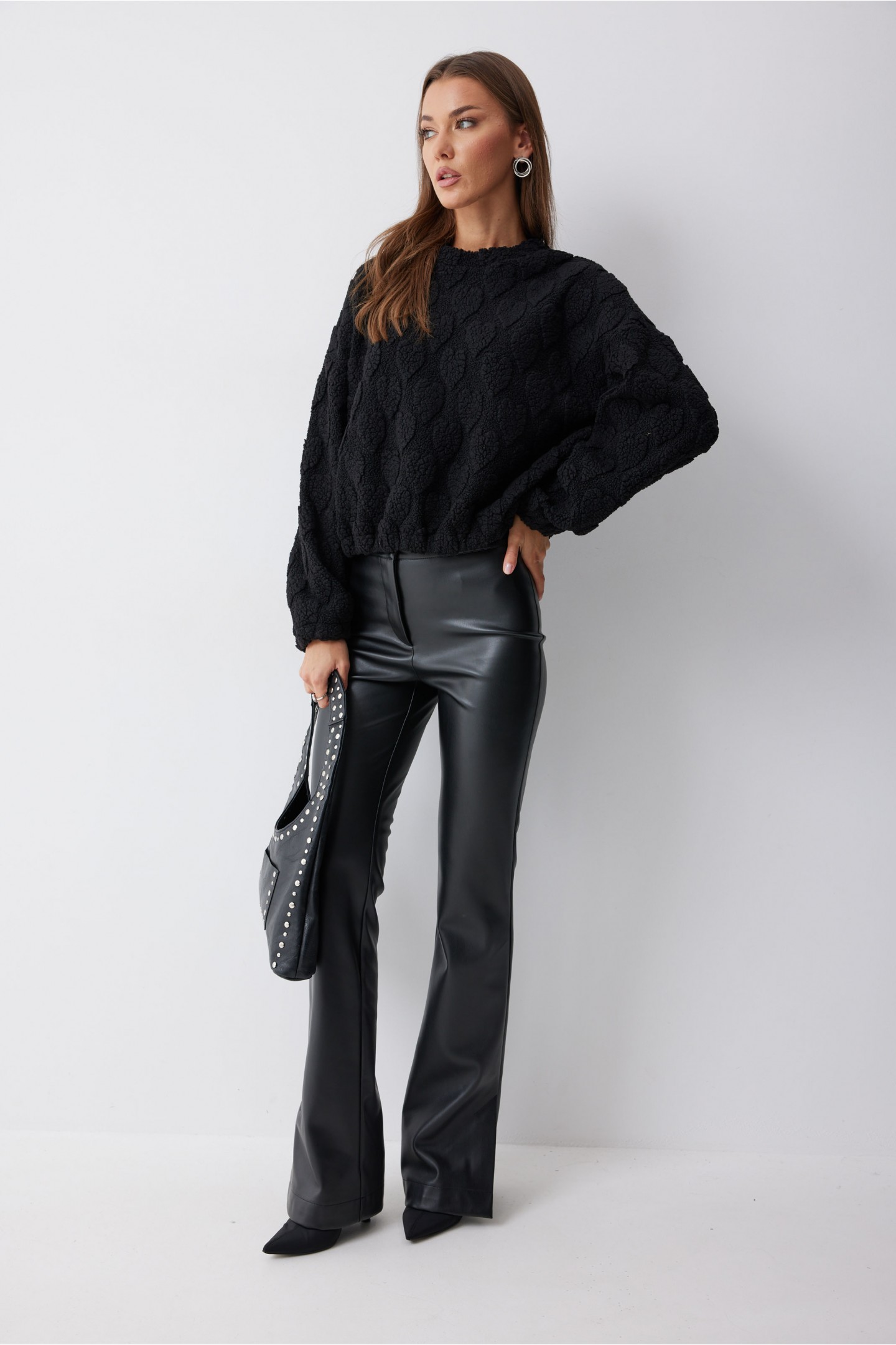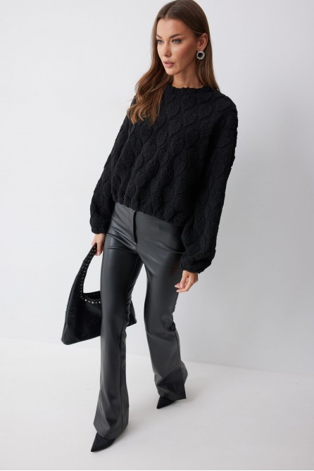 | Описание | Укороченный джемпер прямого силуэта из трикотажного полотна. Горловина округлая. Рукав со спущенной линией плеча, по низу резинка. По низу джемпера резинка. |
