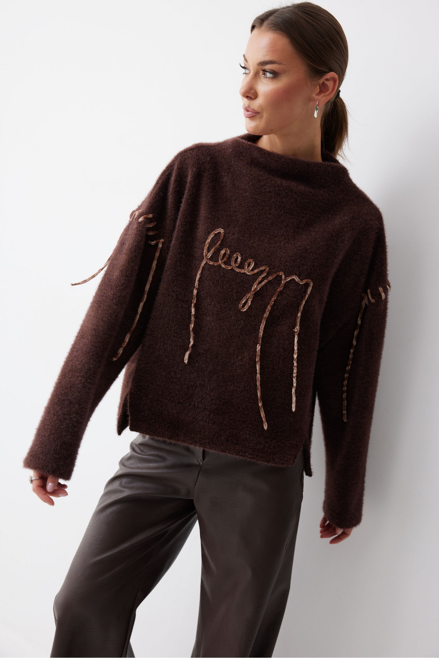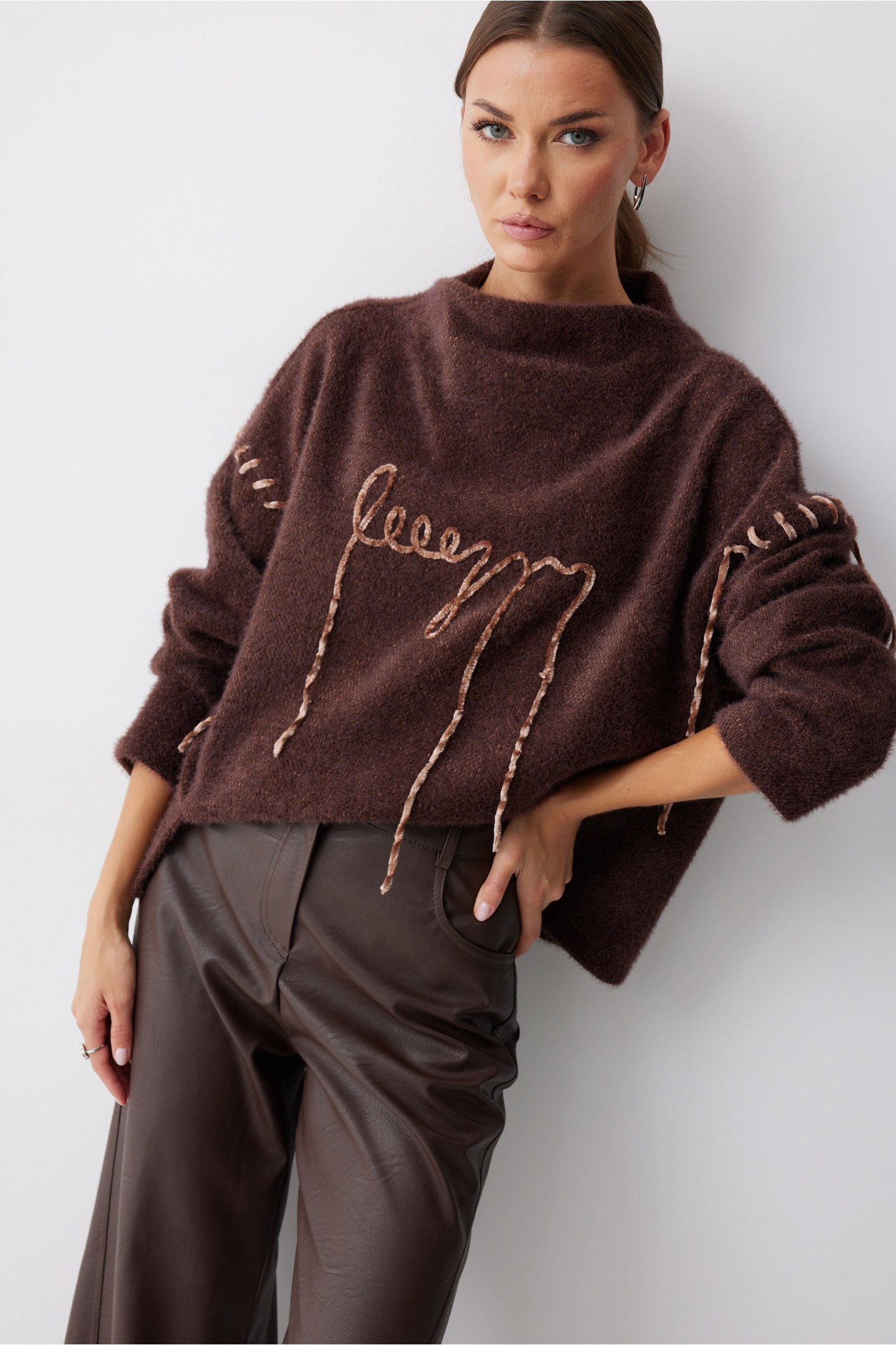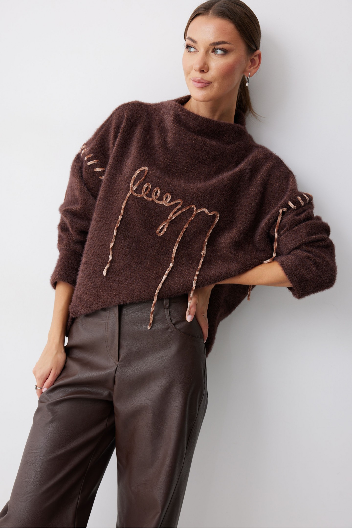 | Описание | Джемпер прямого силуэта из трикотажного полотна с фигурным низом. Горловина цельнокроеная стойка. Рукав со спущенной линией плеча, удлиненный. Джемпер со смещенным боковым швом. По переду джемпера дизайнерская вышивка |