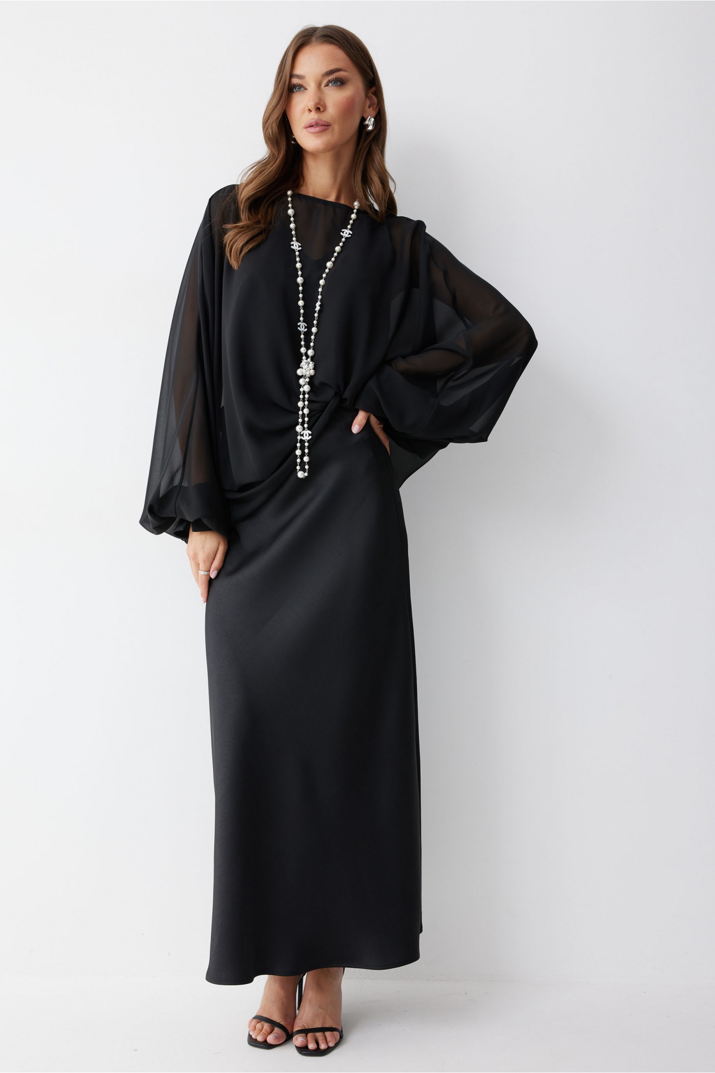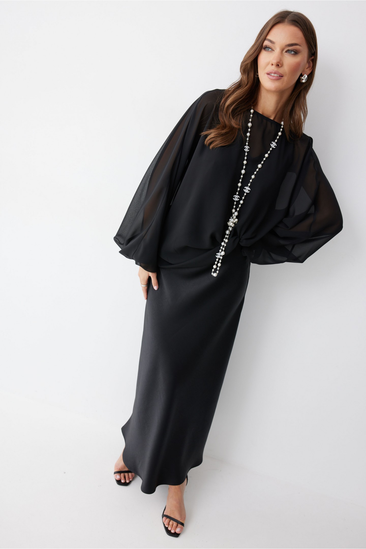 | Описание | Блуза из шифона. Свободного, расширенного силуэта, с широким цельнокроеным рукавом со сборкой по нижнему срезу. Рукав с манжетой, манжета с застежкой на петлю с пуговицей. Горловина овальной формы. Застежка по среднему шву спинки на петлю с пуговицей. Нижняя блуза из струящейся ткани. Силуэт прямой, свободный. С глубоким V- образным вырезом горловины по переду. С нагрудными вытачками. |