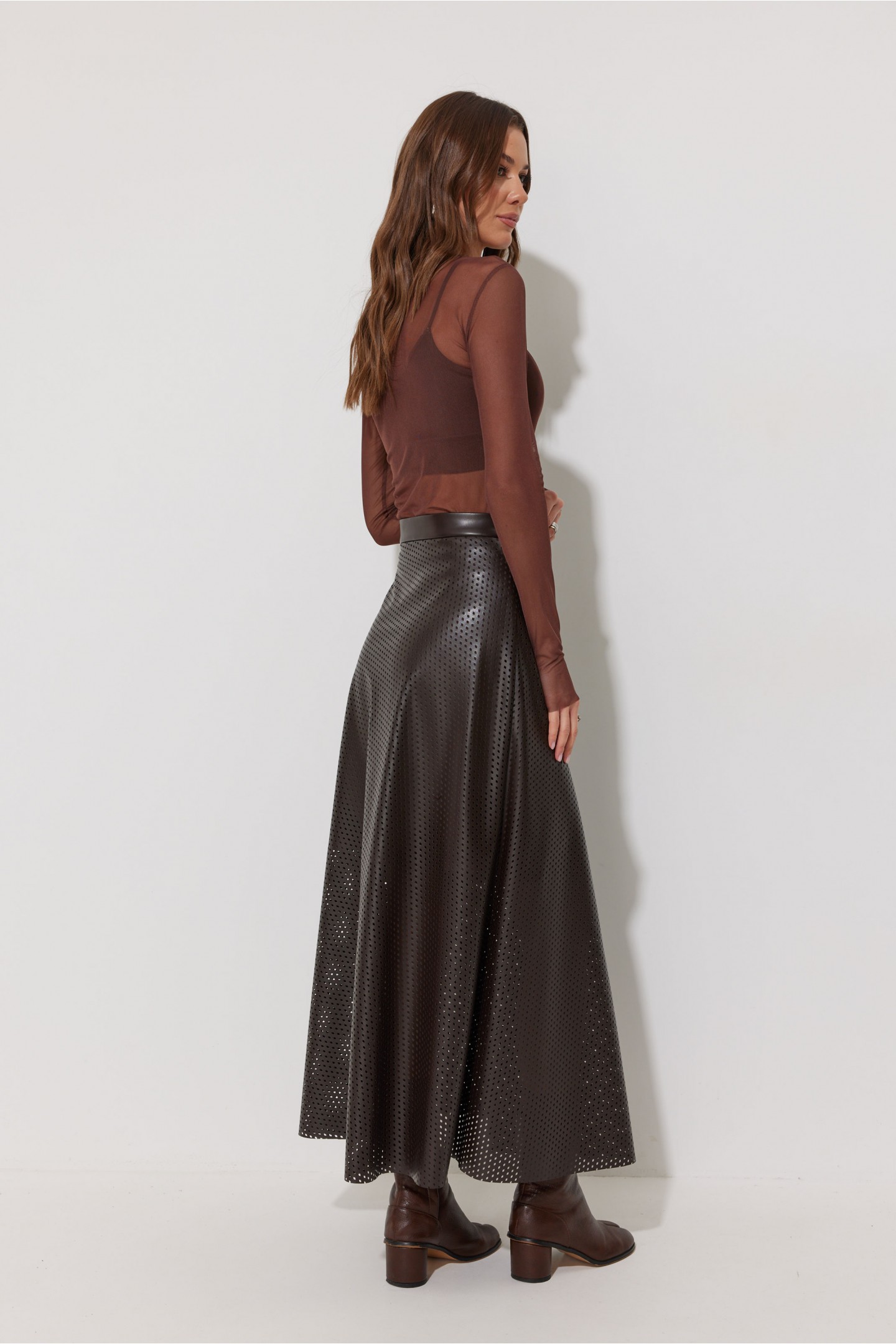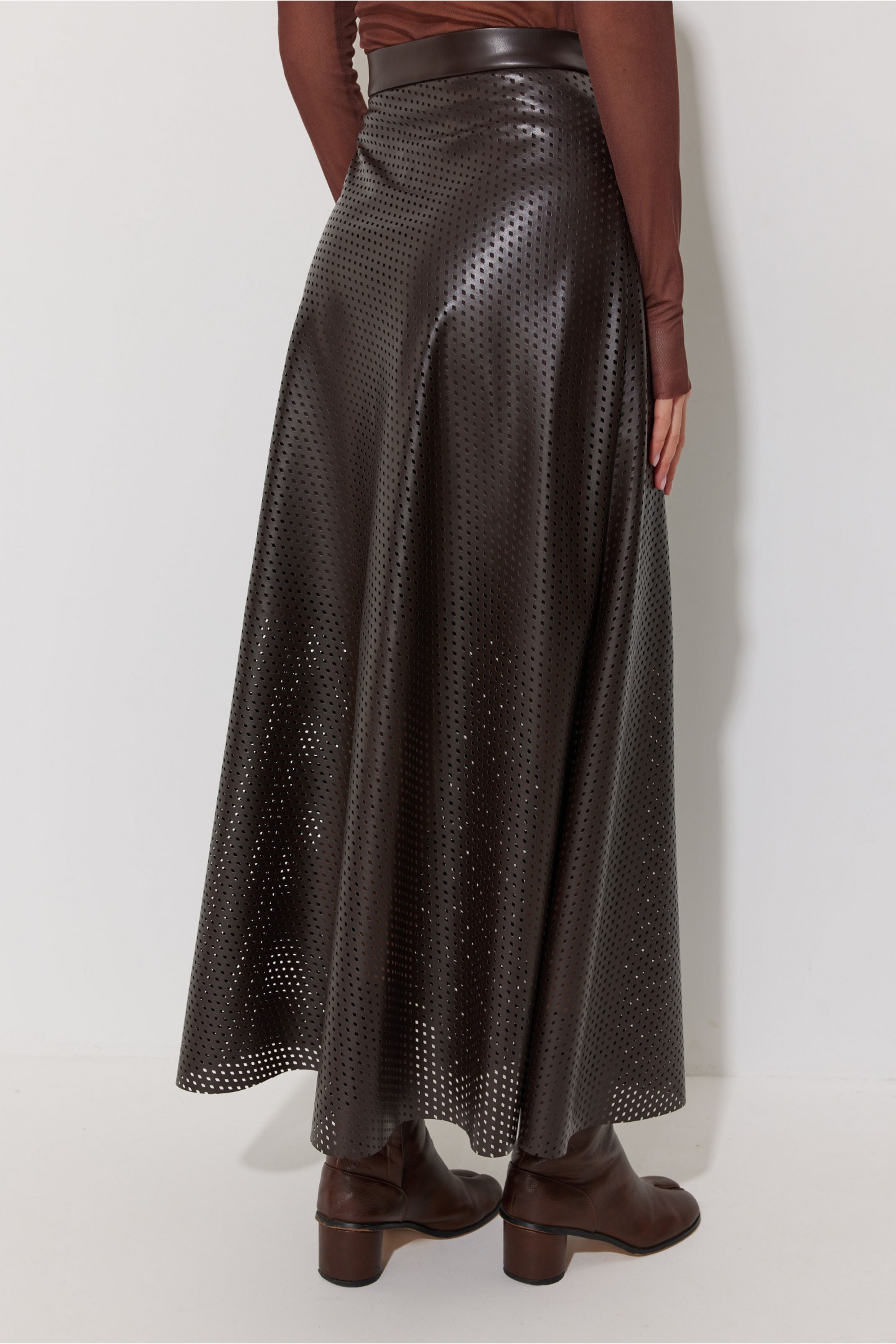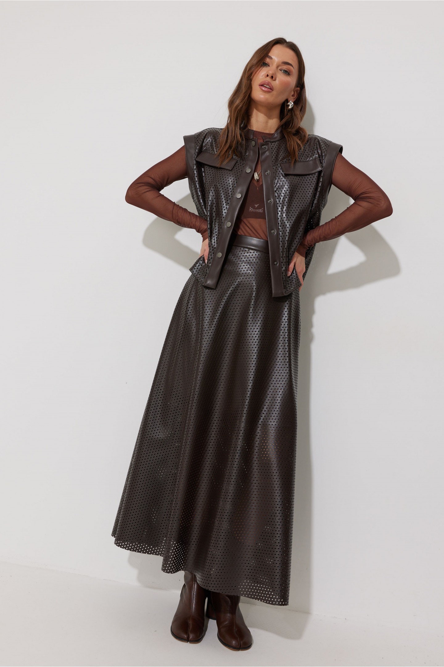 Описание Юбка двухшовная расширенная книзу из экокожи с перфорацией. По верху юбки притачной пояс, на спинке застежка на потайную молнию.