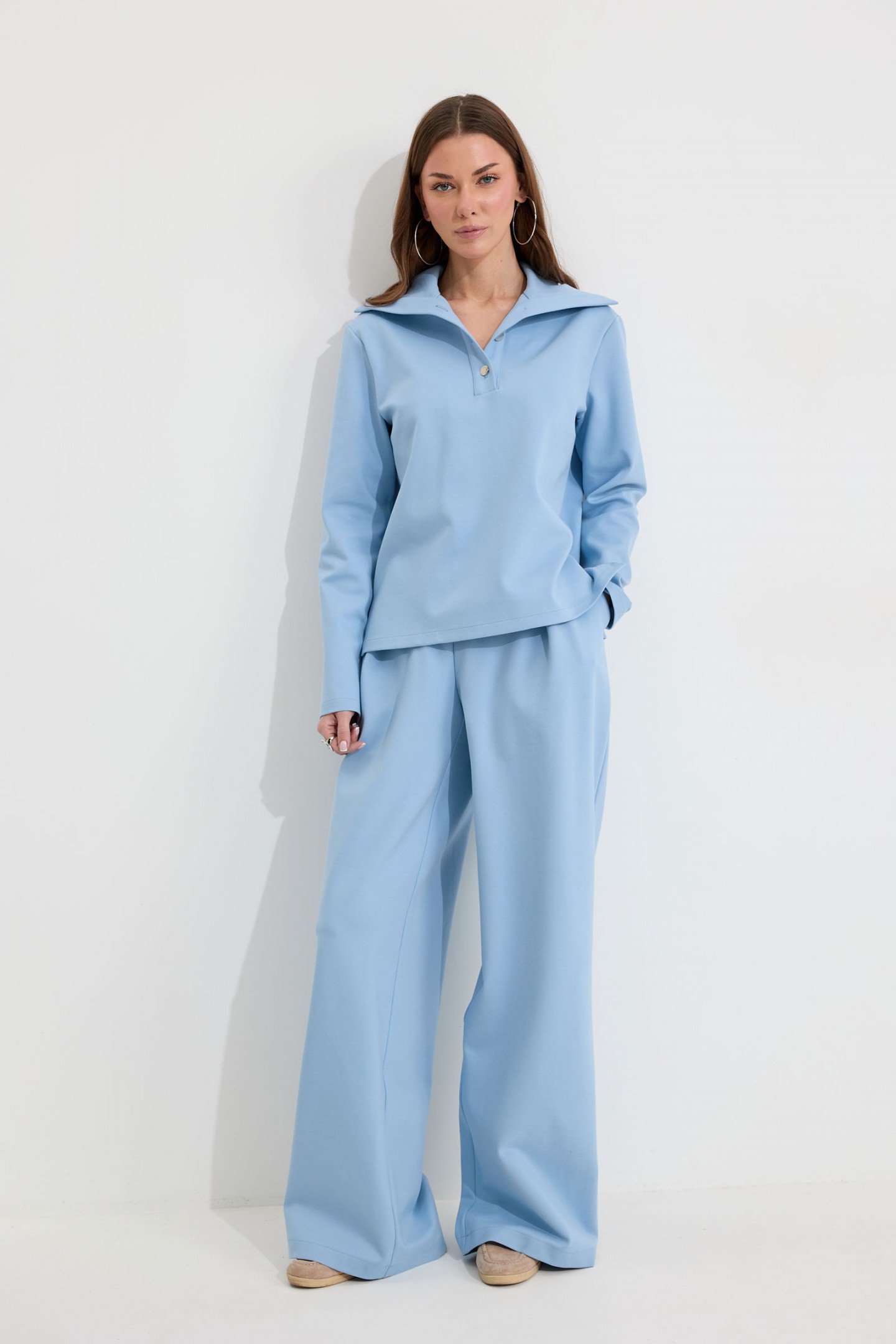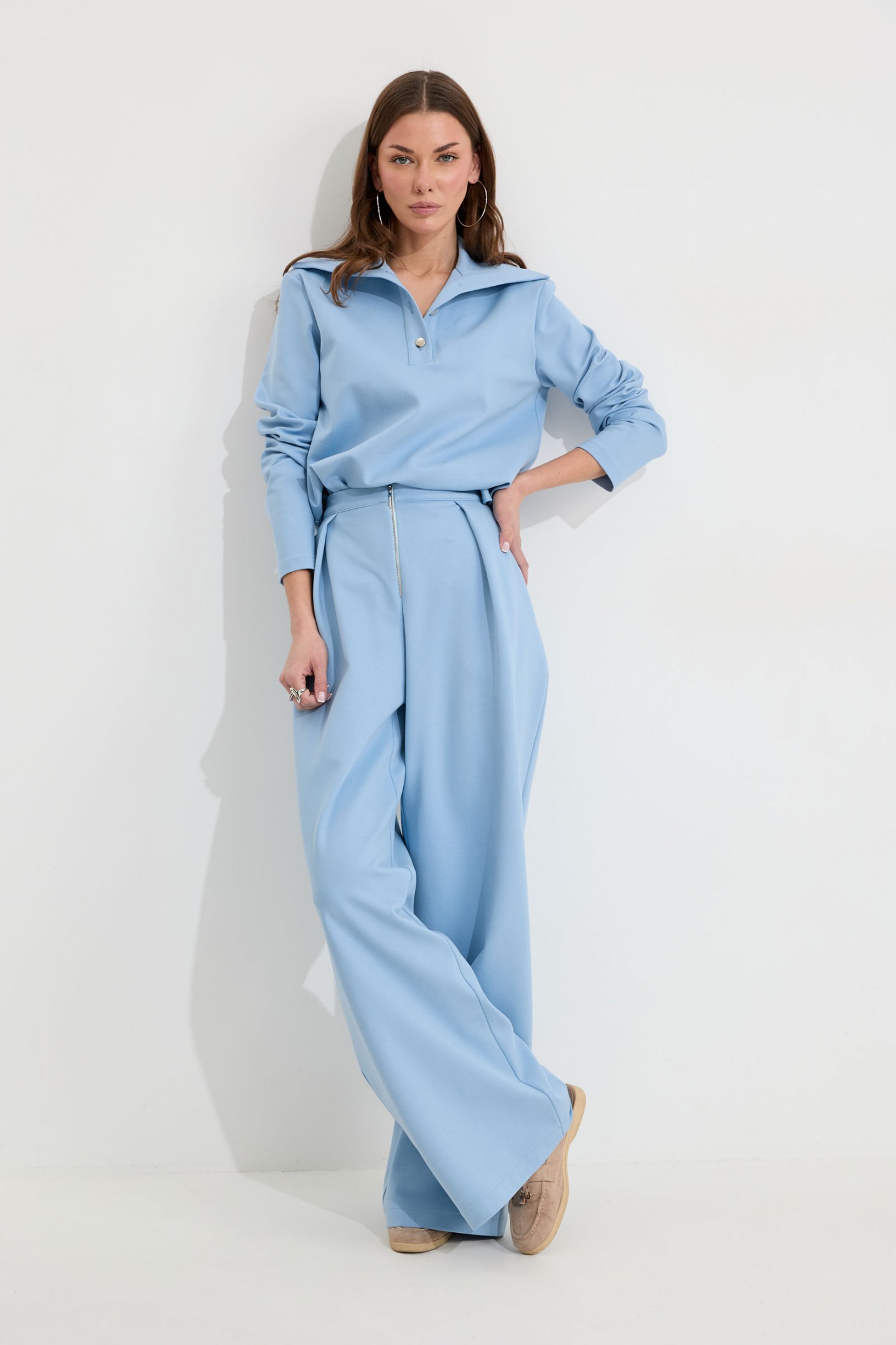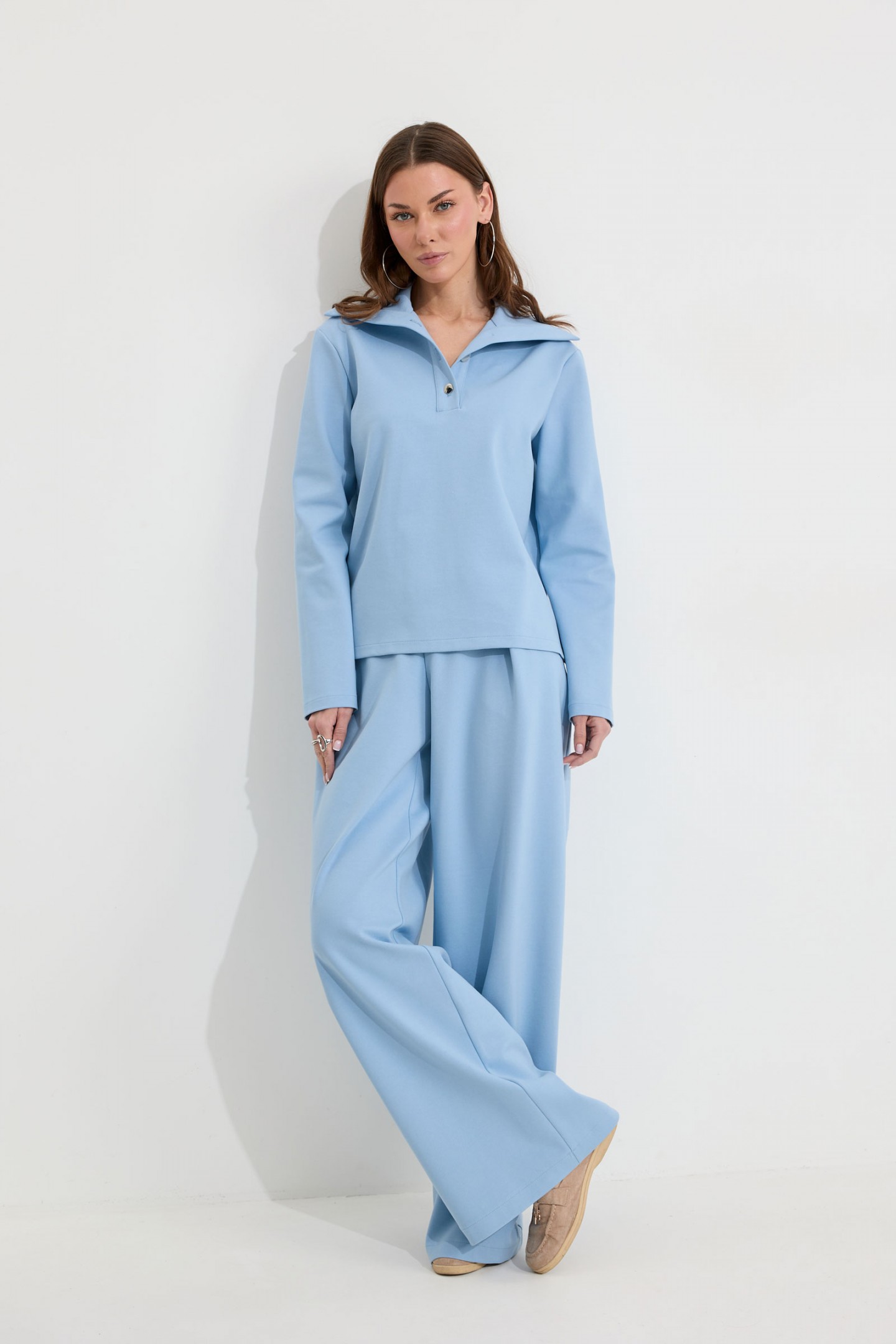 | Описание | Костюм состоящий из джемпера и брюк. Джемпер прямого силуэта из трикотажного полотна. Воротник - широкая стойка. Горловина с застежкой на петлю и пуговицу. Рукав одношовный втачной, чуть спущена линия плеча. По низу джемпера в боковых швах разрезы. Обращаем ваше внимание, что фурнитура может отличаться от фото. Брюки прямого силуэта из трикотажного полотна. По верху брюк притачной пояс, по переду застежка молния в среднем шве, карманы в боковых швах и декоративные складки. На задних половинках брюк прорезные листочки. По задним половинкам брюк на поясе резинка от вытачки до вытачки. Обращаем ваше внимание, что фурнитура может отличаться от фото. |