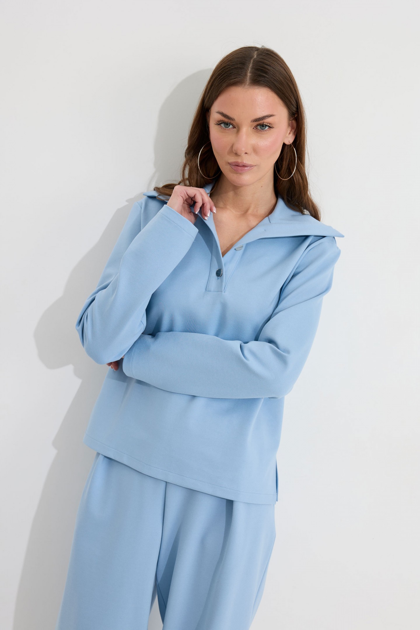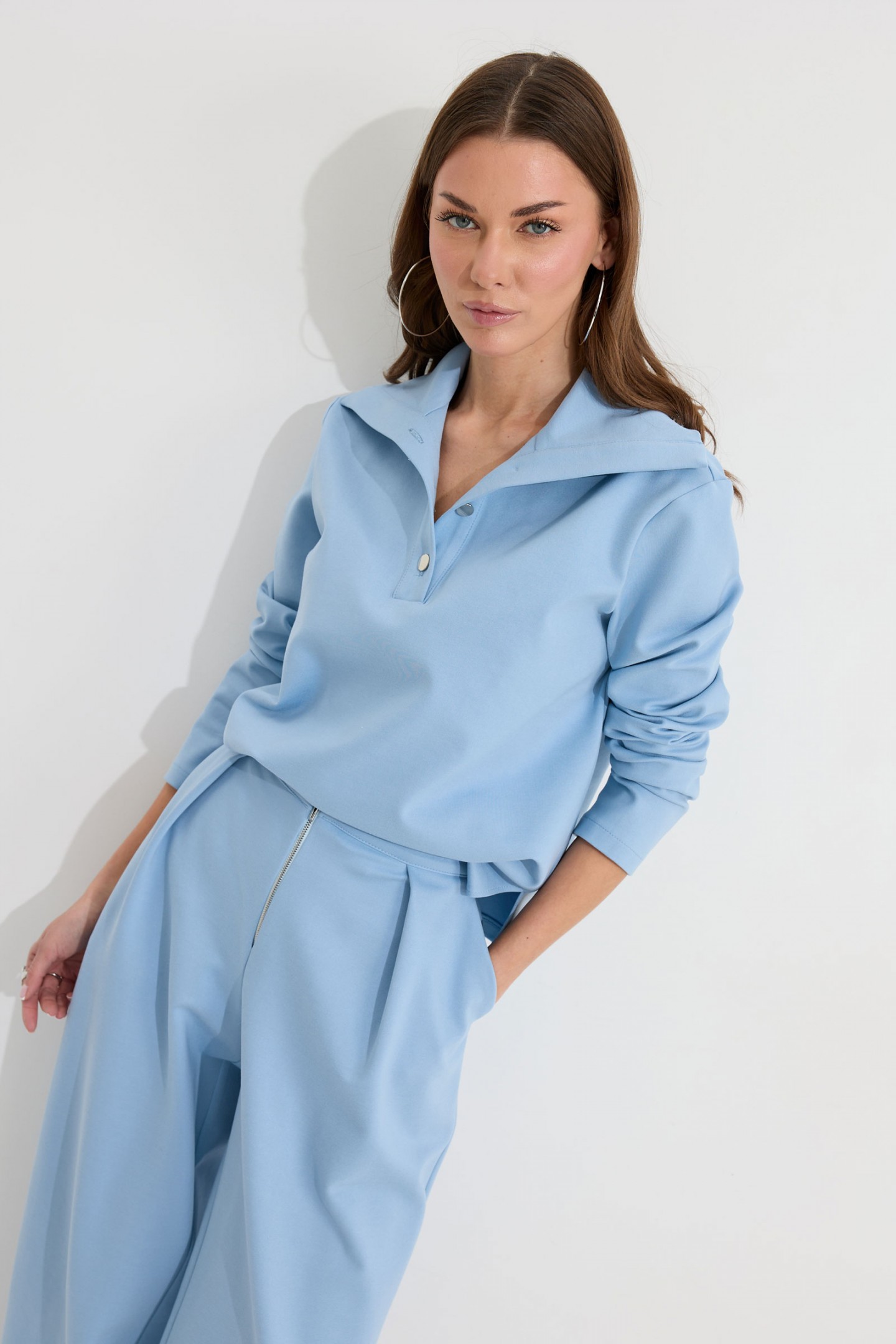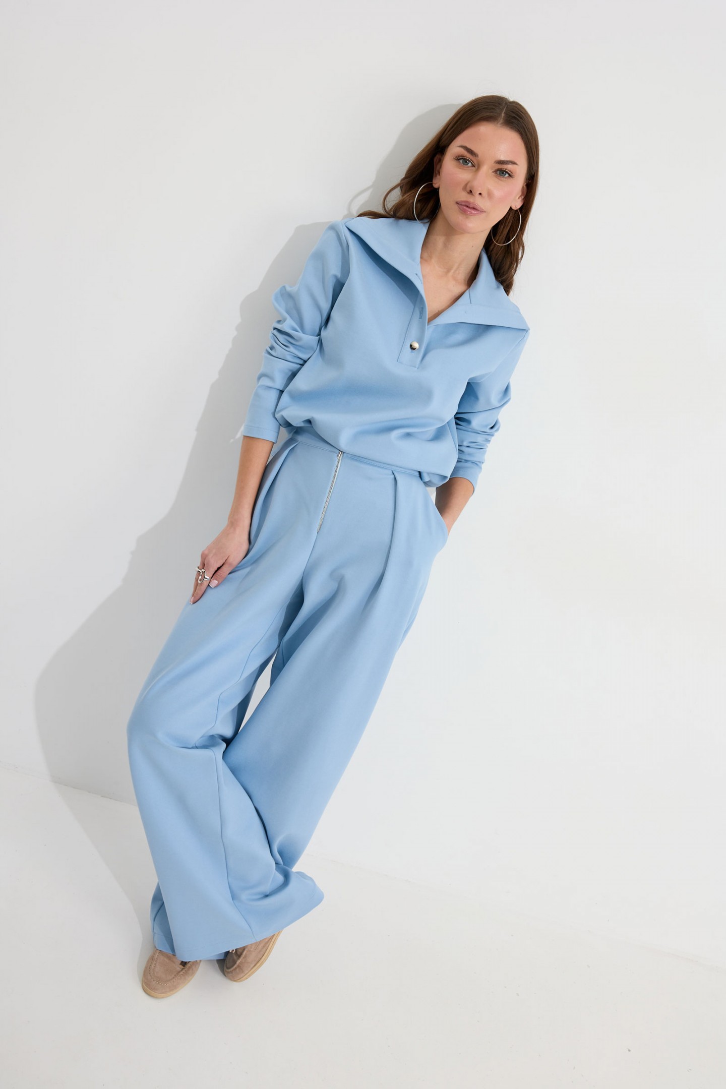 | Описание | Костюм состоящий из джемпера и брюк. Джемпер прямого силуэта из трикотажного полотна. Воротник - широкая стойка. Горловина с застежкой на петлю и пуговицу. Рукав одношовный втачной, чуть спущена линия плеча. По низу джемпера в боковых швах разрезы. Обращаем ваше внимание, что фурнитура может отличаться от фото. Брюки прямого силуэта из трикотажного полотна. По верху брюк притачной пояс, по переду застежка молния в среднем шве, карманы в боковых швах и декоративные складки. На задних половинках брюк прорезные листочки. По задним половинкам брюк на поясе резинка от вытачки до вытачки. Обращаем ваше внимание, что фурнитура может отличаться от фото. |