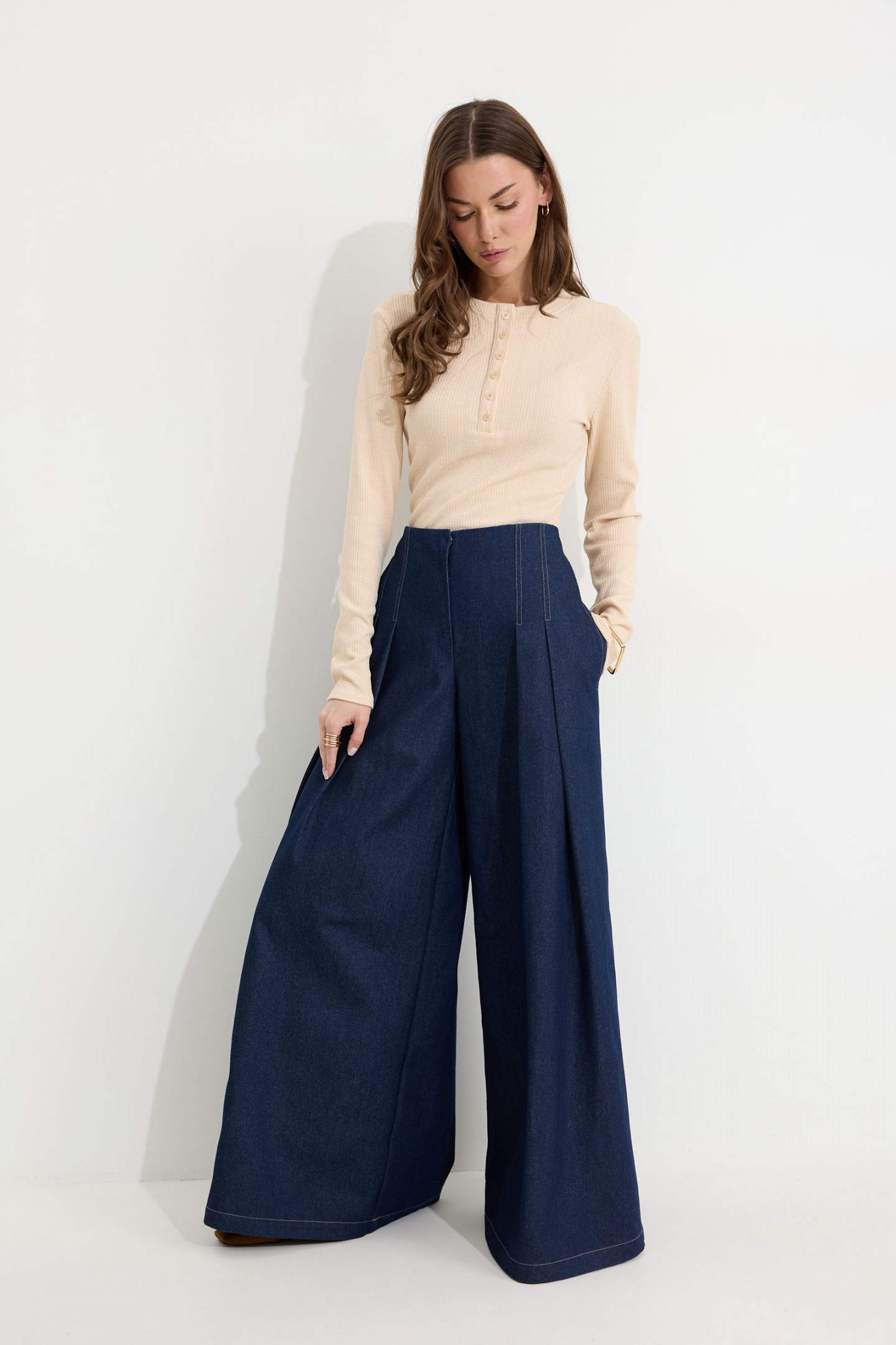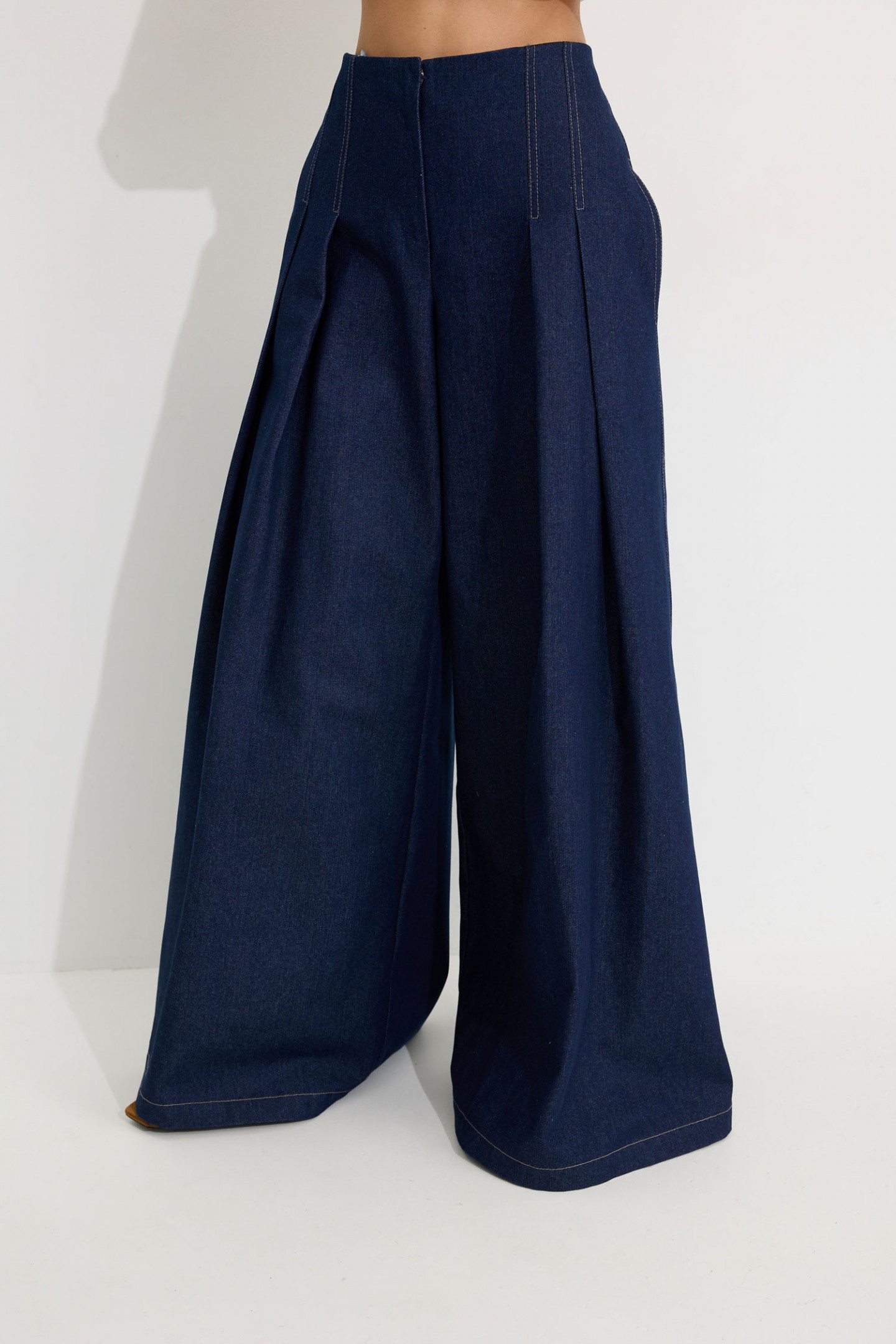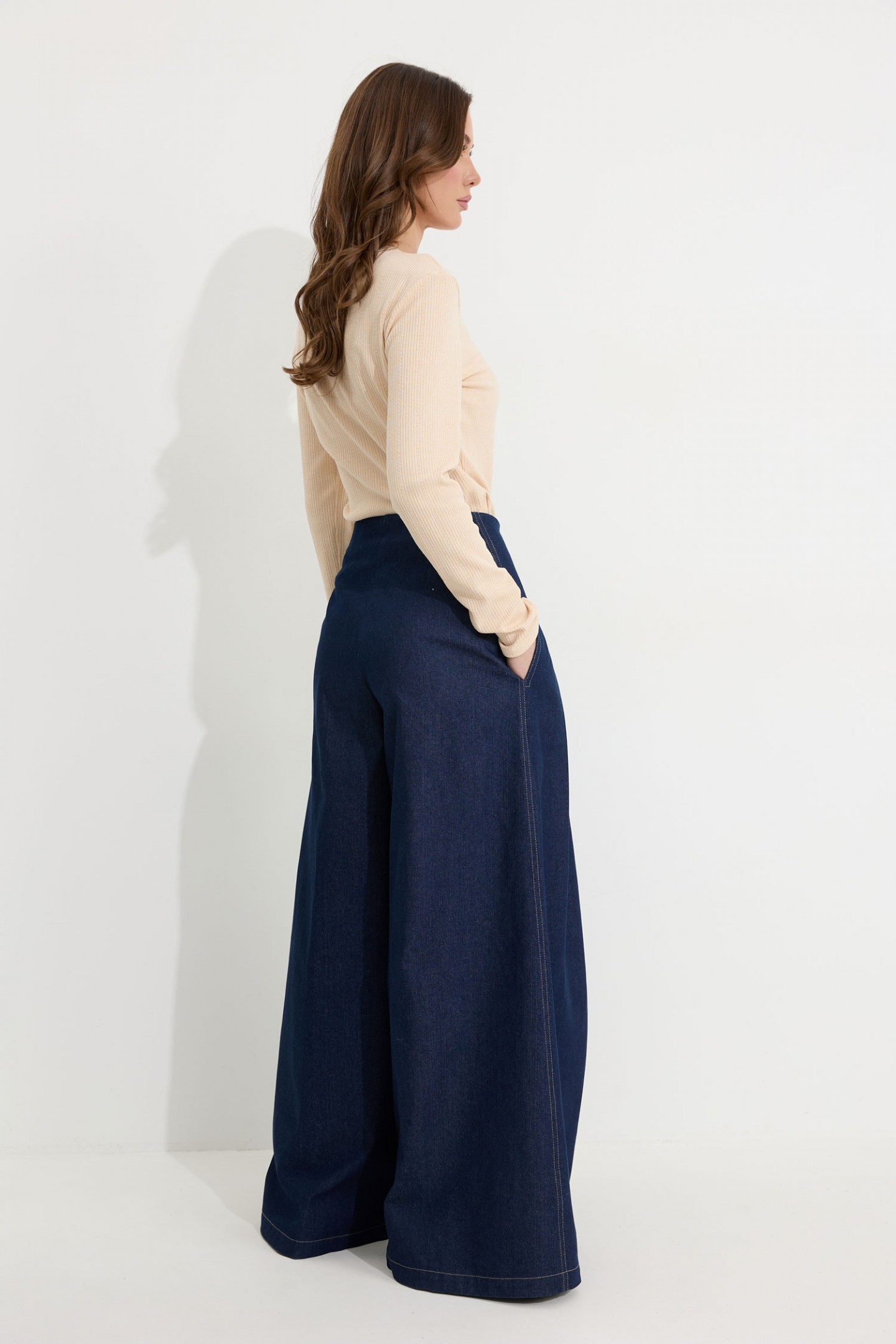| Описание | Брюки-палаццо из хлопкового денима. Посадка до линии талии, с расширением от линии бедра. Без пояса, верхний срез обтачной. На передних половинах брюк по две складки, застрочены на 15 см от верха. По переду застежка на молнию по типу гульфик, а также на пришивную потайную кнопку и потайную пуговицу. На задних половинах брюк по две вытачки. Карманы в боковых швах. По боковым швам, входам карманов, складкам по переду, по подгибке низа проложены двойные отделочные строчки контрастного цвета. |