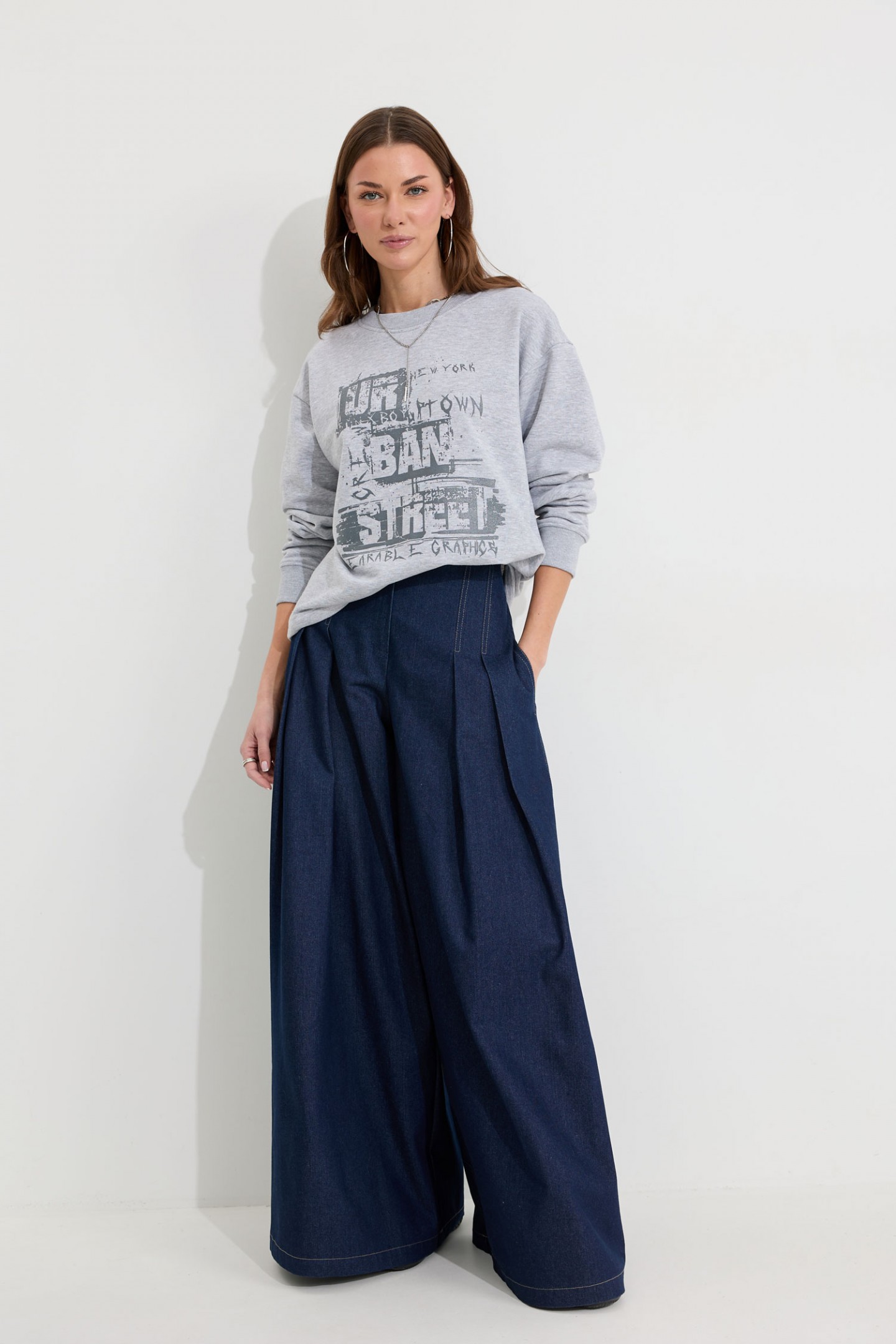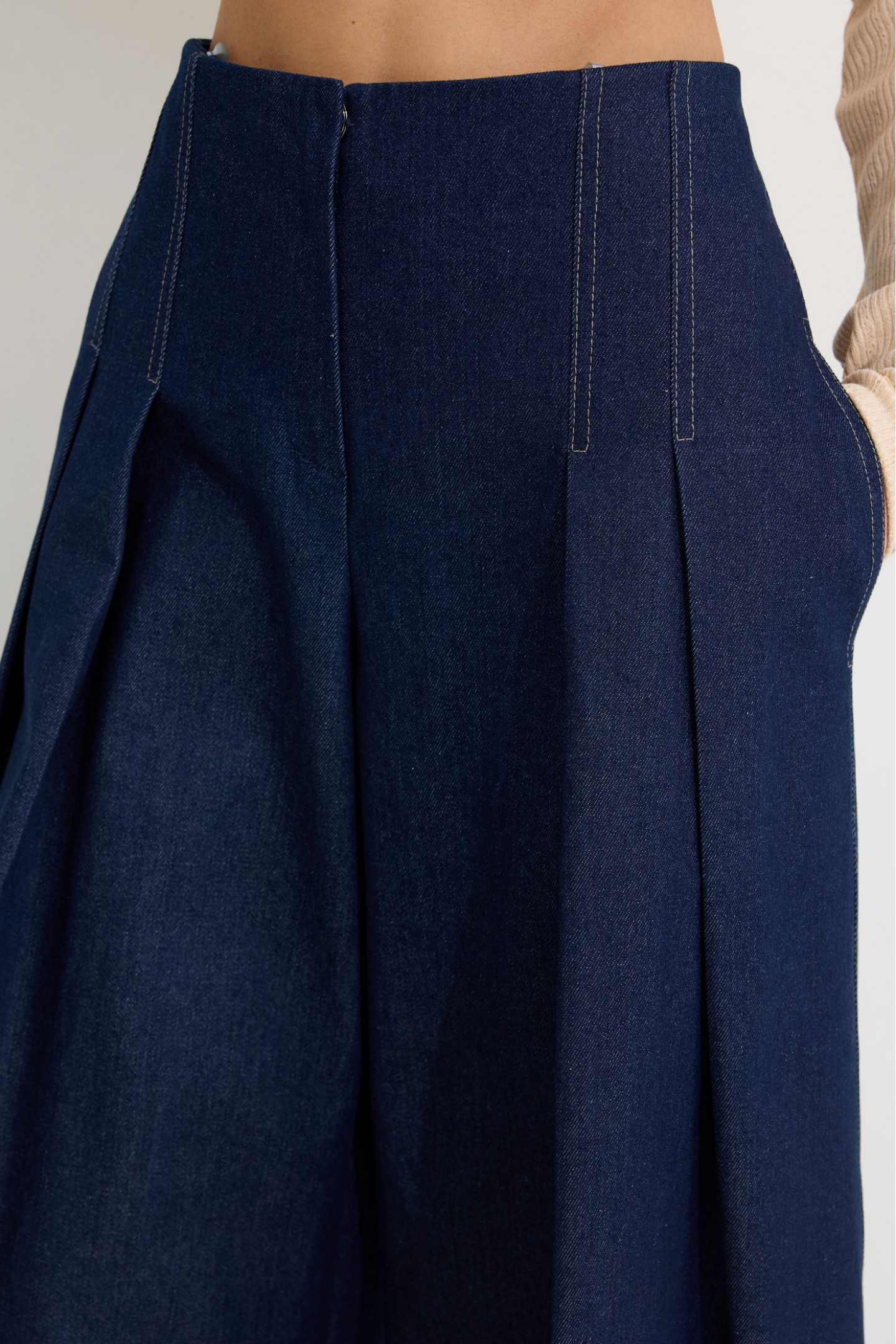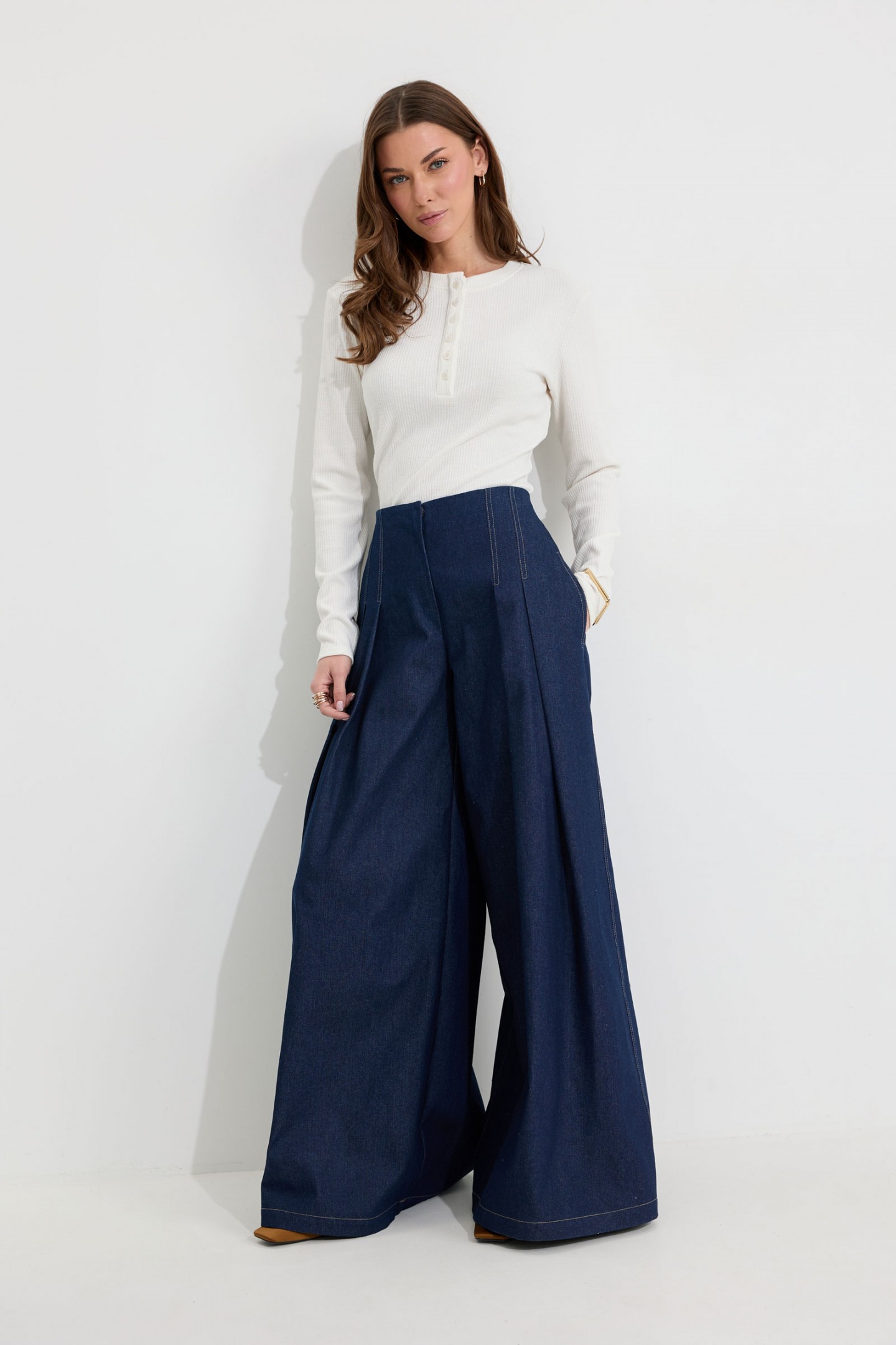 | Описание | Брюки-палаццо из хлопкового денима. Посадка до линии талии, с расширением от линии бедра. Без пояса, верхний срез обтачной. На передних половинах брюк по две складки, застрочены на 15 см от верха. По переду застежка на молнию по типу гульфик, а также на пришивную потайную кнопку и потайную пуговицу. На задних половинах брюк по две вытачки. Карманы в боковых швах. По боковым швам, входам карманов, складкам по переду, по подгибке низа проложены двойные отделочные строчки контрастного цвета. |
