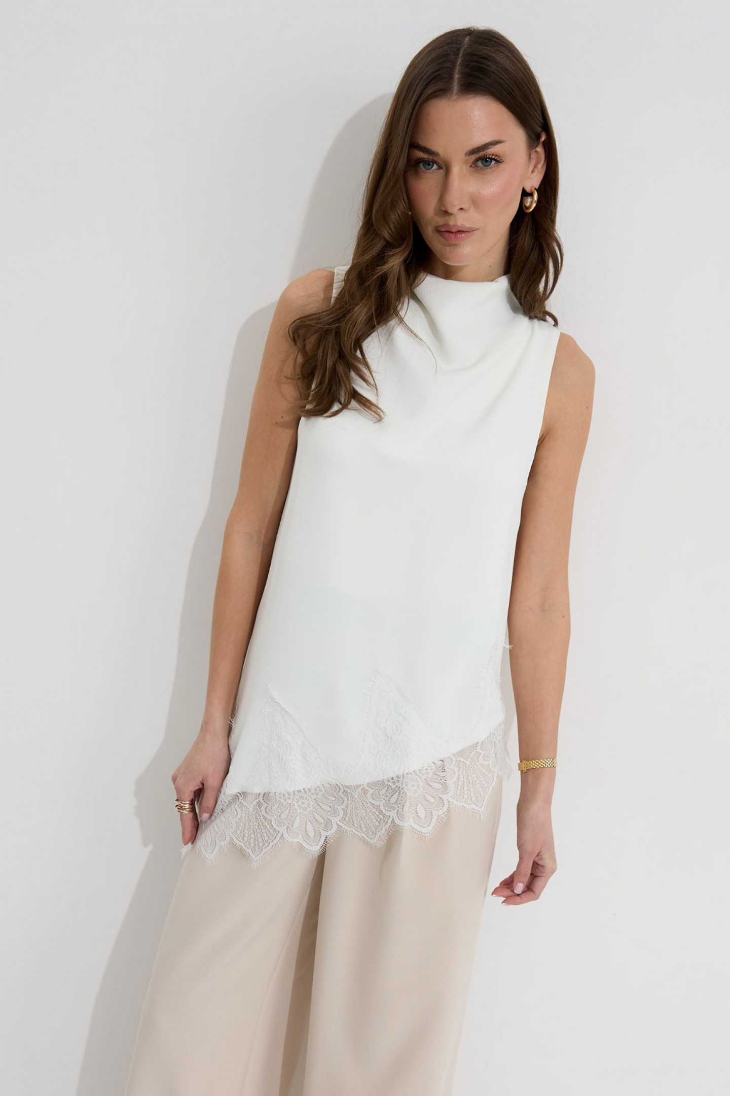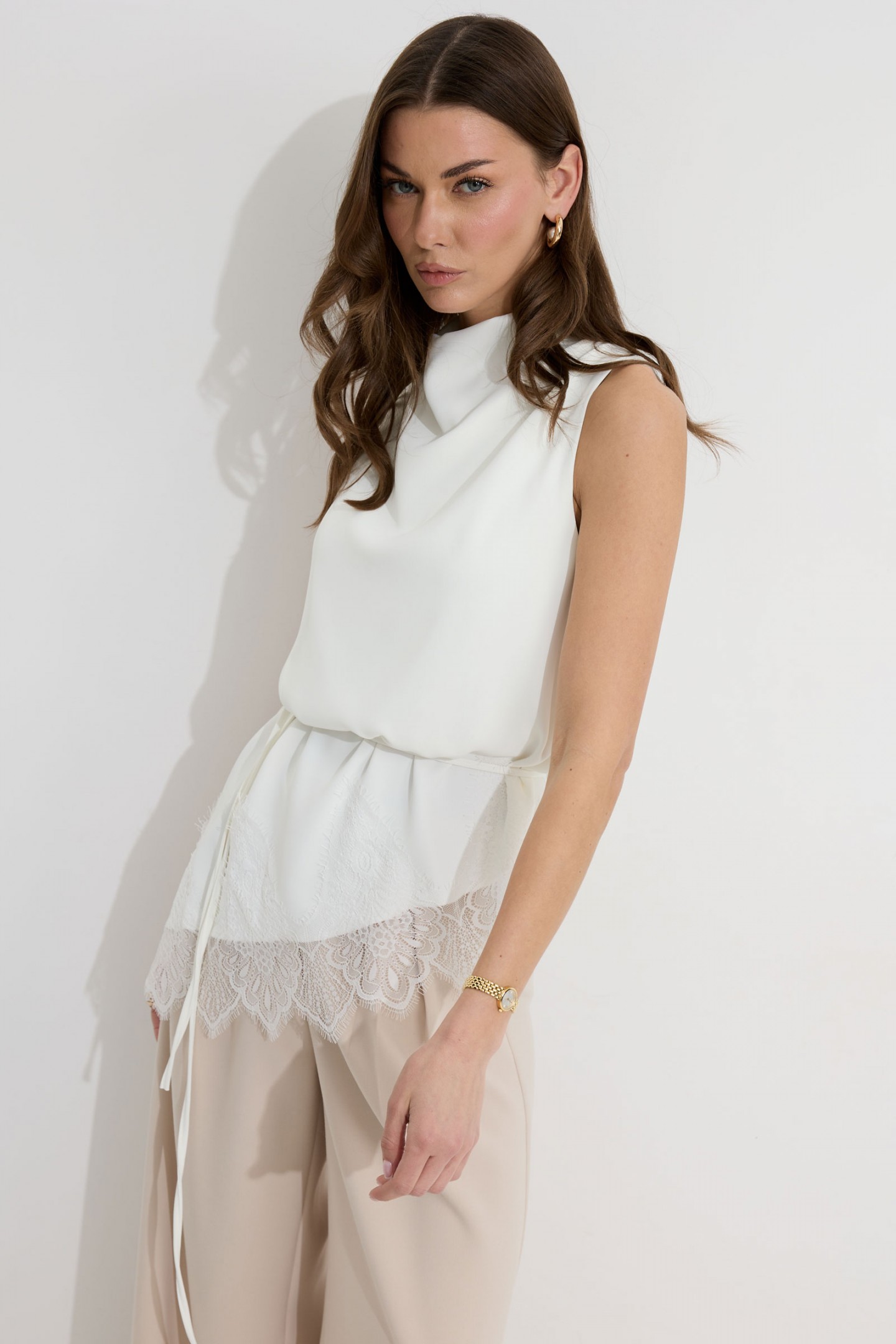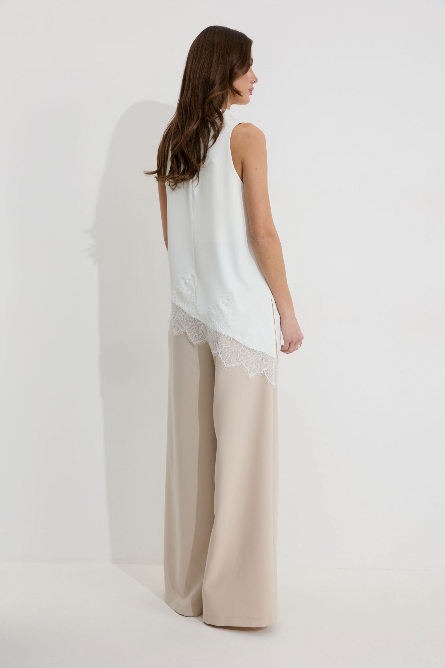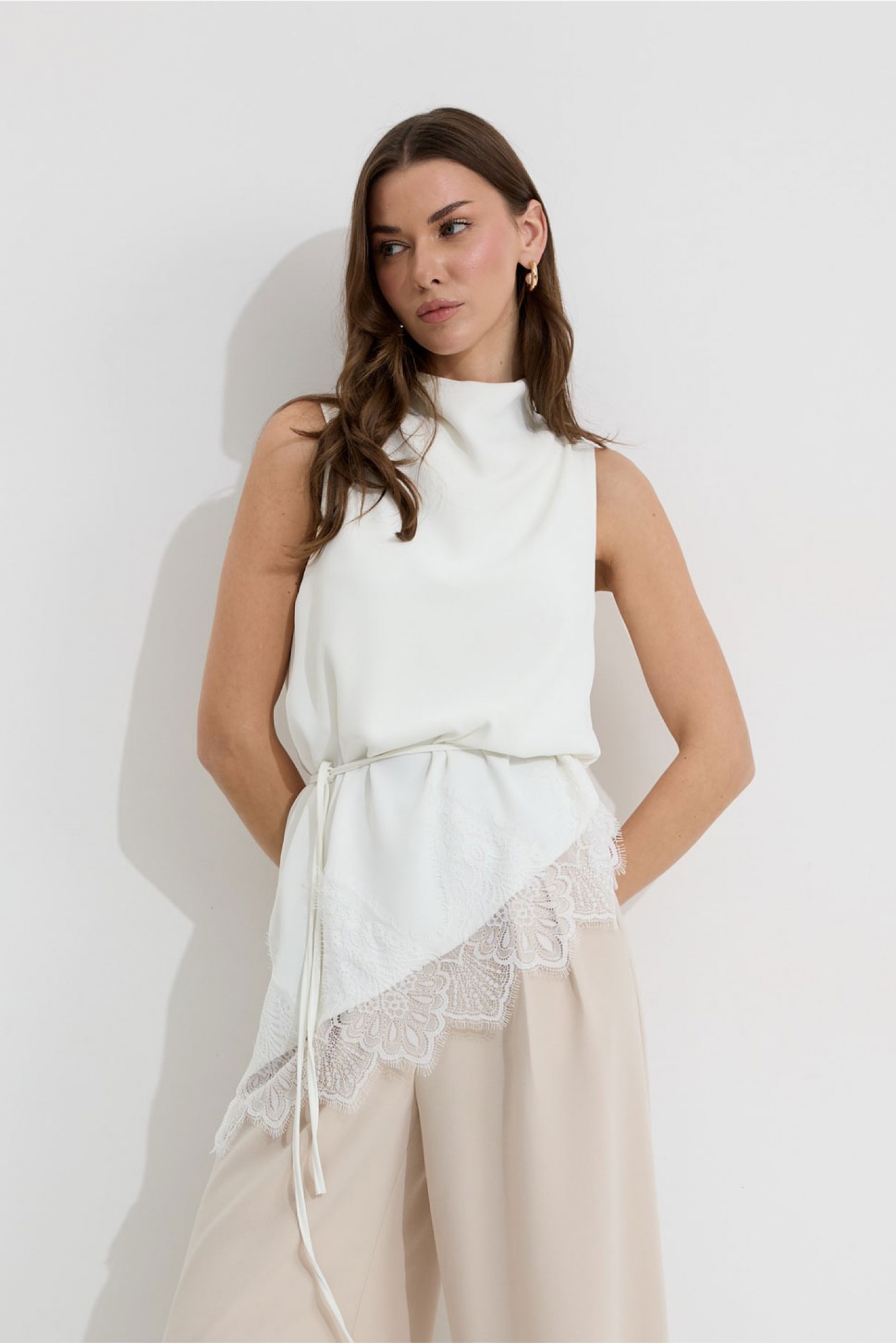 | Описание | Ассиметричная блузка полуприлегающего силуэта из струящейся ткани. Горловина цельнокроеная. По низу декоративная тесьма( кружево). По низу в боковом шве разрез. Пояс-шнурок из основной ткани идет в комплект. |