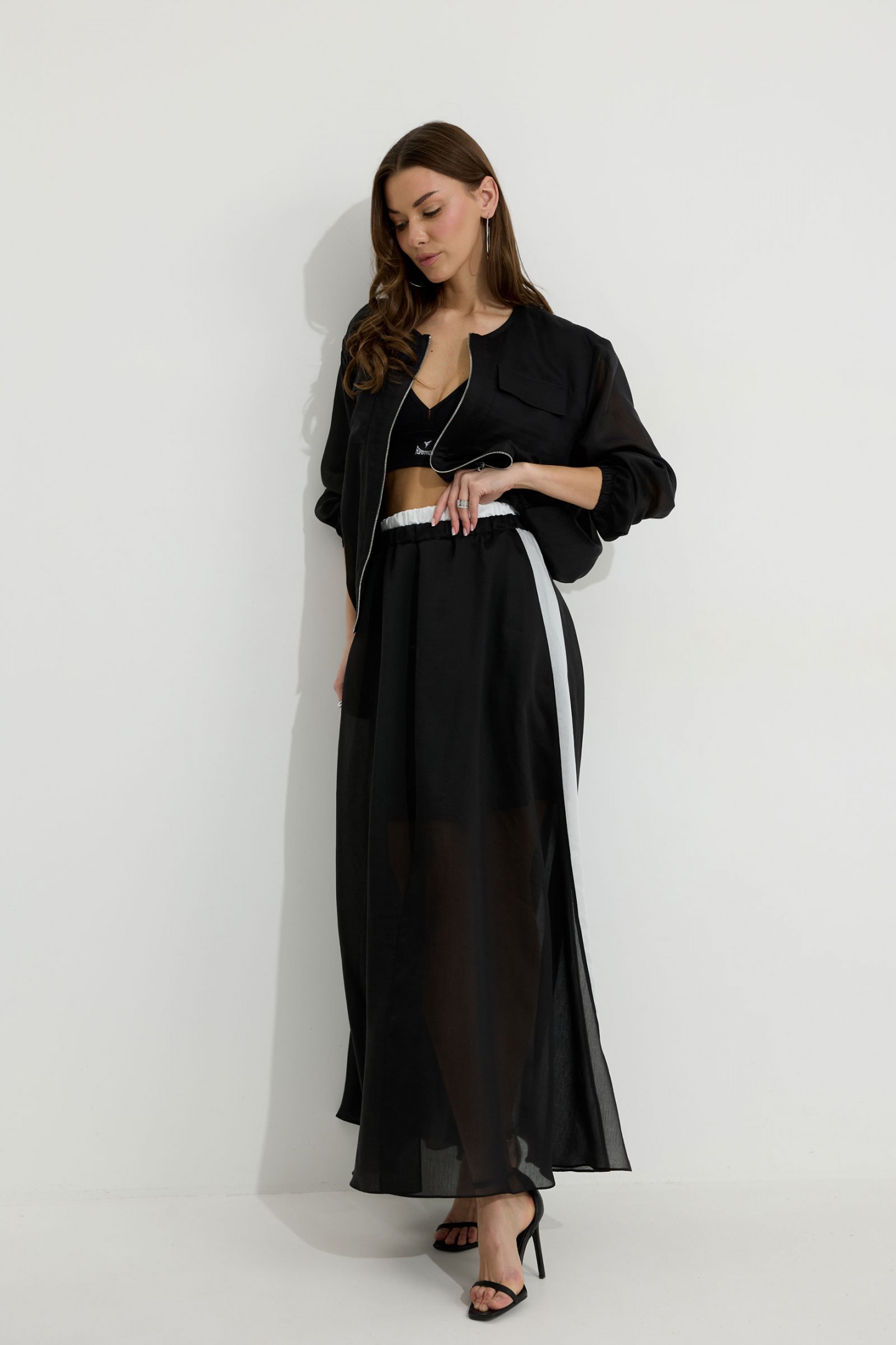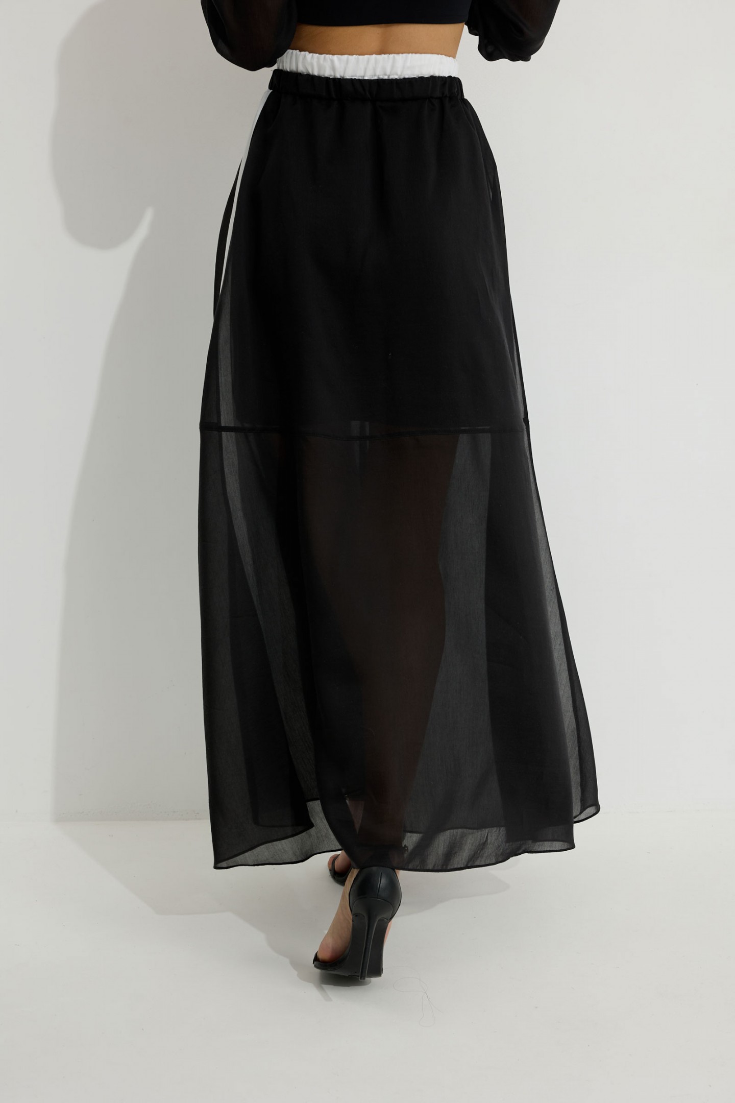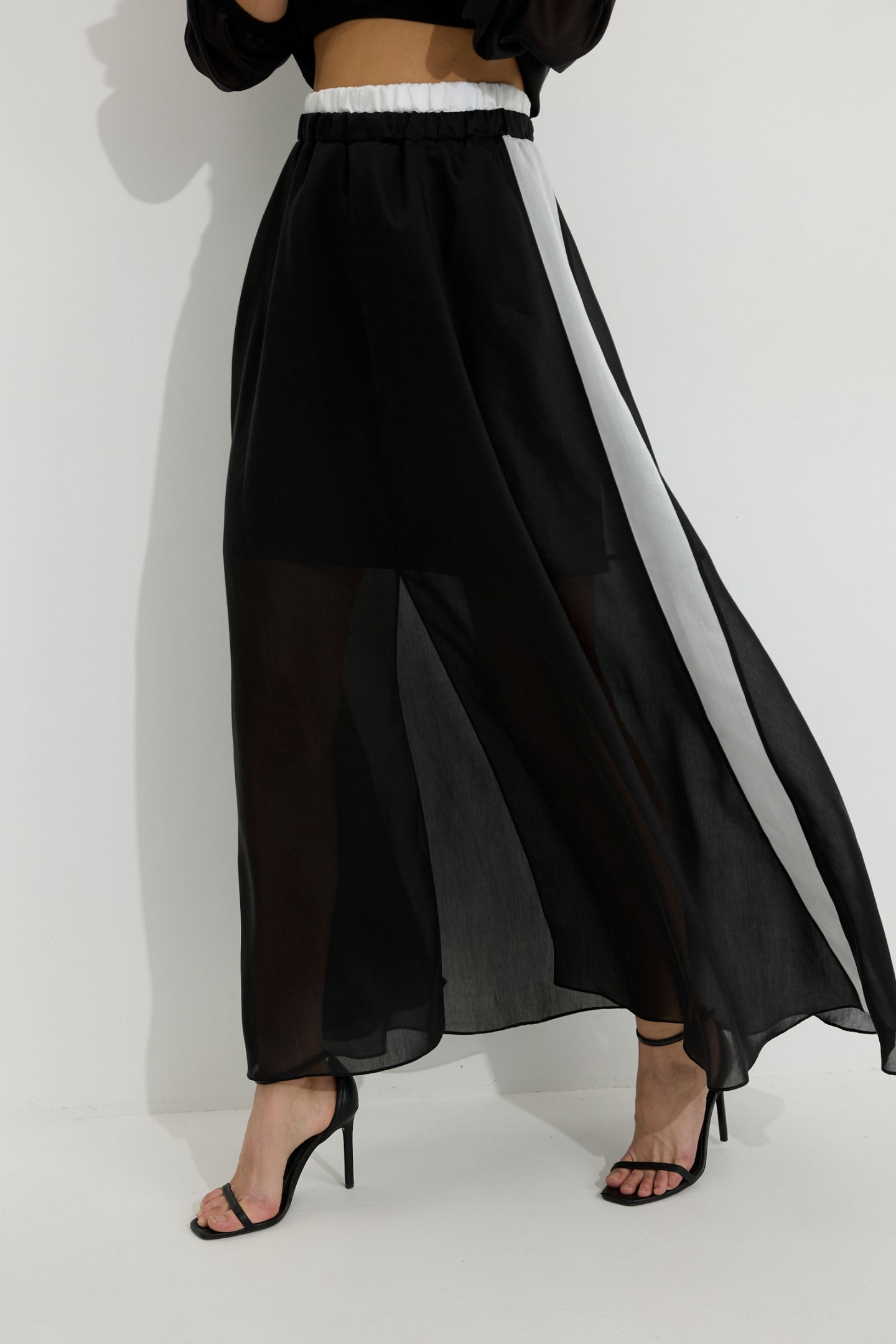| Описание | Юбка из вискозной полупрозрачной ткани. Расширенного А-образного силуэта, длина макси. В юбке двойной пояс на резинке. Верхний пояс контрастного цвета. Спереди разрез. Заднее полотнище юбки с подрезом немного выше линии колена; нижняя часть с дополнительным расширением. По боковым швам лампасы контрастного цвета. Юбка на подкладке. |