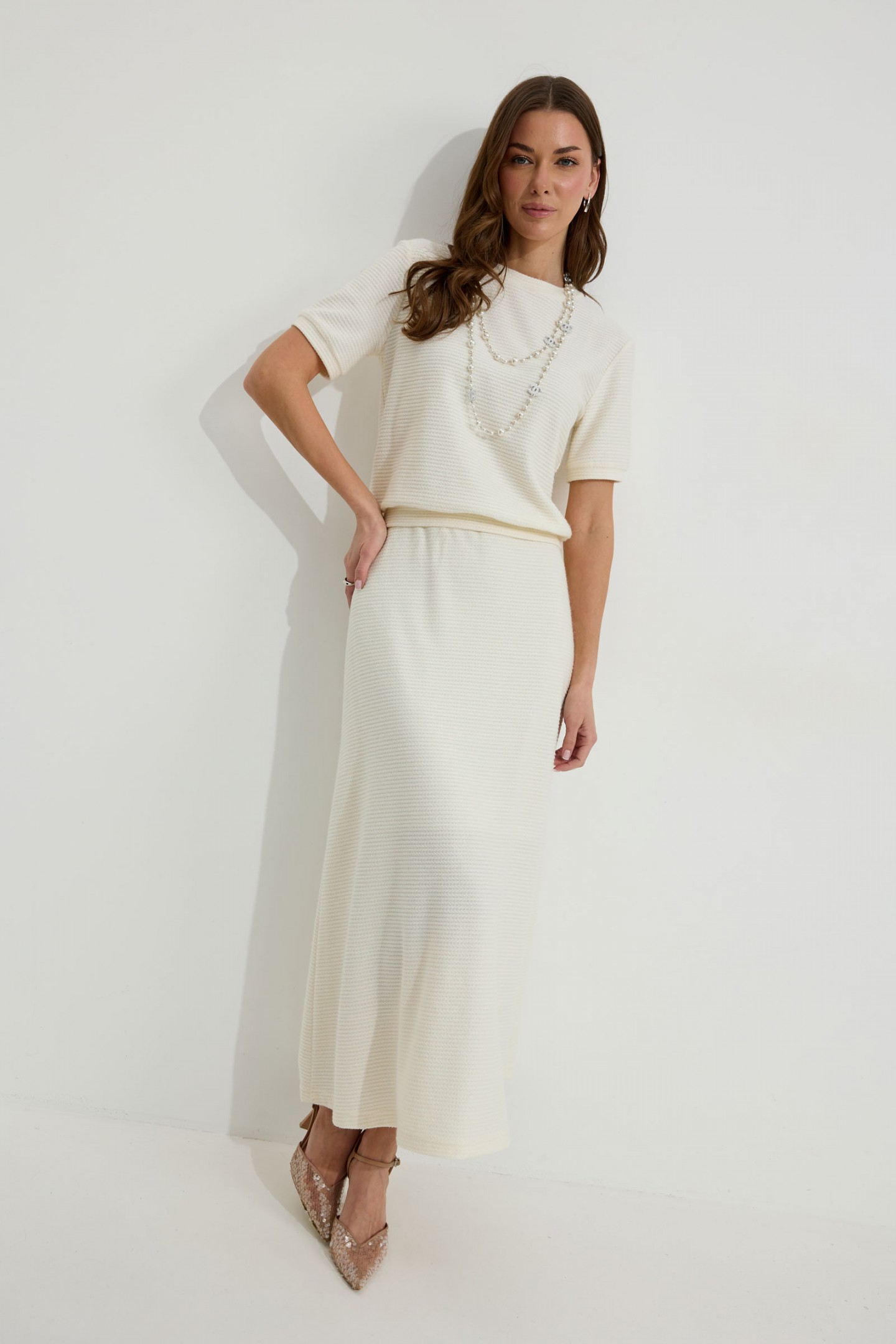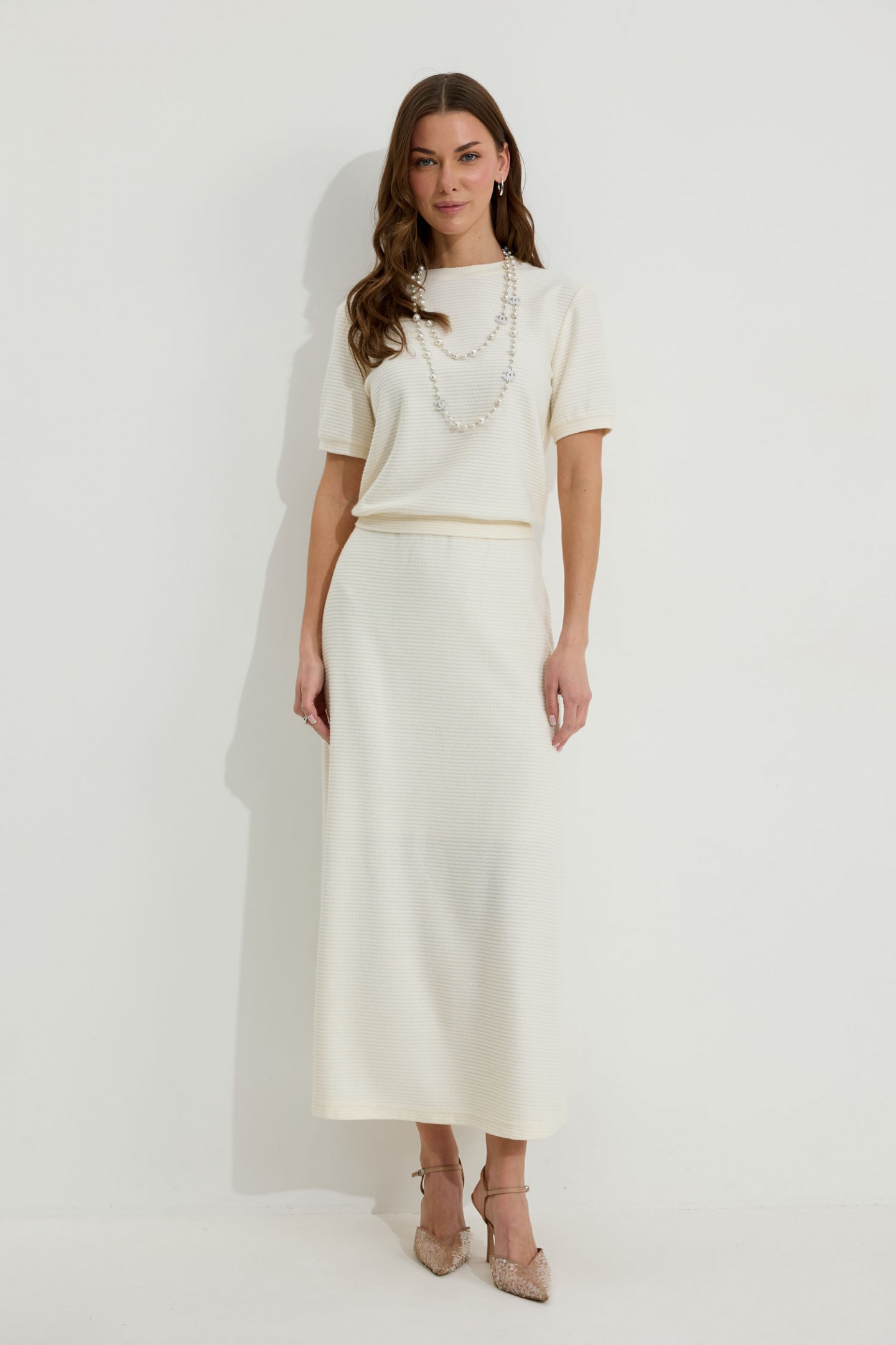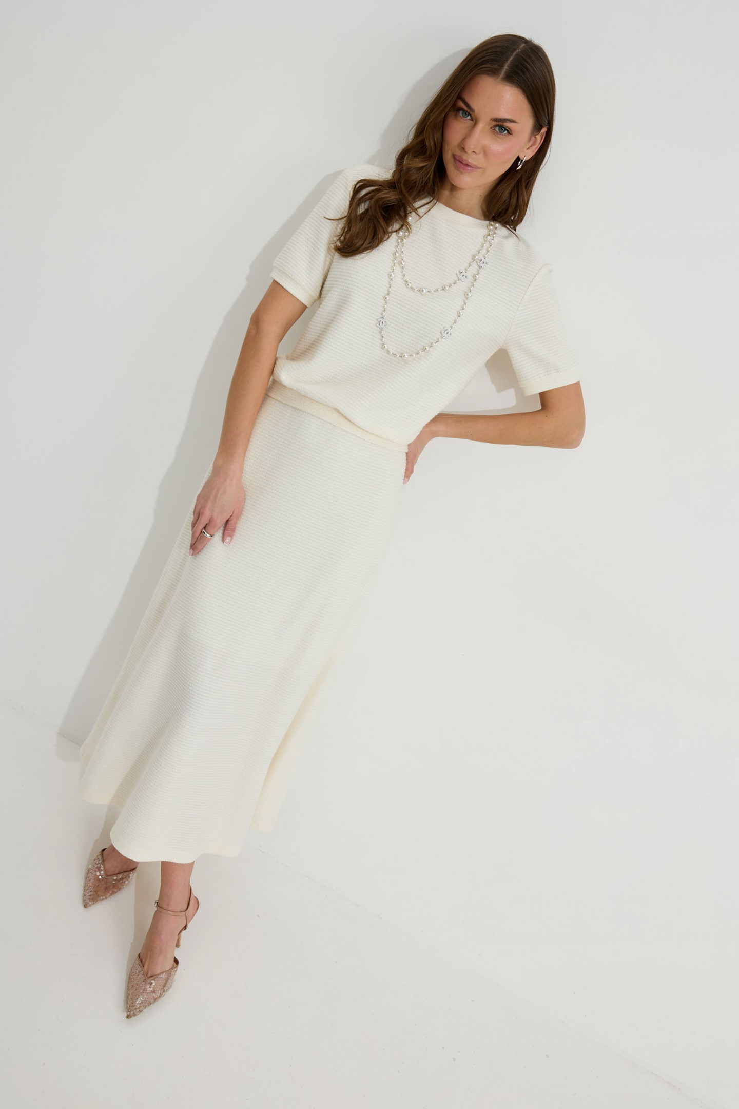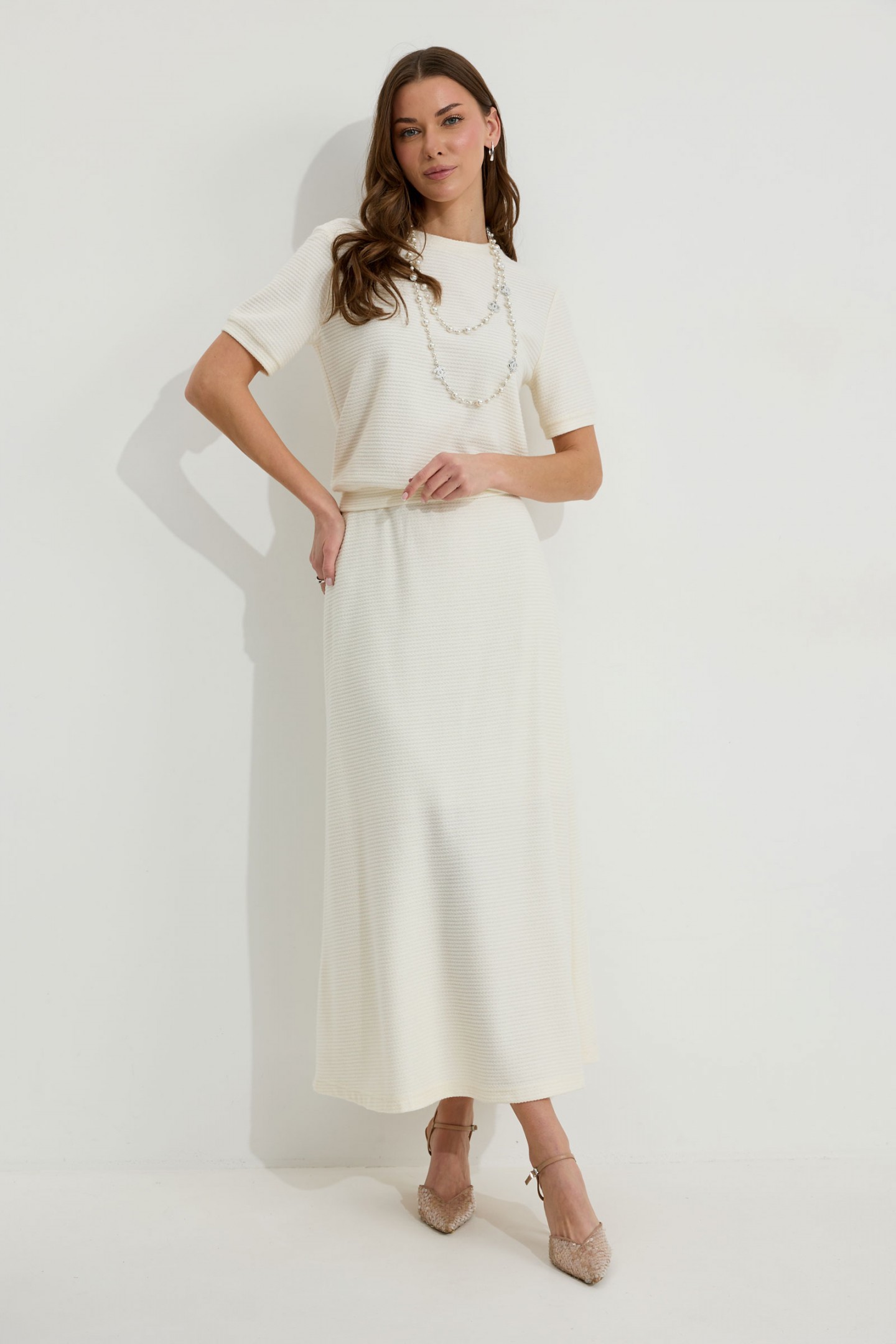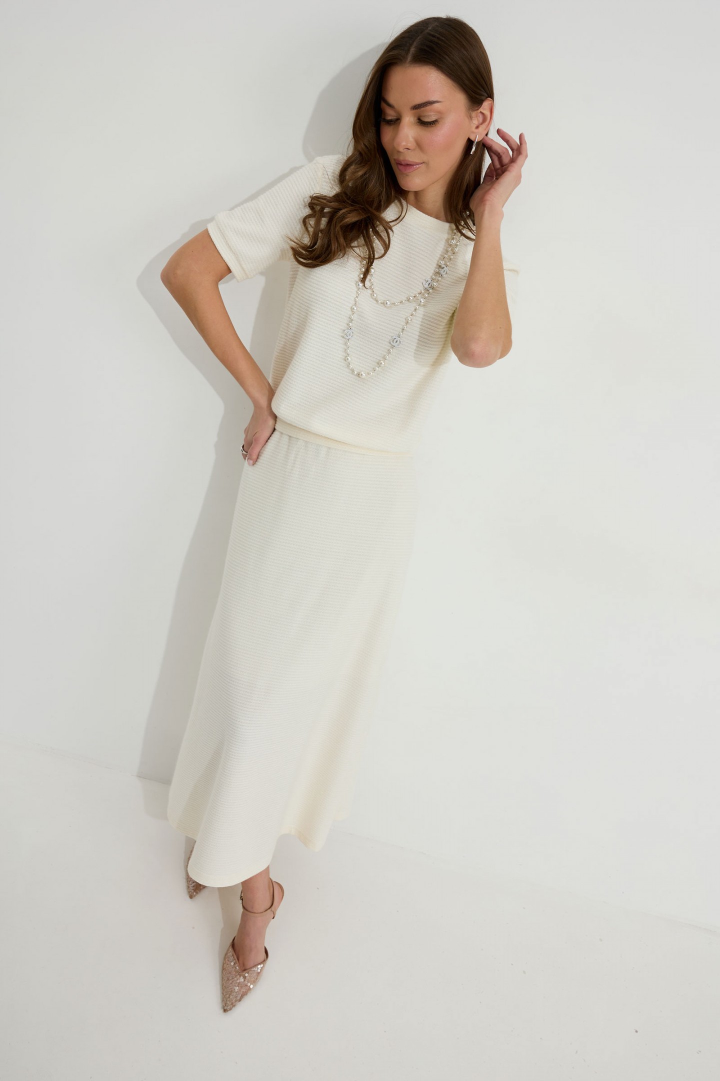 Описание Костюм состоящий из джемпера и юбки. Джемпер полуприлегающего силуэта из трикотажного полотна. Горловина округлая, рукав втачной, по низу манжета. По низу джемпера притачной пояс. Юбка А-силуэта расширенная книзу из трикотажного полотна. По верху юбки притачной пояс с эластичной тесьмой (резинкой).