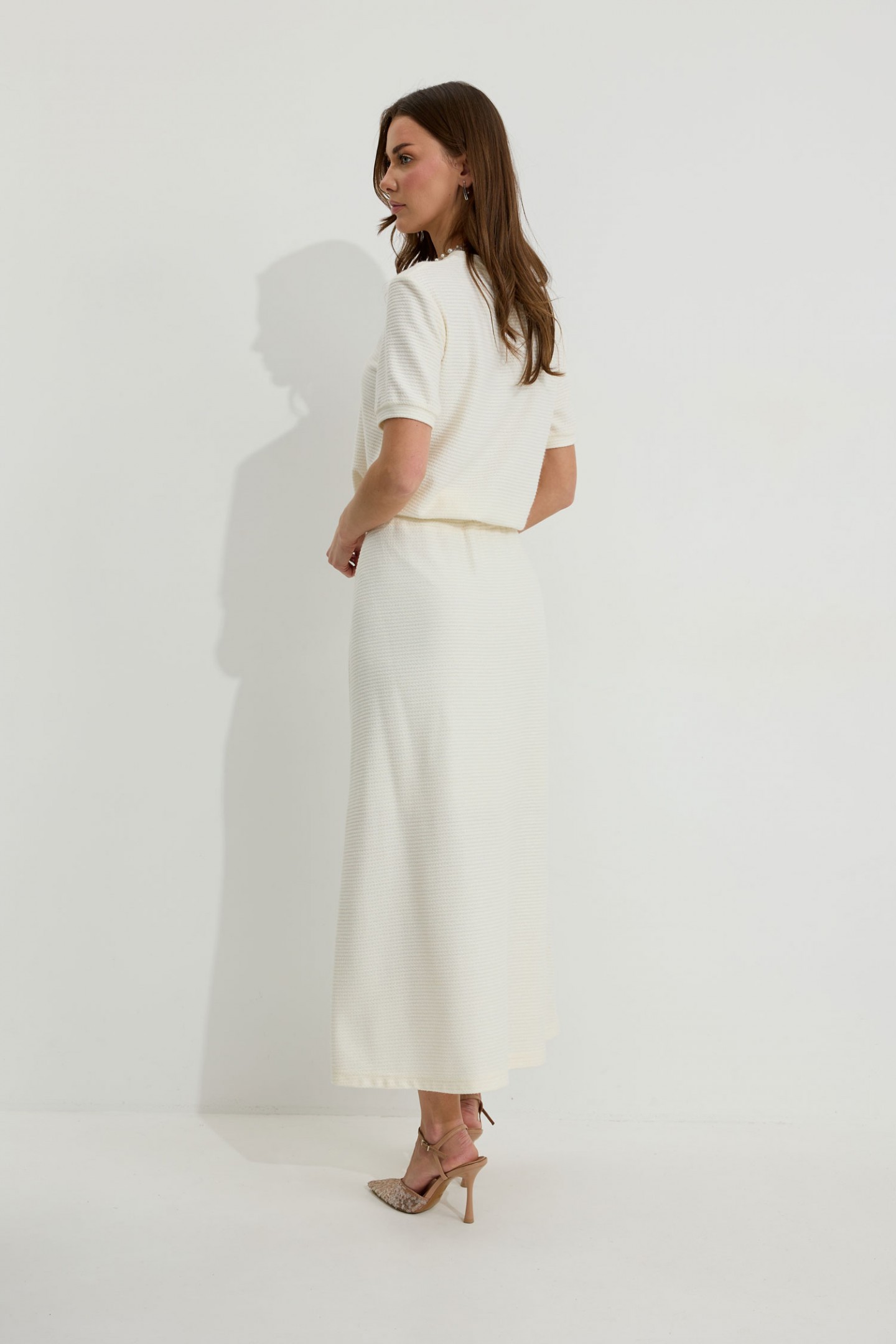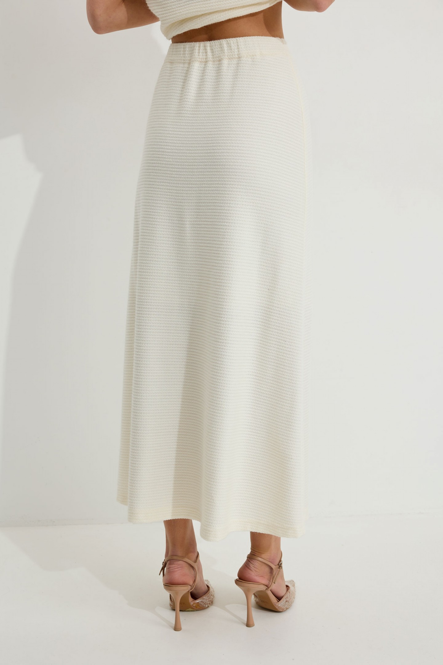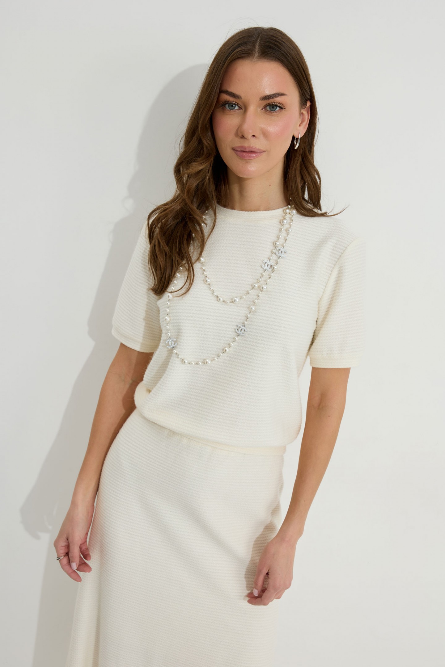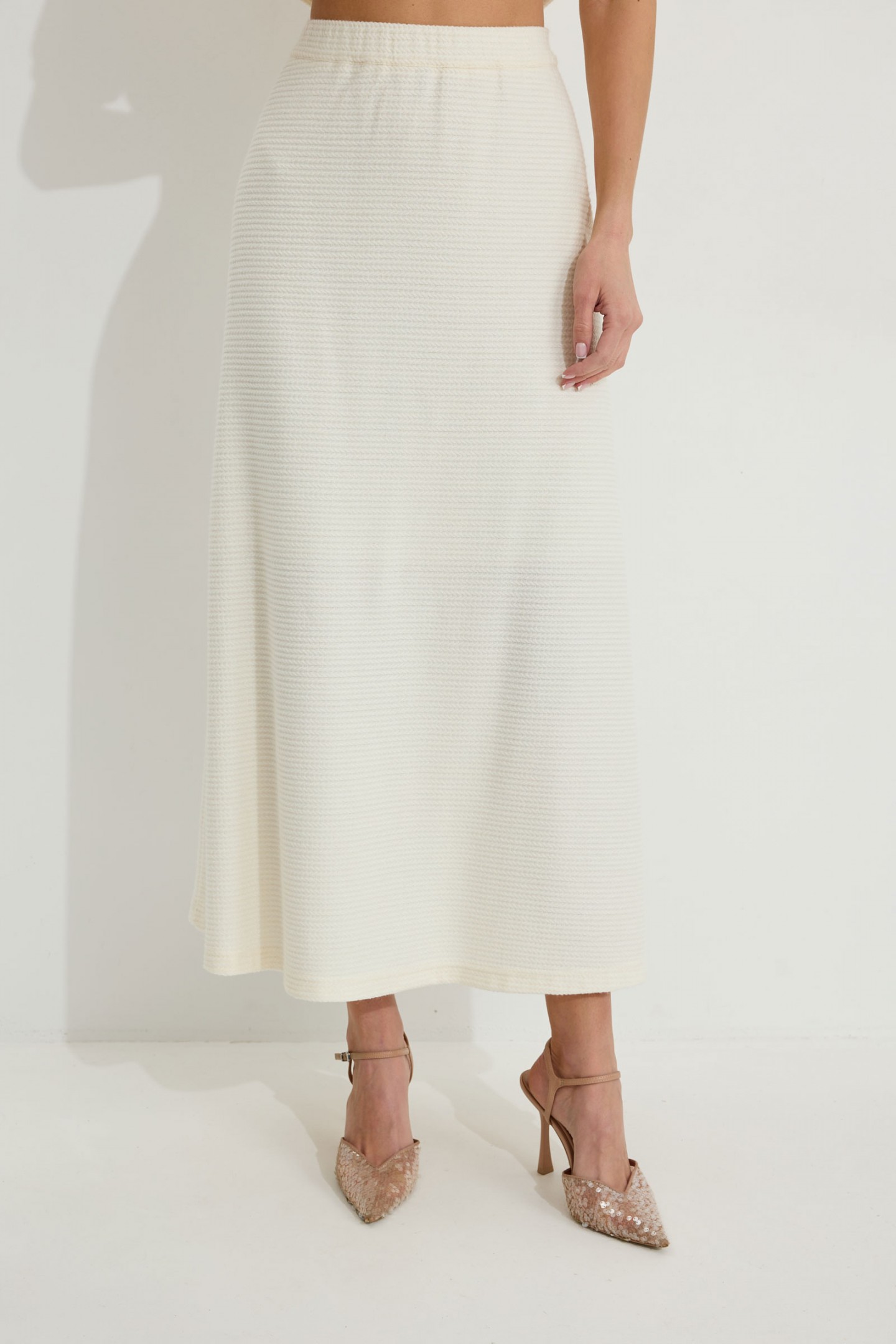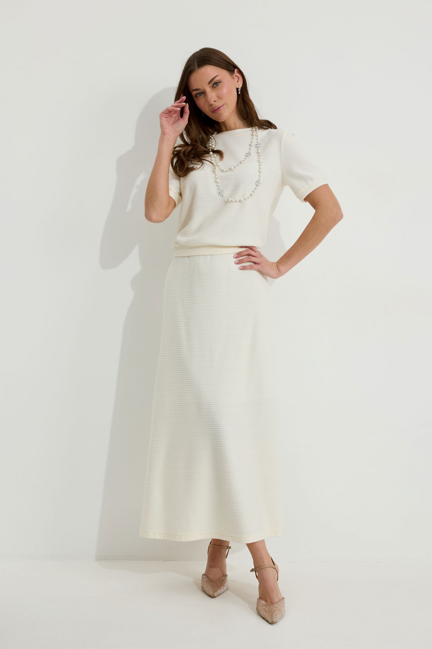 Описание Костюм состоящий из джемпера и юбки. Джемпер полуприлегающего силуэта из трикотажного полотна. Горловина округлая, рукав втачной, по низу манжета. По низу джемпера притачной пояс. Юбка А-силуэта расширенная книзу из трикотажного полотна. По верху юбки притачной пояс с эластичной тесьмой (резинкой).