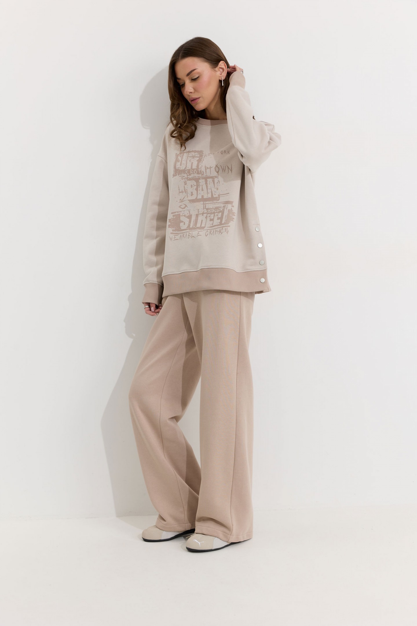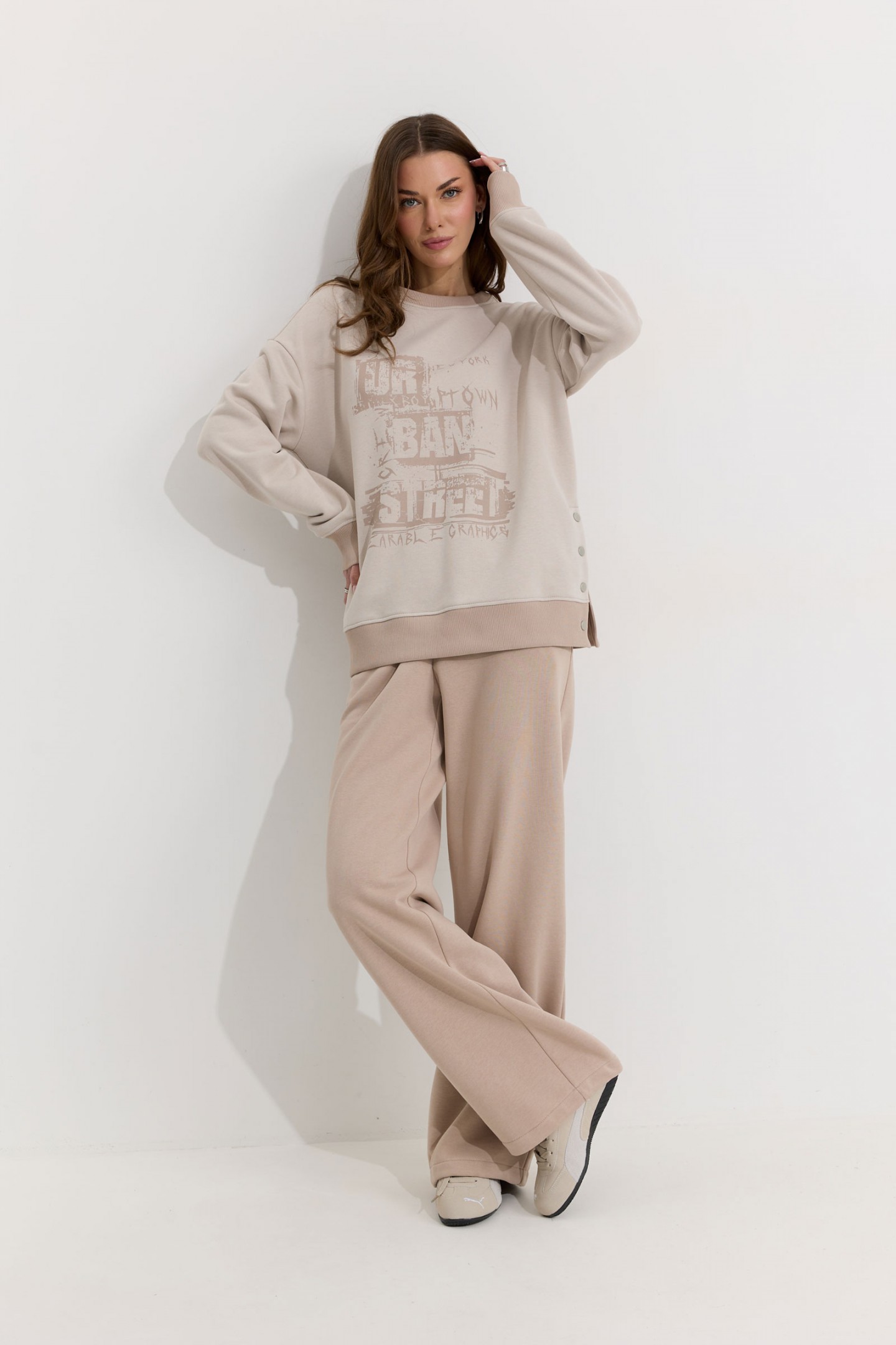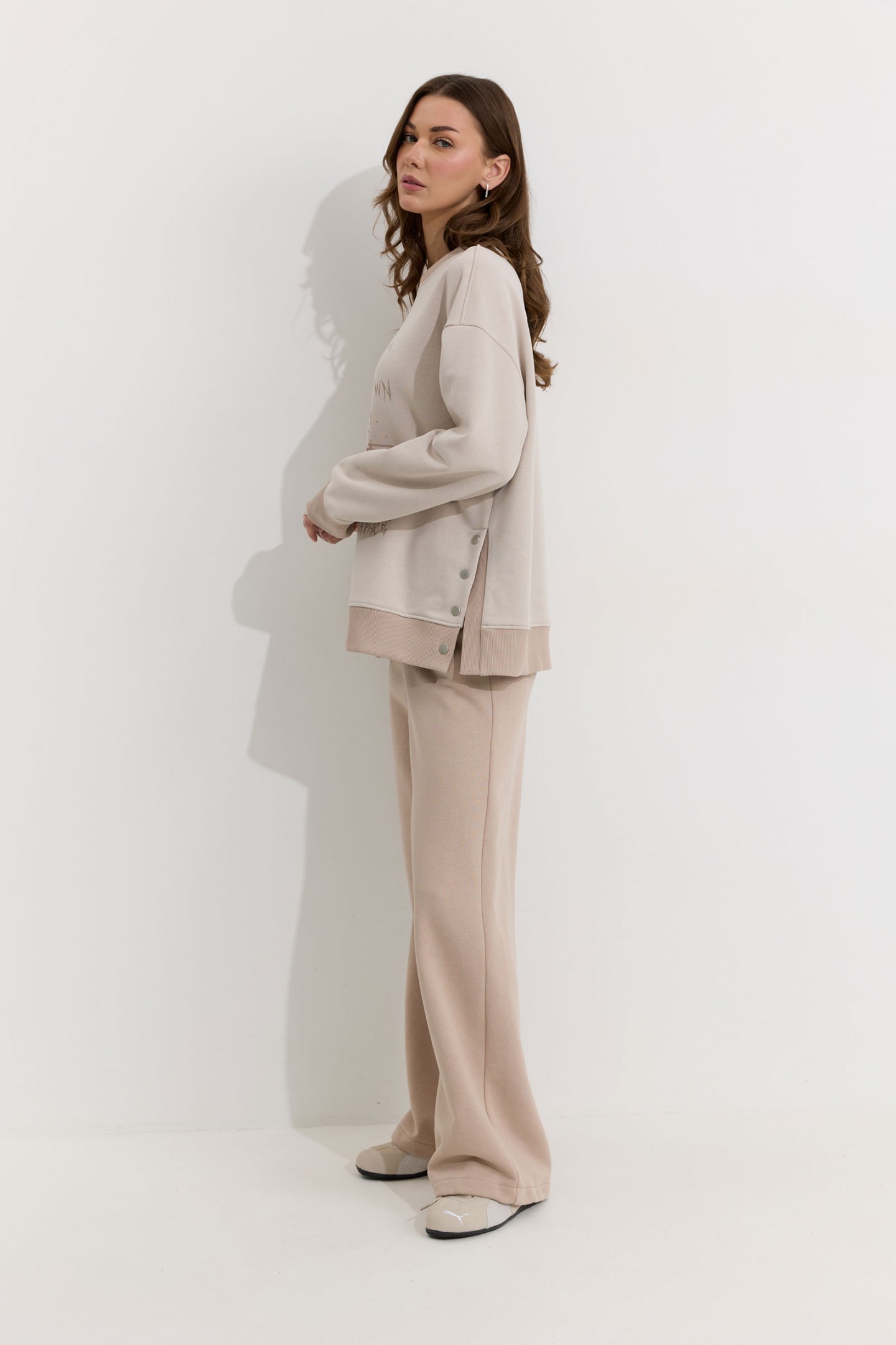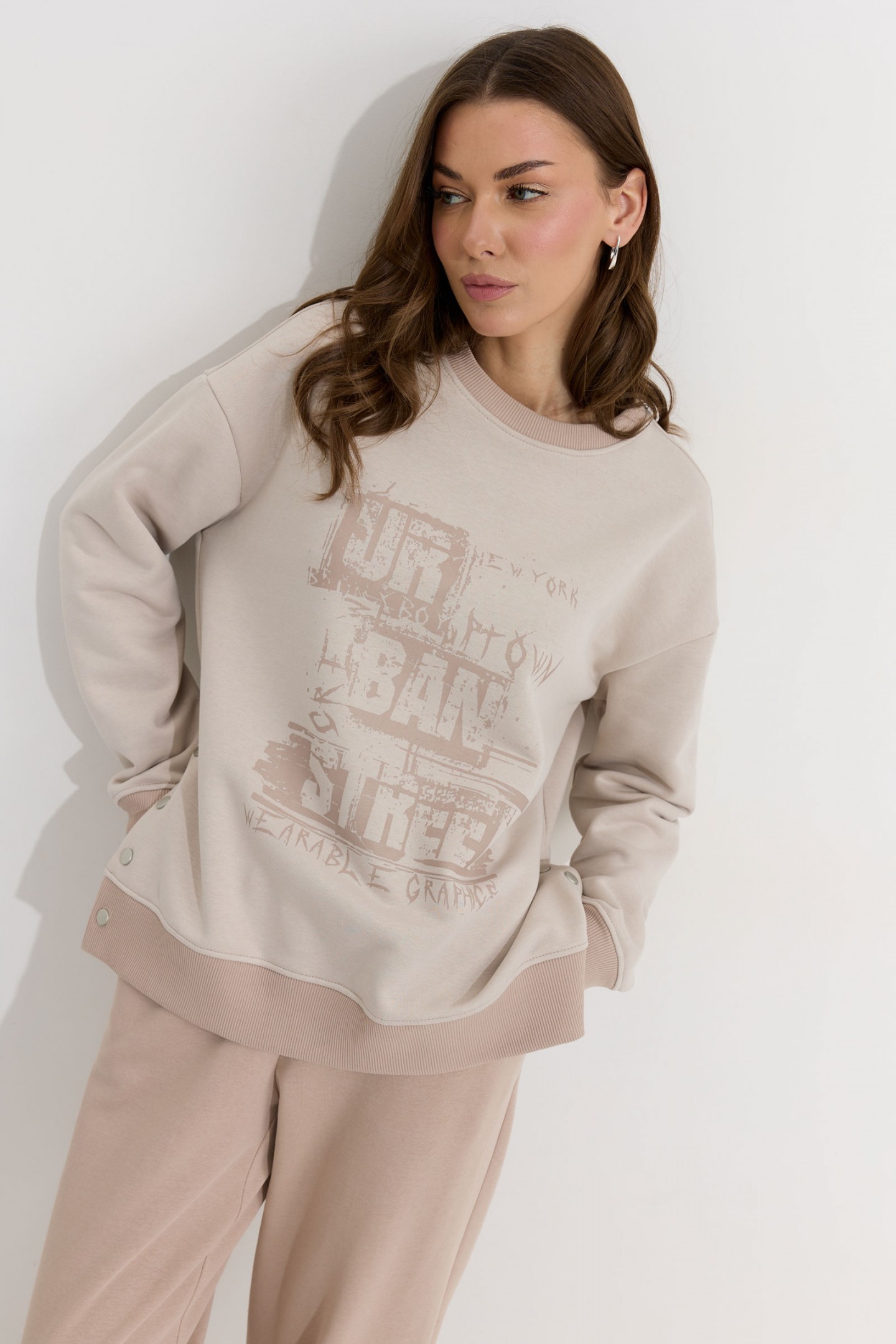 Описание Джемпер прямого силуэта из трикотажного полотна. Горловина округлая. Рукав со спущенной линией плеча, по низу манжета из отделочной ткани. По низу джемпера в боковых швах декоративная шлица с кнопками. По низу джемпера притачной пояс из отделочной ткани. По переду дизайнерская печать. Обращаем ваше внимание, что фурнитура может отличаться от фото.
