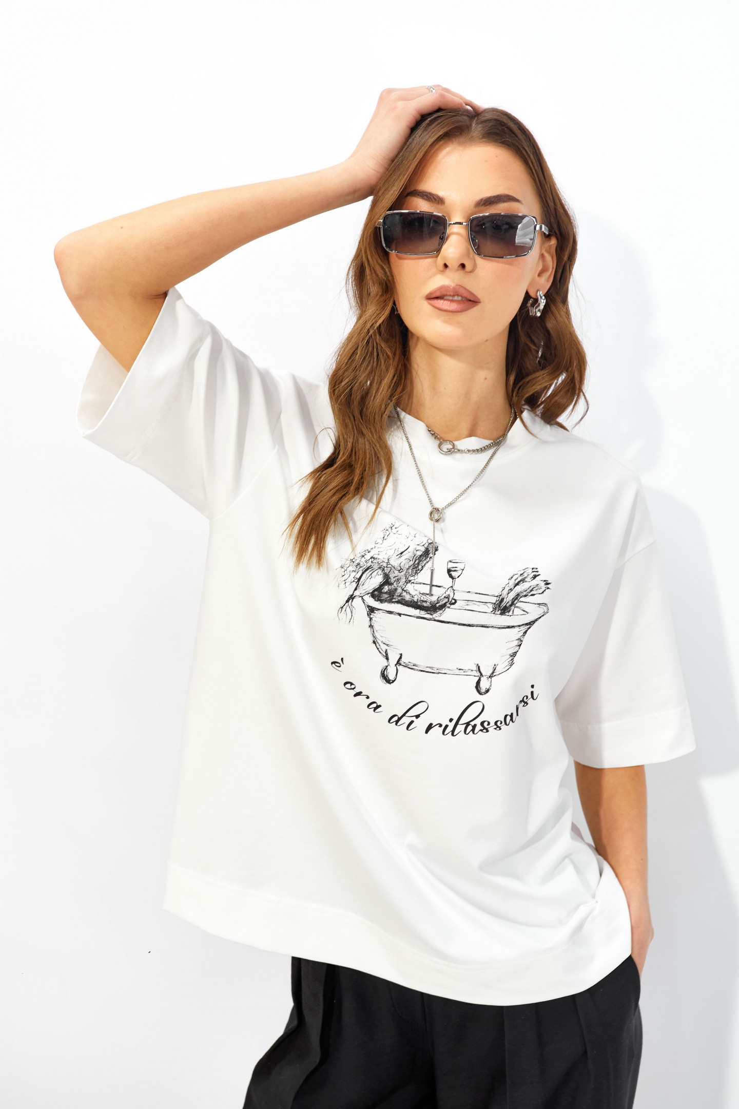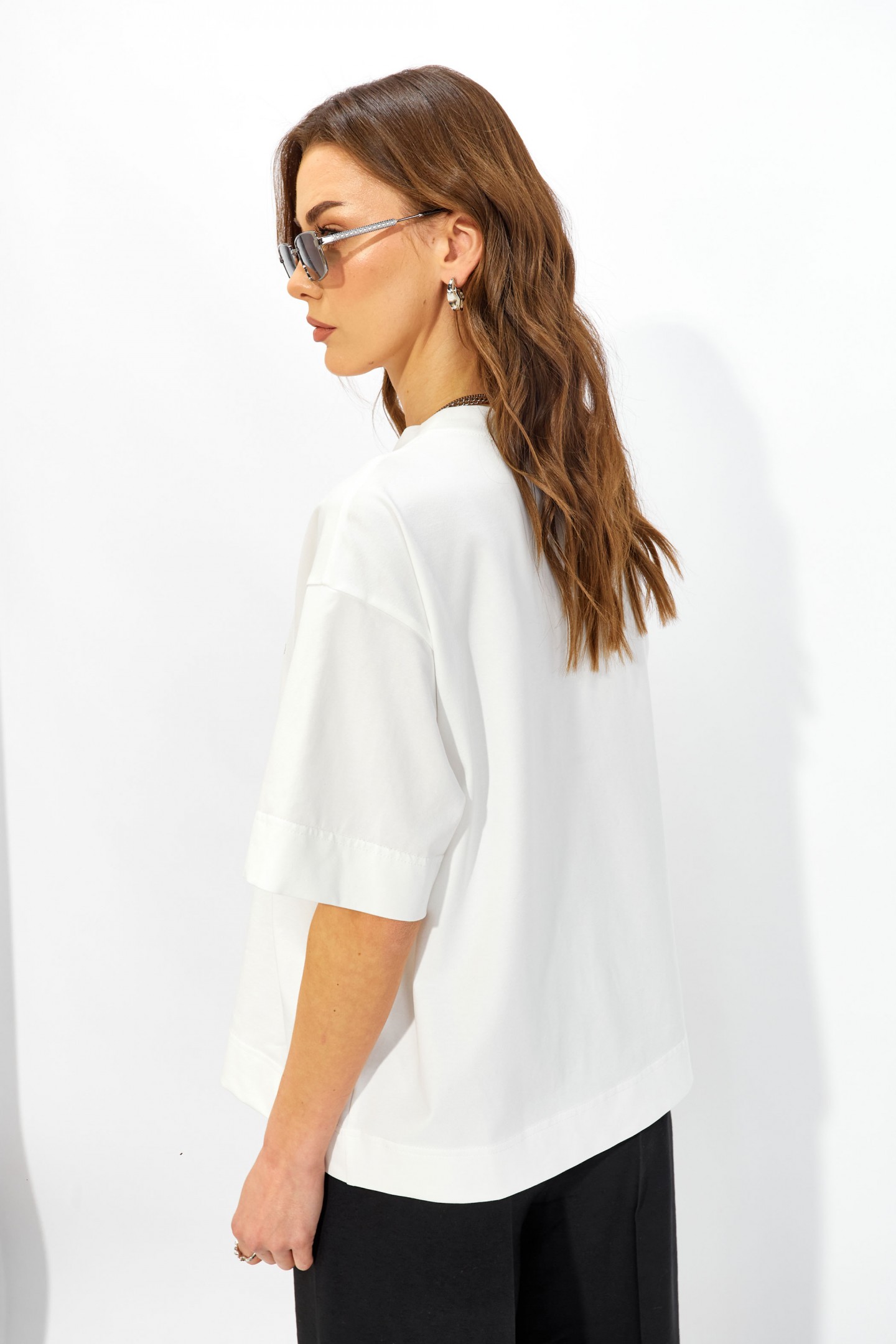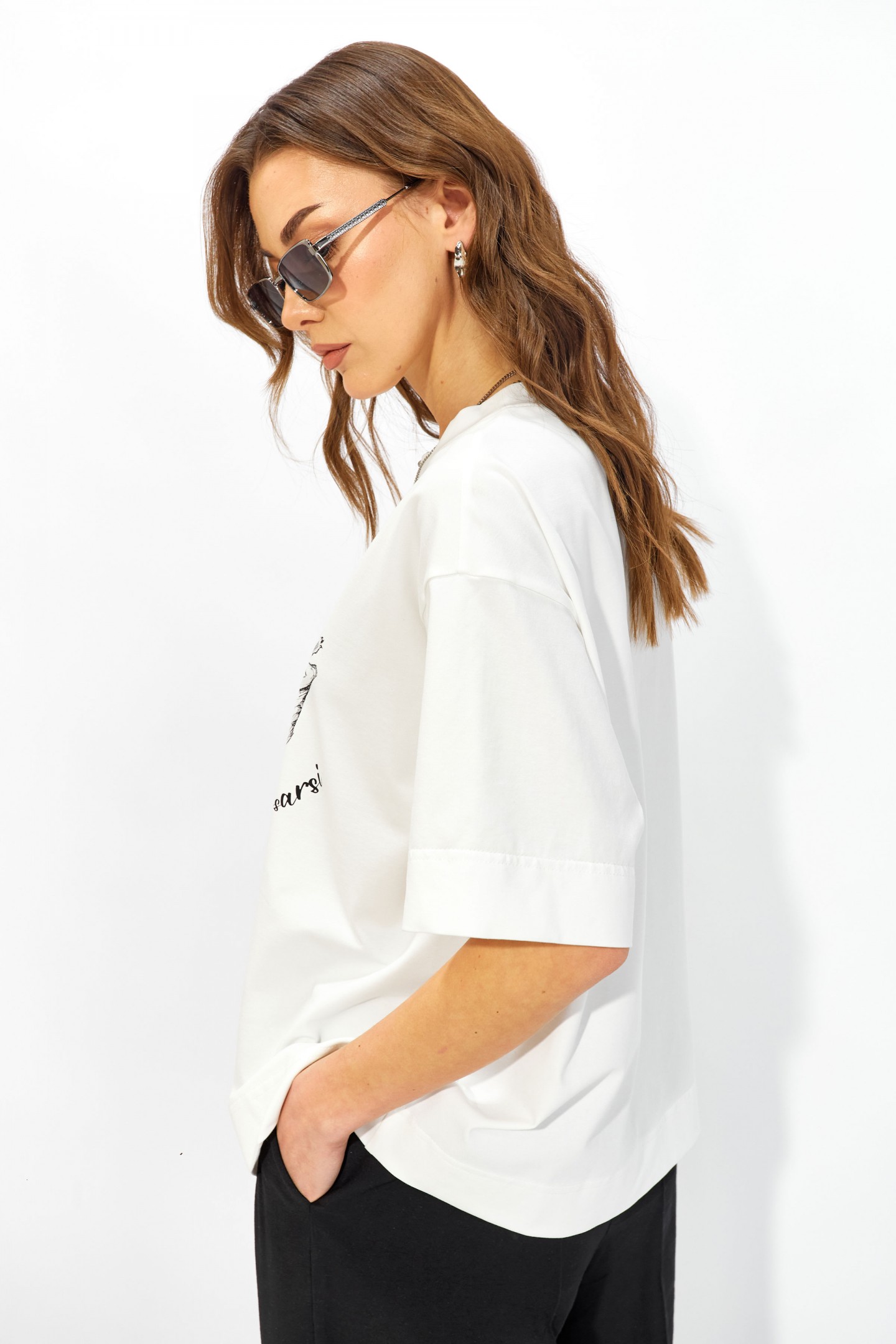 | Описание | Джемпер прямого свободного силуэта из хлопкового трикотажного полотна. Вырез горловины округлый с притачной бейкой. Рукава втачные короткие. По переду дизайнерская печать. |