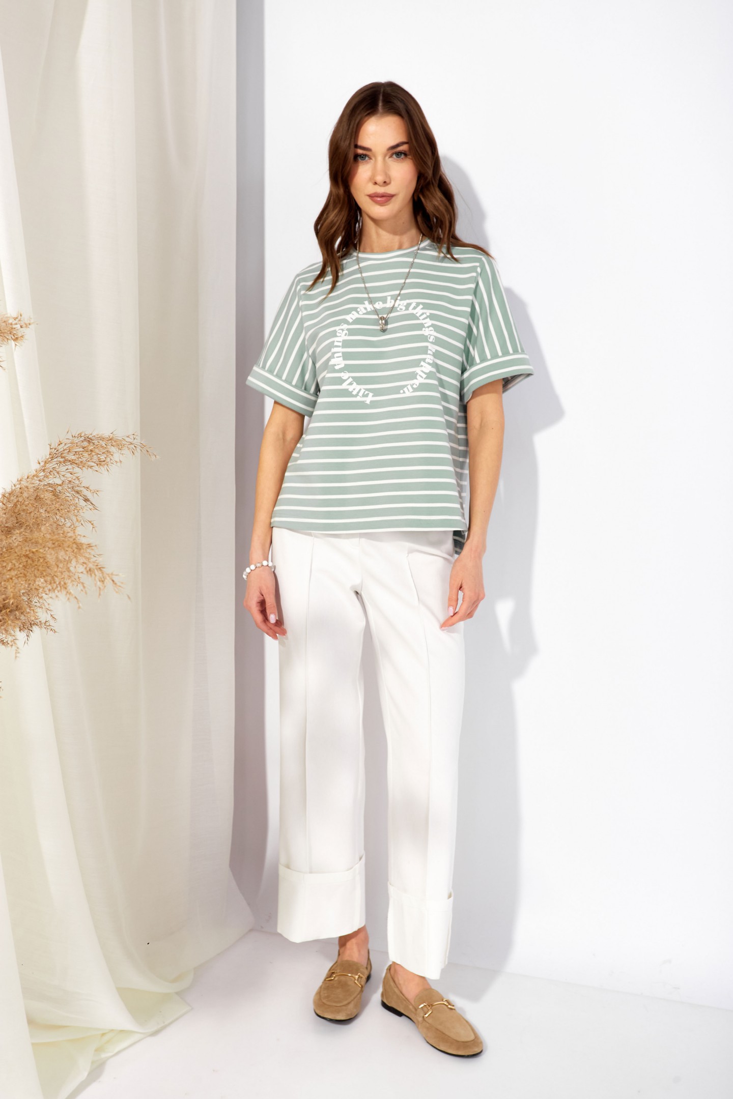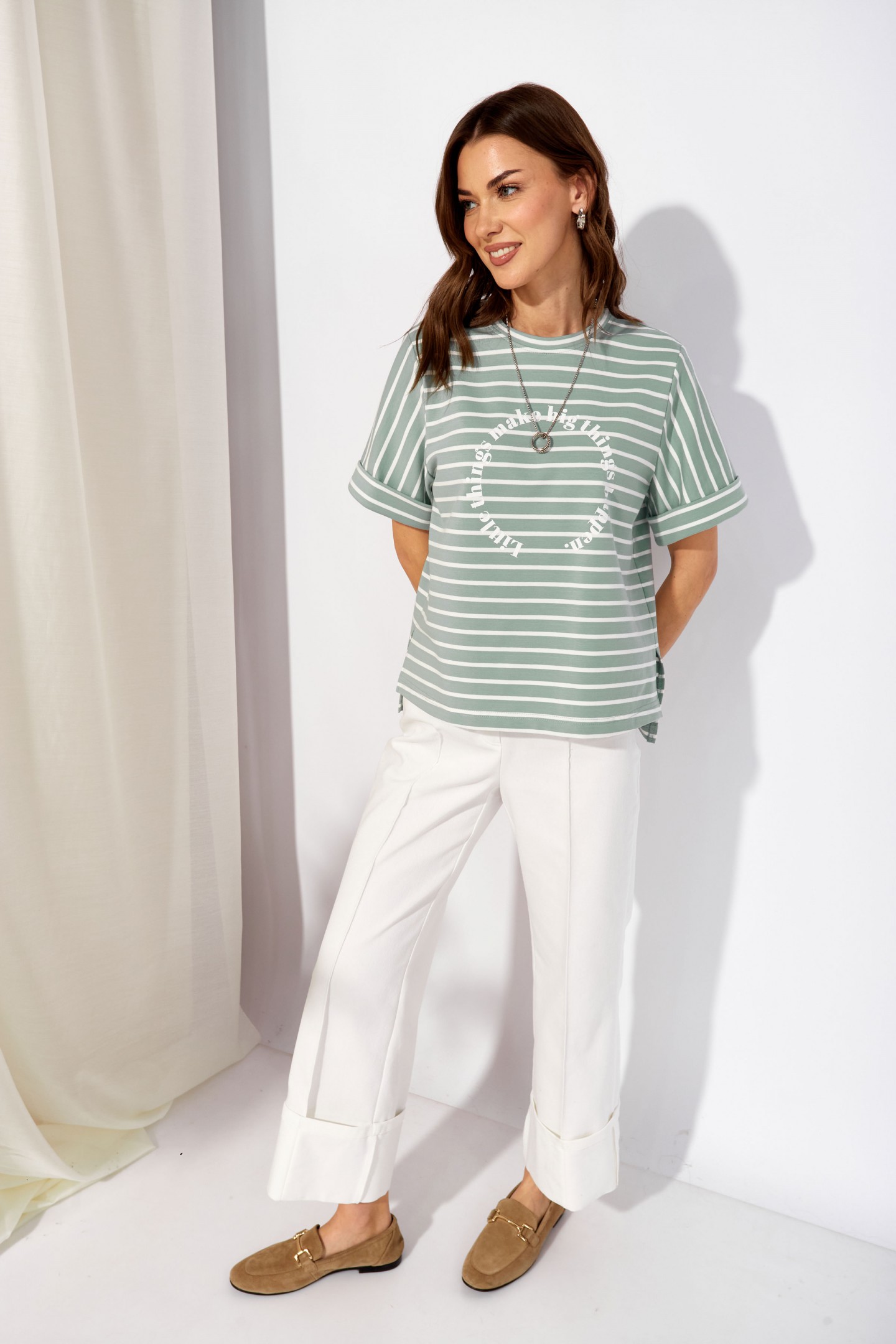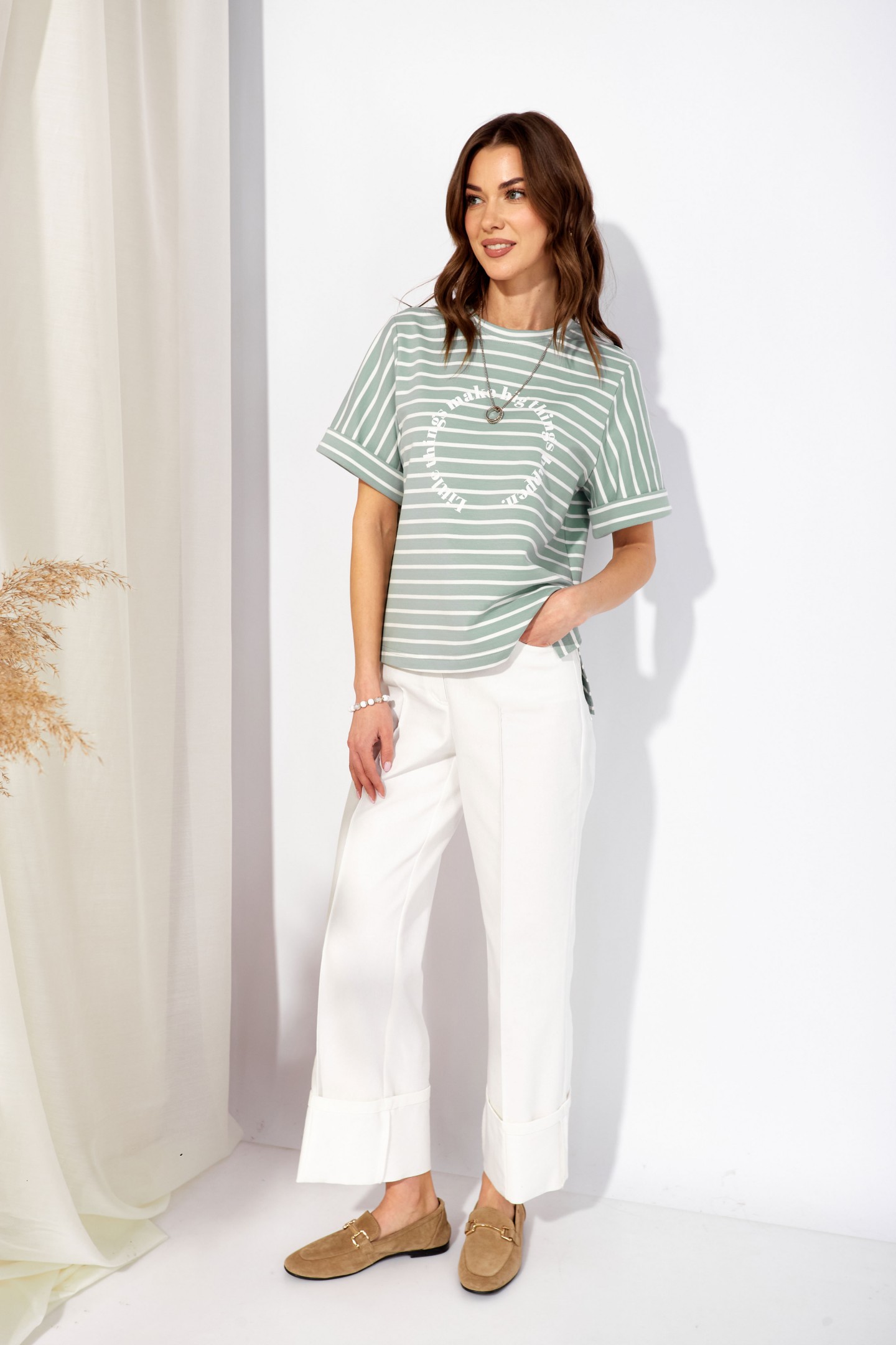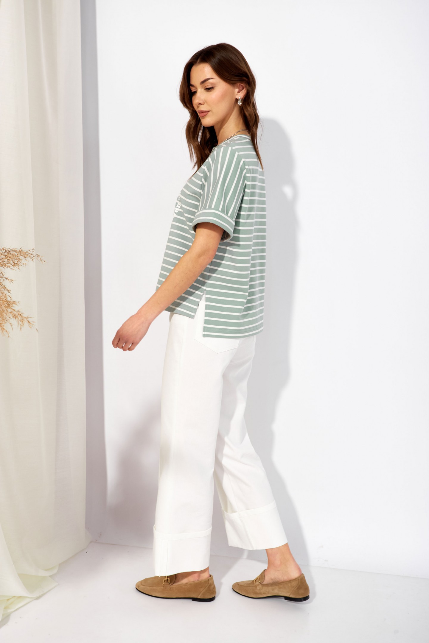 | Описание | Джемпер прямого силуэта из трикотажного полотна. Горловина округлая. Рукав втачной, по низу манжета. По бокам разрезы, спинка длиннее переда. По центру дизайнерская печать. |
