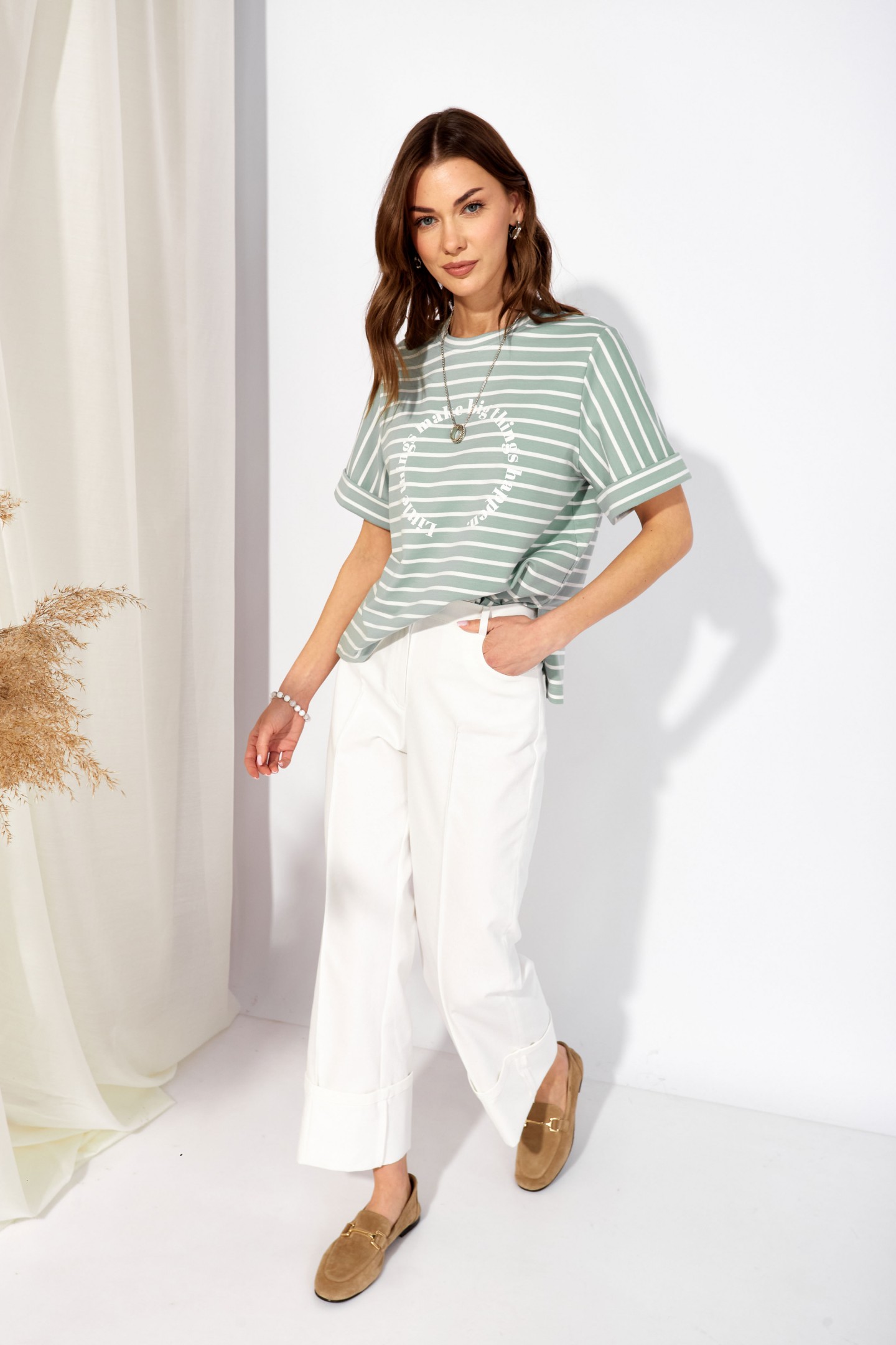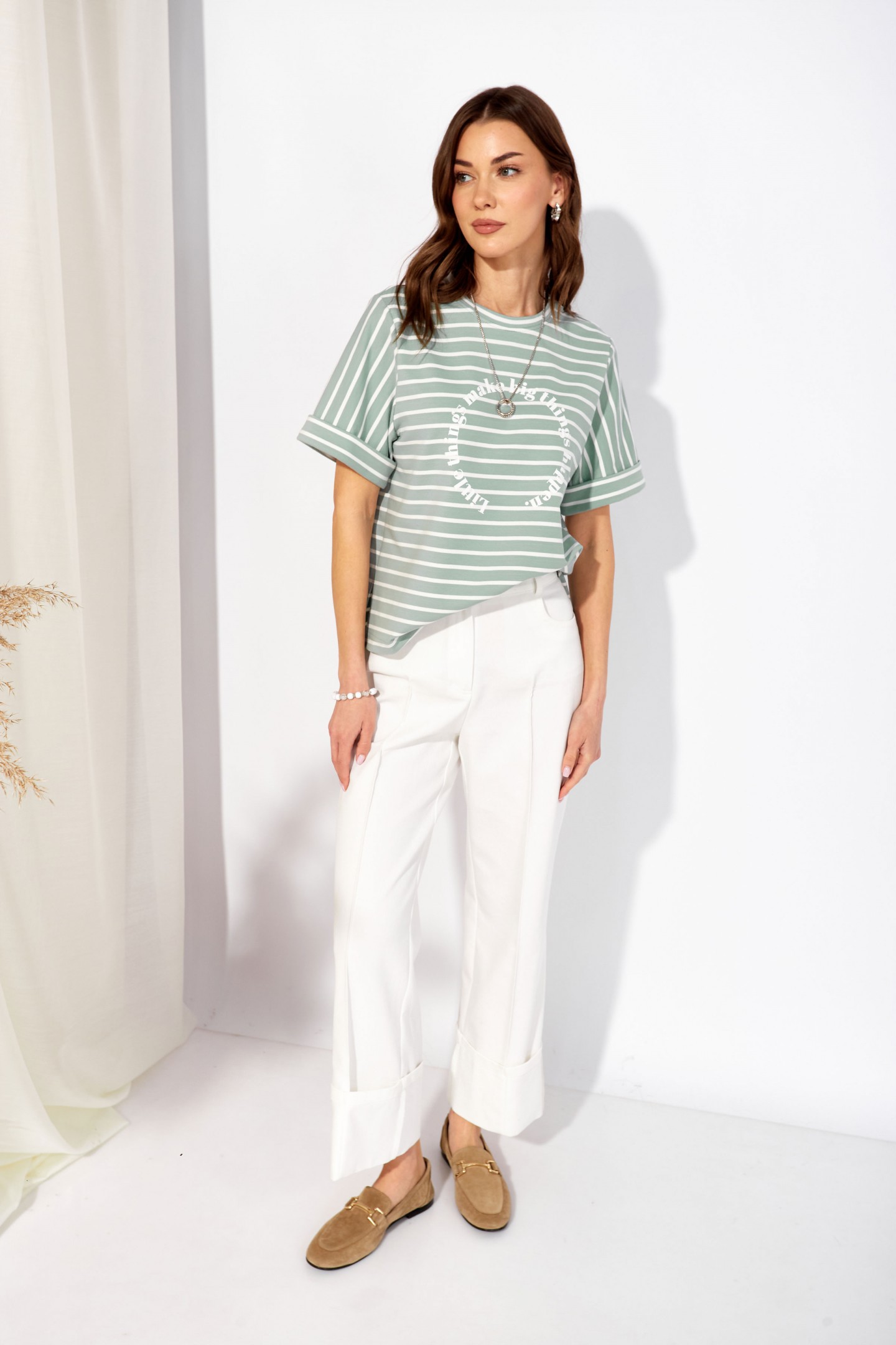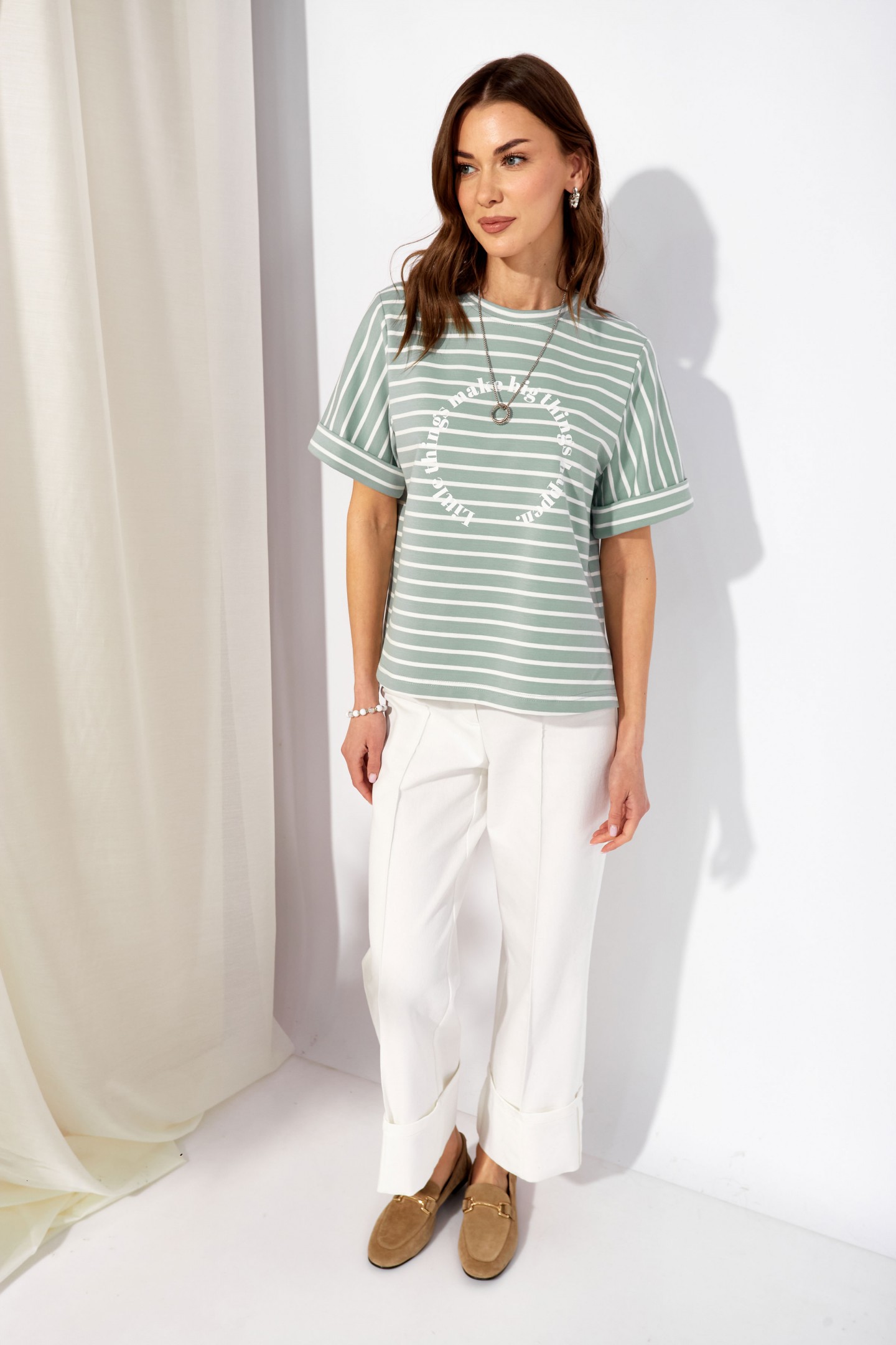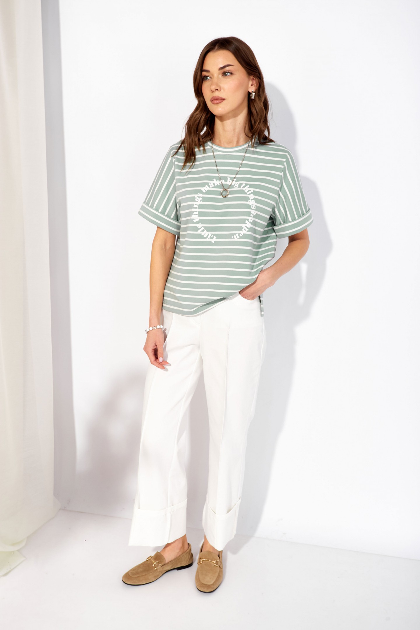 | Описание | Джемпер прямого силуэта из трикотажного полотна. Горловина округлая. Рукав втачной, по низу манжета. По бокам разрезы, спинка длиннее переда. По центру дизайнерская печать. |