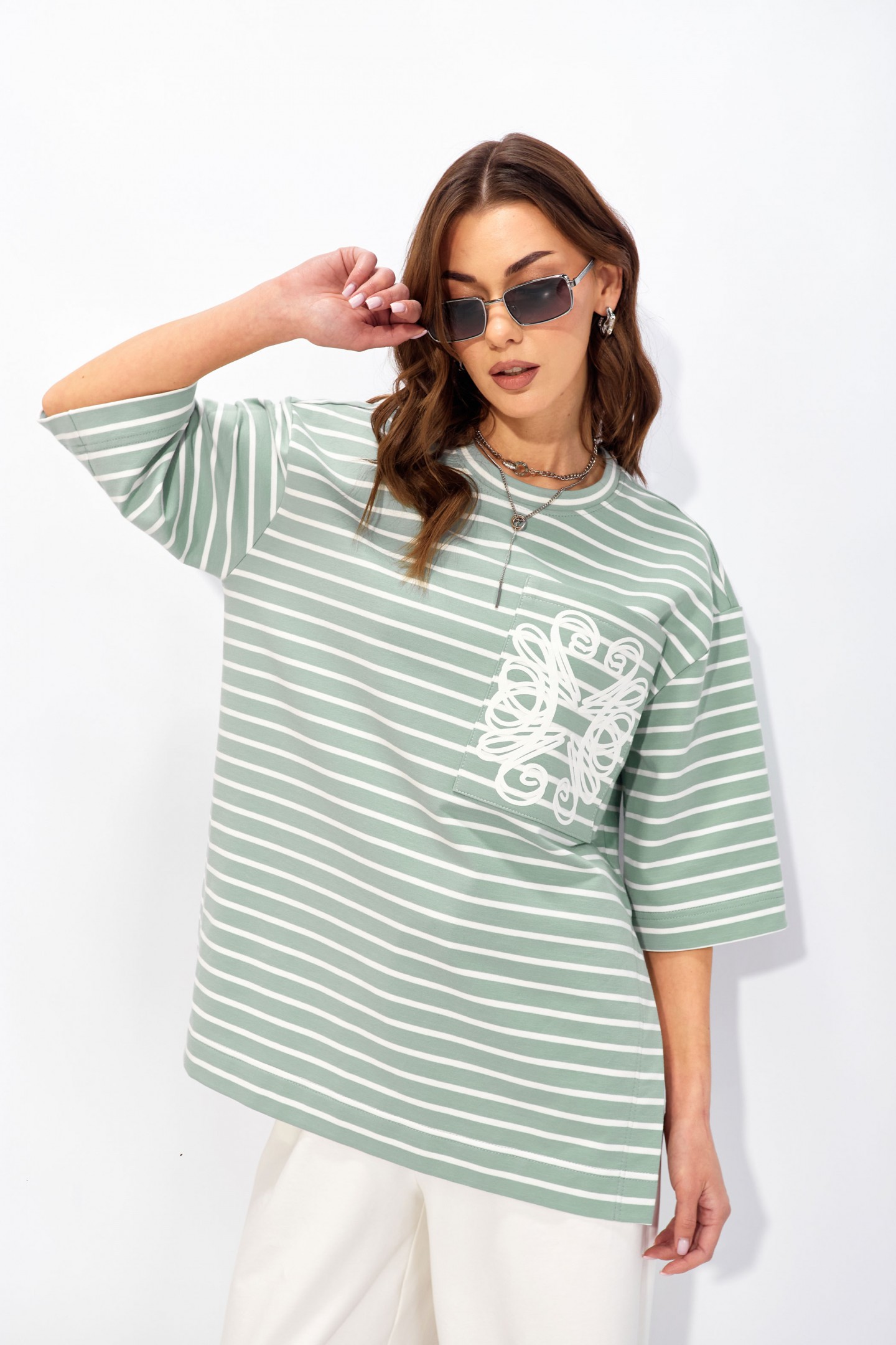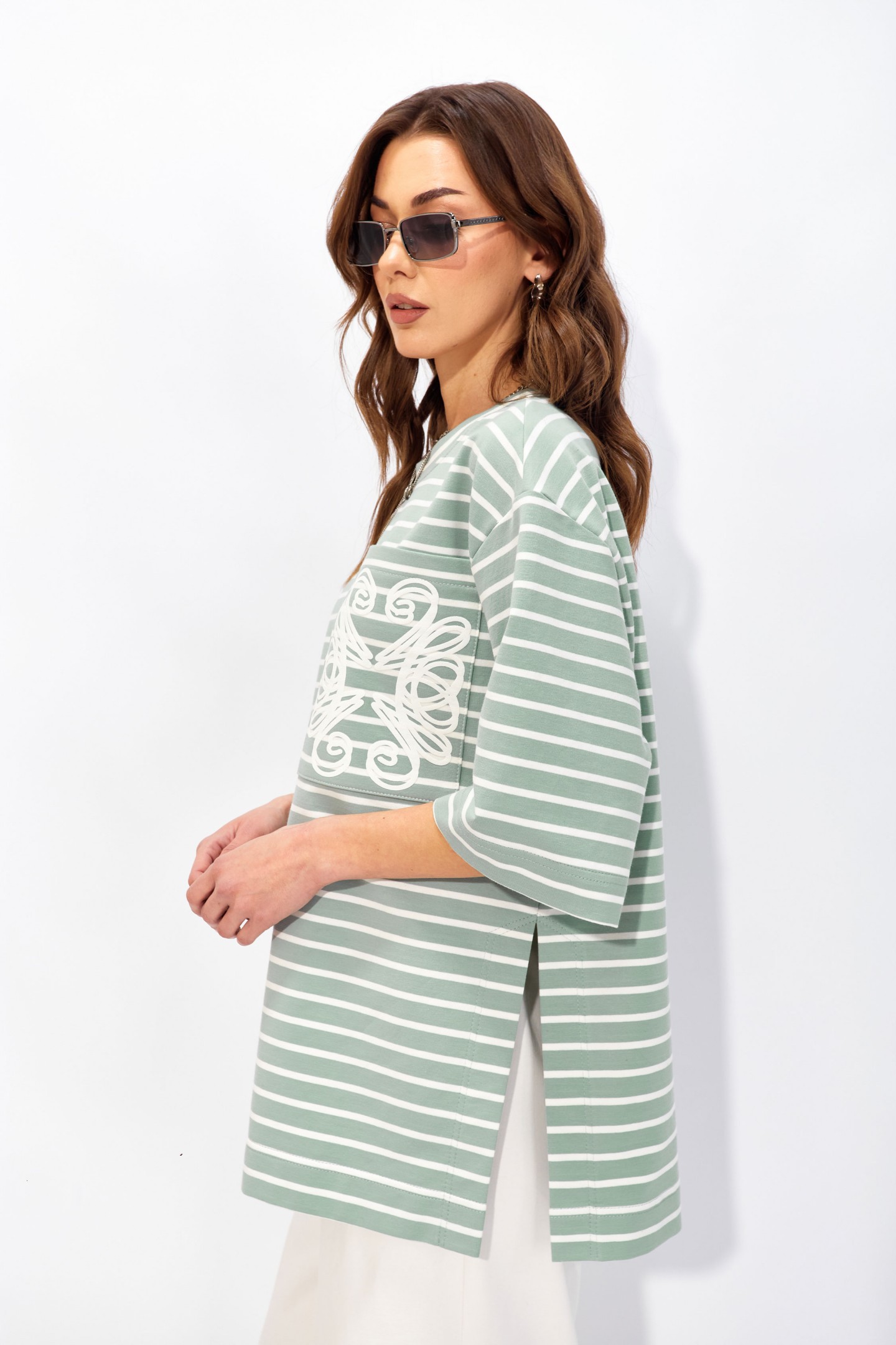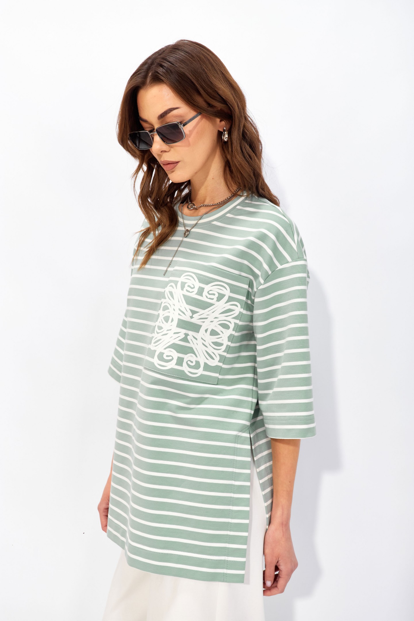 | Описание | Джемпер прямого свободного силуэта со спущенной линией плеч из хлопкового трикотажного полотна в полоску. Вырез горловины округлый с притачной бейкой. По бокам высокие разрезы до талии. На кармане фактурная дизайнерская печать. |