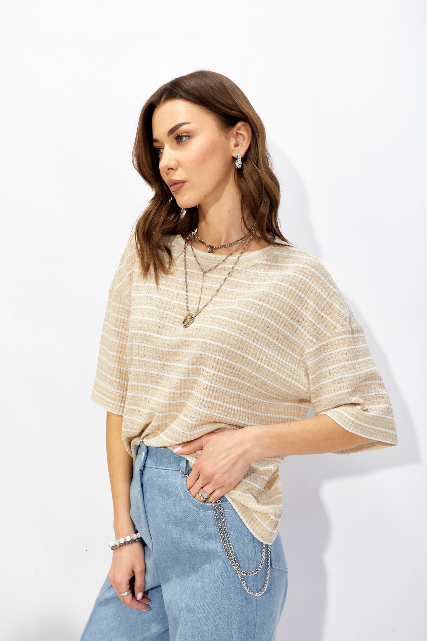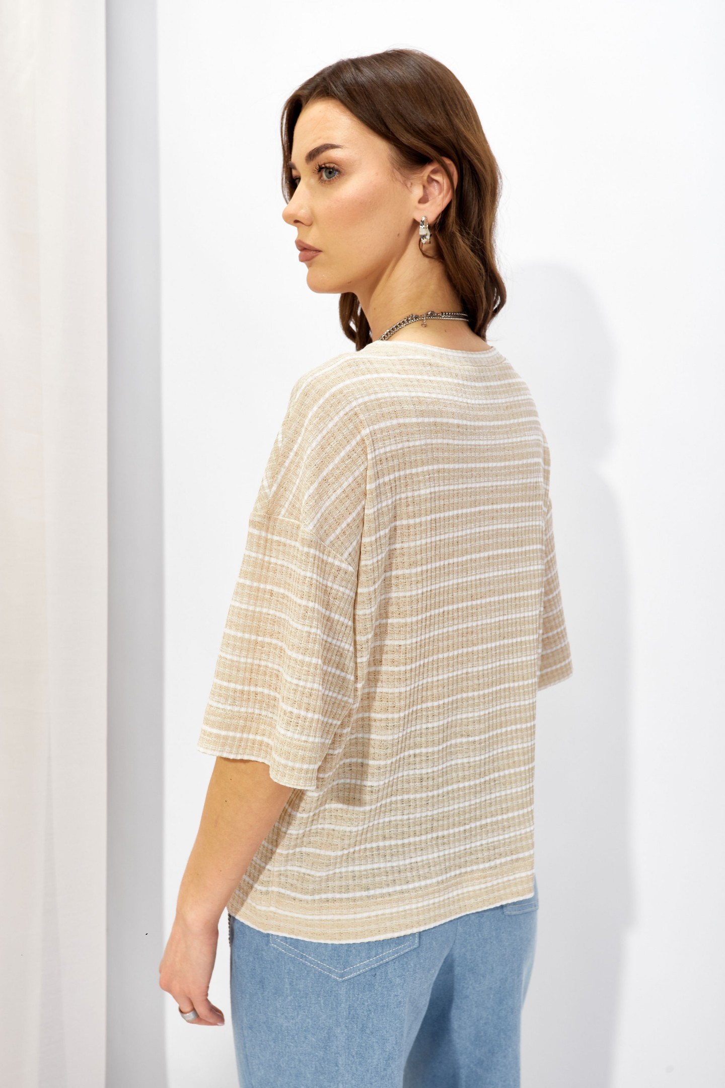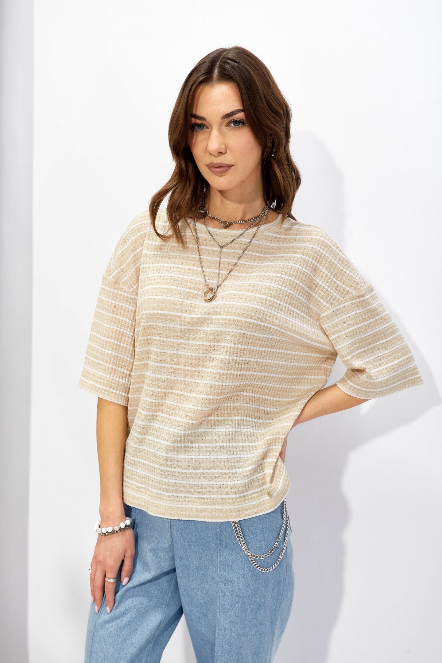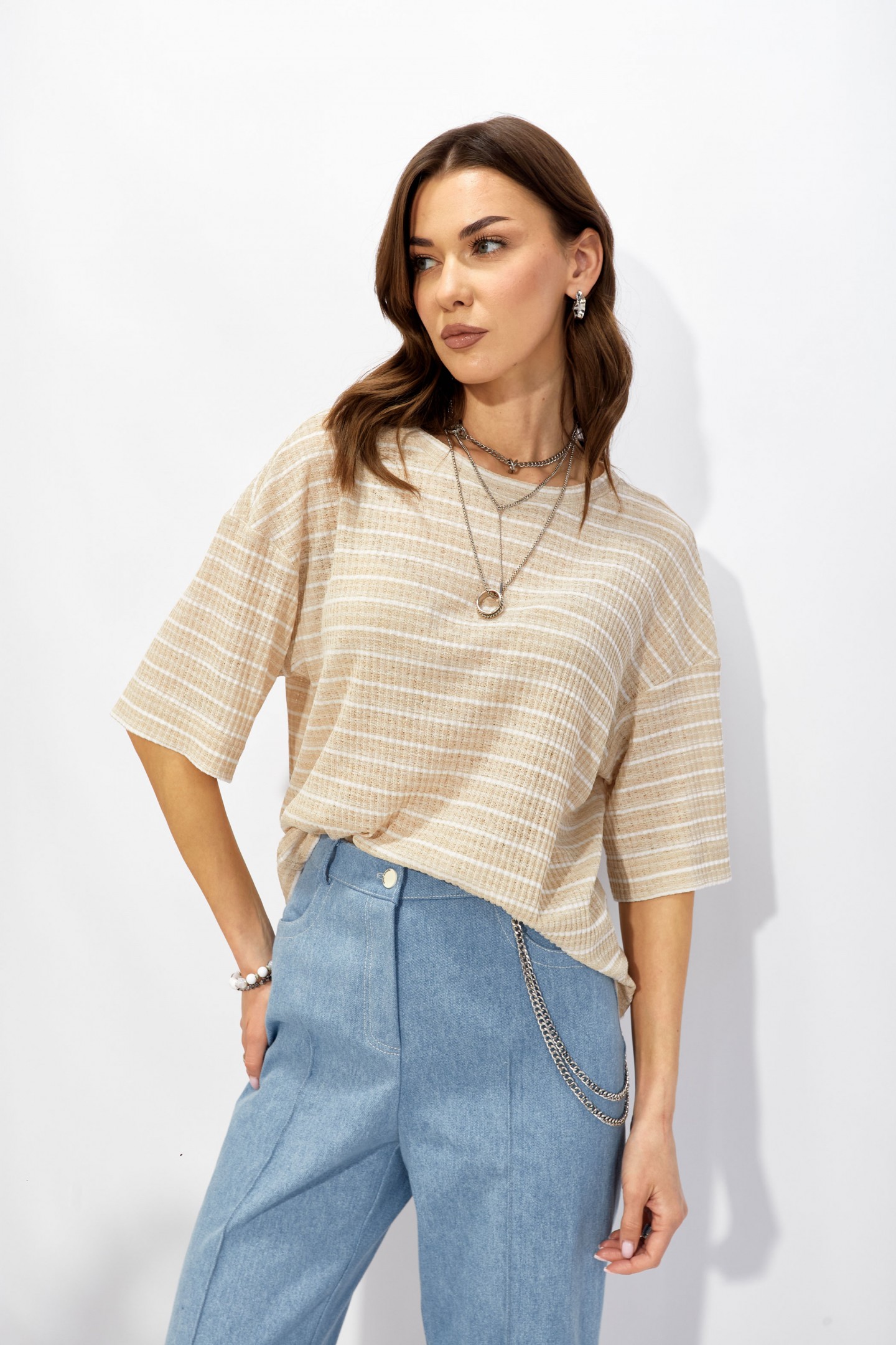 | Описание | Джемпер прямого силуэта из трикотажного полотна в полоску. Горловина округлая. Рукав со спущенной линией плеча длиной до локтя. |