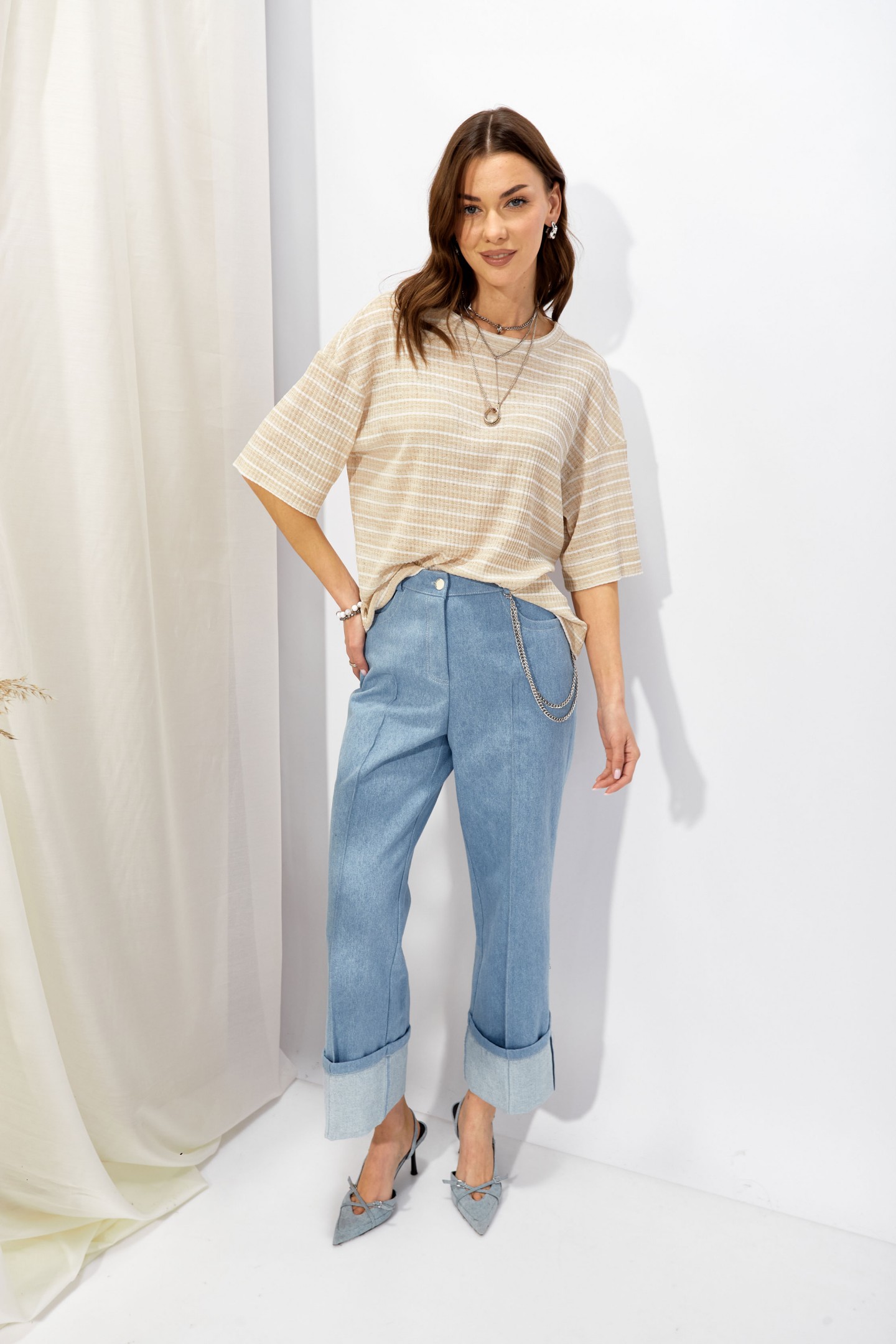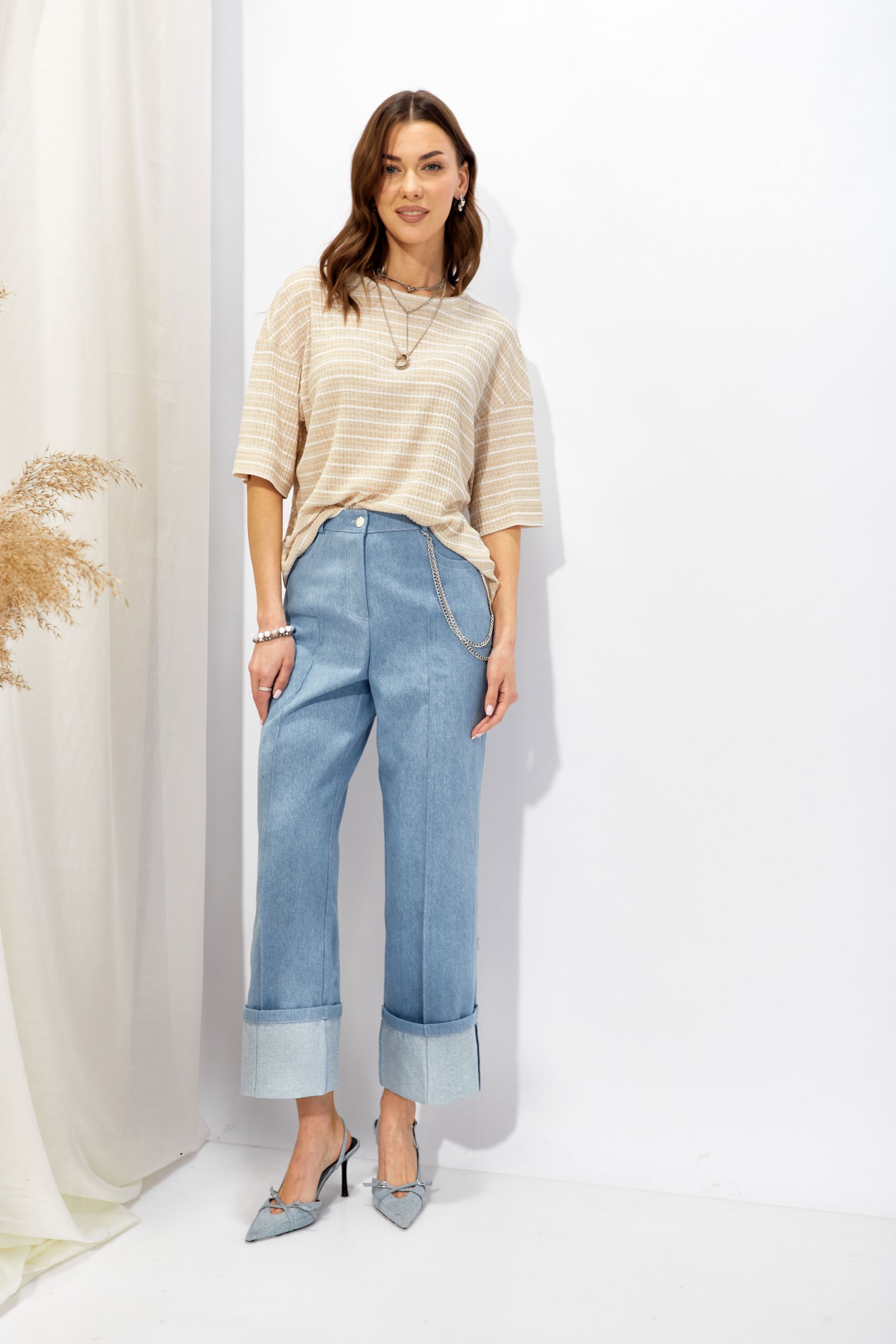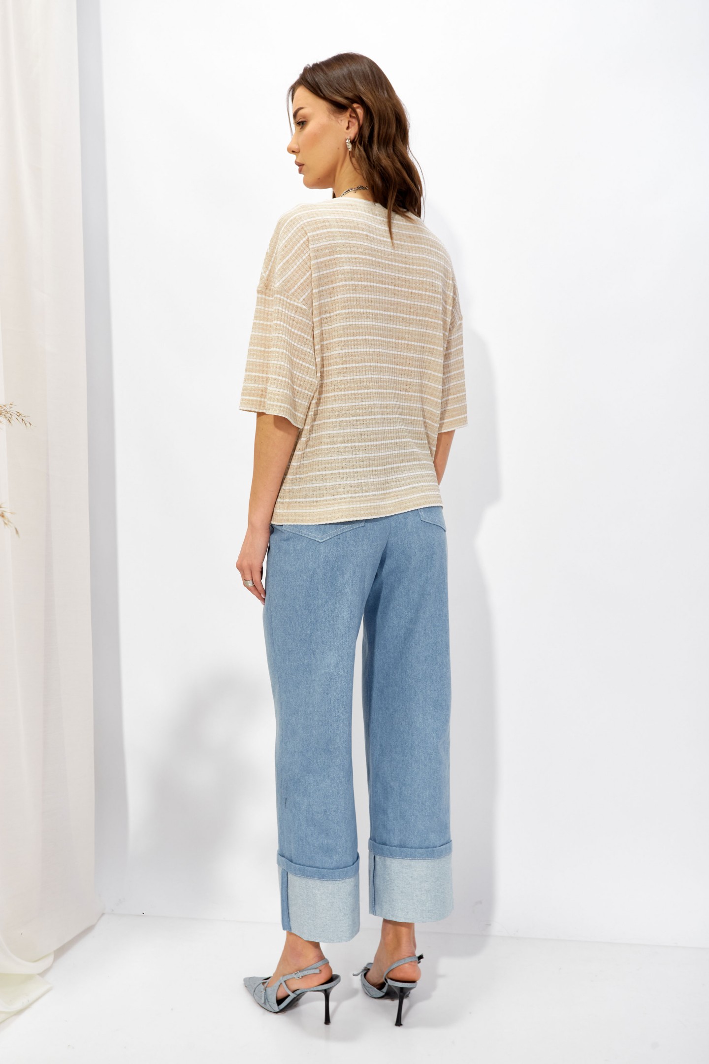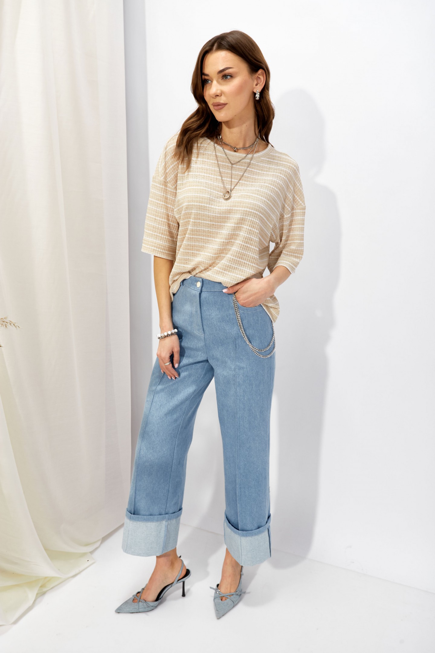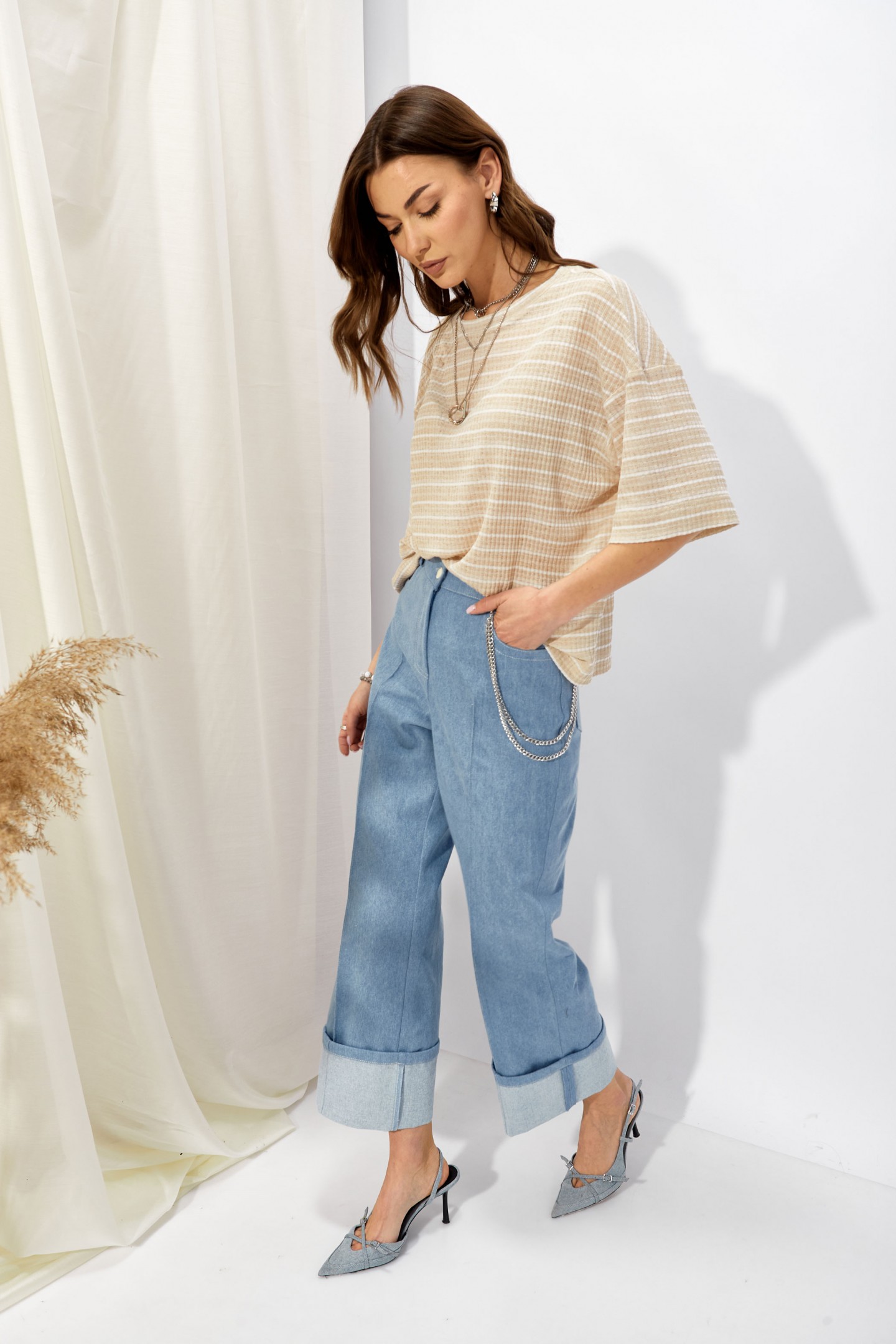 | Описание | Джемпер прямого силуэта из трикотажного полотна в полоску. Горловина округлая. Рукав со спущенной линией плеча длиной до локтя. |