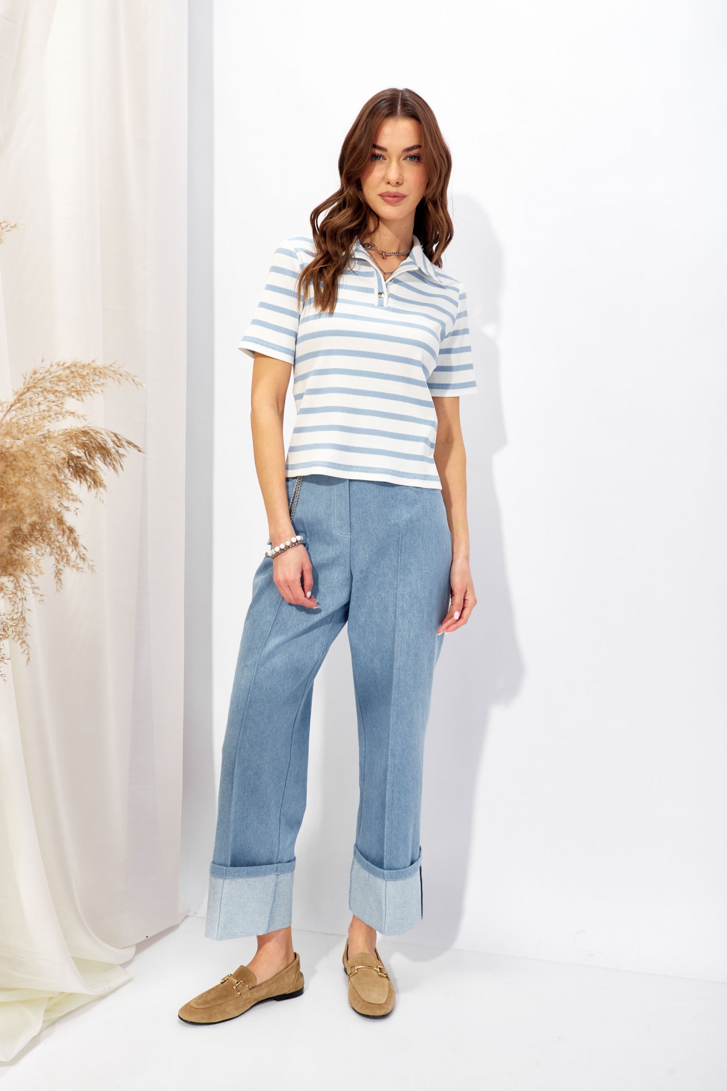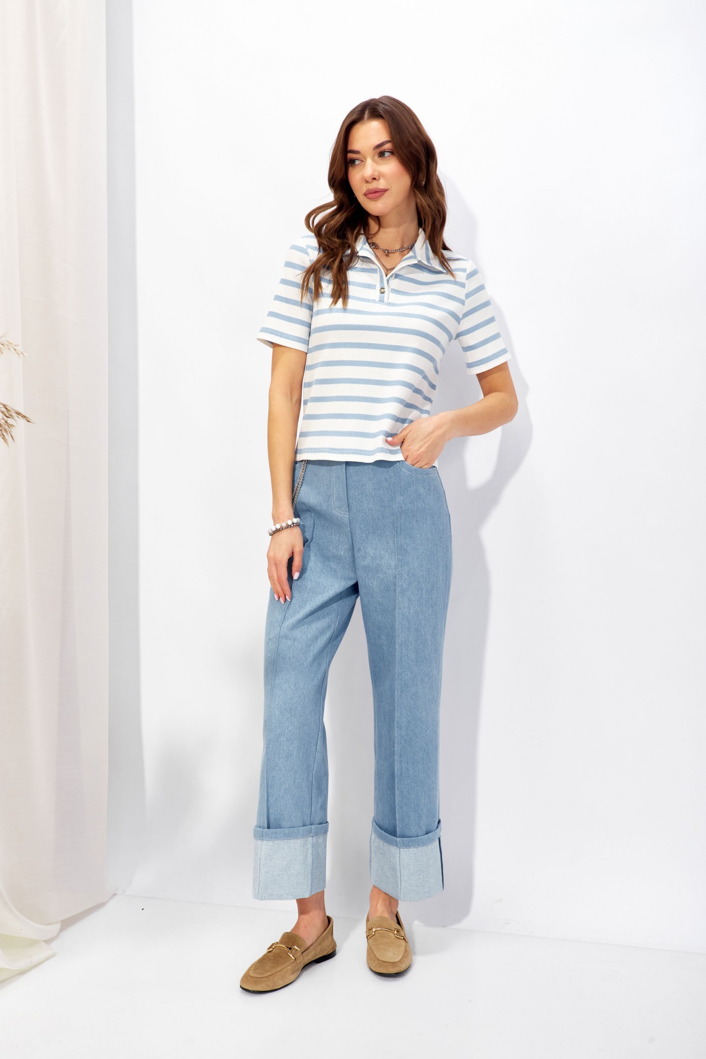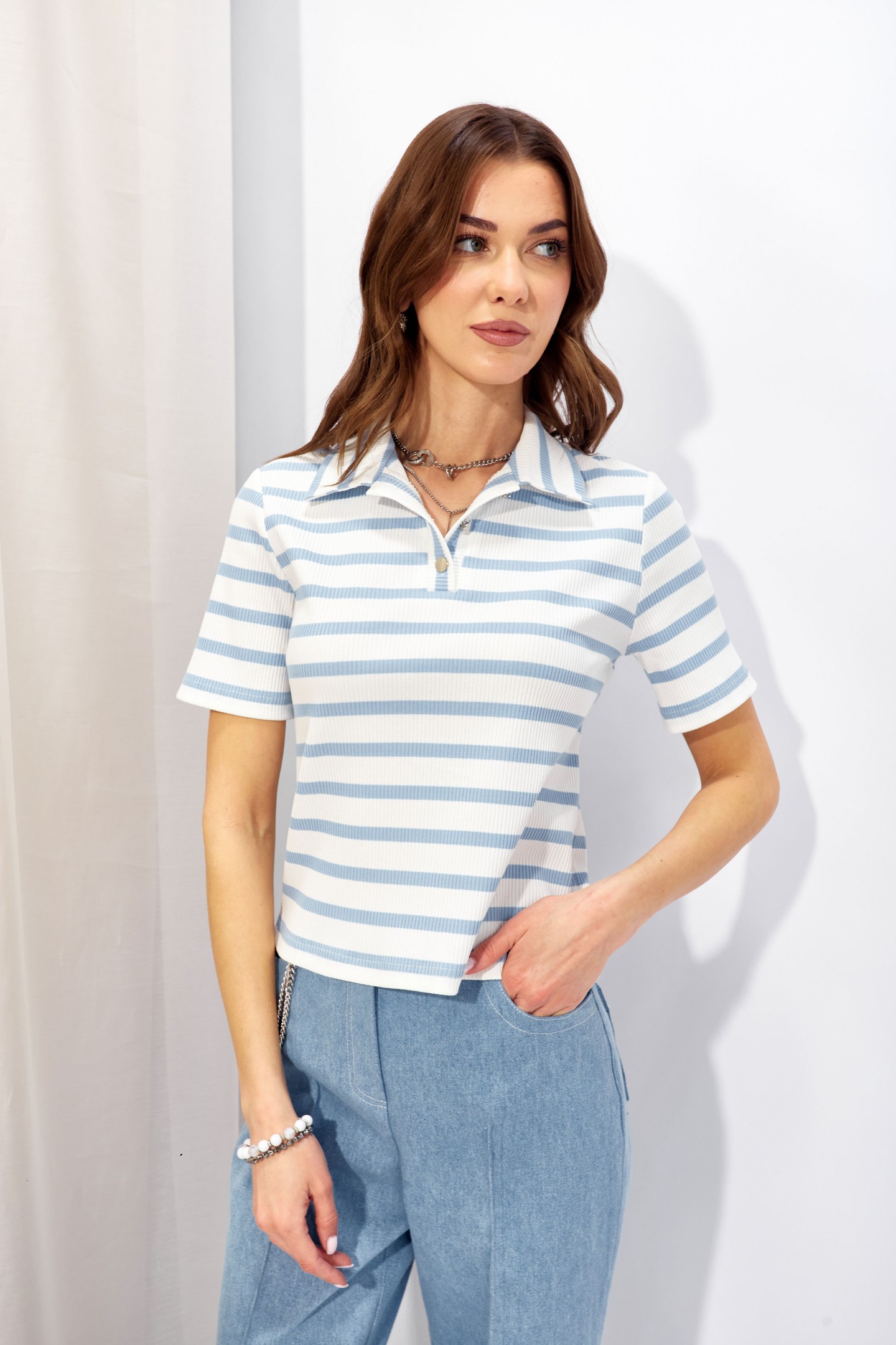| Описание | Джемпер полуприлегающего силуэта из трикотажного полотна в полоску. Воротник стояче-отложной, по центру застежка на петли и пуговицы. Рукав втачной, одношовный, выше линии локтя. Обращаем ваше внимание, что фурнитура может отличаться от фото. |