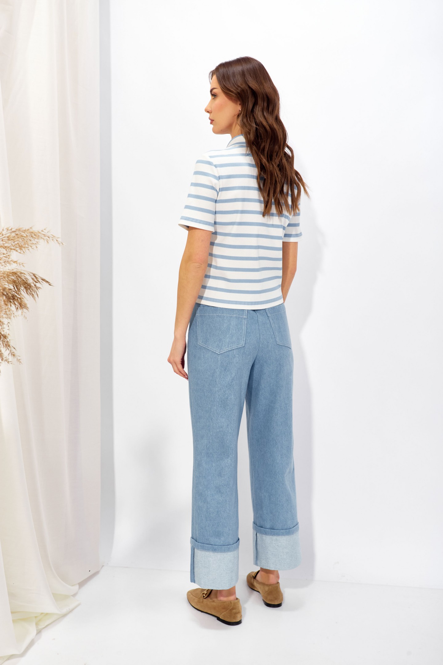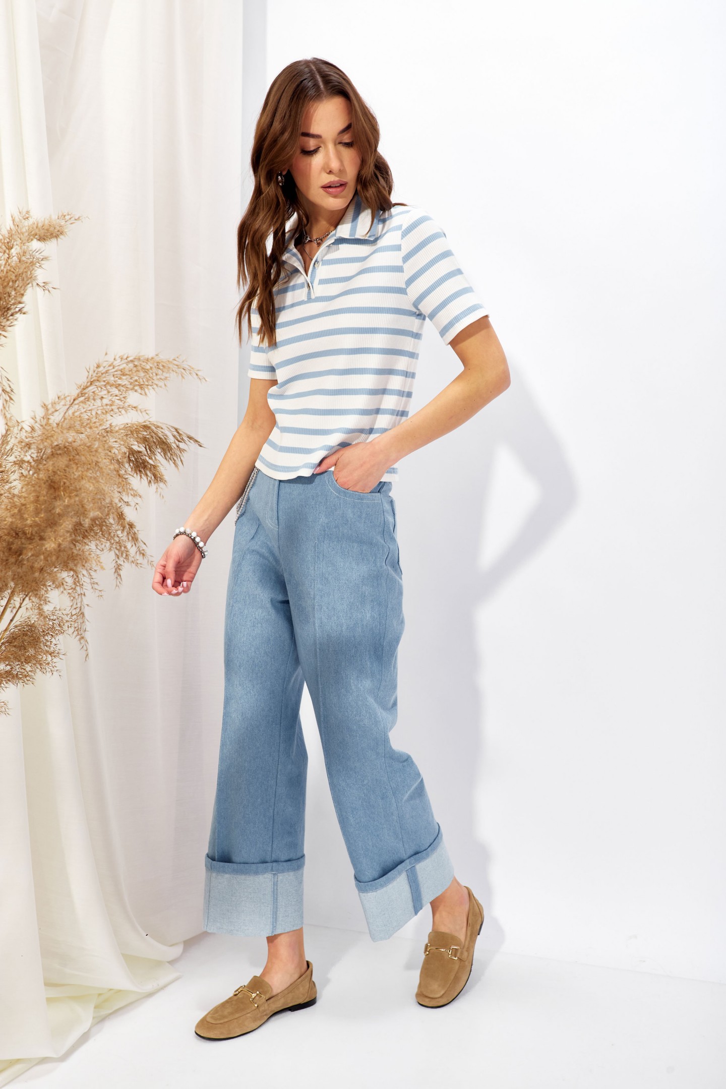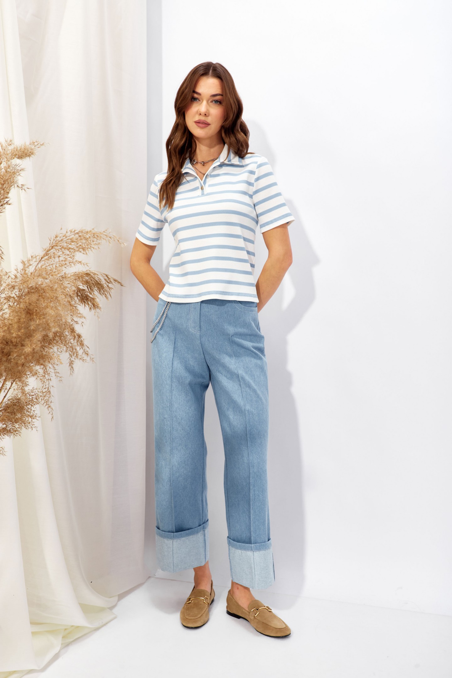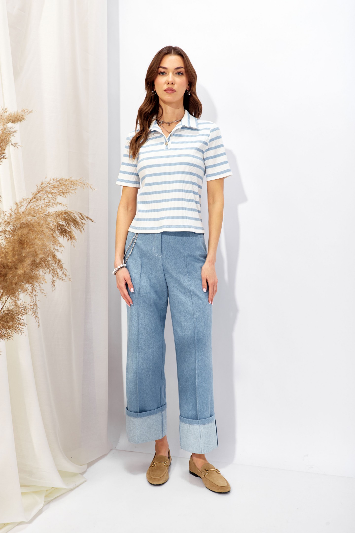 | Описание | Джемпер полуприлегающего силуэта из трикотажного полотна в полоску. Воротник стояче-отложной, по центру застежка на петли и пуговицы. Рукав втачной, одношовный, выше линии локтя. Обращаем ваше внимание, что фурнитура может отличаться от фото. |
