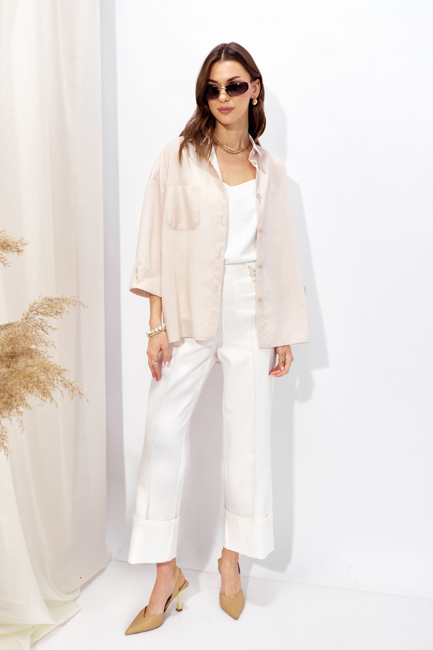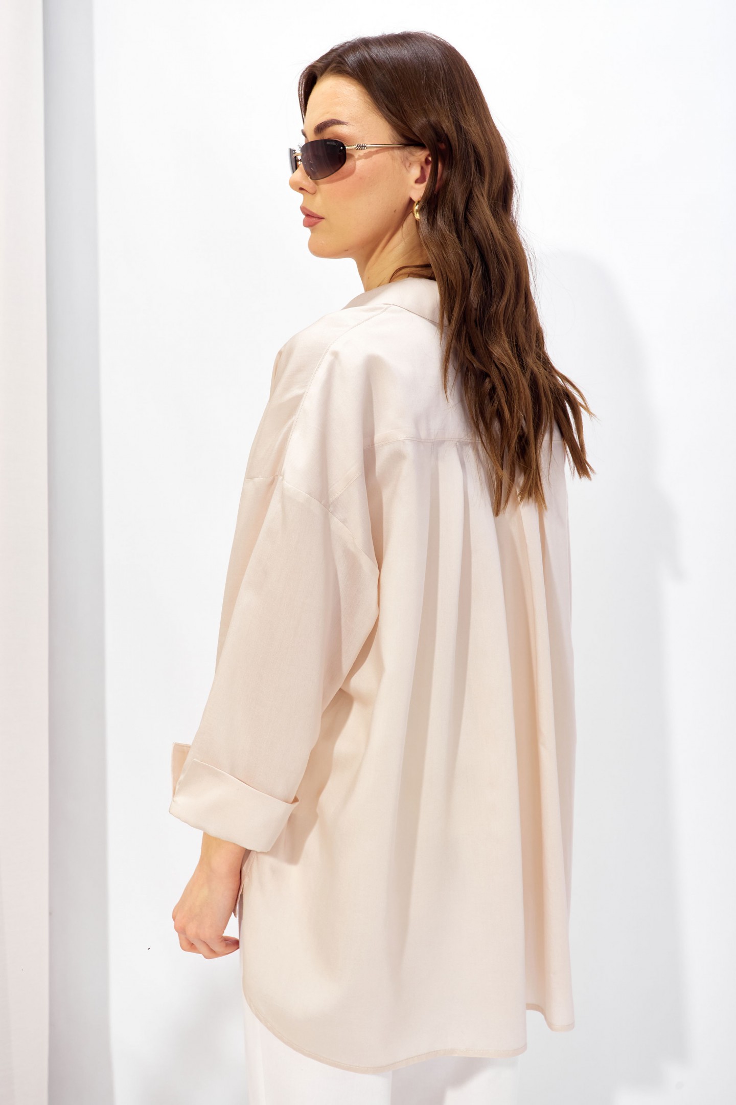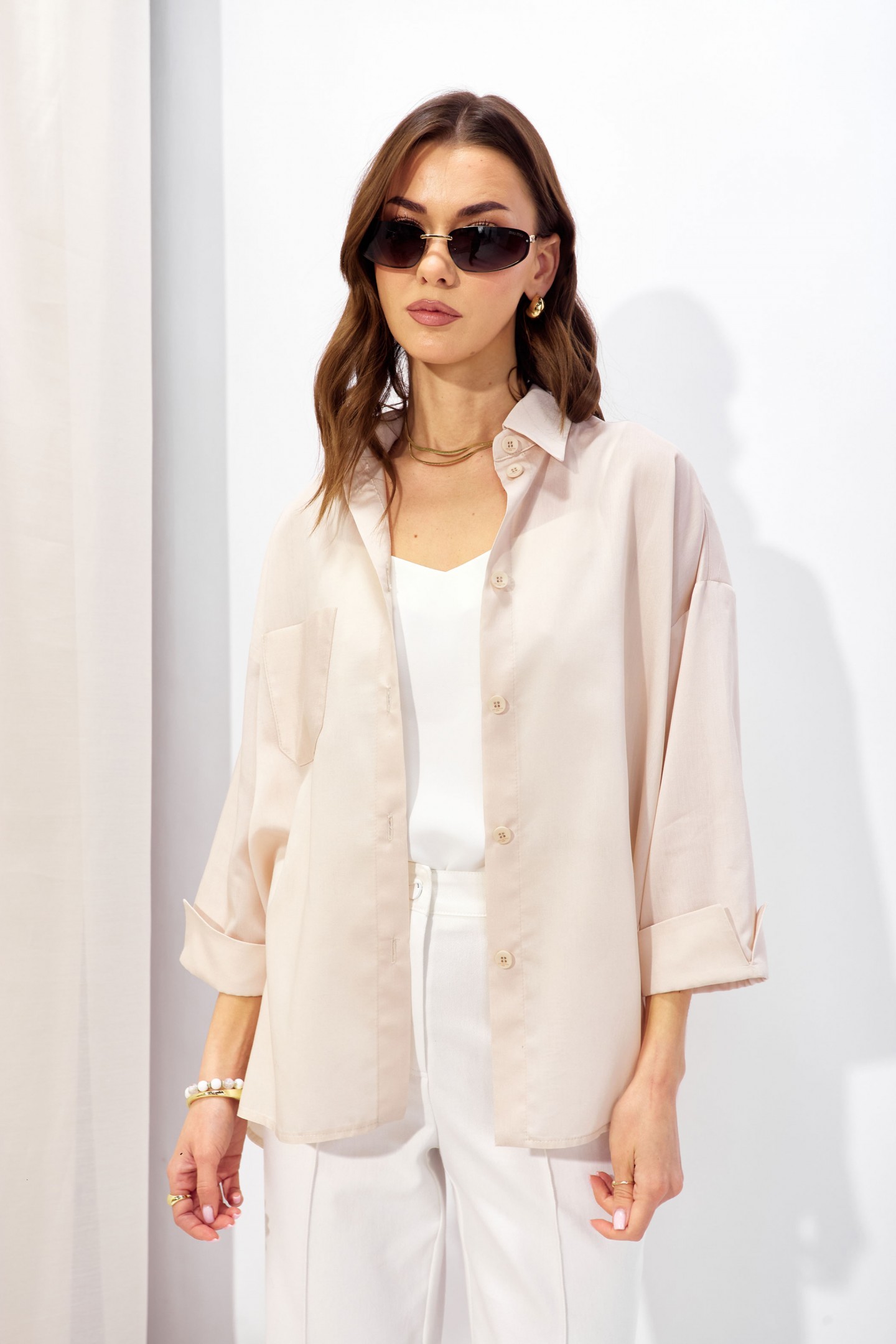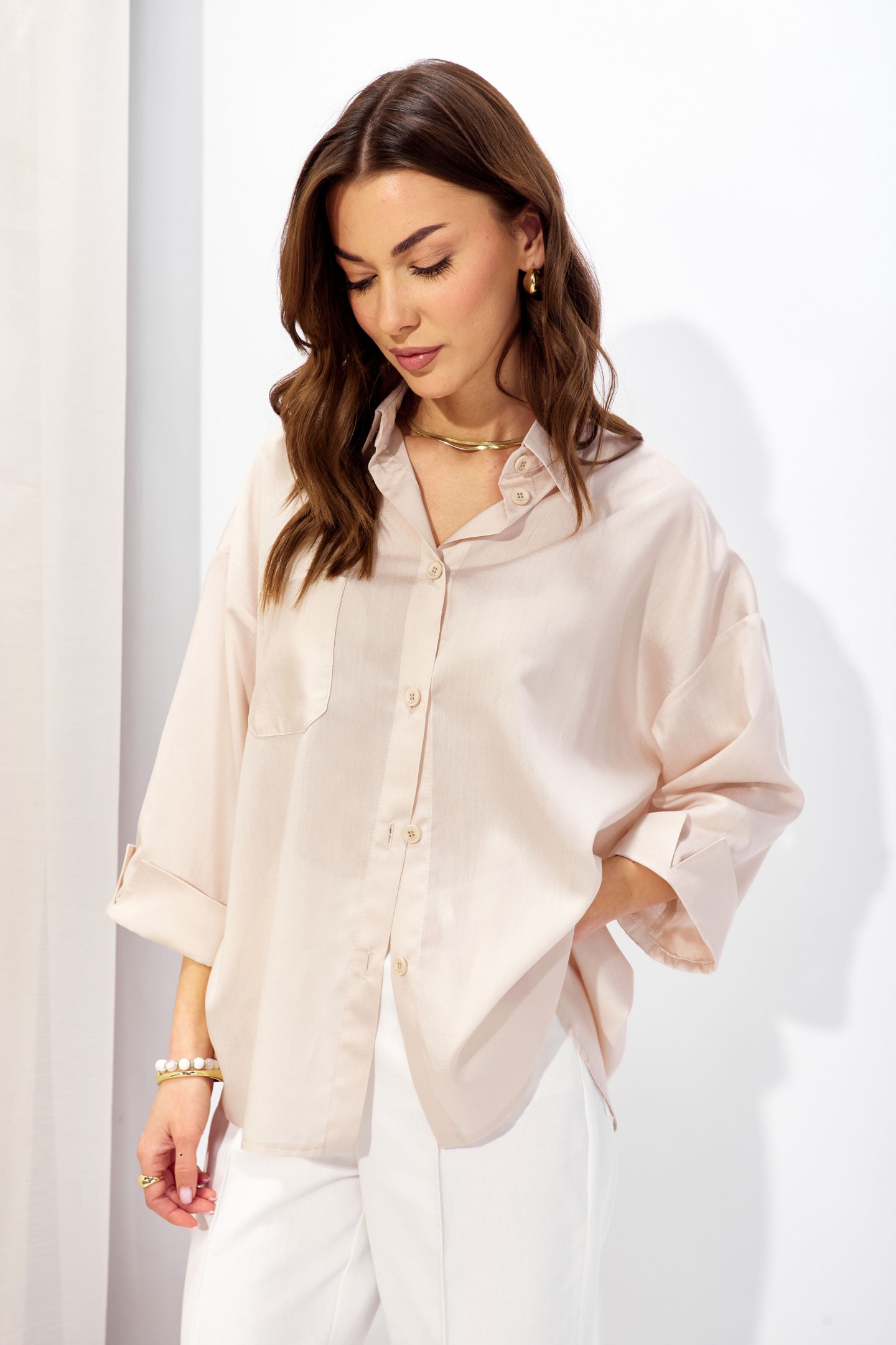 | Описание | Блузка прямого силуэта из натуральной ткани с добавлением вискозы с фигурным низом. Воротник рубашечного типа с застежкой по центру на петли и пуговицы. По переду накладной карман. Рукав со спущенной линией плеча длиной 7/8 , по низу манжета. На спинке кокетка с декоративными складками. В боковых швах блузки по низу разрезы. |