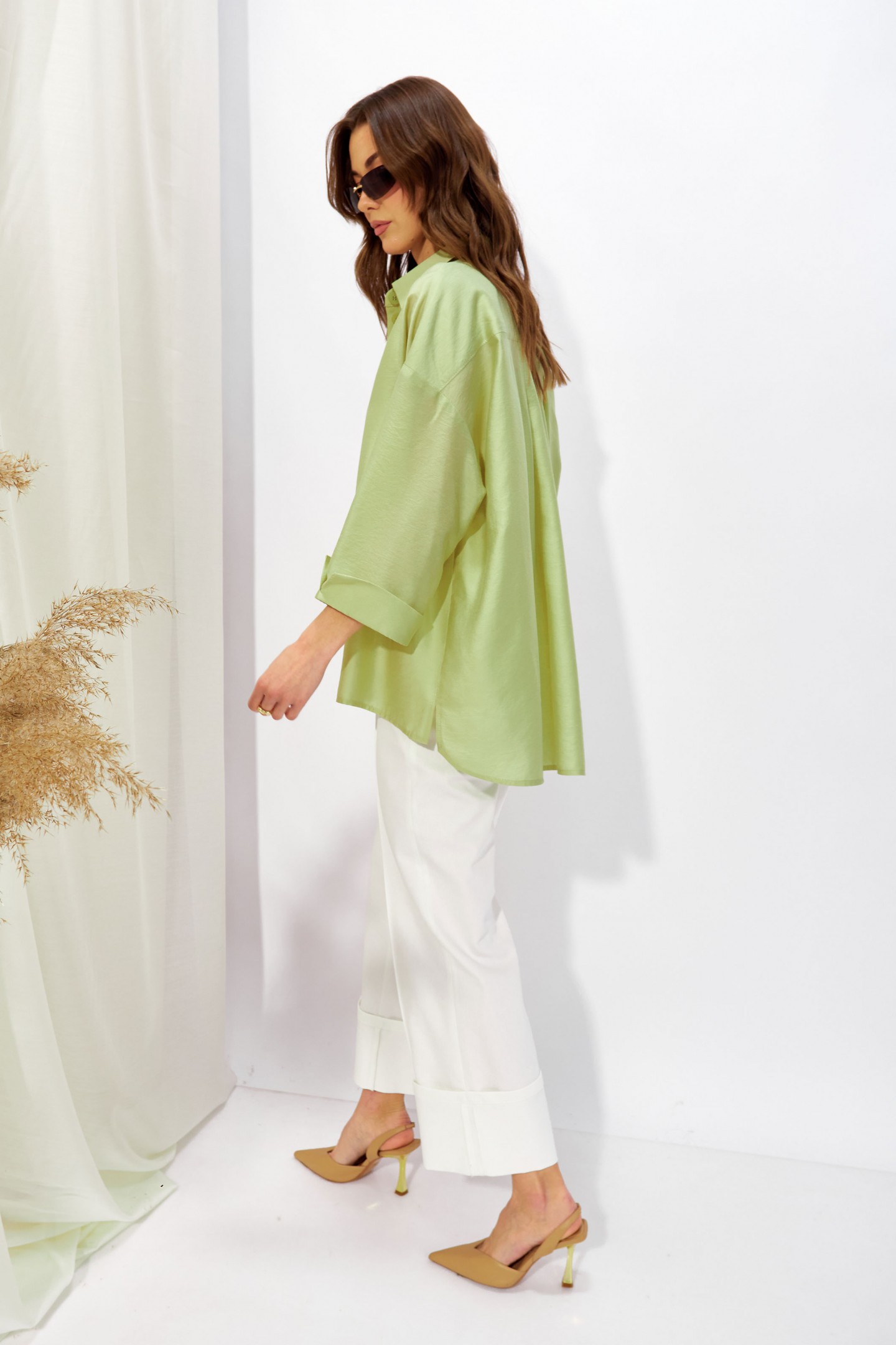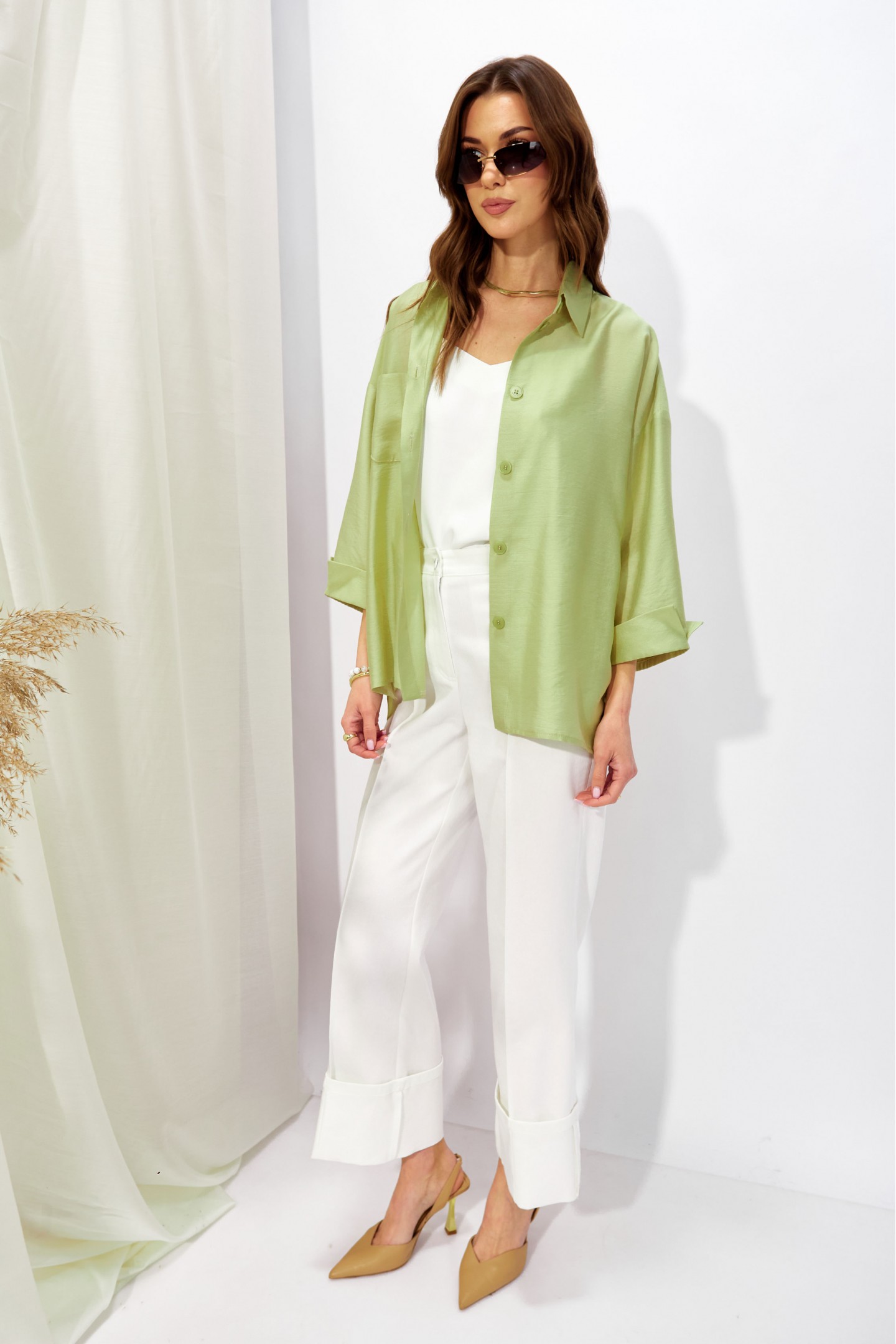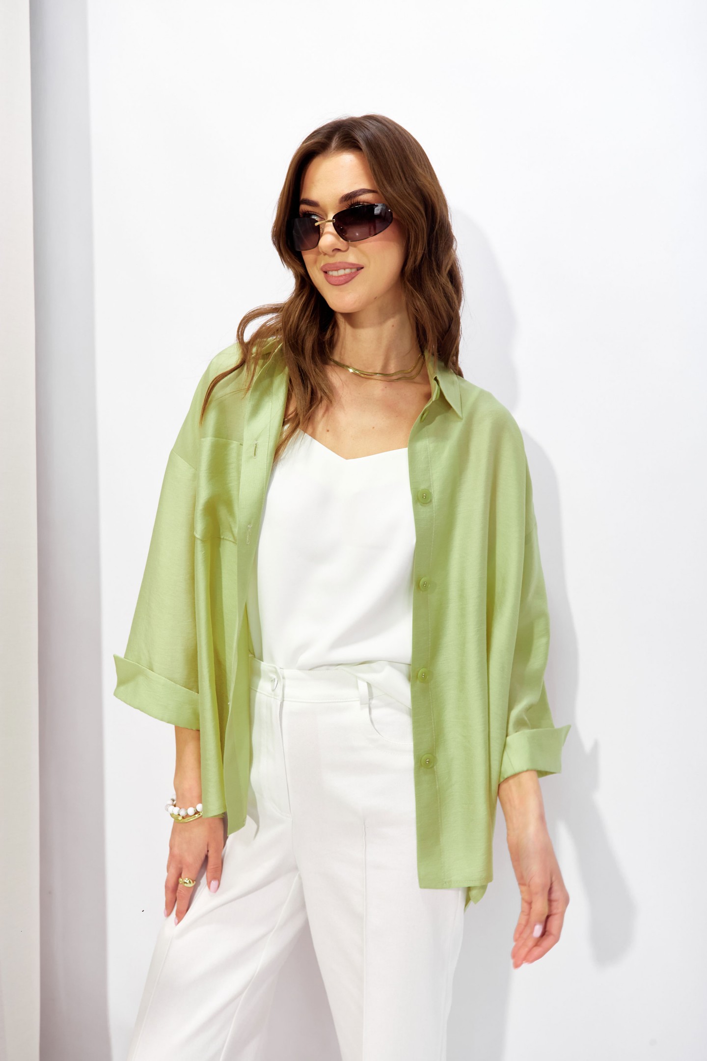 Описание Блузка прямого силуэта из натуральной ткани с добавлением вискозы с фигурным низом. Воротник рубашечного типа с застежкой по центру на петли и пуговицы. По переду накладной карман. Рукав со спущенной линией плеча длиной 7/8 , по низу манжета. На спинке кокетка с декоративными складками. В боковых швах блузки по низу разрезы.