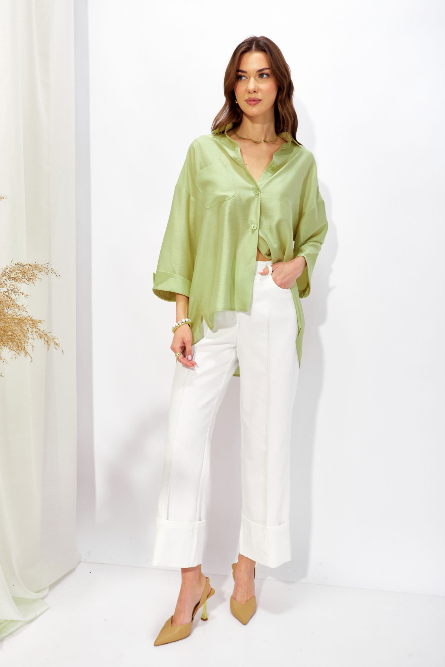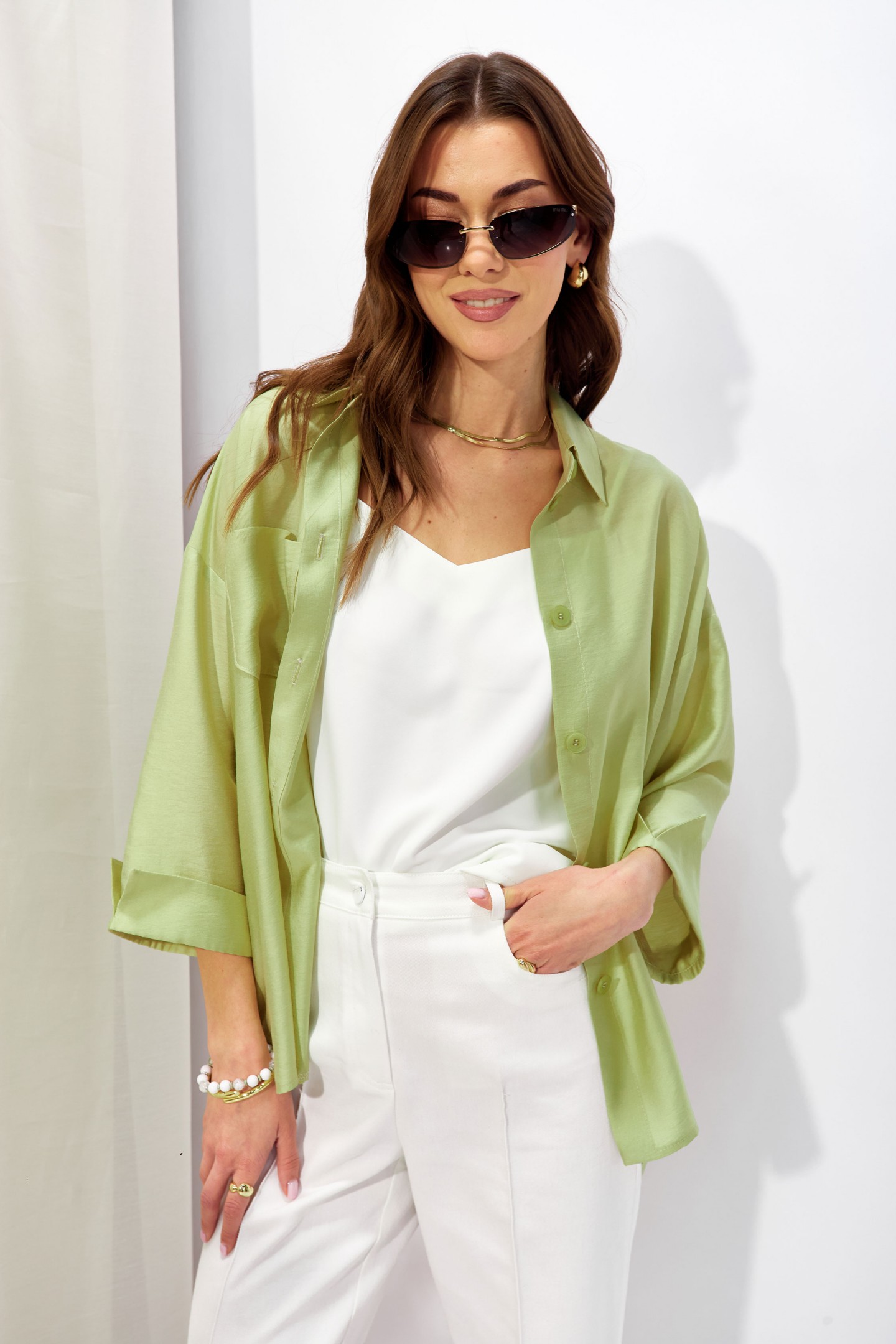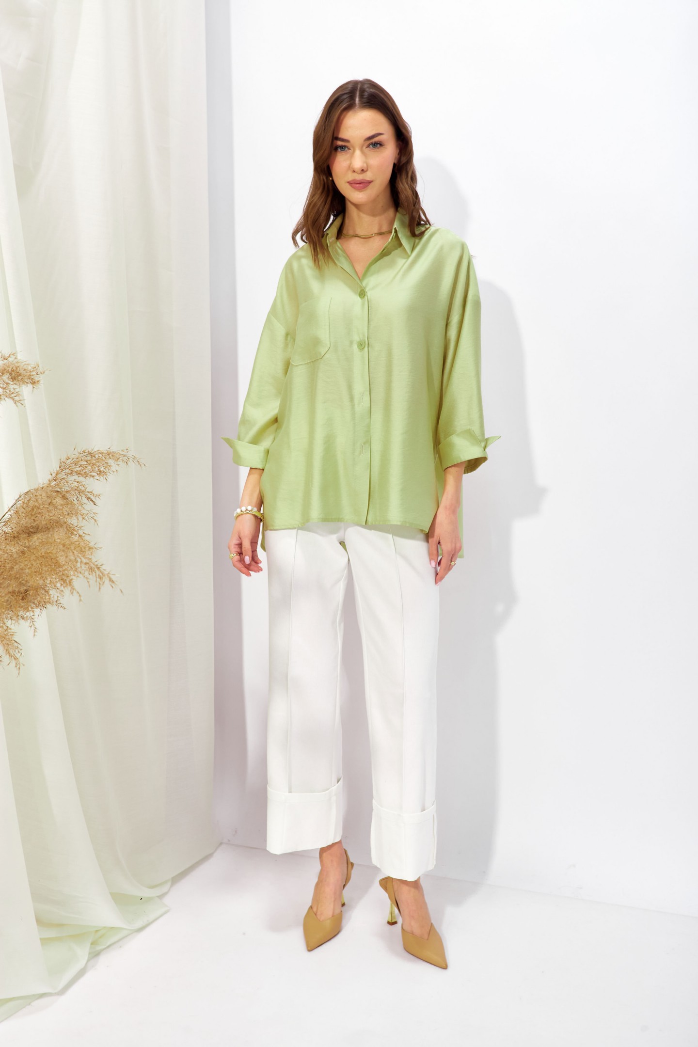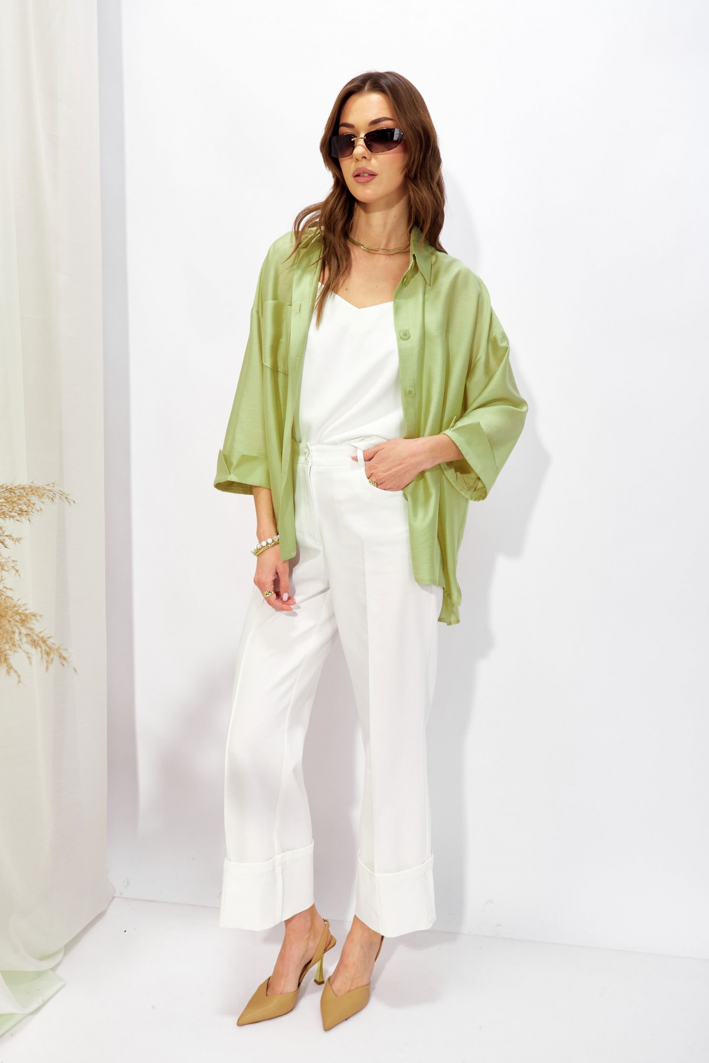Описание Блузка прямого силуэта из натуральной ткани с добавлением вискозы с фигурным низом. Воротник рубашечного типа с застежкой по центру на петли и пуговицы. По переду накладной карман. Рукав со спущенной линией плеча длиной 7/8 , по низу манжета. На спинке кокетка с декоративными складками. В боковых швах блузки по низу разрезы.