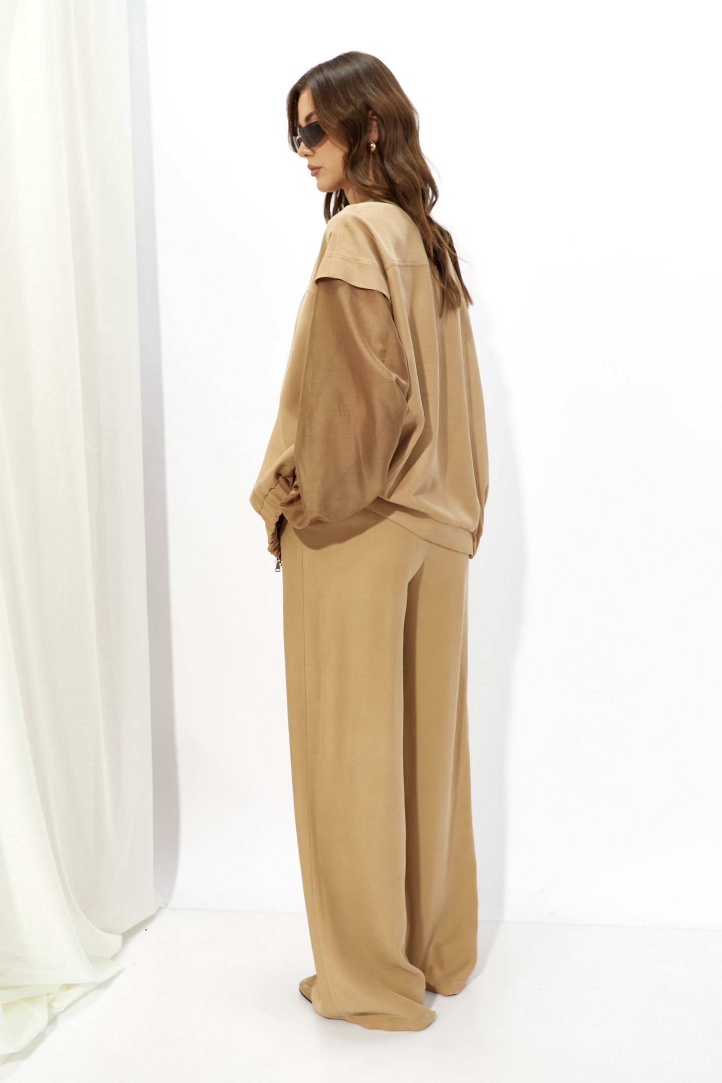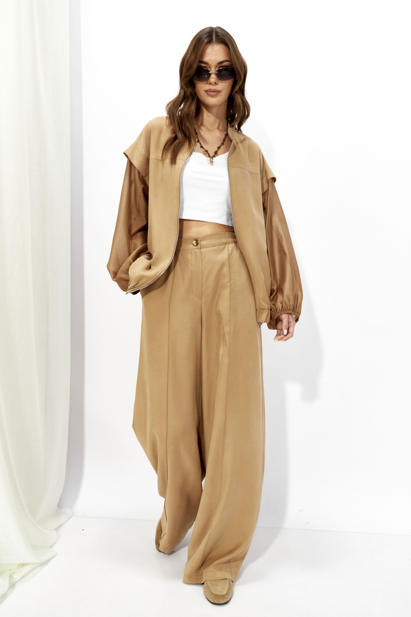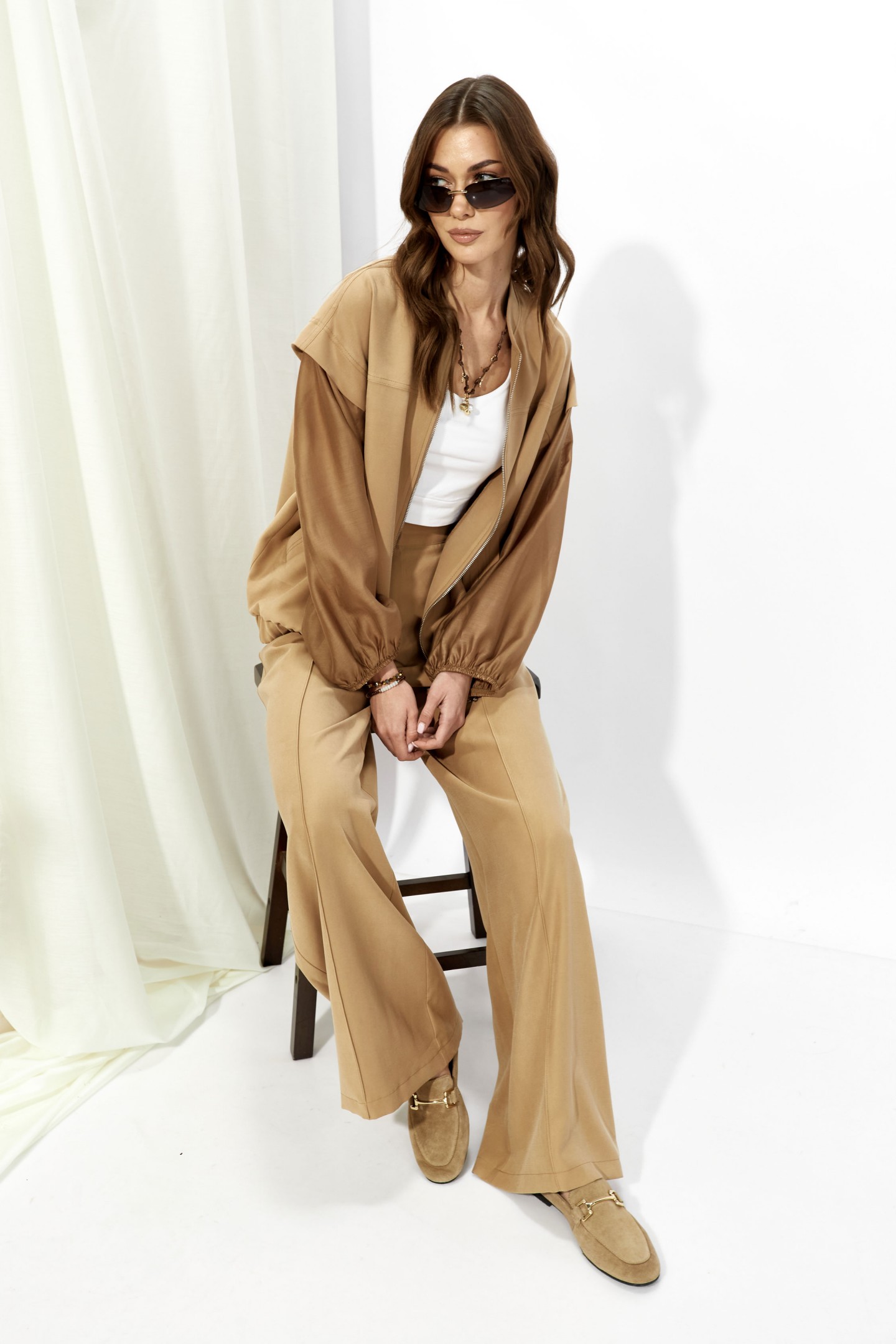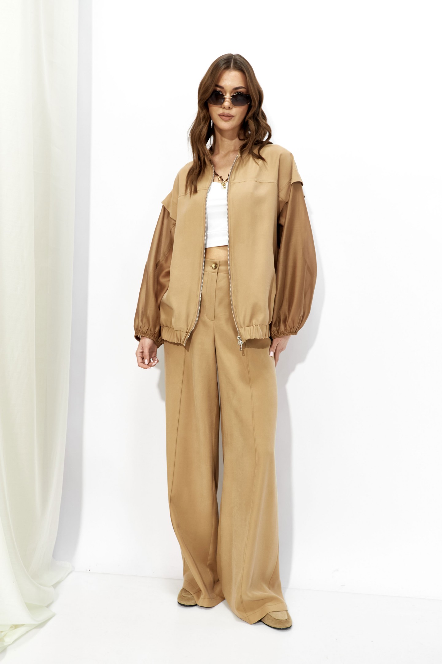 | Описание | Костюм, состоящий из жакета и брюк из струящейся натуральной ткани. Жакет свободного расширенного силуэта со спущенной линией плеч, без подкладки, длиной до линии бёдер. Застежка центральная на металлическую молнию. Вырез горловины округлый с воротником стойкой. Рукава из полупрозрачной ткани со сборкой на резинку по низу. Перед и спинка с отрезными горизонтальными кокетками. На переде обработаны карманы с широкими листочками с декоративной строчкой. По низу изделия притачная планка с частичной сборкой на резинку, по переду и спинке до боковых рельефов. Брюки свободного силуэта, расширенные к низу. Пояс притачной с застежкой на молнию и пуговицу, и с частичной эластичной тесьмой. Передние половинки с боковыми карманами, с наклонным входом. По центру передних половинок брюк застрочены канты. . Обращаем ваше внимание, что фурнитура может отличаться от фото. |