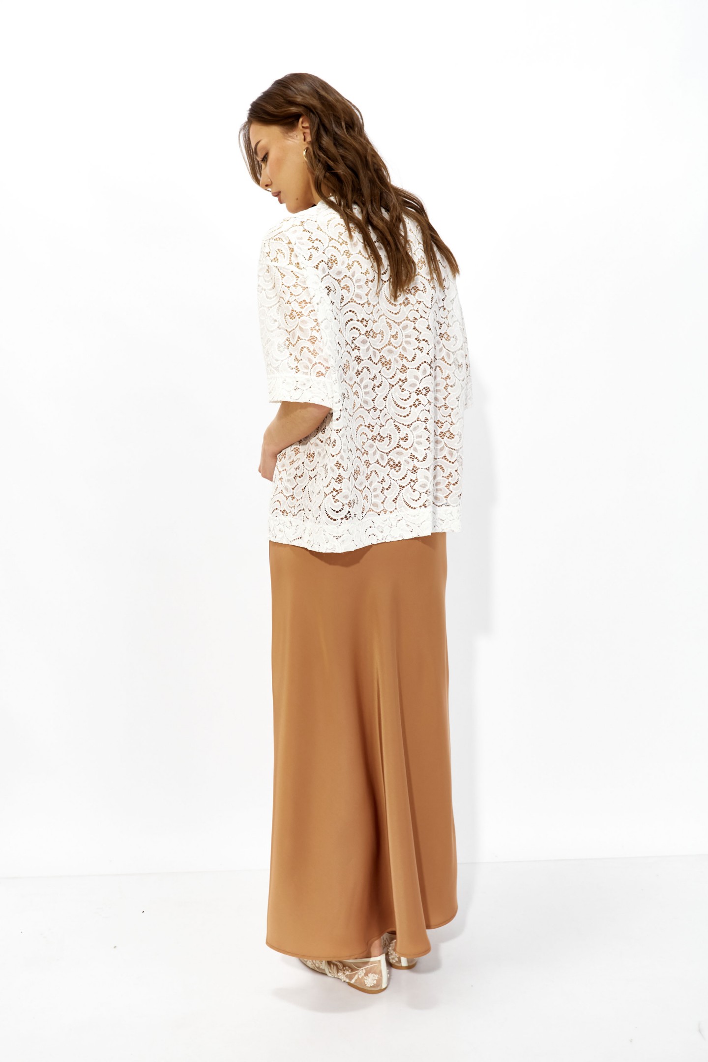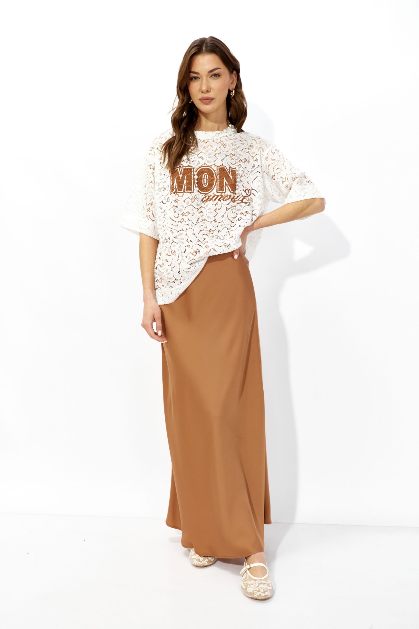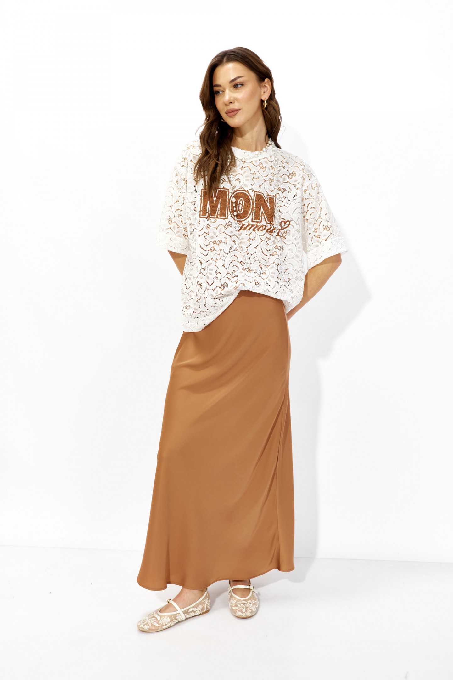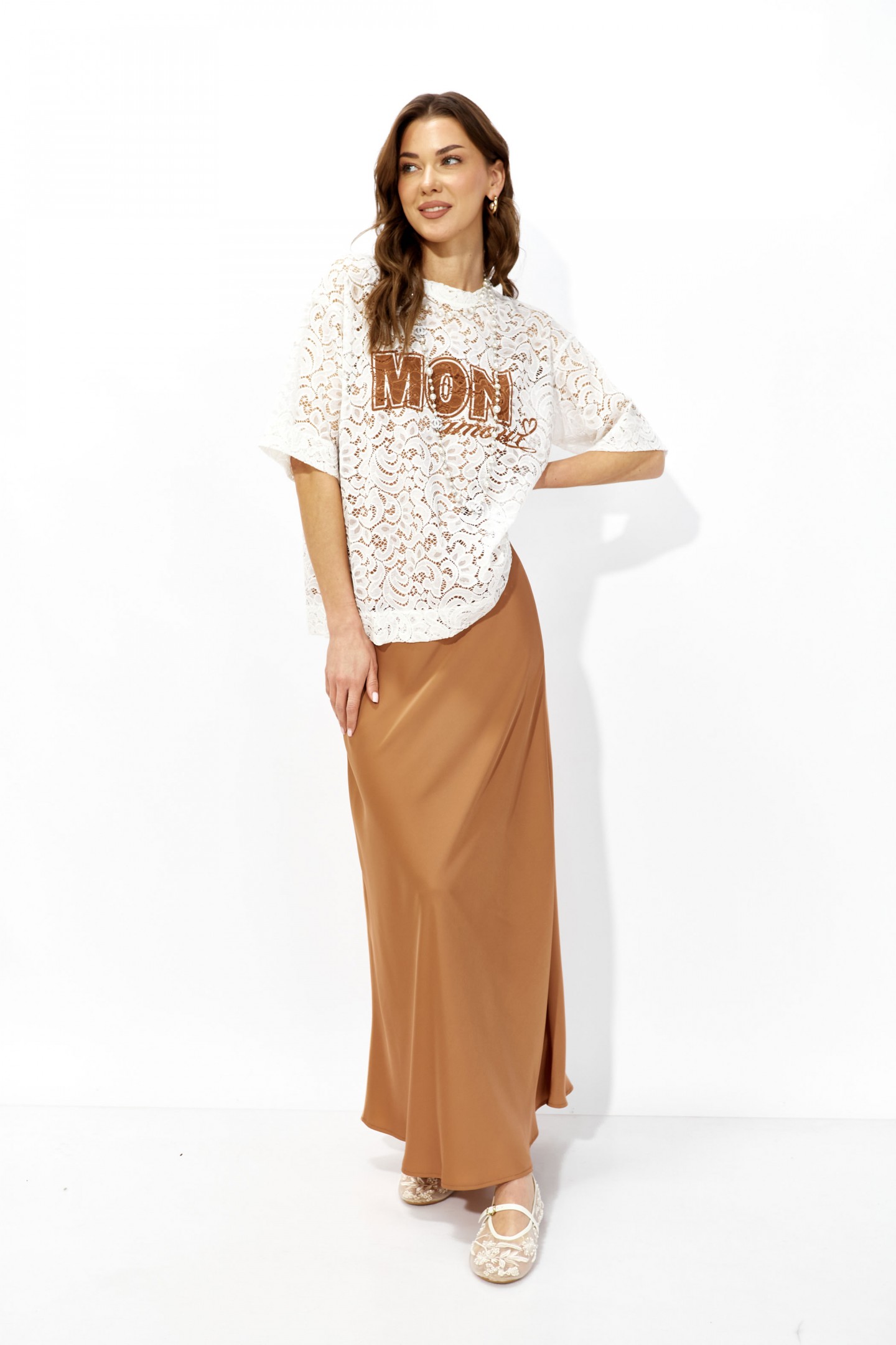 Описание Оригинальный джемпер из эластичного кружева прямого силуэта, вырез горловины округлый, обработан притачной планкой. По переду выполнена дизайнерская печать контрастного цвета.