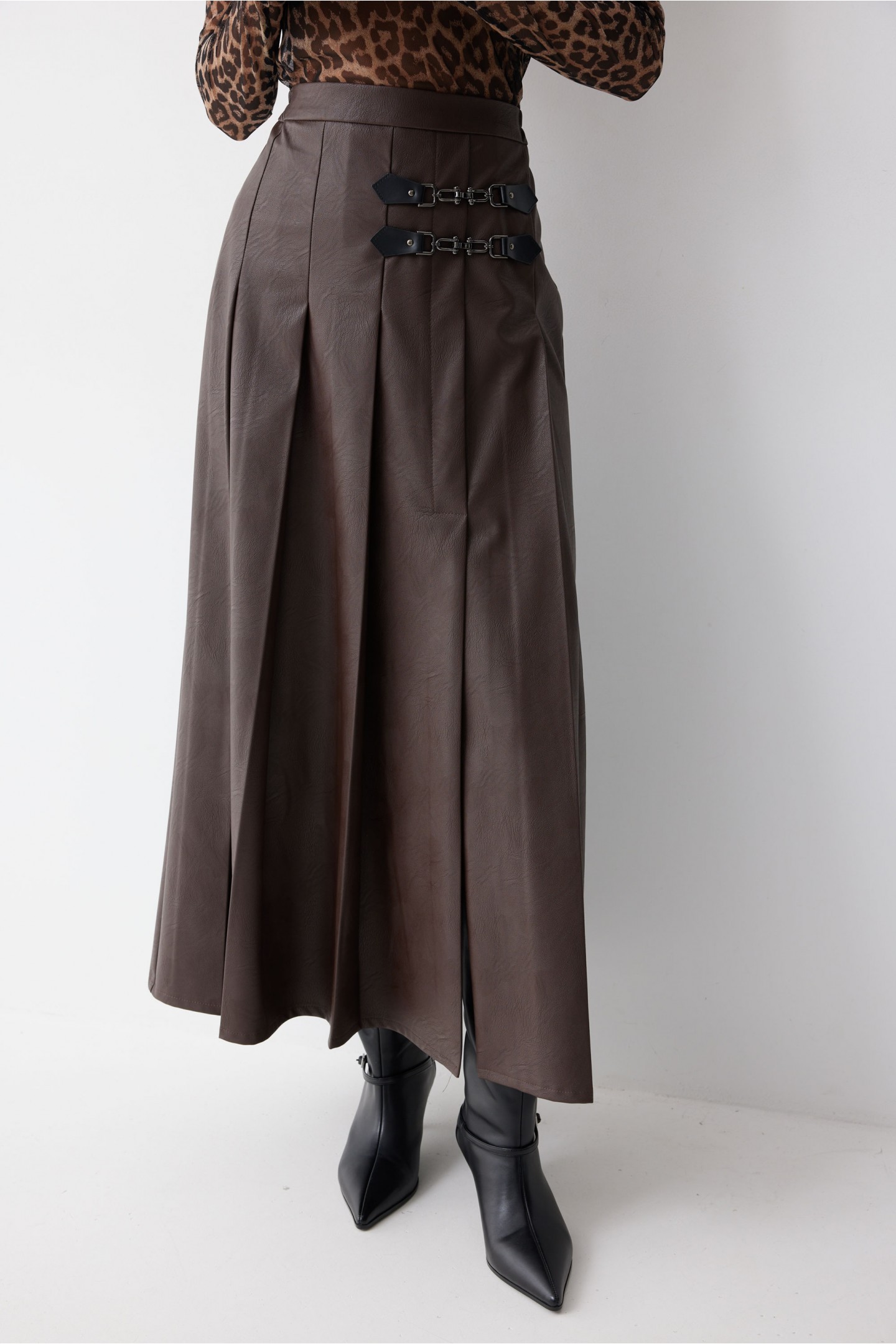 Описание Юбка А-силуэта из экокожи на хлопковой основе длины макси. По верху юбки притачной пояс со шлевками для ремня. Переднее полотнище юбки со складками и шлицей и декоративной фурнитурой. На задних половинках расположены талиевые вытачки. На спинке в центральном шве потайная молния. По бокам в поясе вставлена резинка от складки до вытачки.