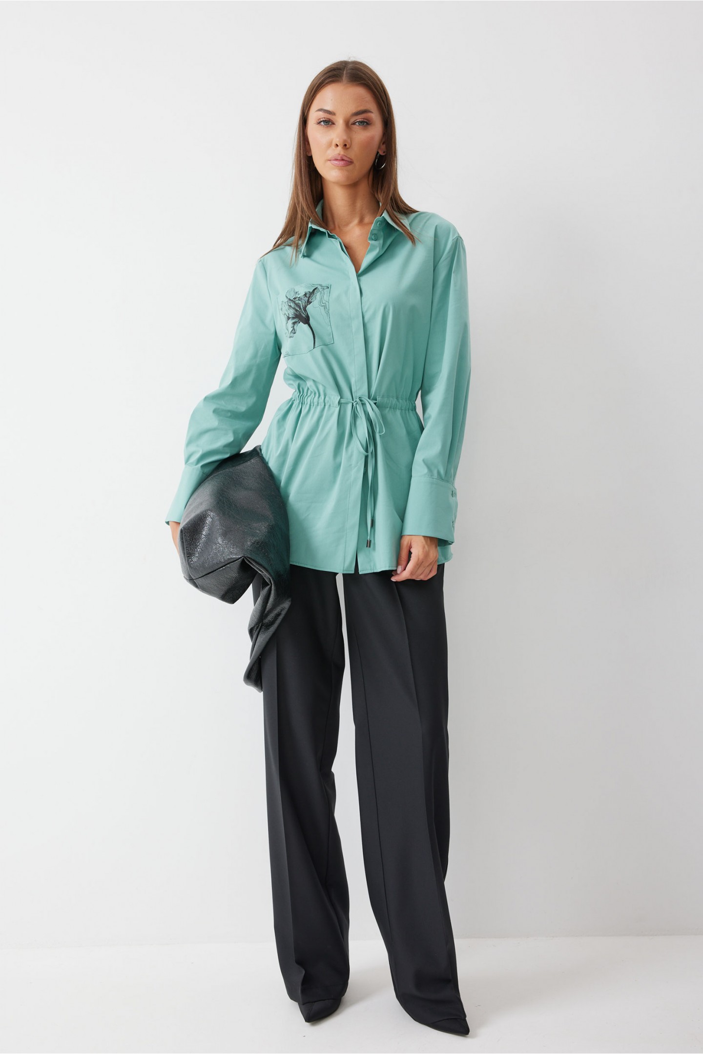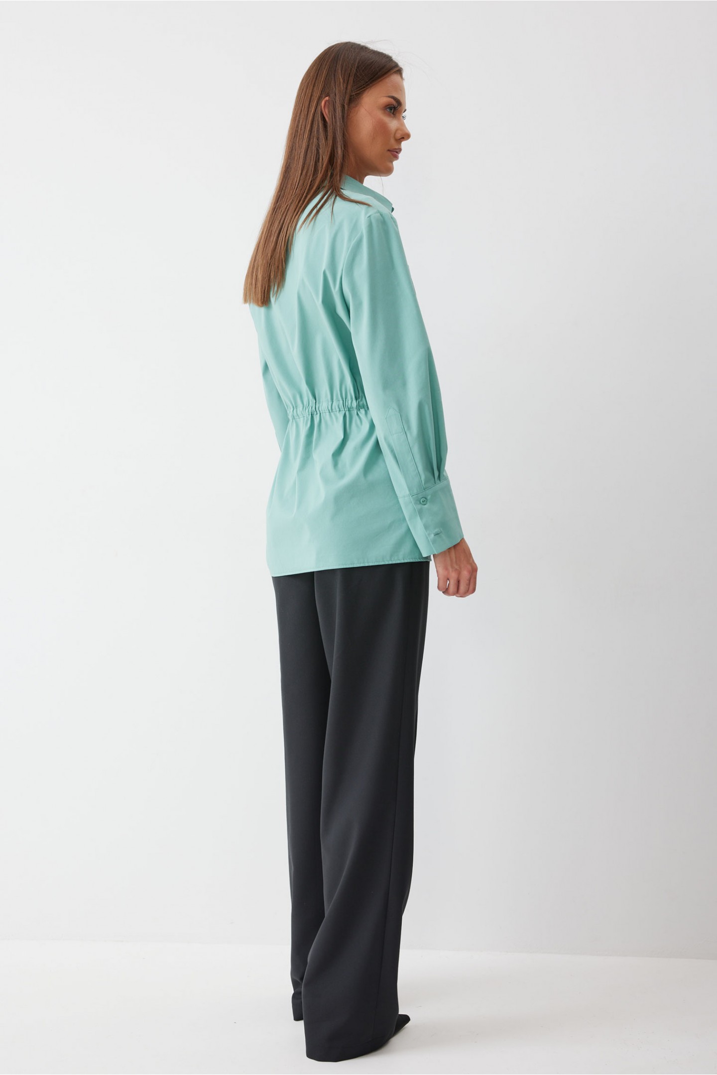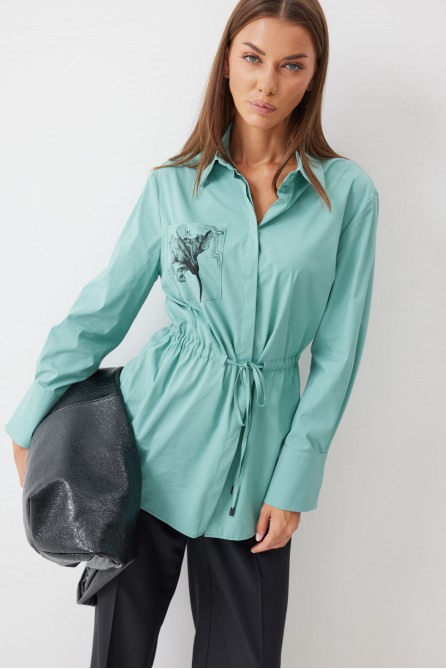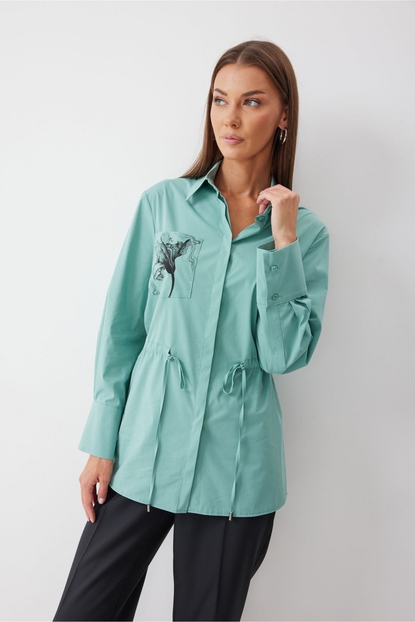 Описание Блузка полуприлегающего силуэта. На уровне талии расположена кулиска с и завязками для регулирования степени прилегания. По центру супатная застежка, воротник рубашечный стояче-отложной. Рукав втачной. В верхней части полочки расположен накладной карман с дизайнерской печатью.
