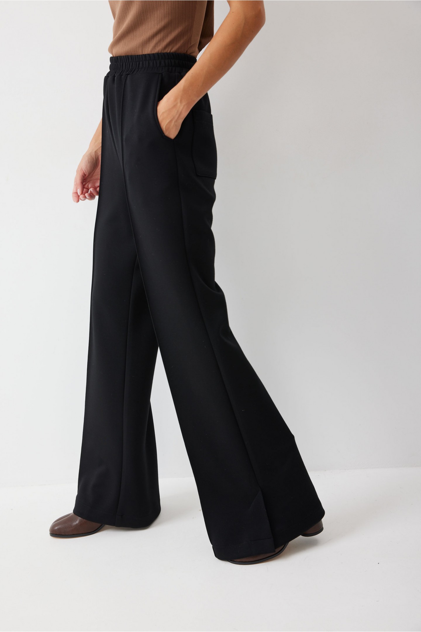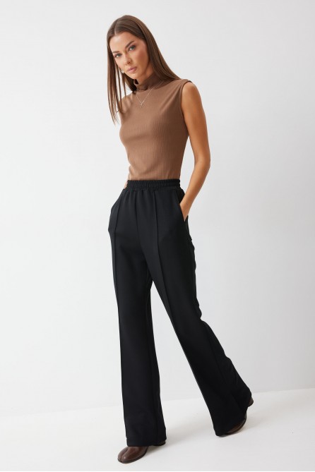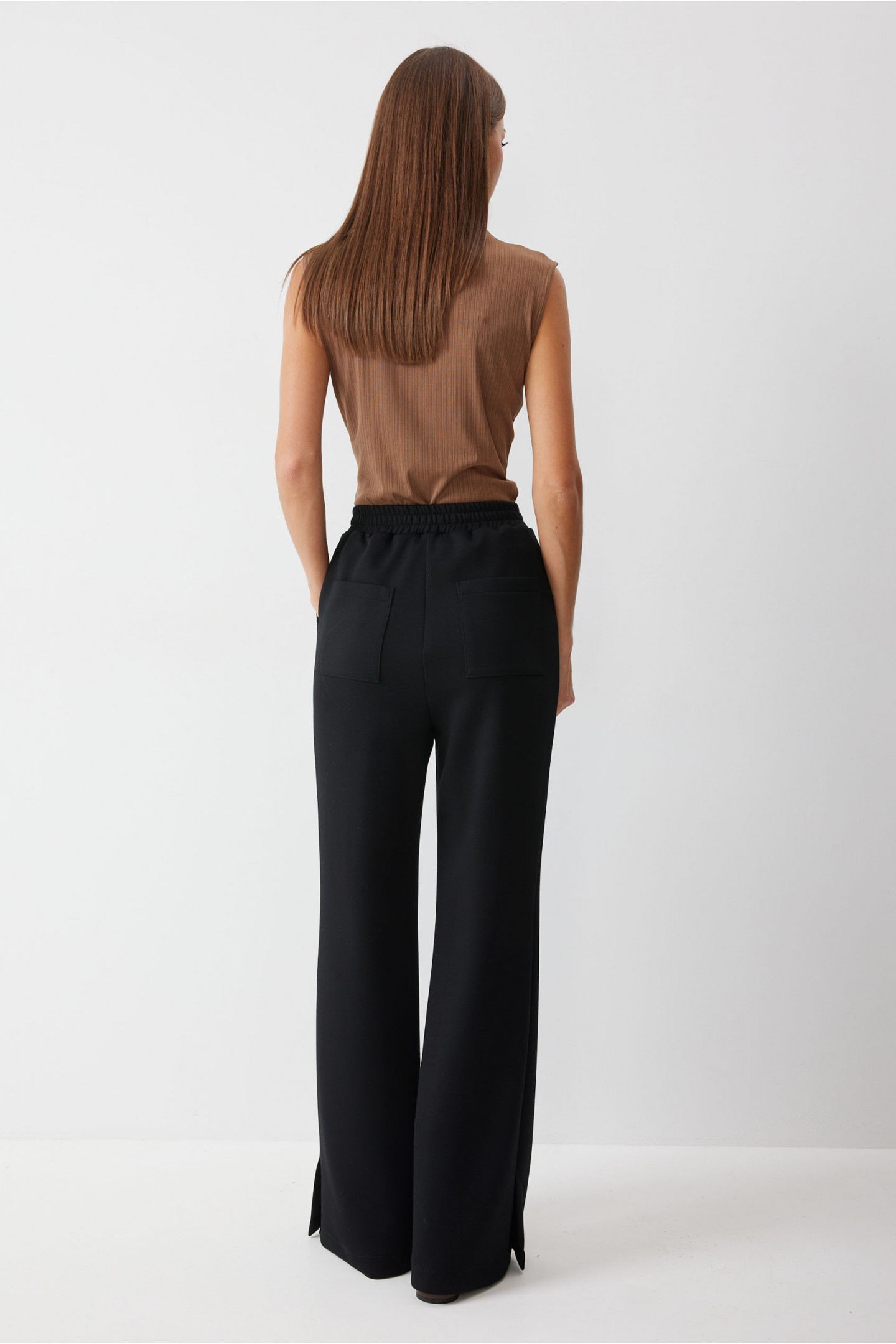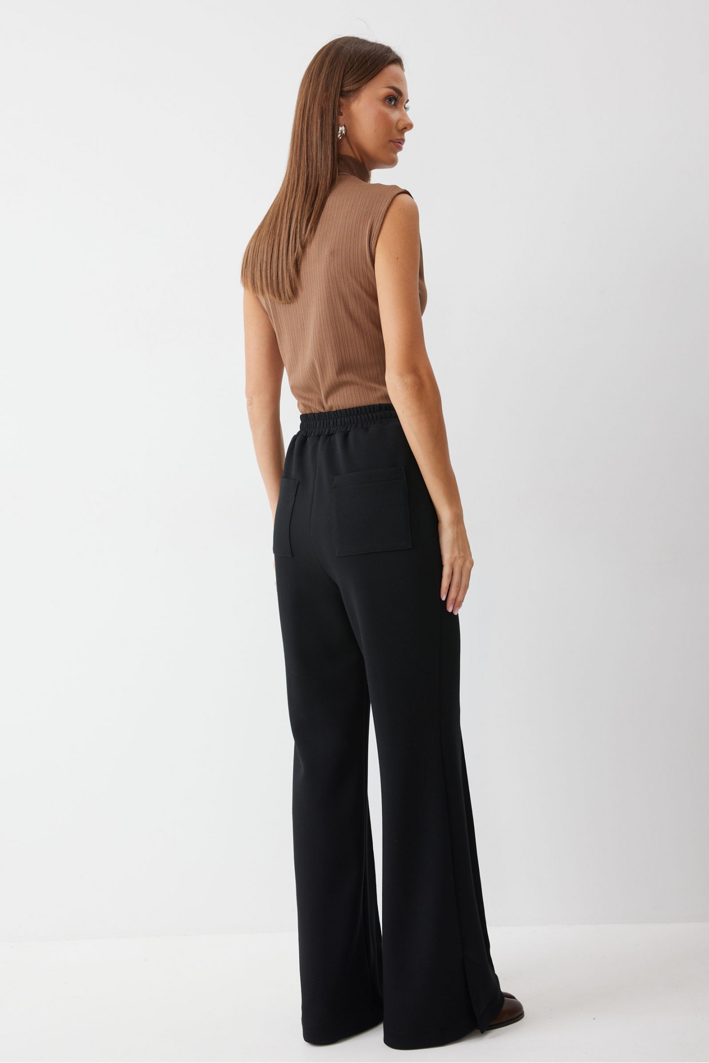 Описание Брюки прямого силуэта из трикотажного полотна. По верху брюк притачной пояс на резинке. На передних половинках брюк обработаны карманы и защипы. На задних – карманы. По низу внешнего шва брюк шлицы.