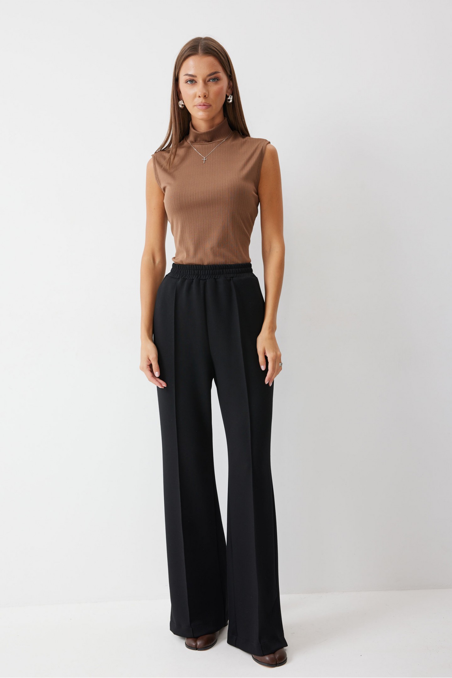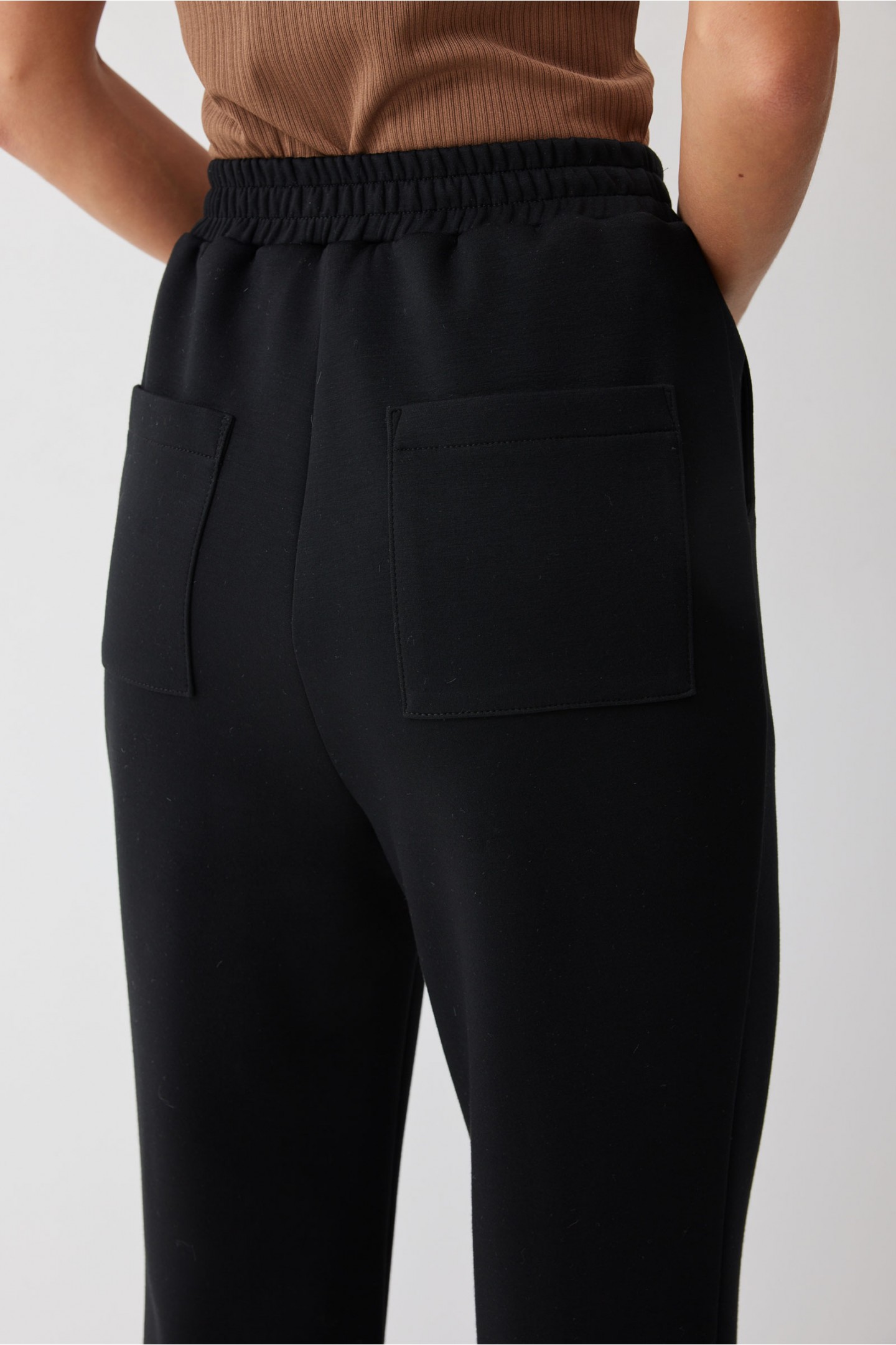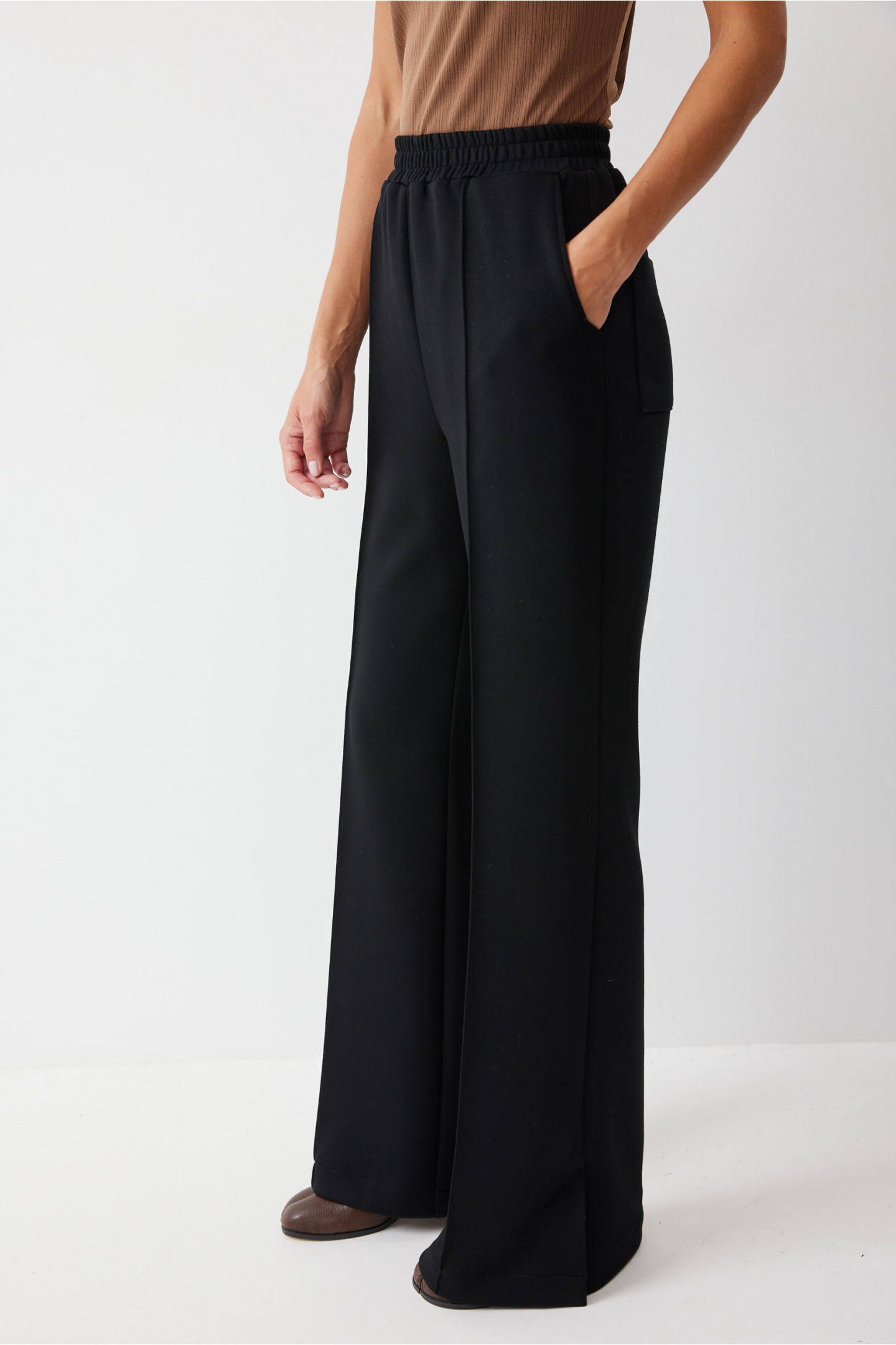 Описание Брюки прямого силуэта из трикотажного полотна. По верху брюк притачной пояс на резинке. На передних половинках брюк обработаны карманы и защипы. На задних – карманы. По низу внешнего шва брюк шлицы.