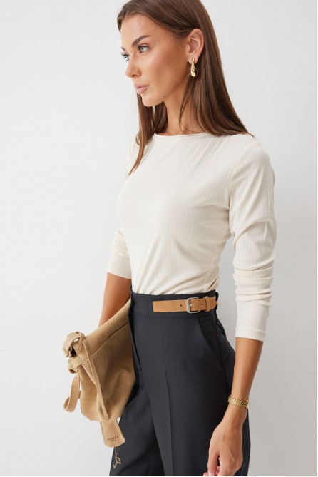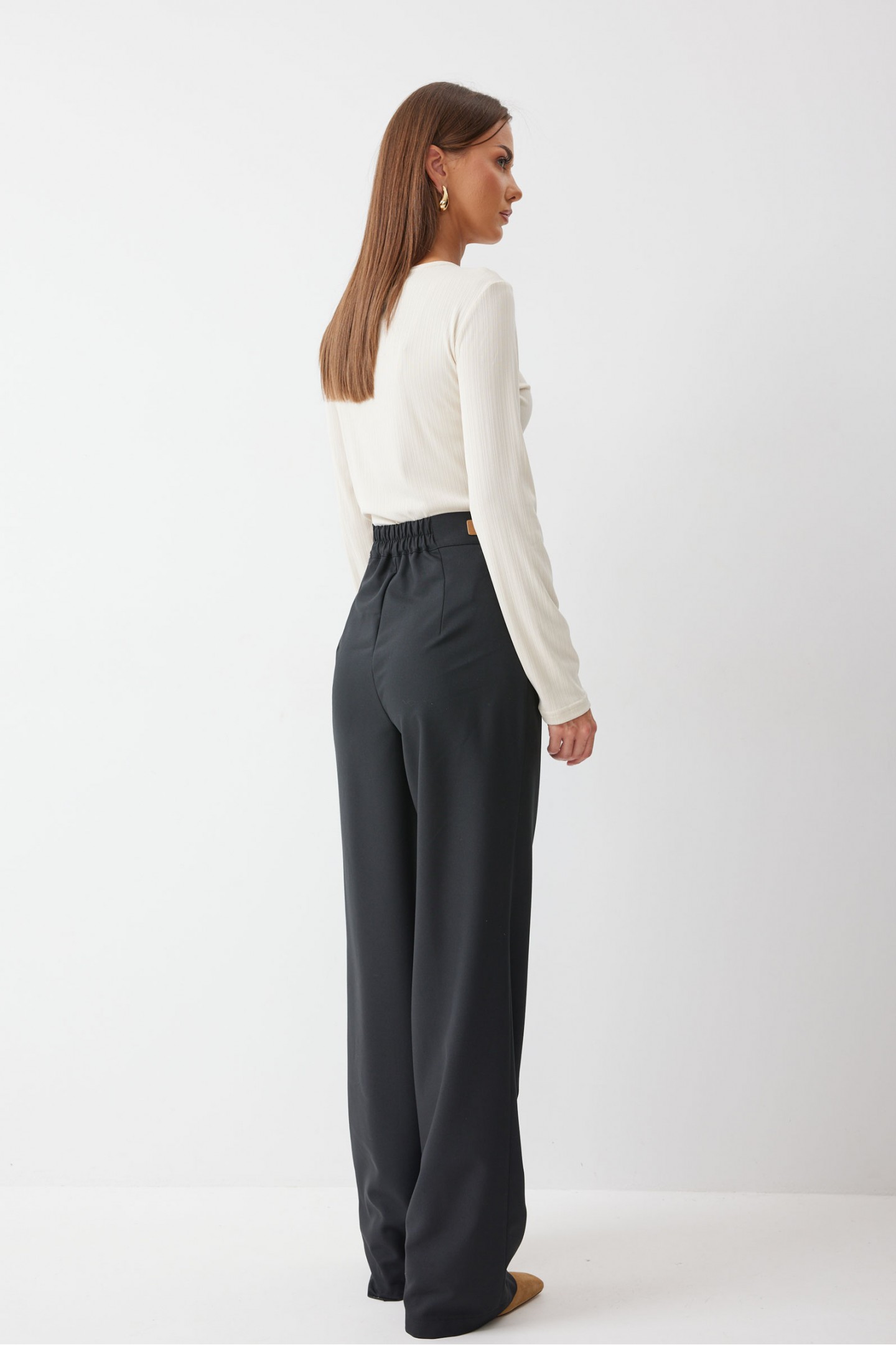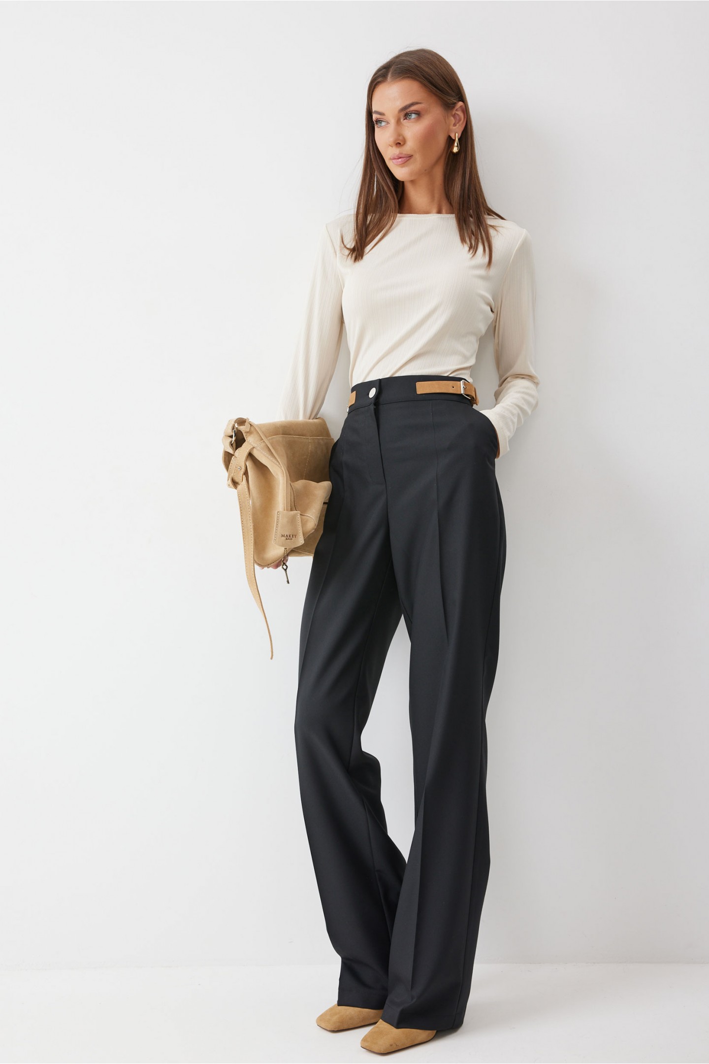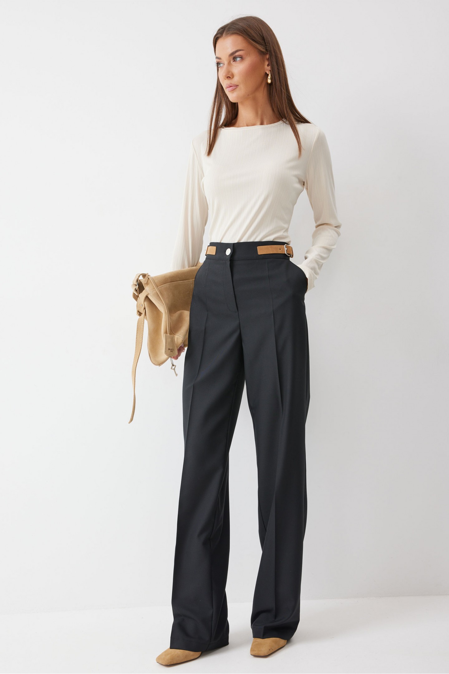 Описание Брюки прямого силуэта из костюмной ткани. По верху брюк притачной пояс с застежкой на петлю и пуговицу, по верху пояса ,на боковых швах , расположены декоративные пряжки. На передних половинках обработаны карманы и застежка молния в среднем шве. На задних половинках вытачки. По поясу задних половинок брюк резинка. Обращаем ваше внимание, что фурнитура может незначительно отличаться от фото