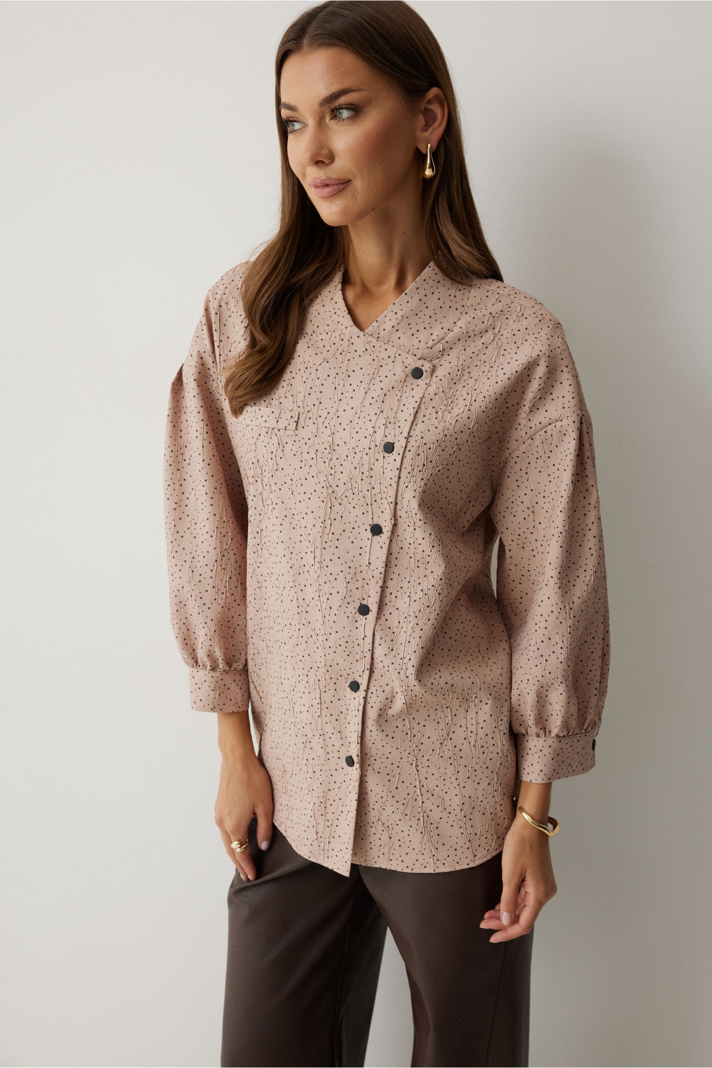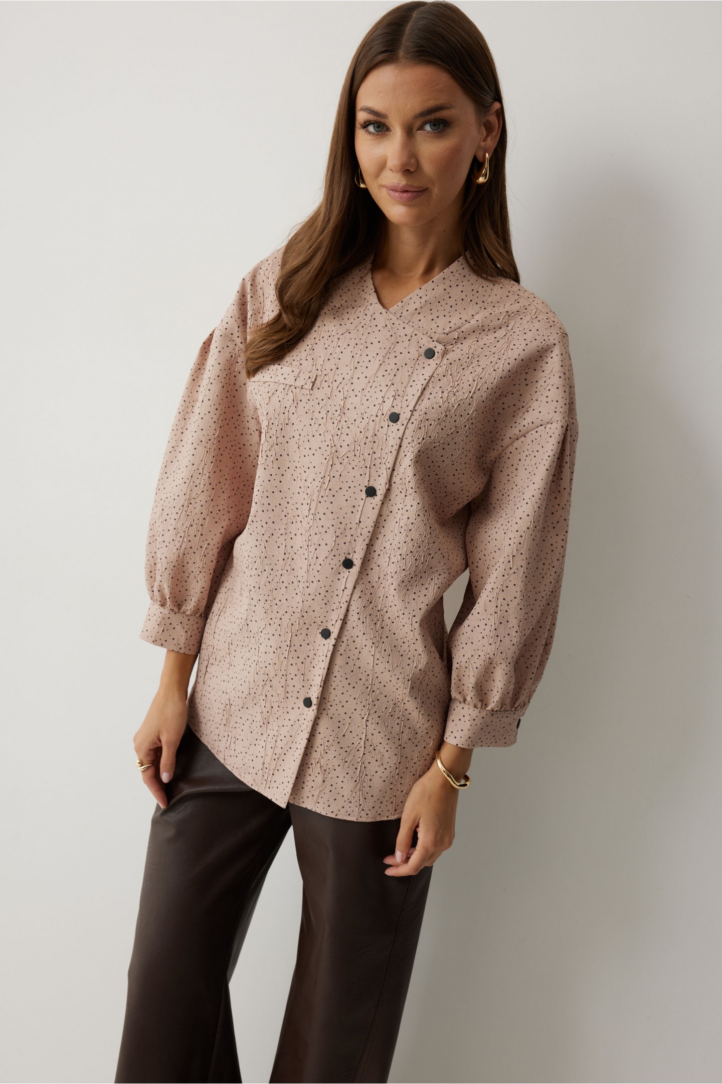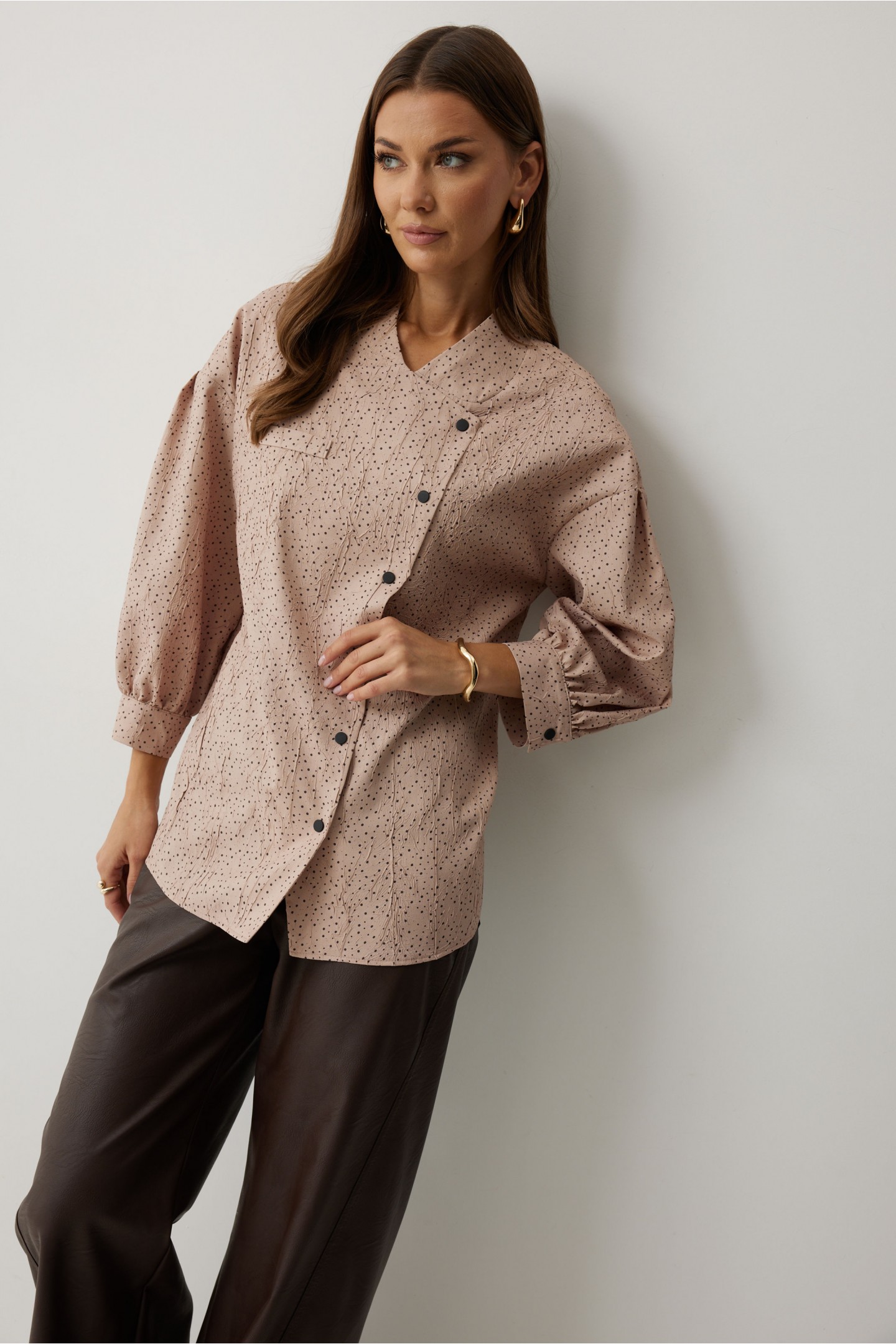 | Описание | Ассиметричная блузка прямого силуэта. Низ фигурный. Рукав, спущенный с встречной складкой по центру. По низу манжета с застежкой на кнопку. По переду декоративная настрочная листочка. Ассиметричная двубортная застежка на кнопки. Воротник-стойка. Обращаем ваше внимание, что фурнитура может незначительно отличаться от фото. |