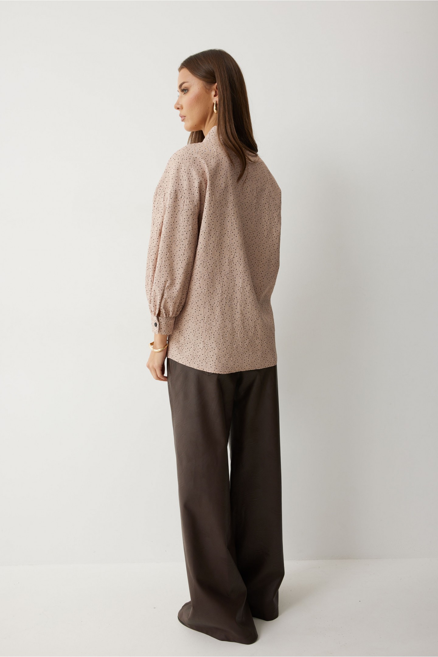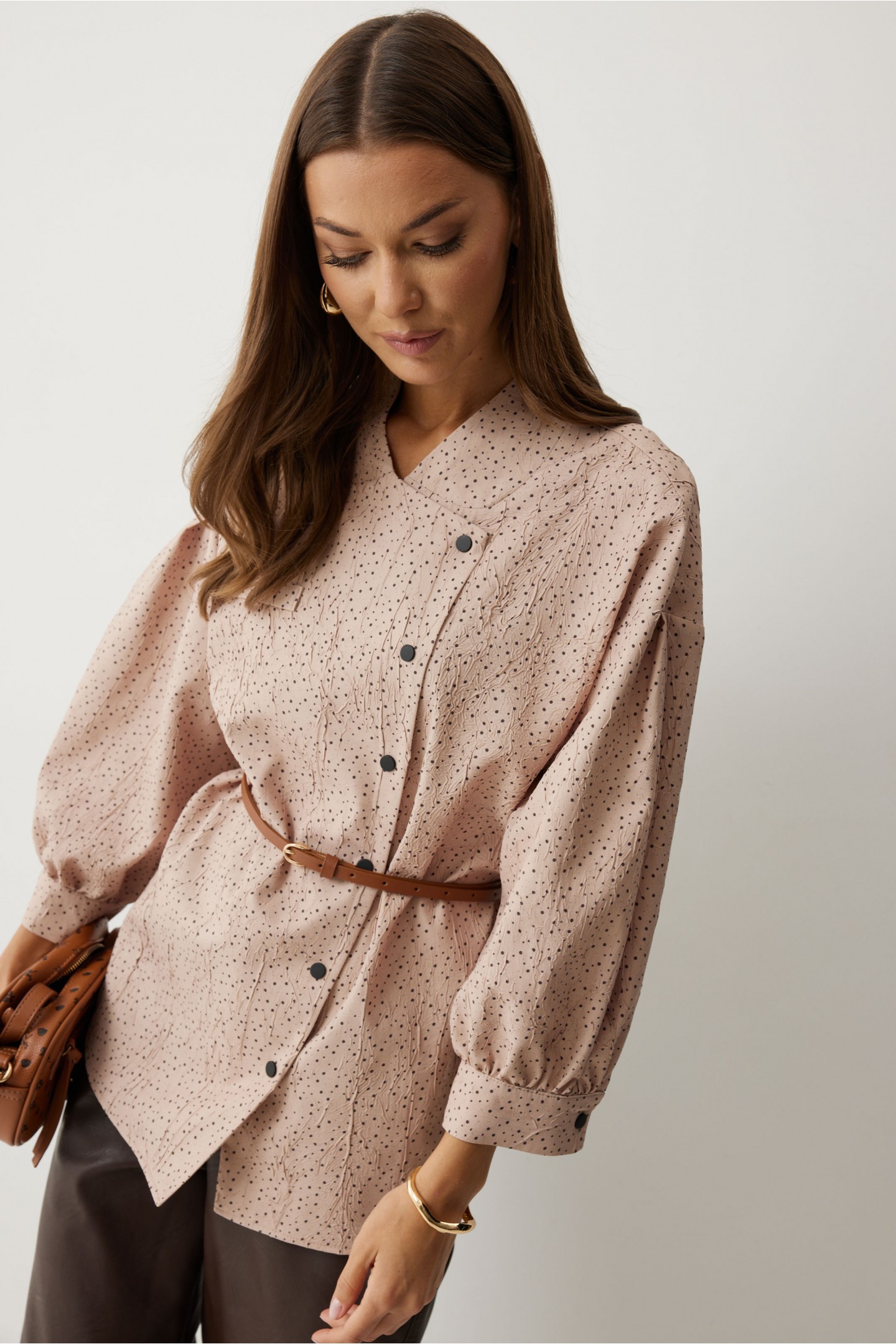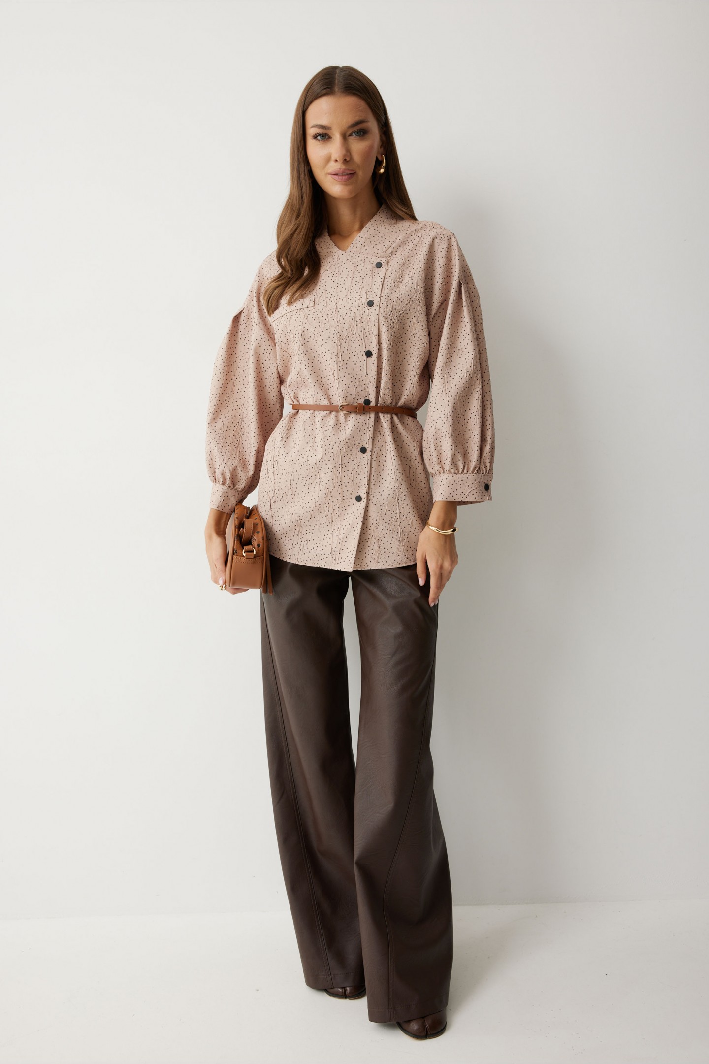 | Описание | Ассиметричная блузка прямого силуэта. Низ фигурный. Рукав, спущенный с встречной складкой по центру. По низу манжета с застежкой на кнопку. По переду декоративная настрочная листочка. Ассиметричная двубортная застежка на кнопки. Воротник-стойка. Обращаем ваше внимание, что фурнитура может незначительно отличаться от фото. |