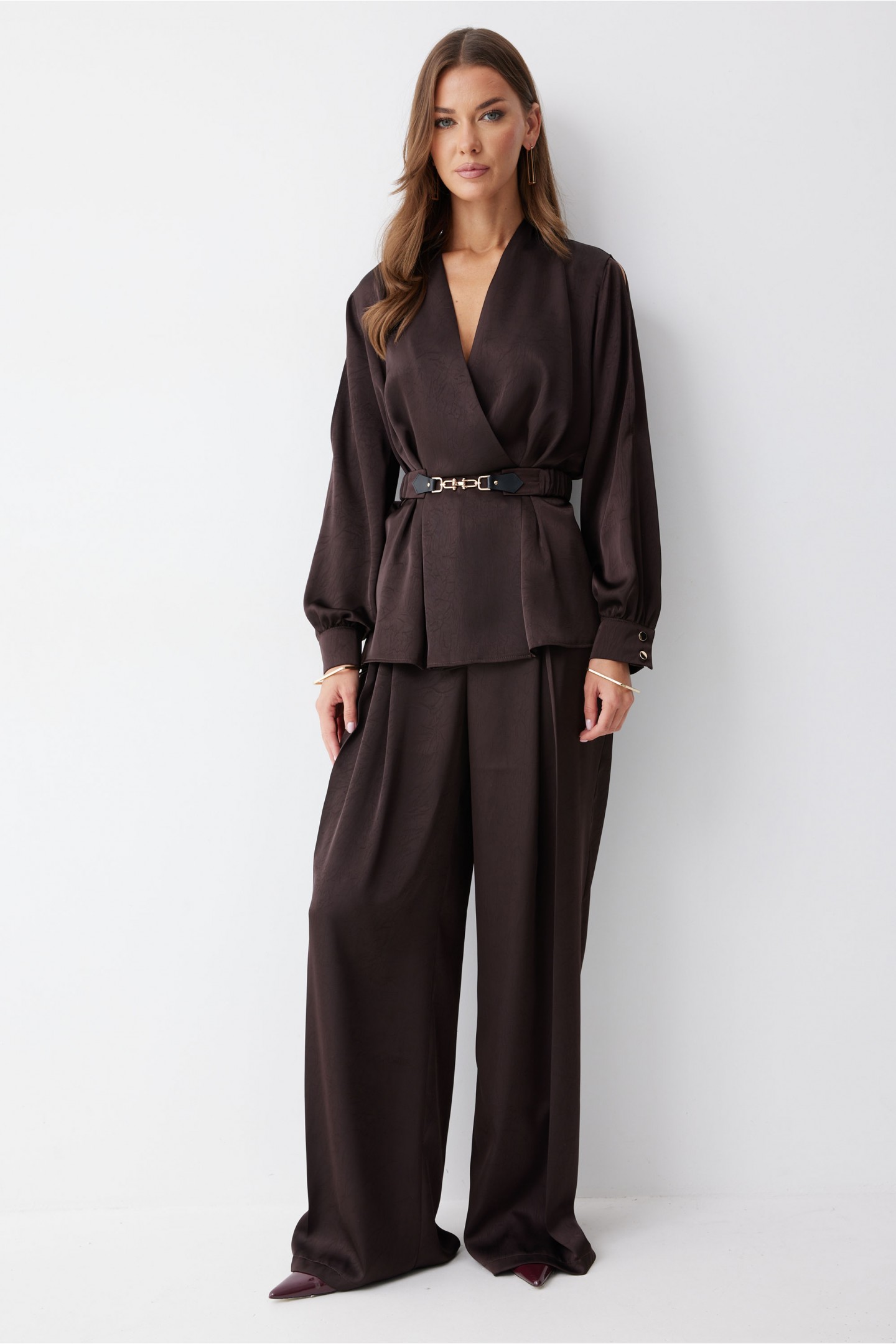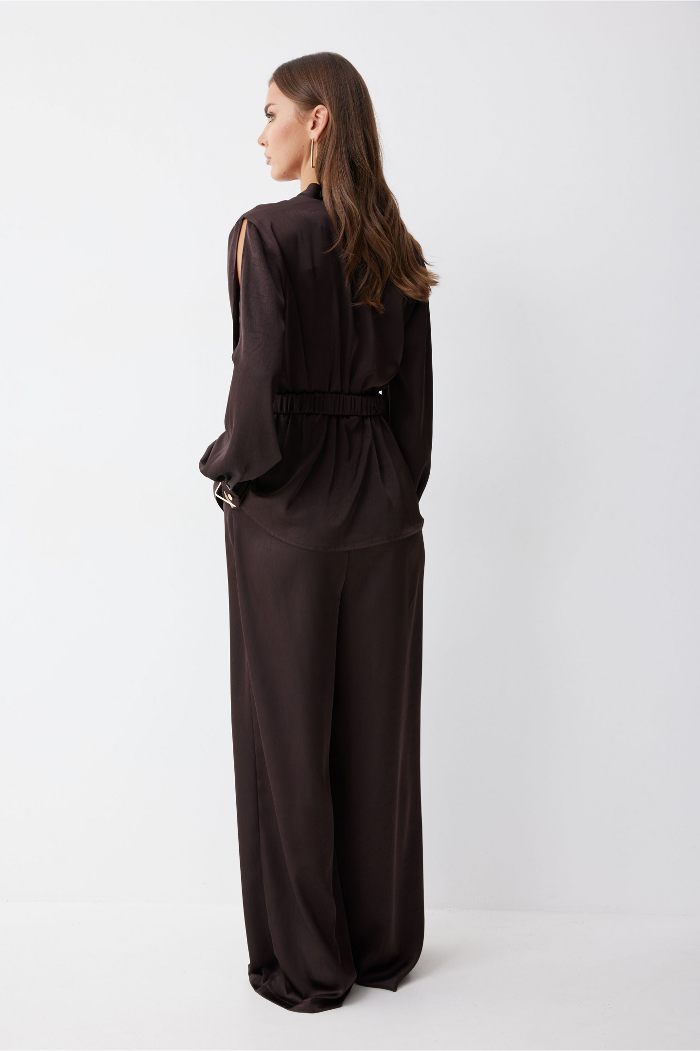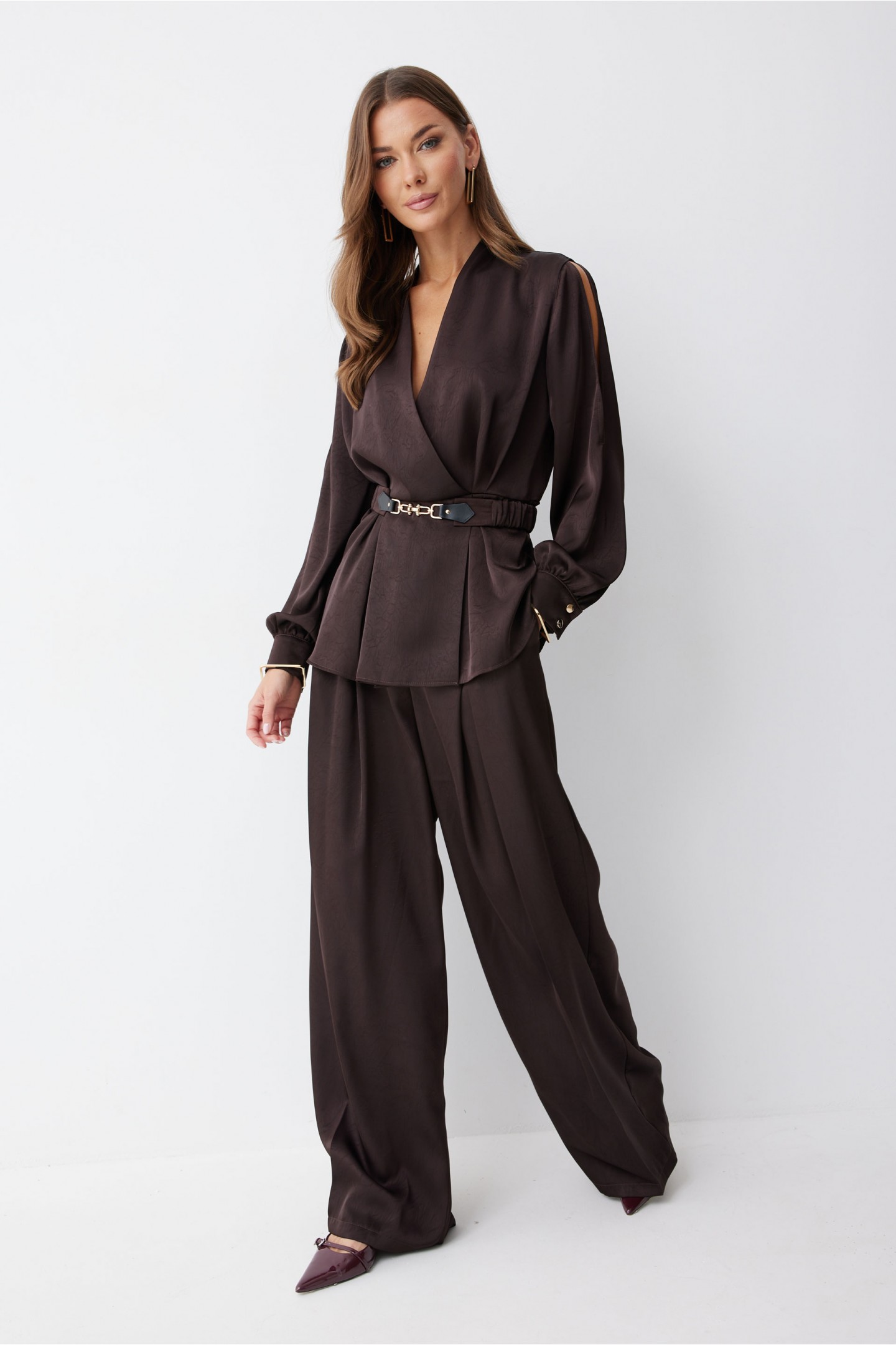 | Описание | Комплект, состоящий из блузки и брюк. Блузка полуприлегающего силуэта расширенная книзу из струящейся ткани. Рукав втачной, с разрезом в области плеча, по низу манжета с застежкой на петли и пуговицы. Блузка отрезная по линии талии. По переду от подреза вверх и вниз декоративные складки. На спинке в подрез вставлена резинка. В комплект входит съемный ремень. Обращаем ваше внимание, что фурнитура может отличаться от фото. Брюки прямого силуэта расширенные книзу из струящейся ткани. По верху брюк притачной пояс с застежкой на петли и пуговицы. На передних половинках обработана застежка молния в среднем шве. На передних половинках карманы и декоративные складки. По поясу задних половинок брюк резинка и вытачки. Обращаем ваше внимание, что фурнитура может отличаться от фото. |