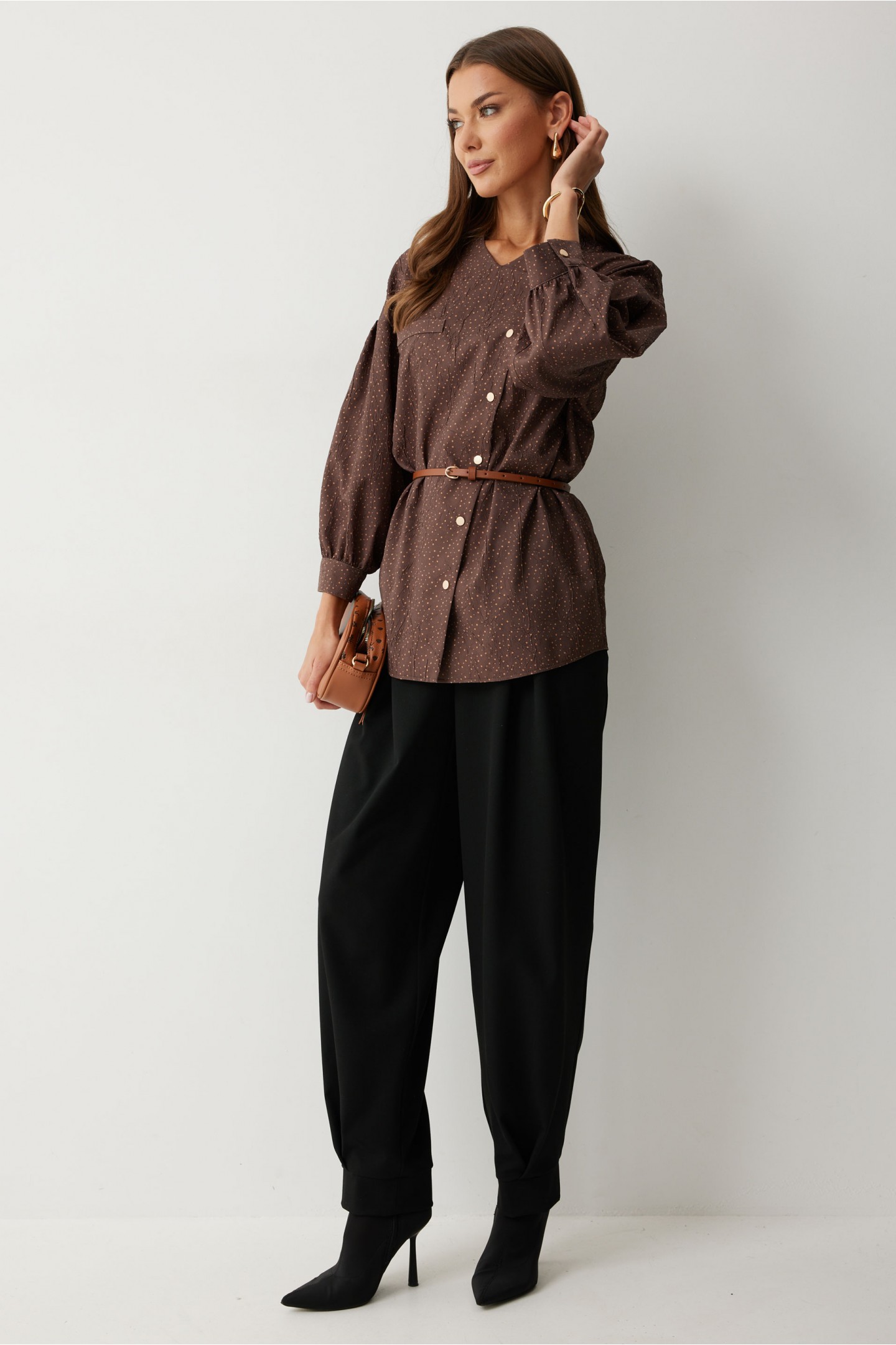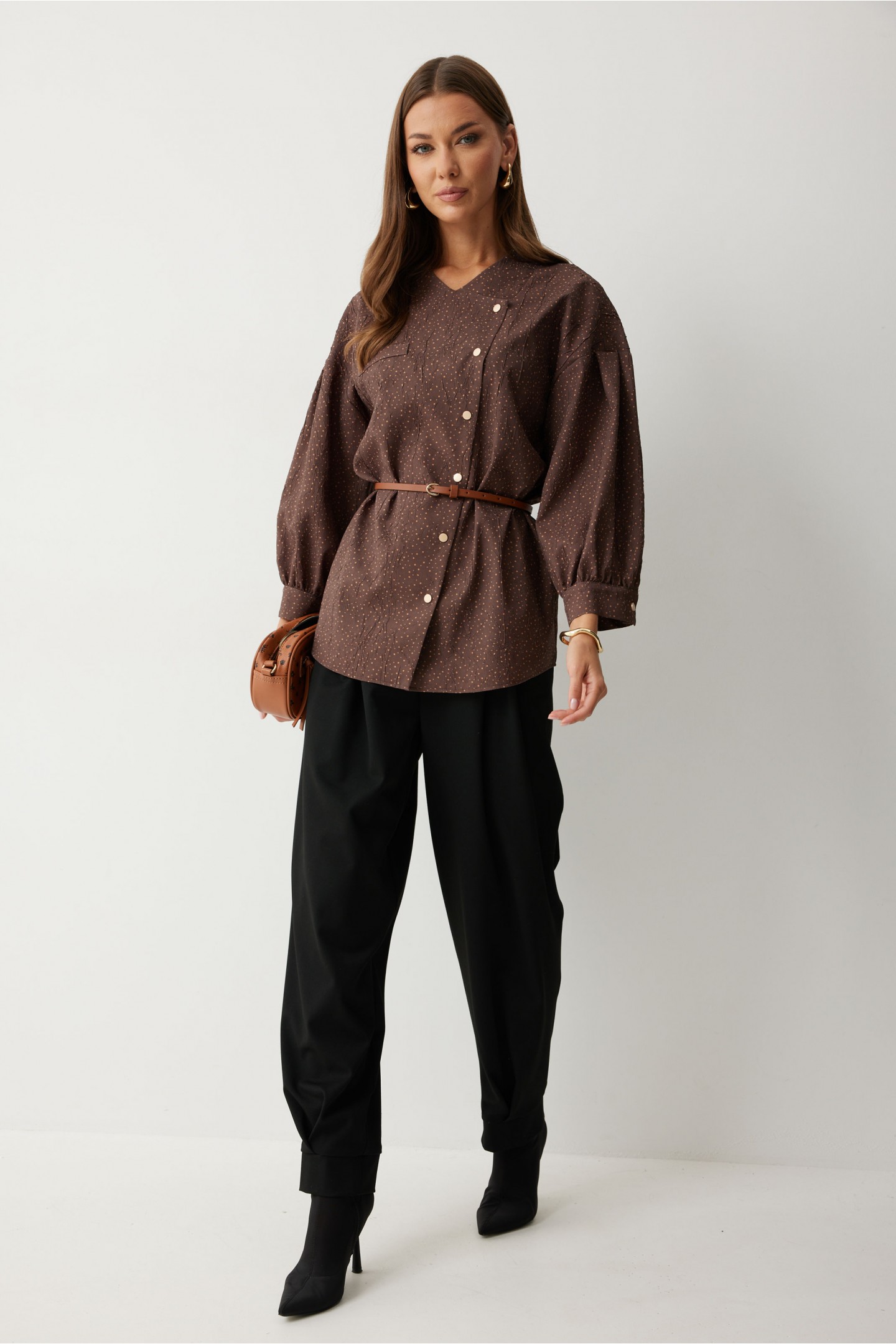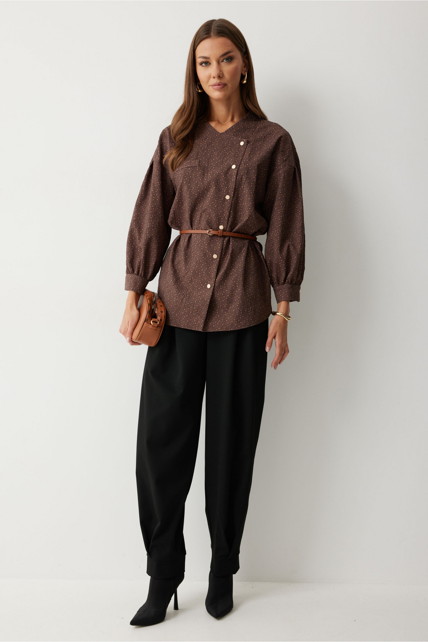 | Описание | Ассиметричная блузка прямого силуэта. Низ фигурный. Рукав, спущенный с встречной складкой по центру. По низу манжета с застежкой на кнопку. По переду декоративная настрочная листочка. Ассиметричная двубортная застежка на кнопки. Воротник-стойка. Обращаем ваше внимание, что фурнитура может незначительно отличаться от фото. |