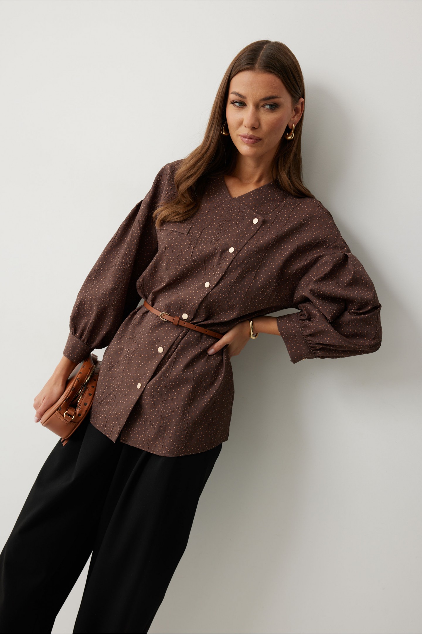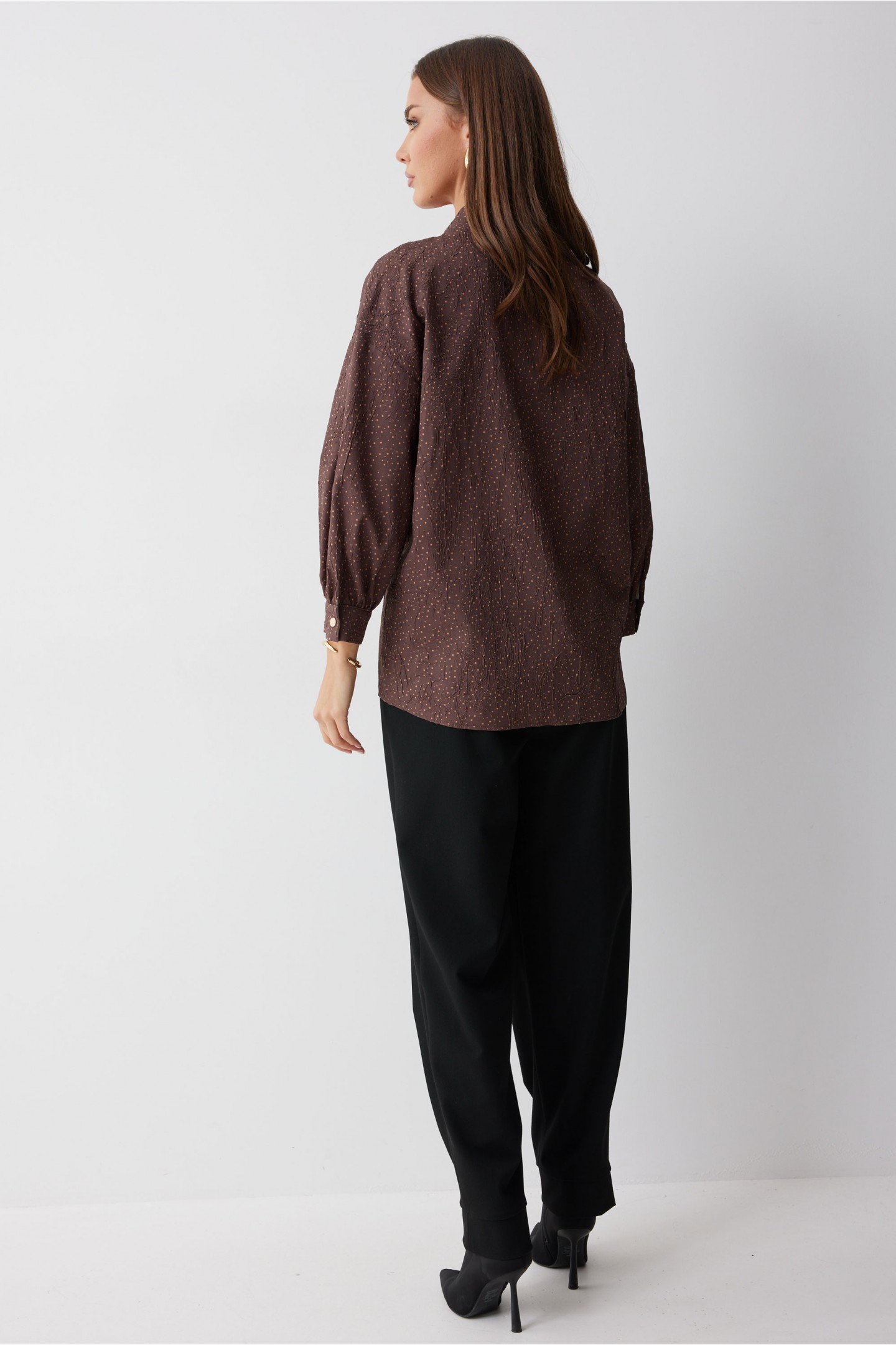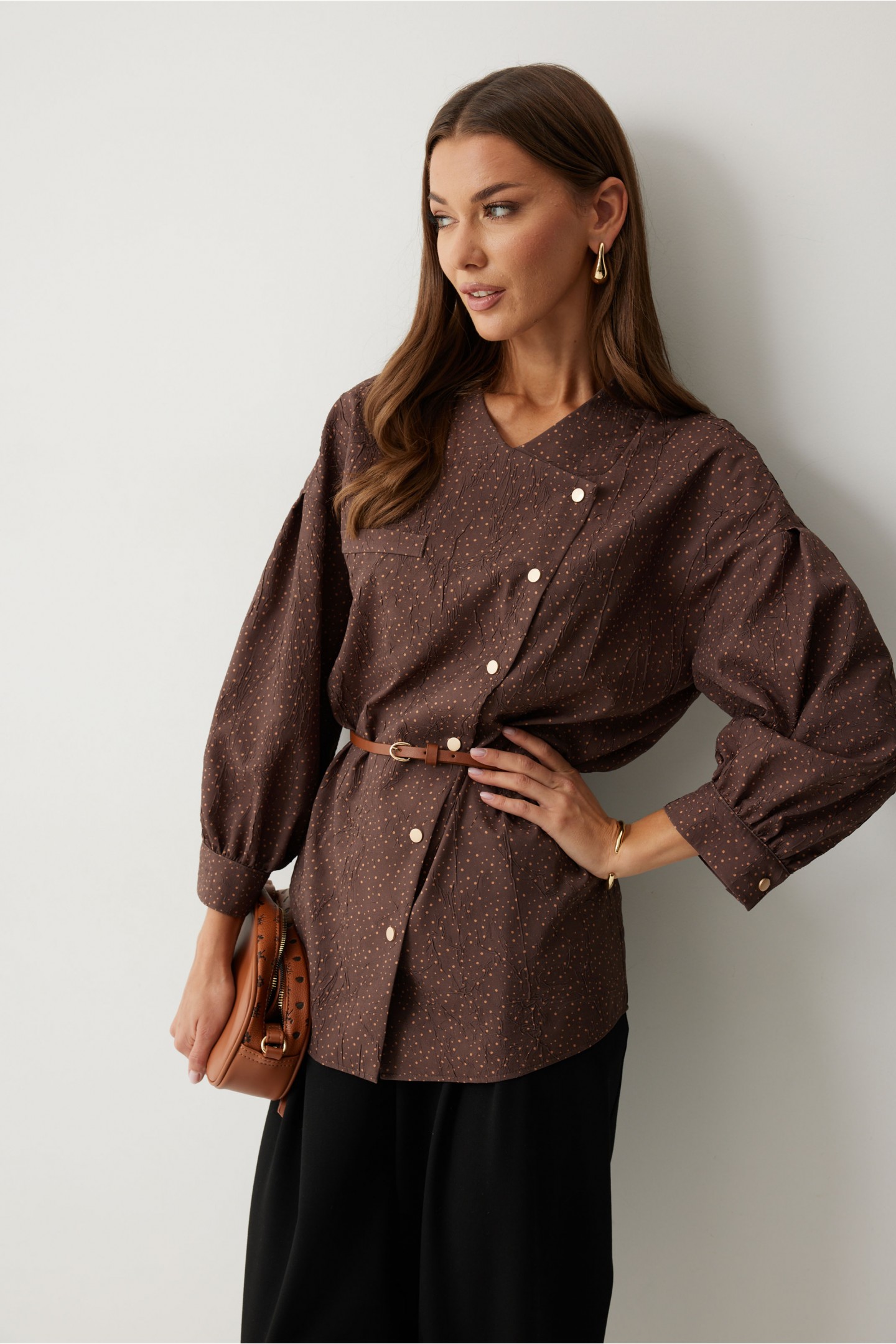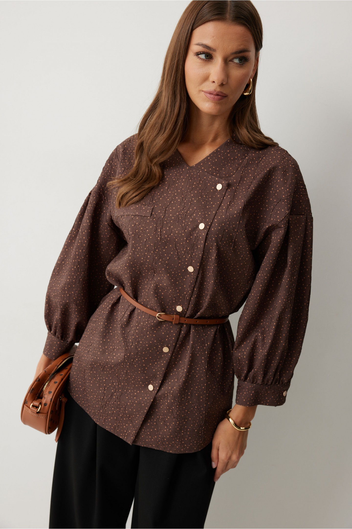 | Описание | Ассиметричная блузка прямого силуэта. Низ фигурный. Рукав, спущенный с встречной складкой по центру. По низу манжета с застежкой на кнопку. По переду декоративная настрочная листочка. Ассиметричная двубортная застежка на кнопки. Воротник-стойка. Обращаем ваше внимание, что фурнитура может незначительно отличаться от фото. |