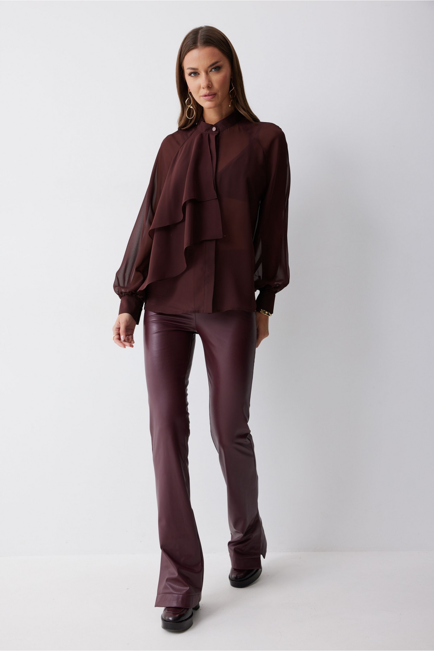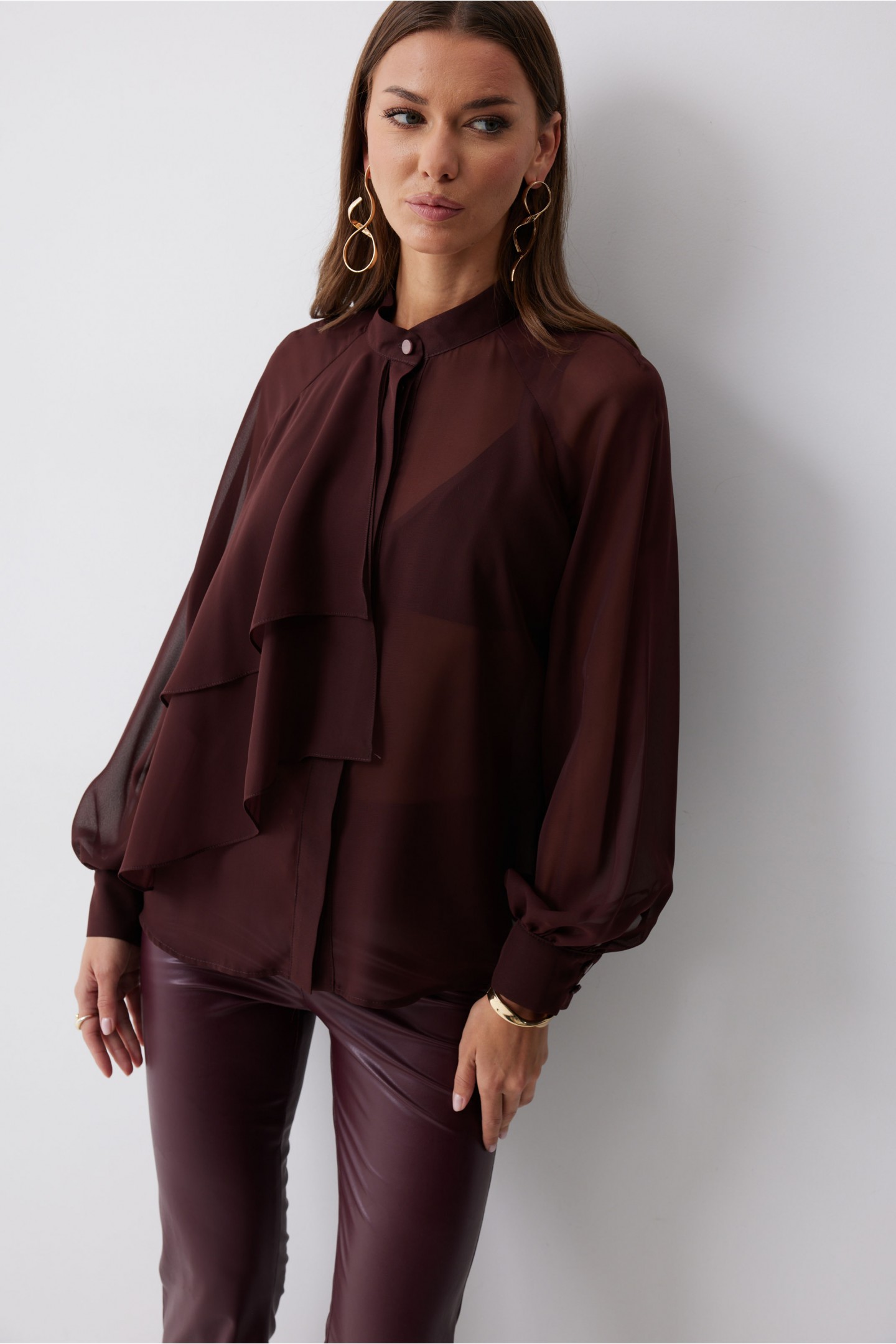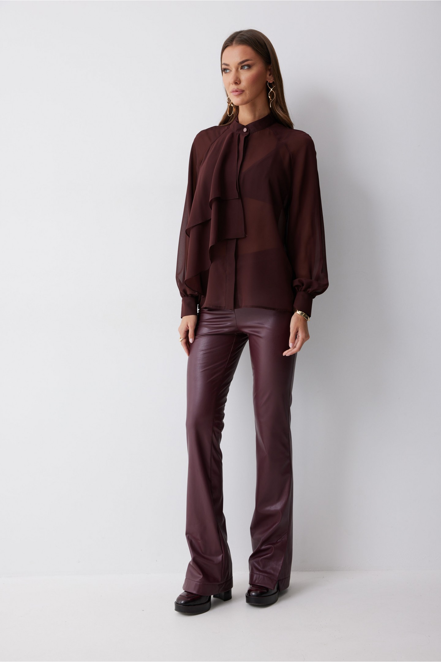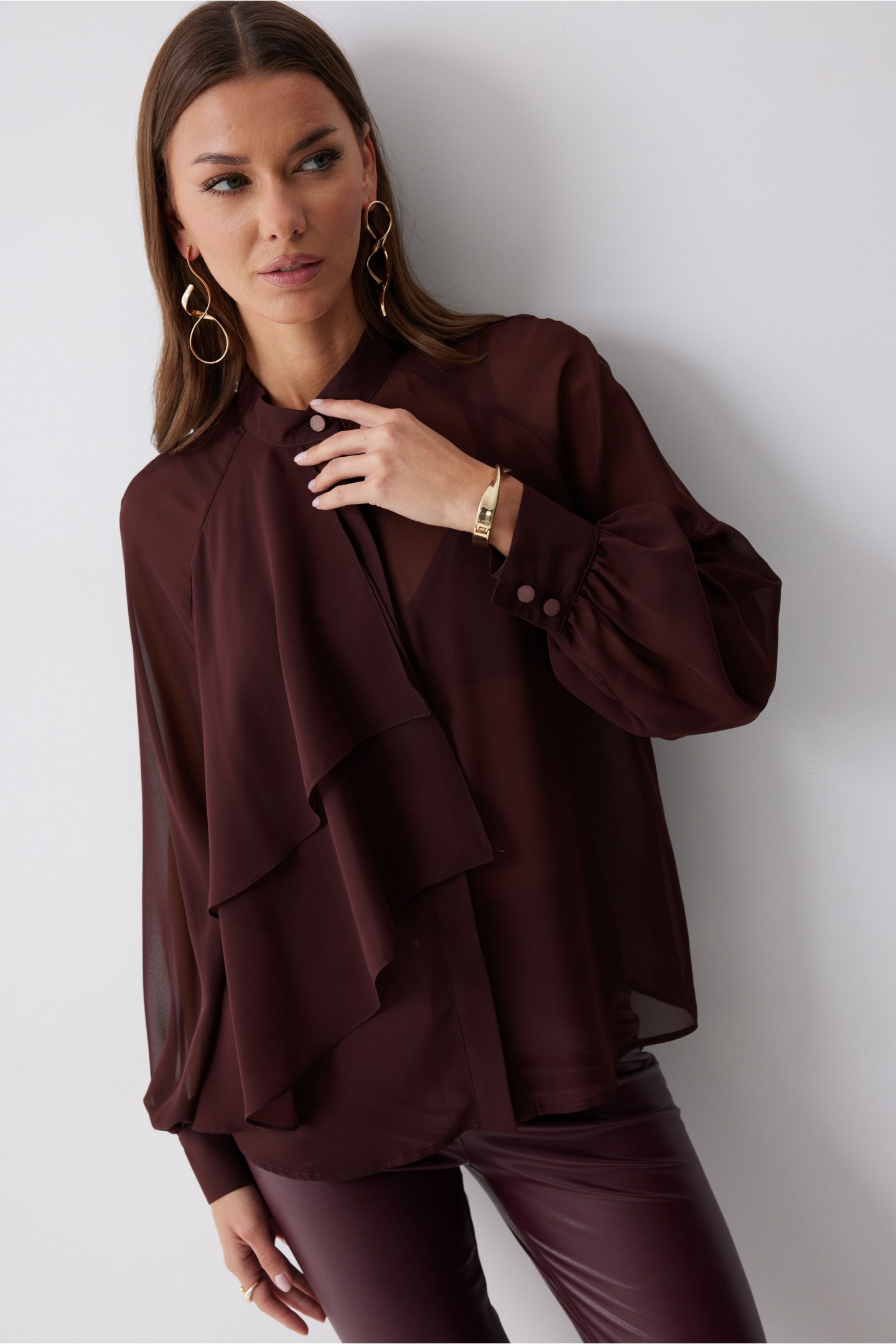 | Описание | Стильная блузка полуприлегающего силуэта. Рукав – реглан, по низу на манжете со сборкой, застежка на петли и пуговицы. В правую половинку переда, в шов, вставлены декоративные воланы. Воротник-стойка, по центру планка с застежкой на петли и пуговицы. |