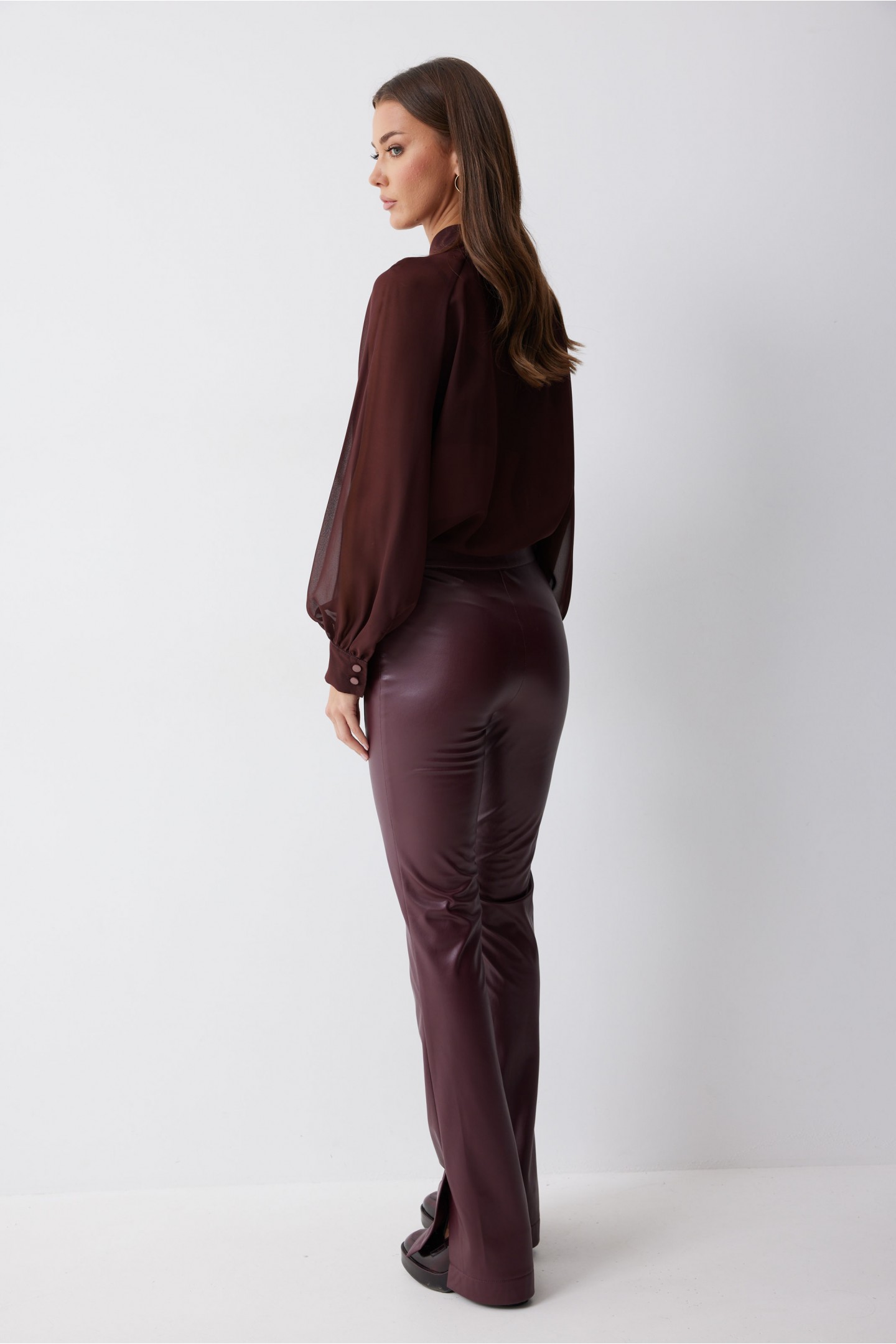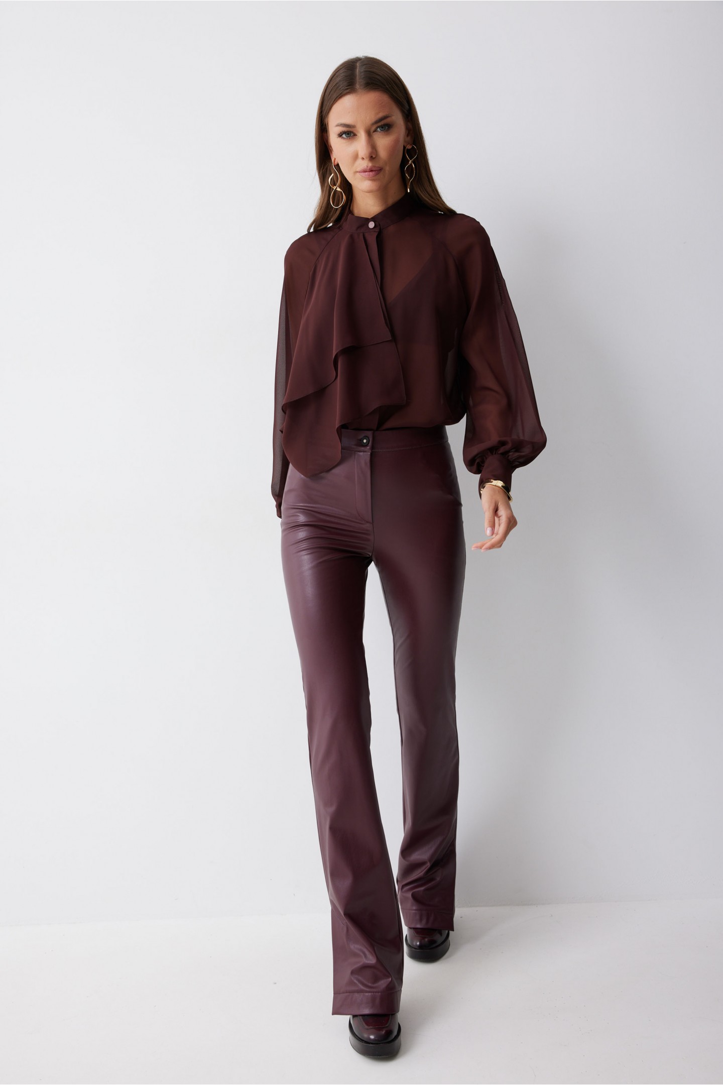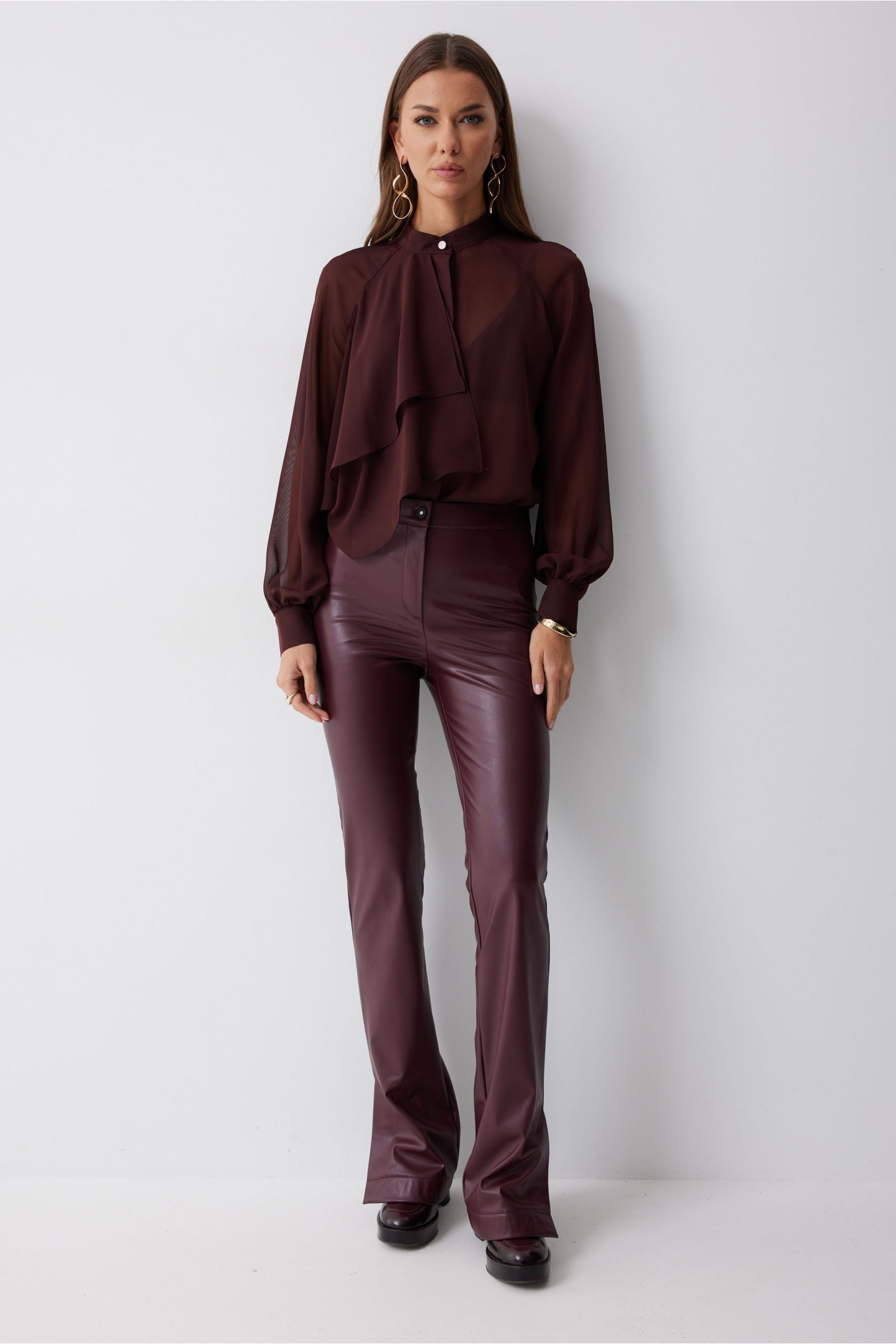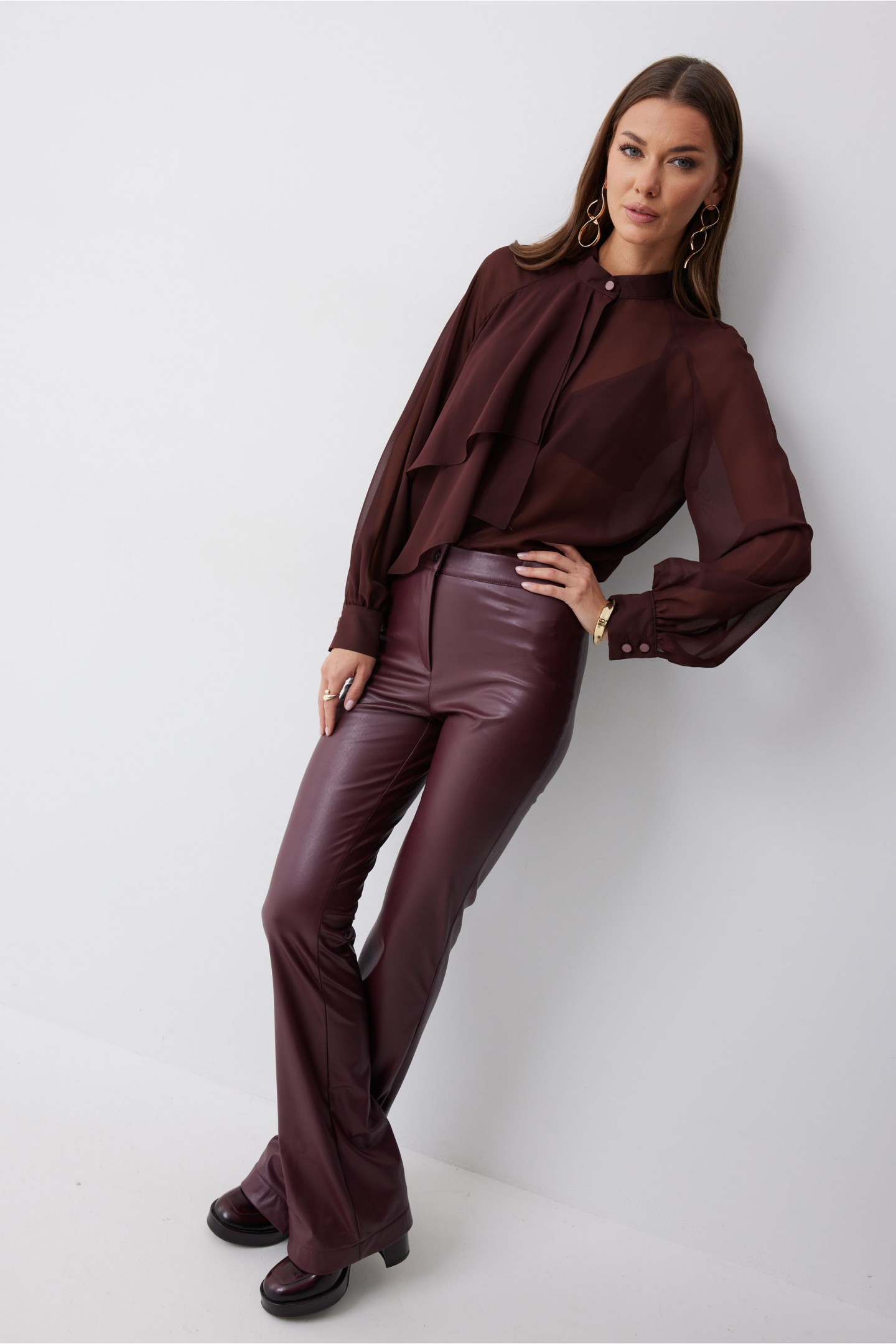 | Описание | Стильная блузка полуприлегающего силуэта. Рукав – реглан, по низу на манжете со сборкой, застежка на петли и пуговицы. В правую половинку переда, в шов, вставлены декоративные воланы. Воротник-стойка, по центру планка с застежкой на петли и пуговицы. |